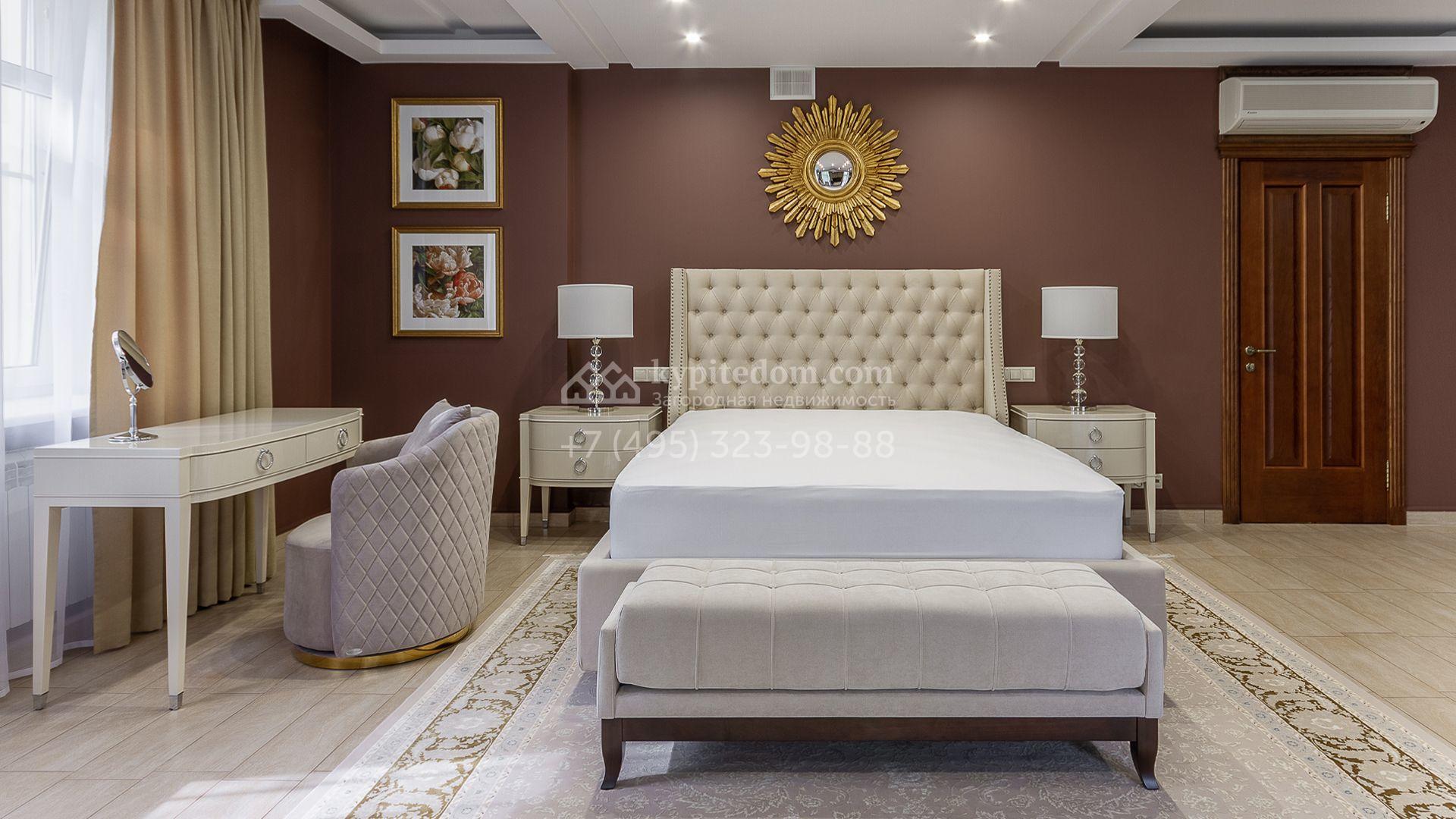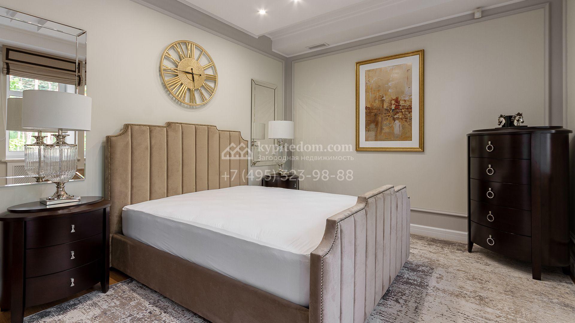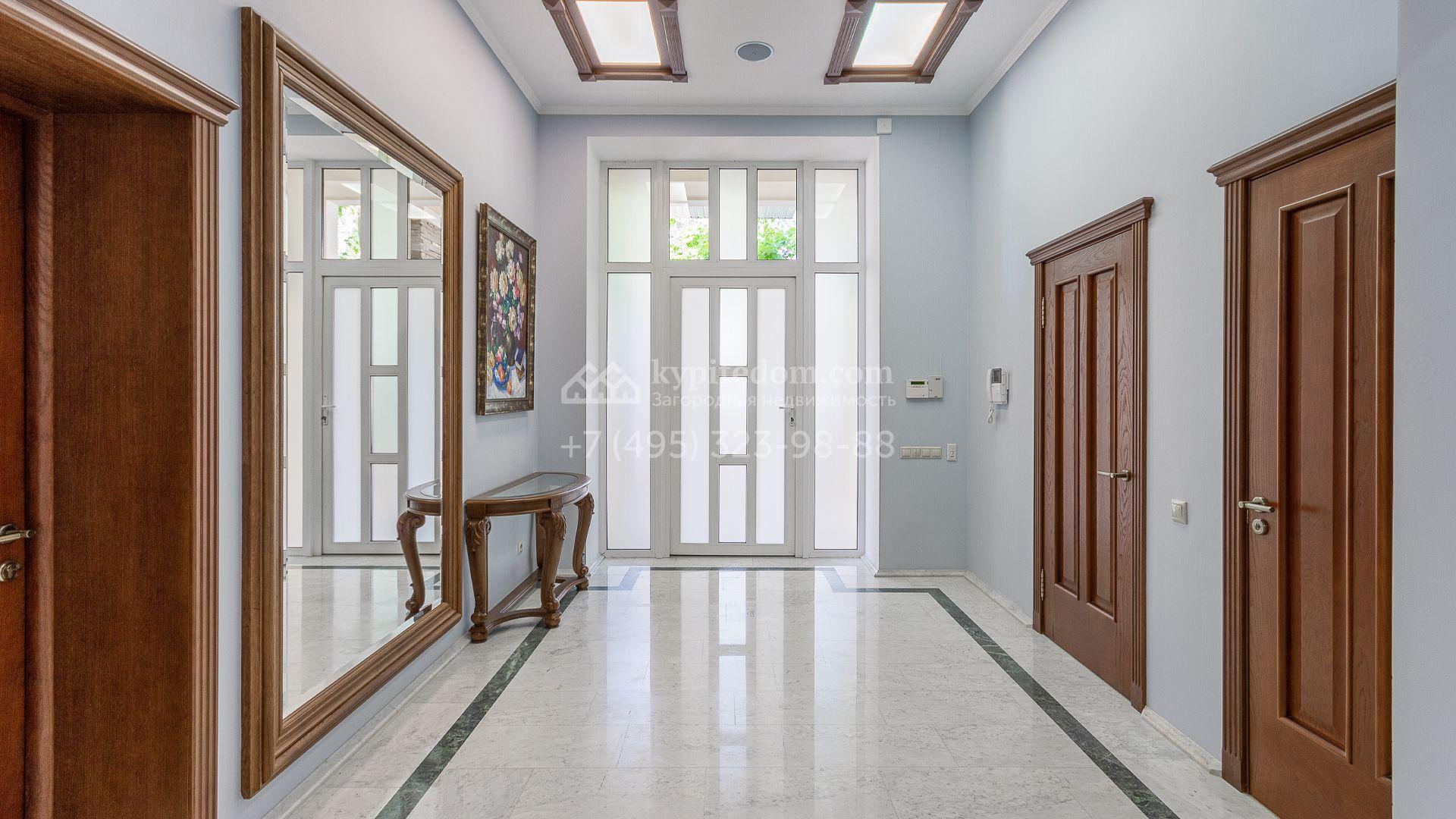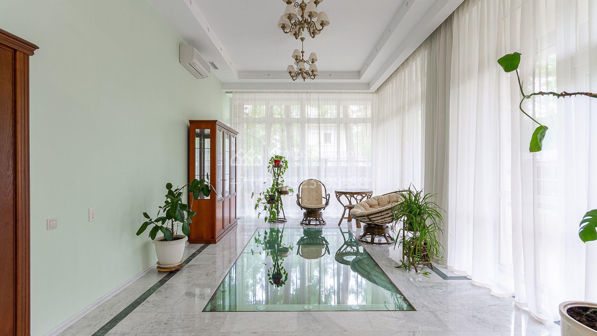 Планировка включает 4 спальни, просторную гостиную с камином, кухню-столовую, кабинет, зимний сад и кинозал. В особняке предусмотрена SPA-зона с бассейном, сауной и комнатой отдыха. На территории с ландшафтным дизайном и вымощенными дорожками расположены дом для персонала со встроенным двухместным гаражом и беседка с зоной барбекю.