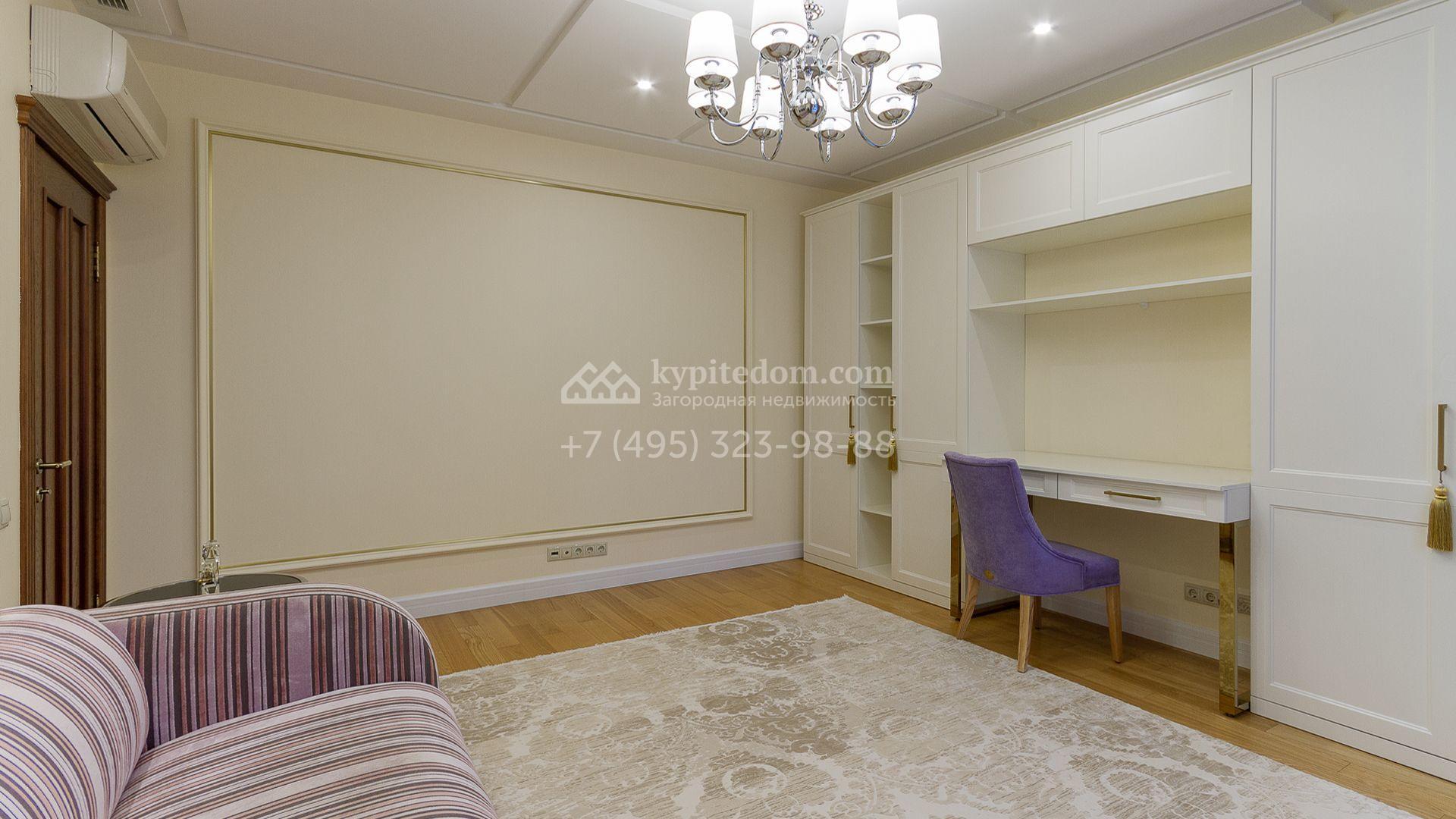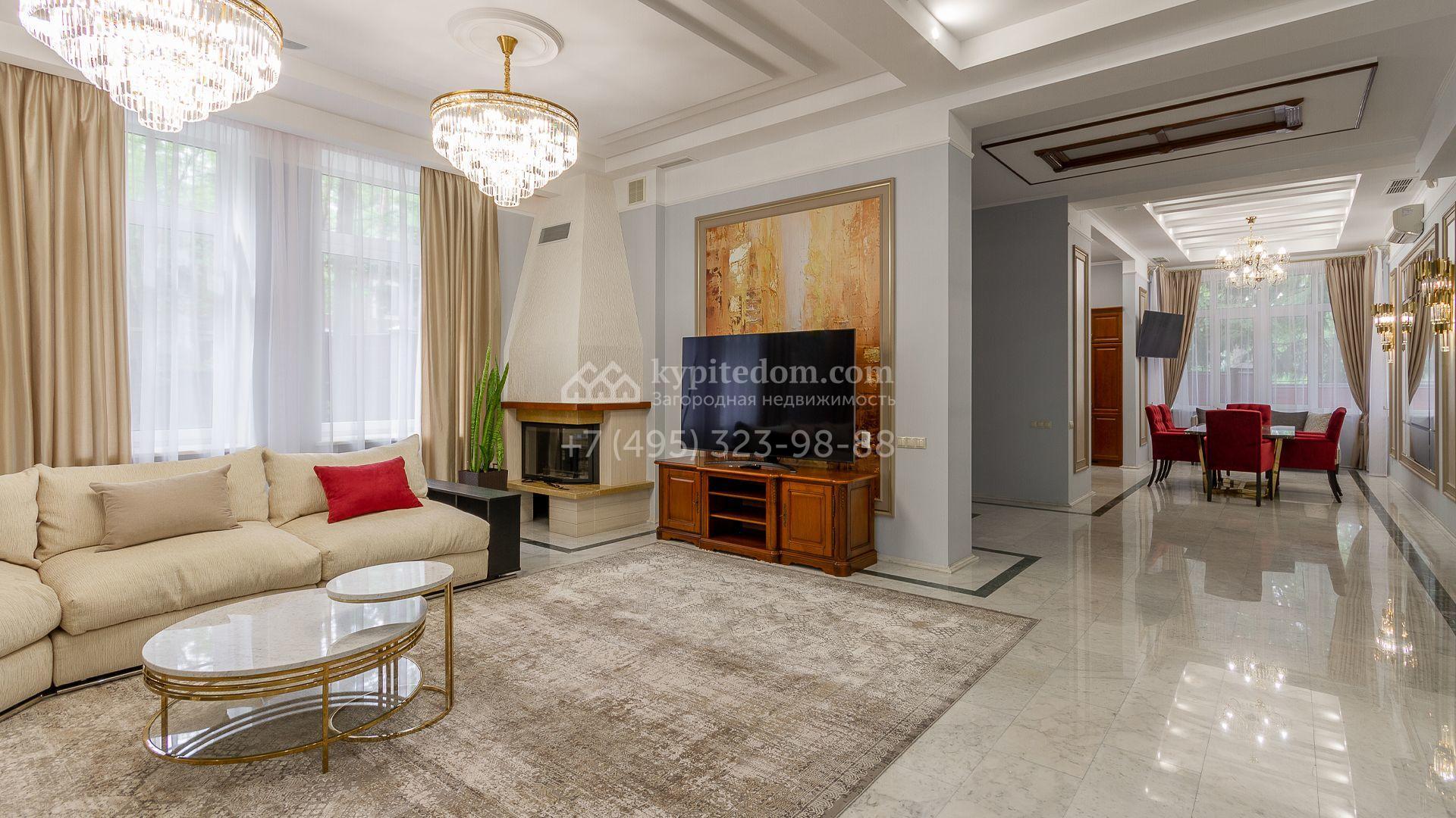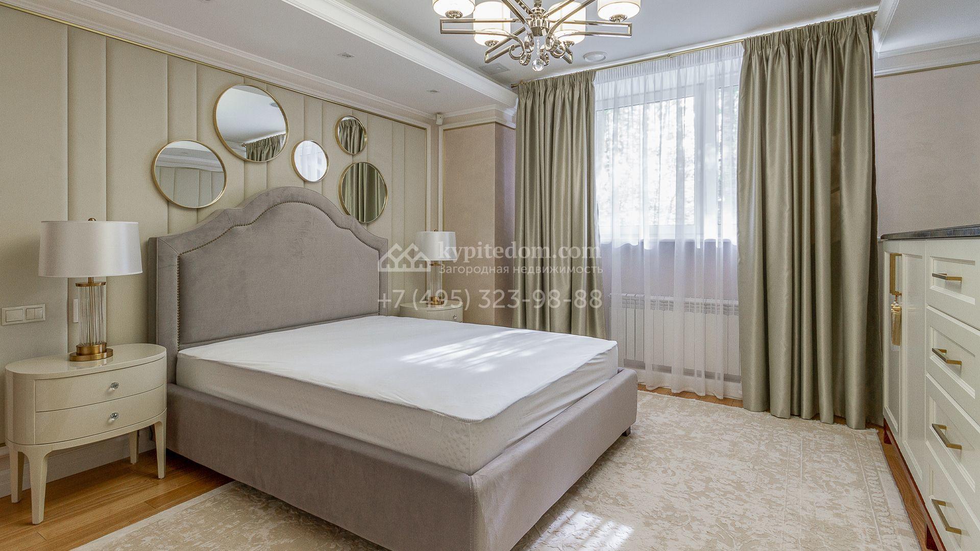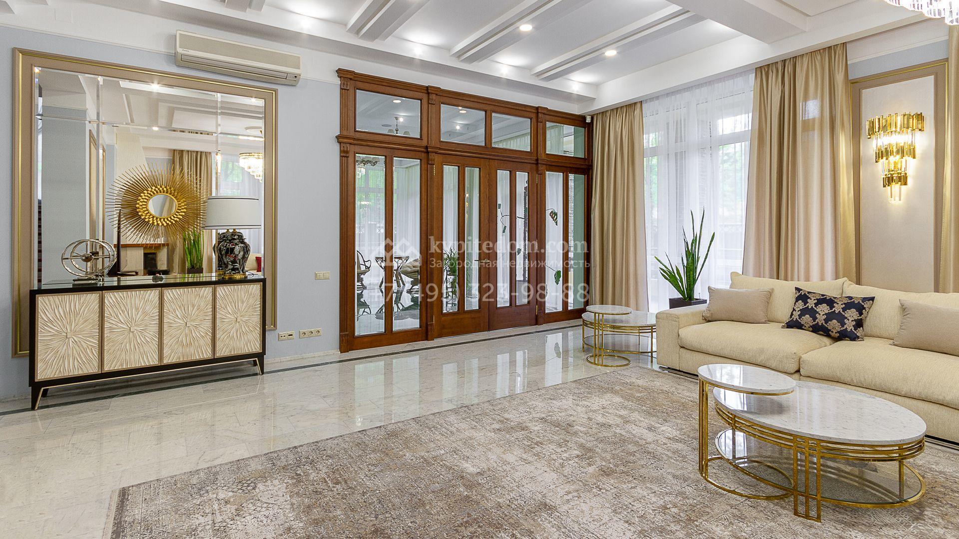 Планировка включает 4 спальни, просторную гостиную с камином, кухню-столовую, кабинет, зимний сад и кинозал. В особняке предусмотрена SPA-зона с бассейном, сауной и комнатой отдыха. На территории с ландшафтным дизайном и вымощенными дорожками расположены дом для персонала со встроенным двухместным гаражом и беседка с зоной барбекю.