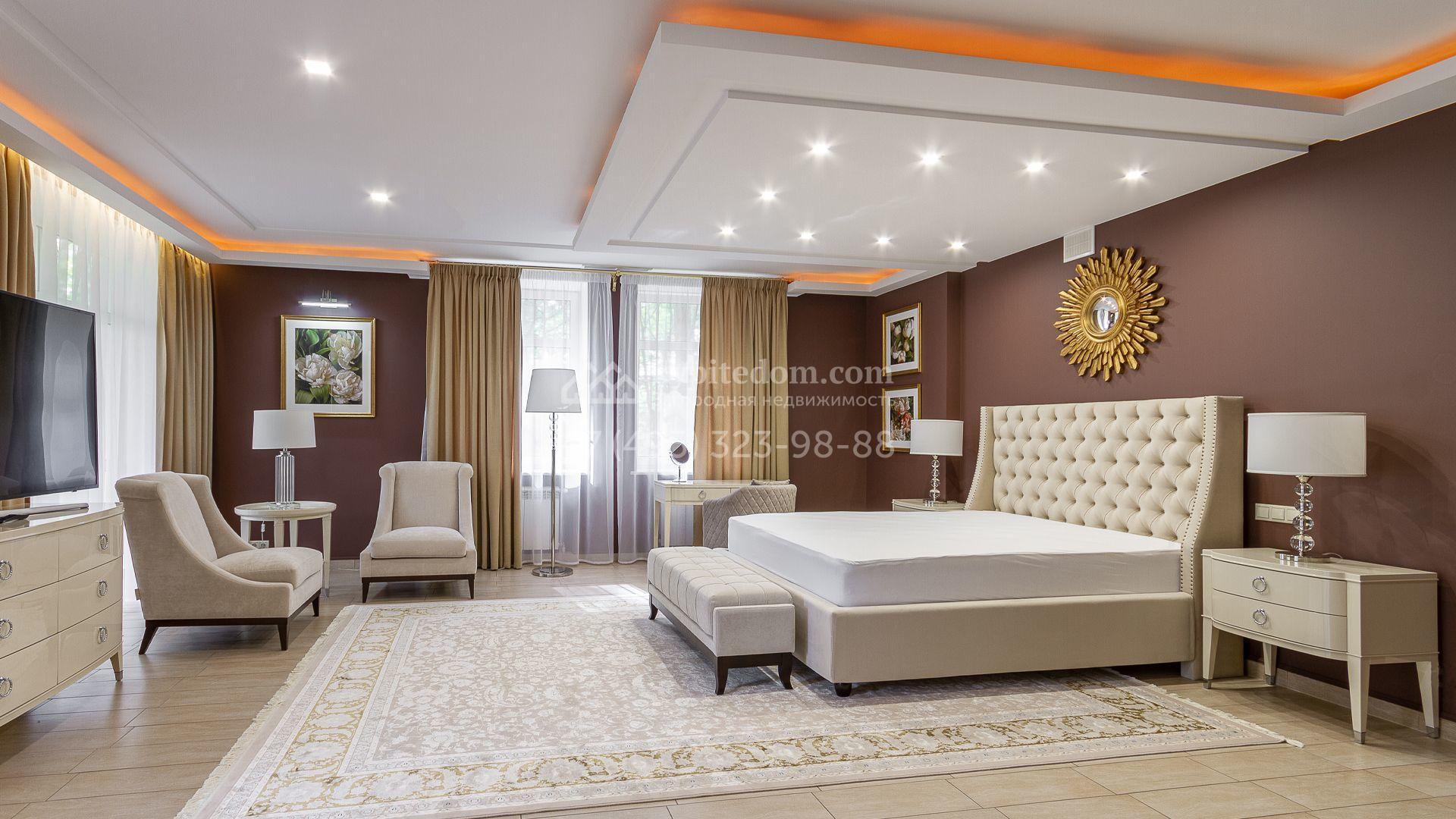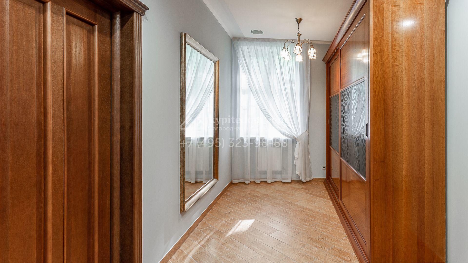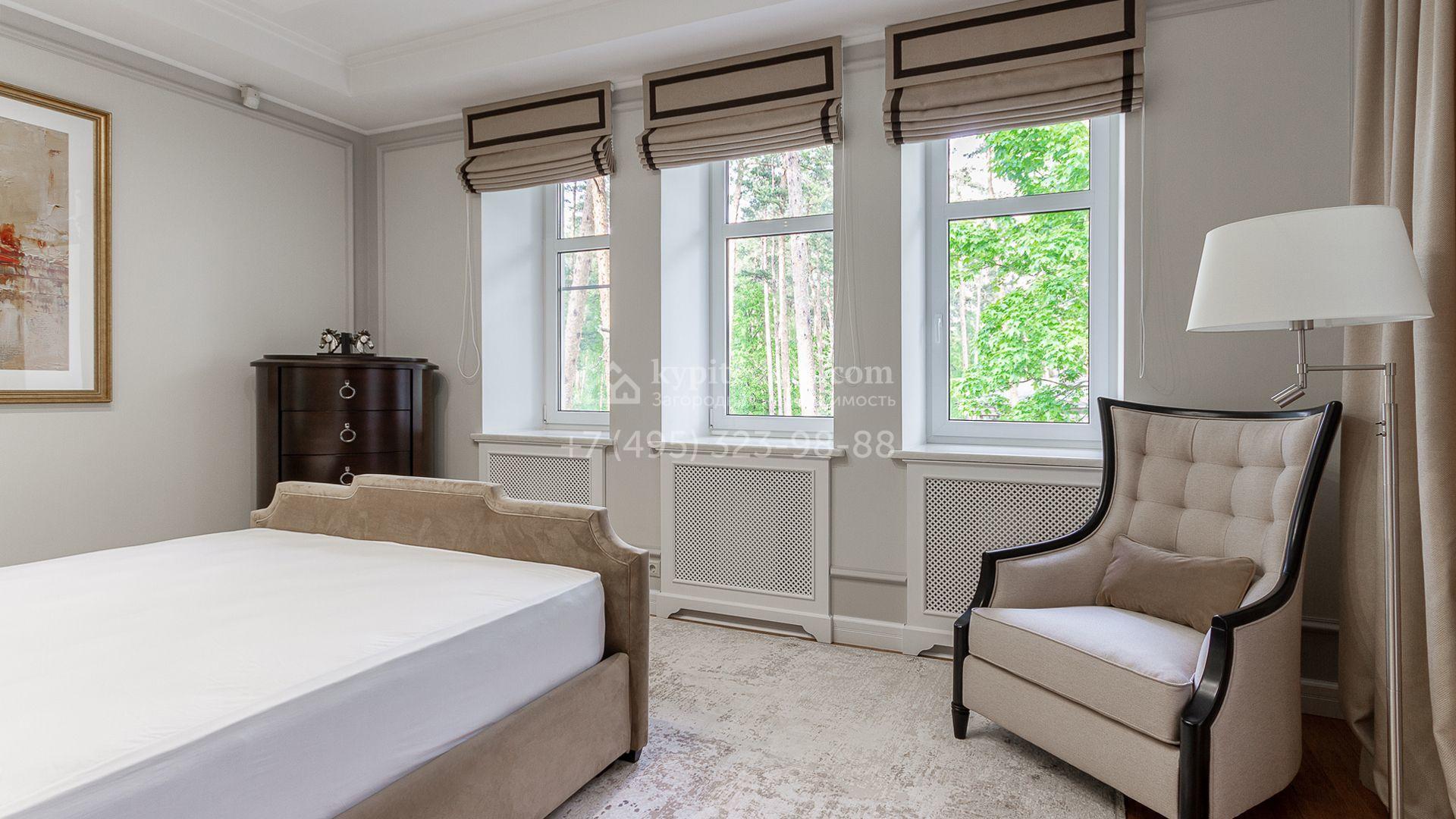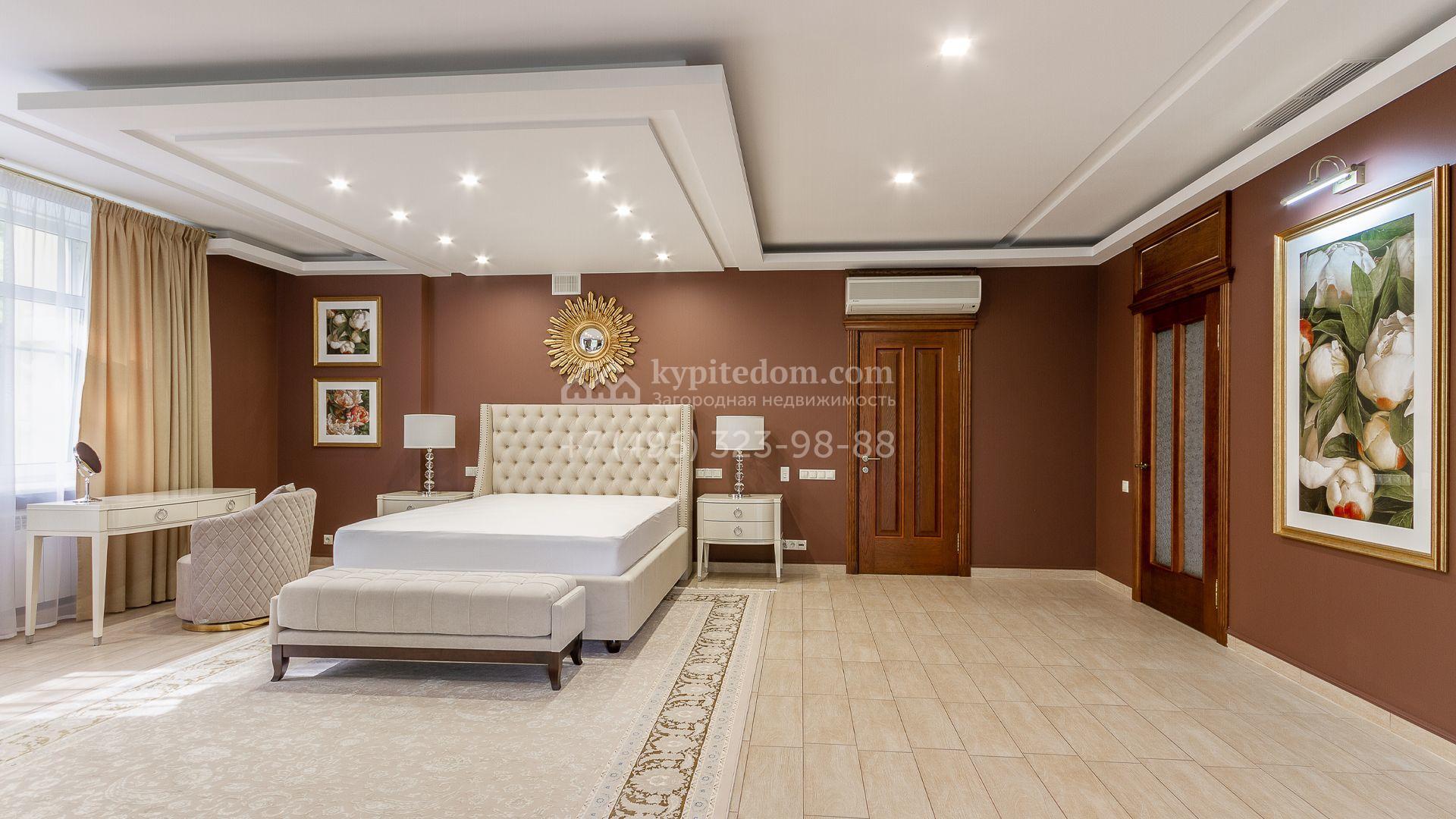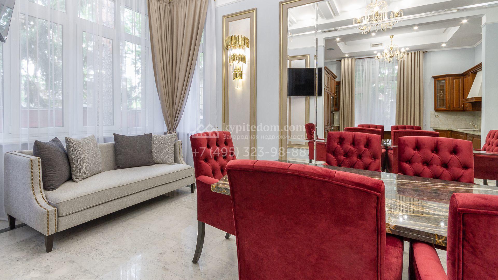 Планировка включает 4 спальни, просторную гостиную с камином, кухню-столовую, кабинет, зимний сад и кинозал. В особняке предусмотрена SPA-зона с бассейном, сауной и комнатой отдыха. На территории с ландшафтным дизайном и вымощенными дорожками расположены дом для персонала со встроенным двухместным гаражом и беседка с зоной барбекю.