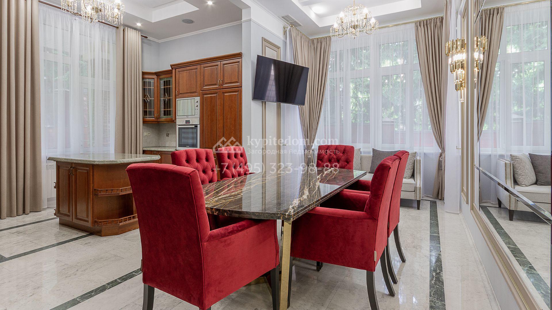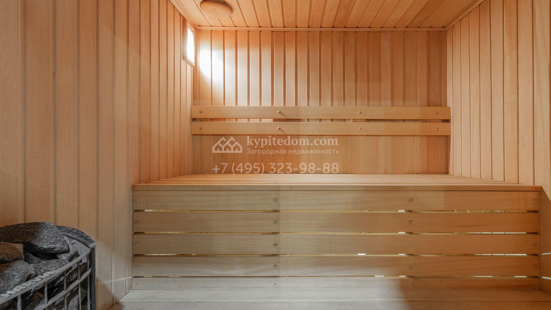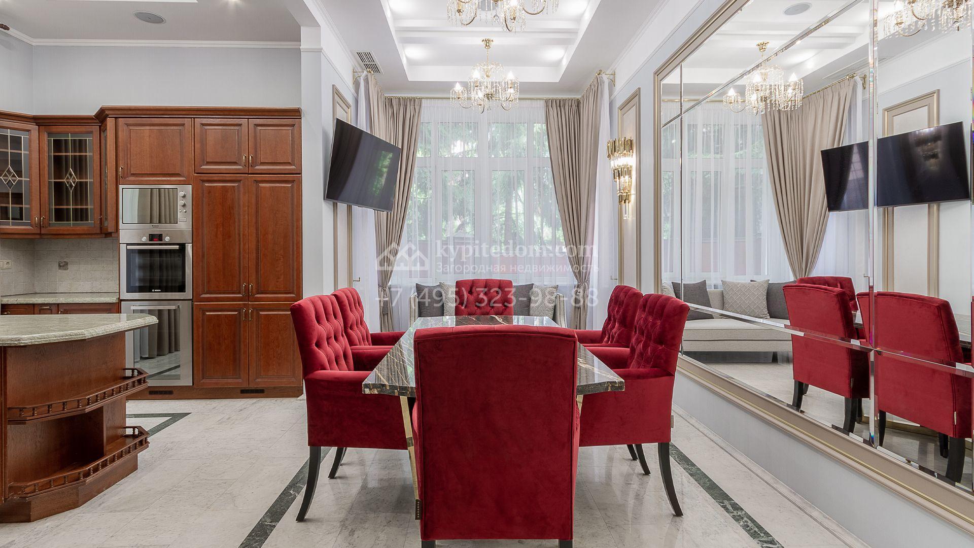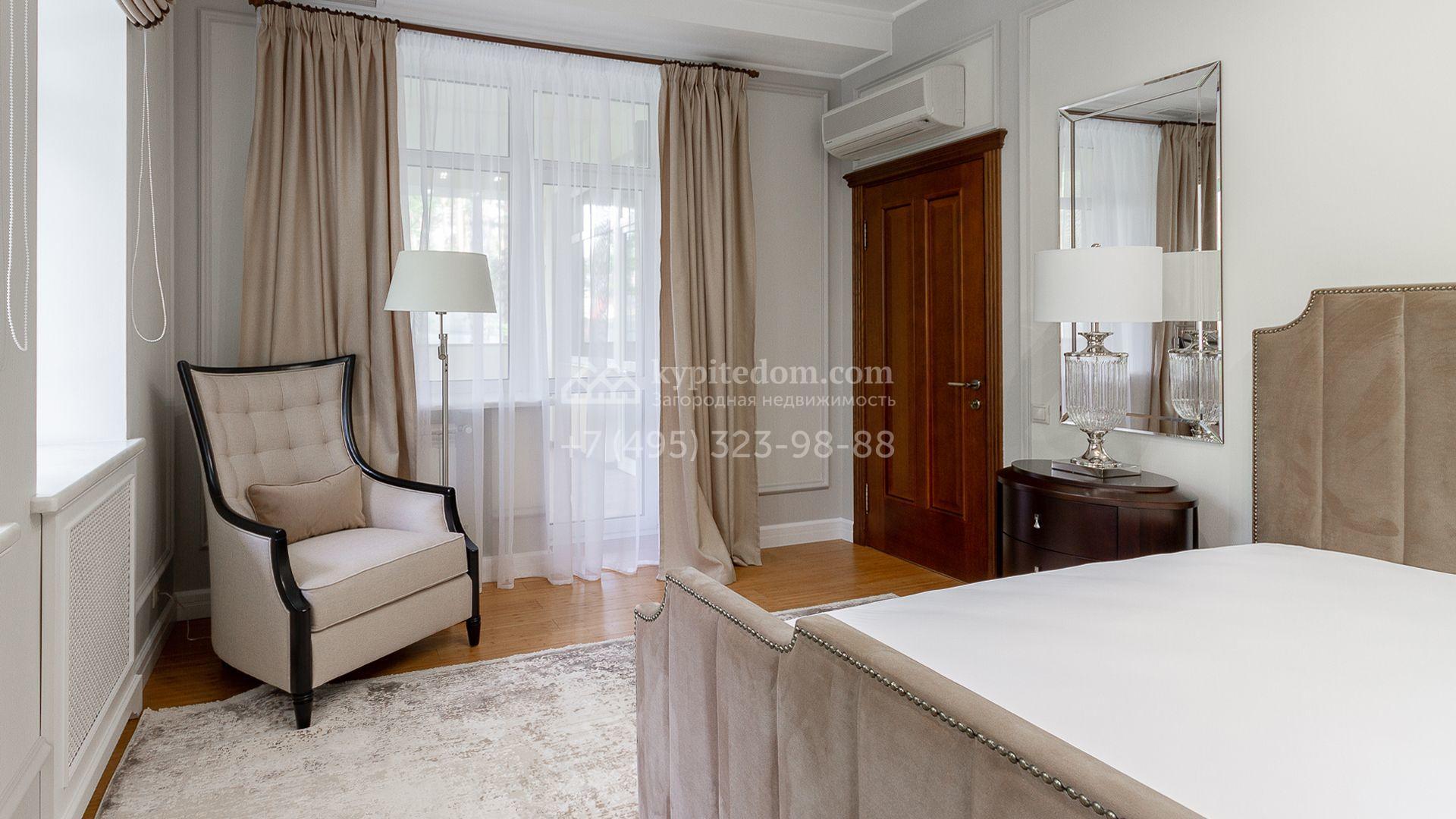 Планировка включает 4 спальни, просторную гостиную с камином, кухню-столовую, кабинет, зимний сад и кинозал. В особняке предусмотрена SPA-зона с бассейном, сауной и комнатой отдыха. На территории с ландшафтным дизайном и вымощенными дорожками расположены дом для персонала со встроенным двухместным гаражом и беседка с зоной барбекю.
