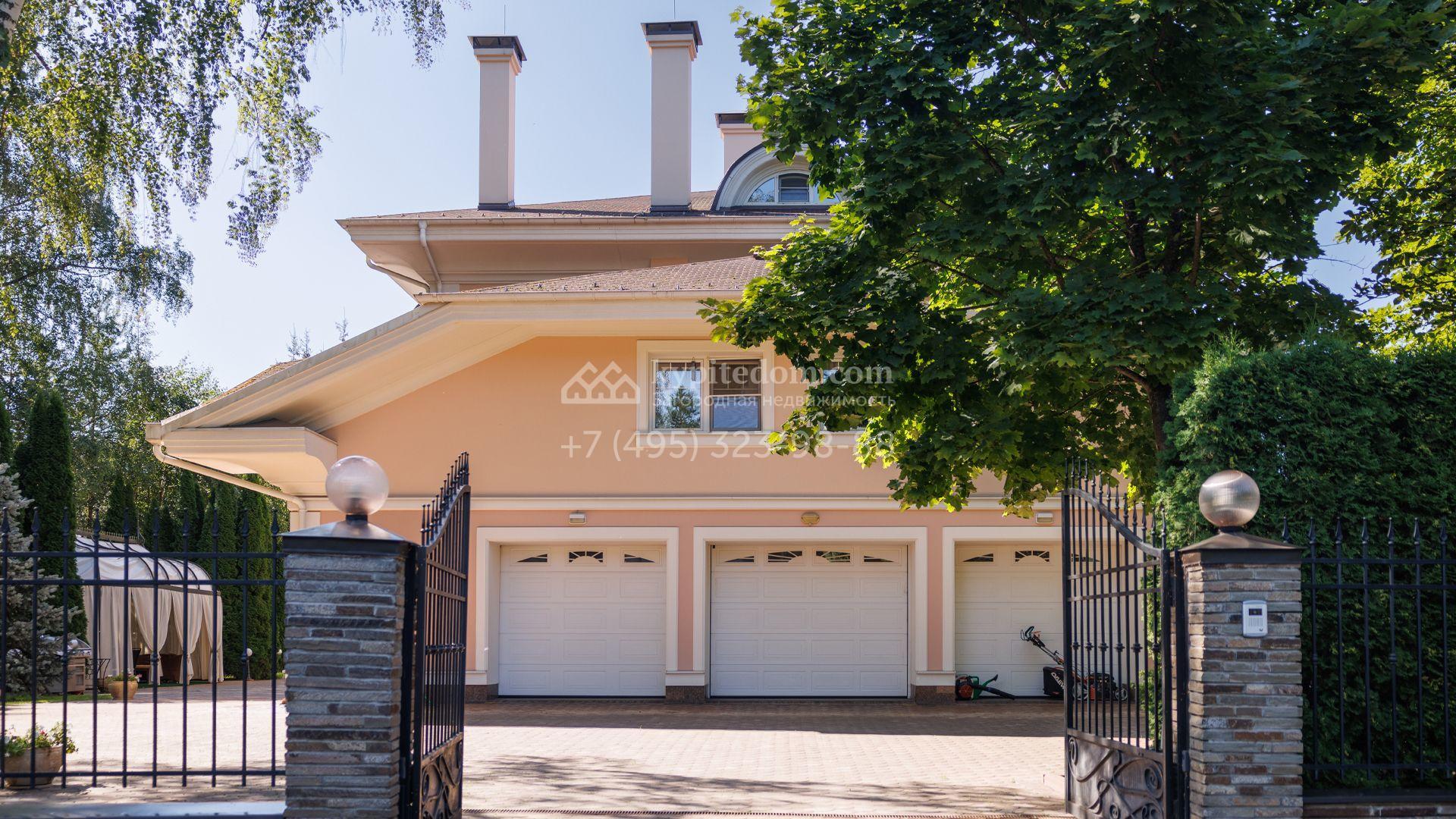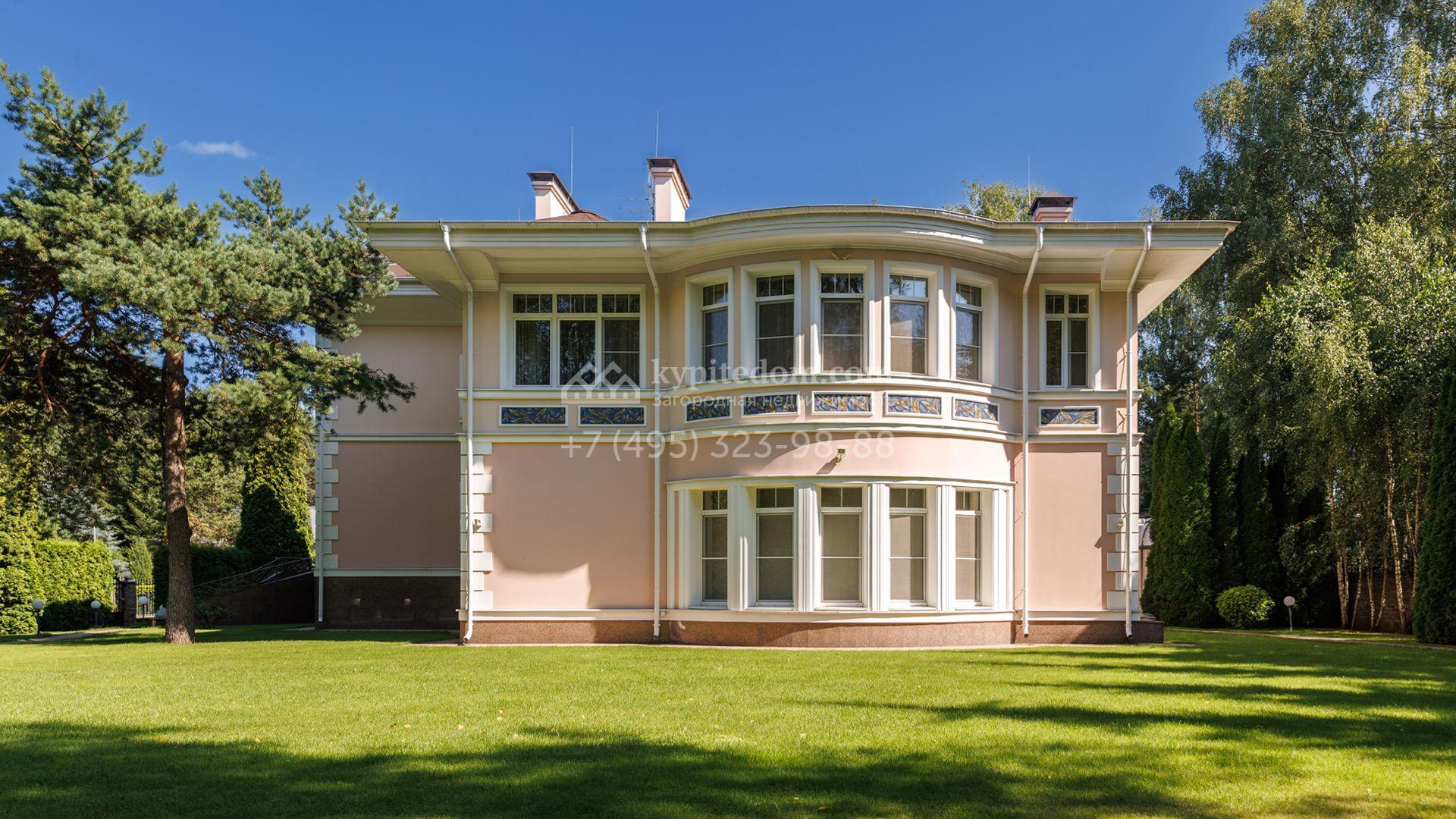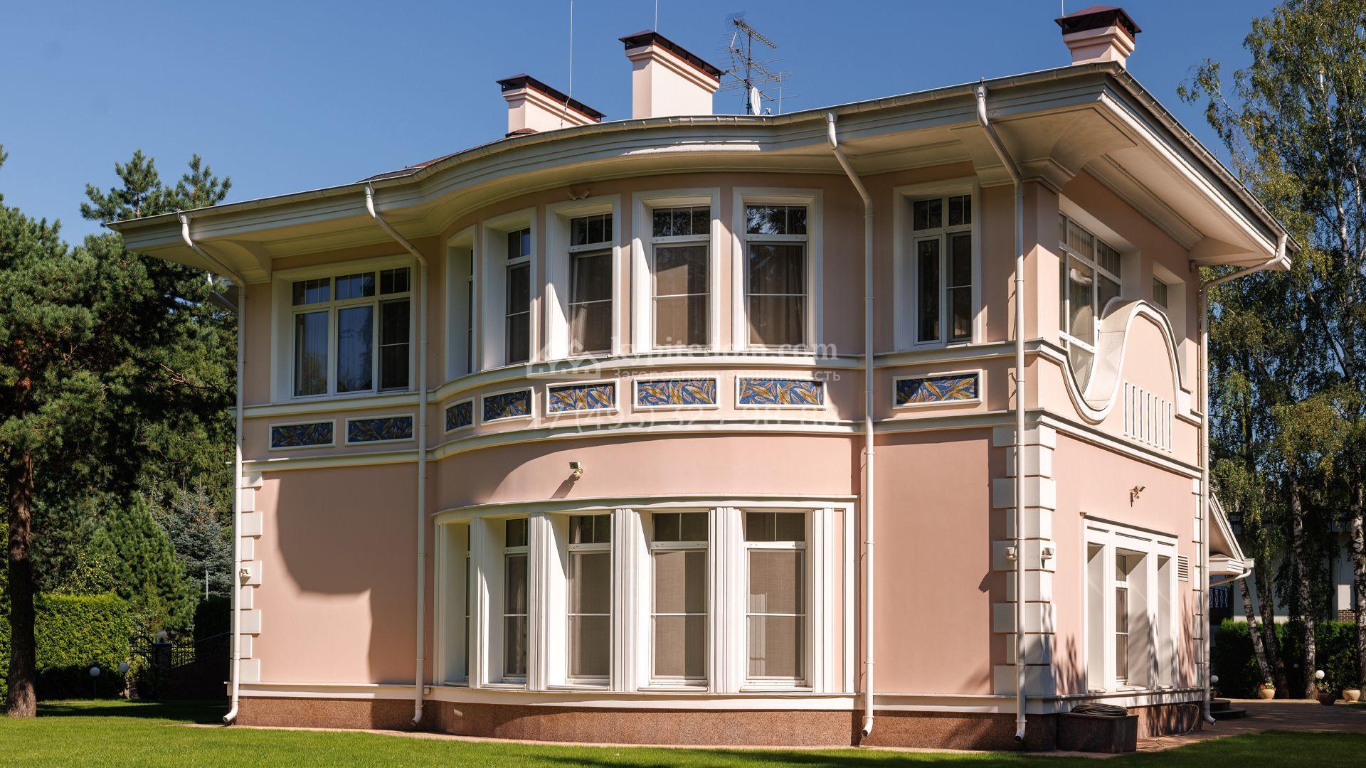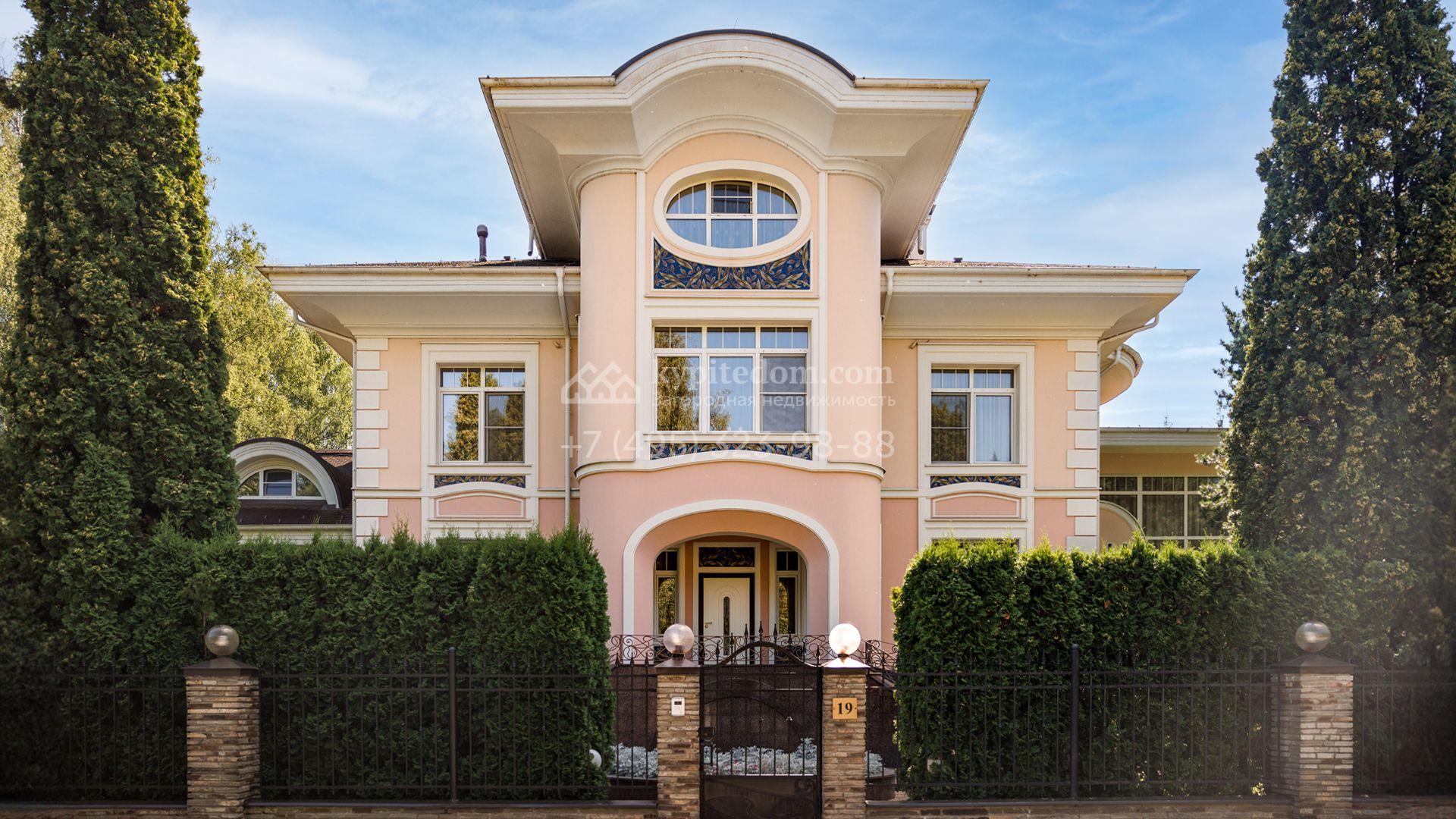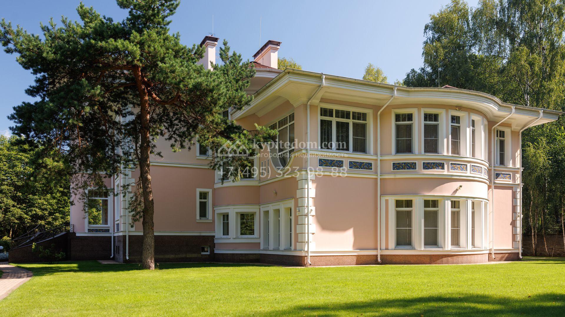 Загородный дом площадью 985 м² расположен на просторном лесном участке 31 сотка. Фасад здания облицован розово-персиковой штукатуркой, декорирован белыми наличниками и мозаичными панно. В отделке интерьера использованы тёплые оттенки, которые создают атмосферу домашнего уюта. В резиденции разместили семь спален, столовую-гостиную с камином, кухню с выходом на участок, кабинет, кинотеатр и спа-зону с бассейном и сауной. В контуре дома предусмотрен гараж на три машины. На участке выполнен ландшафтный дизайн, засеян газон, установлено уличное освещение, вымощены дорожки, высажены ели, туи, липы, березы и обустроен пруд.