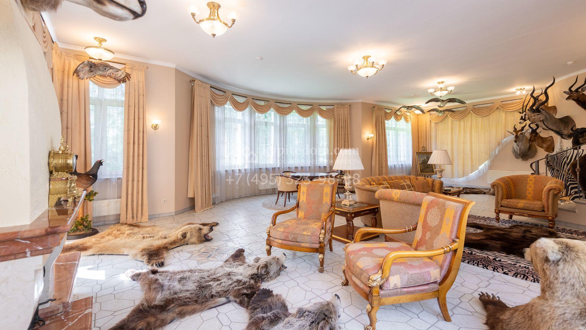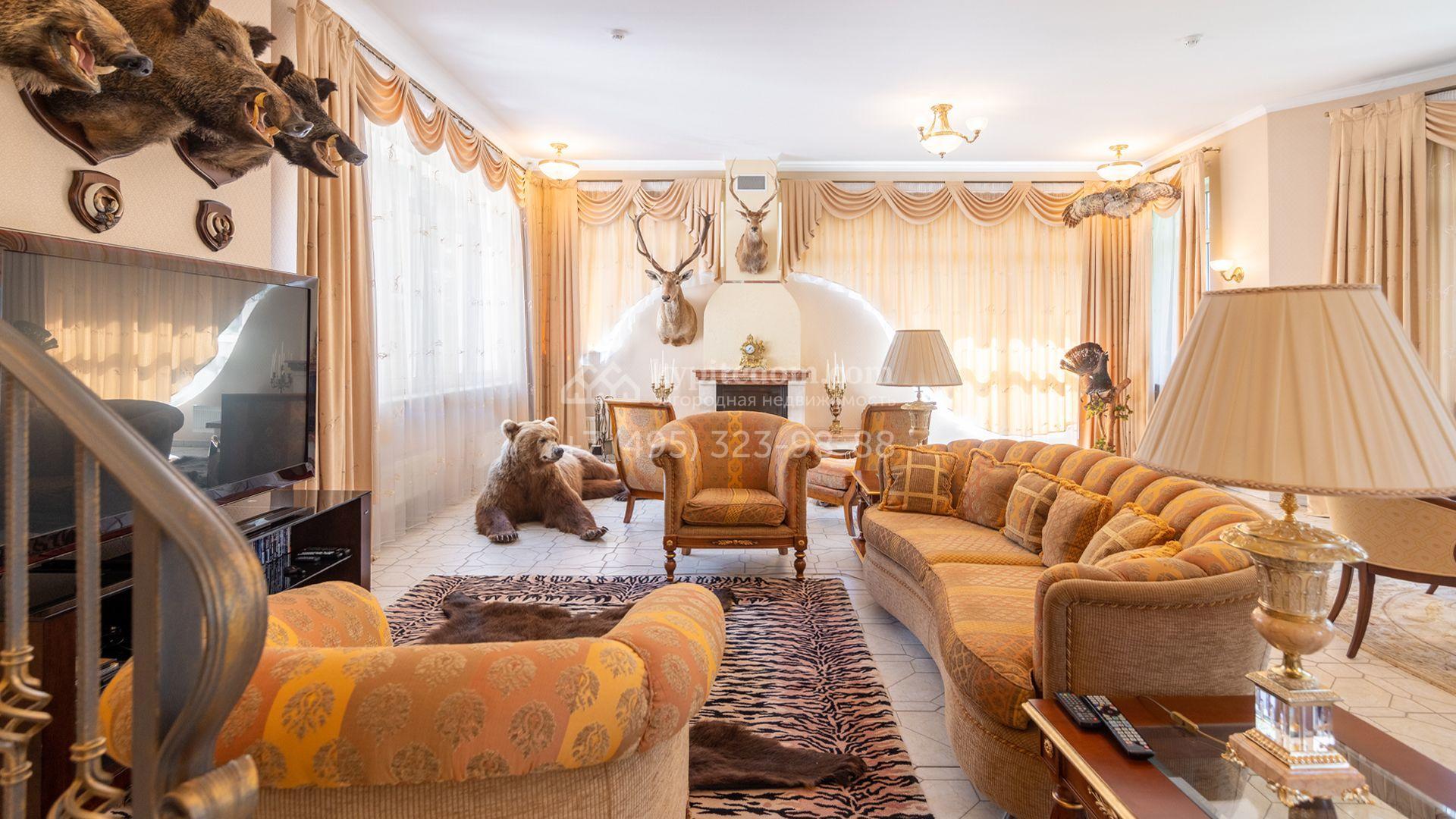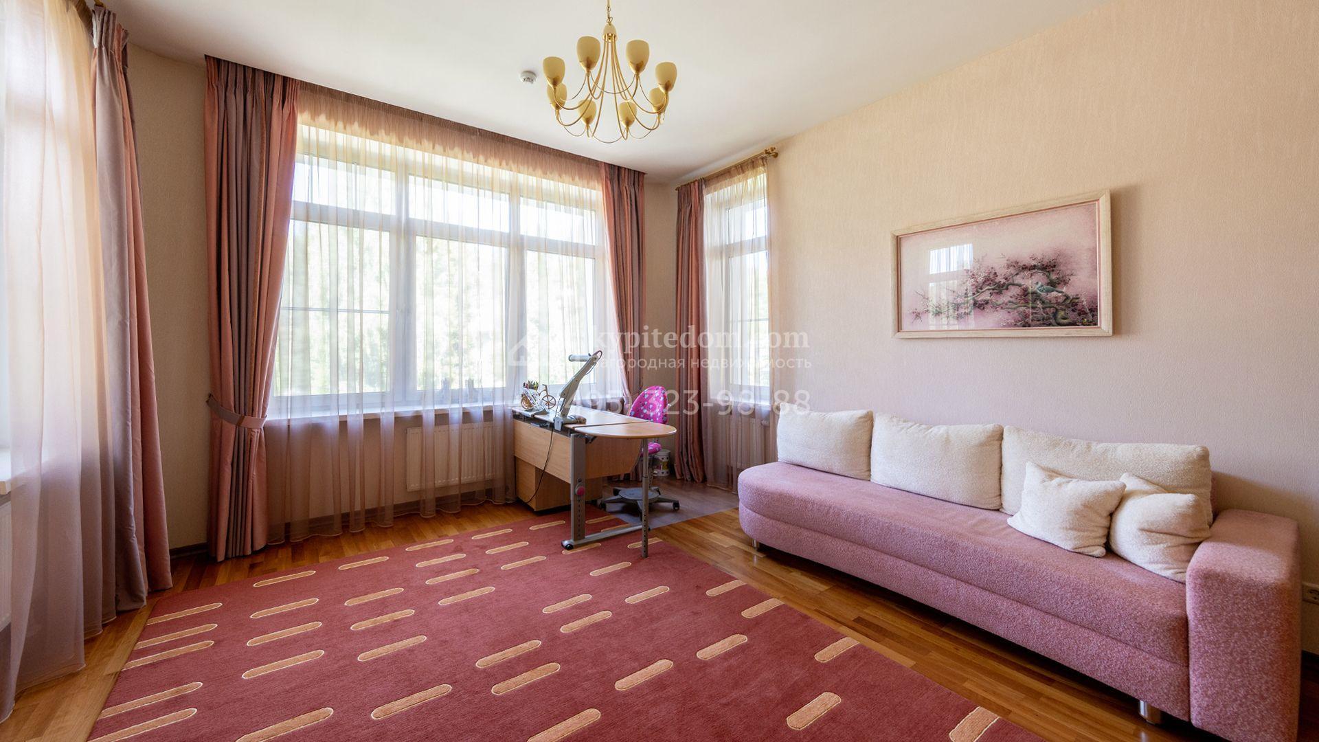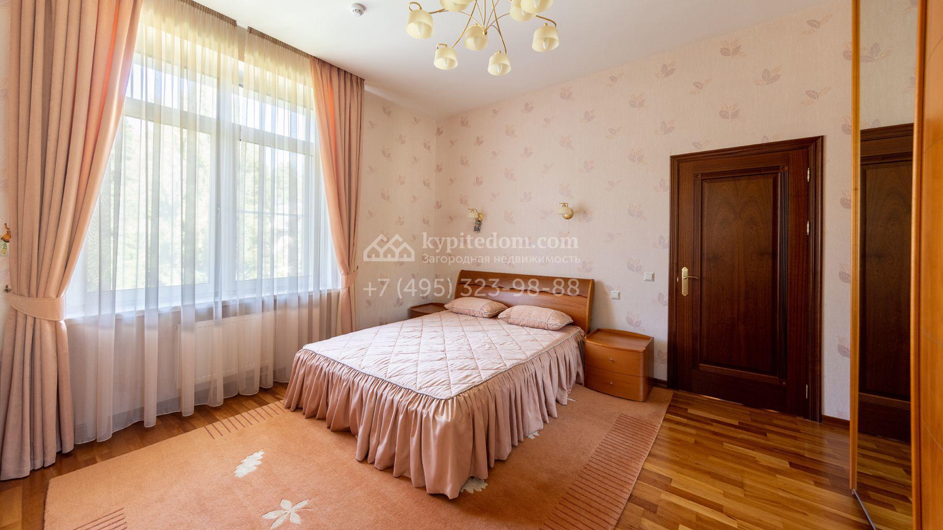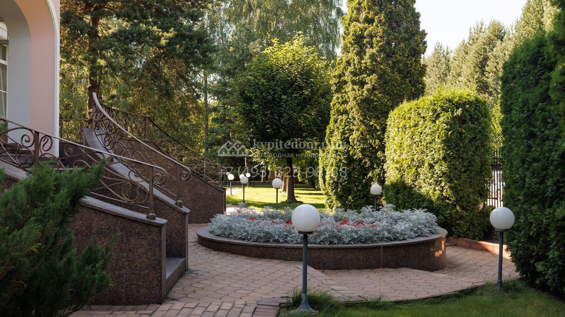 Загородный дом площадью 985 м² расположен на просторном лесном участке 31 сотка. Фасад здания облицован розово-персиковой штукатуркой, декорирован белыми наличниками и мозаичными панно. В отделке интерьера использованы тёплые оттенки, которые создают атмосферу домашнего уюта. В резиденции разместили семь спален, столовую-гостиную с камином, кухню с выходом на участок, кабинет, кинотеатр и спа-зону с бассейном и сауной. В контуре дома предусмотрен гараж на три машины. На участке выполнен ландшафтный дизайн, засеян газон, установлено уличное освещение, вымощены дорожки, высажены ели, туи, липы, березы и обустроен пруд.
