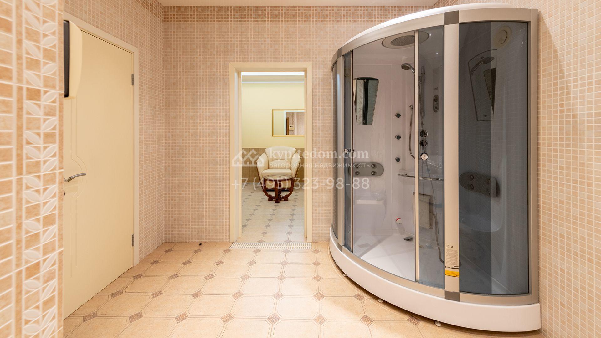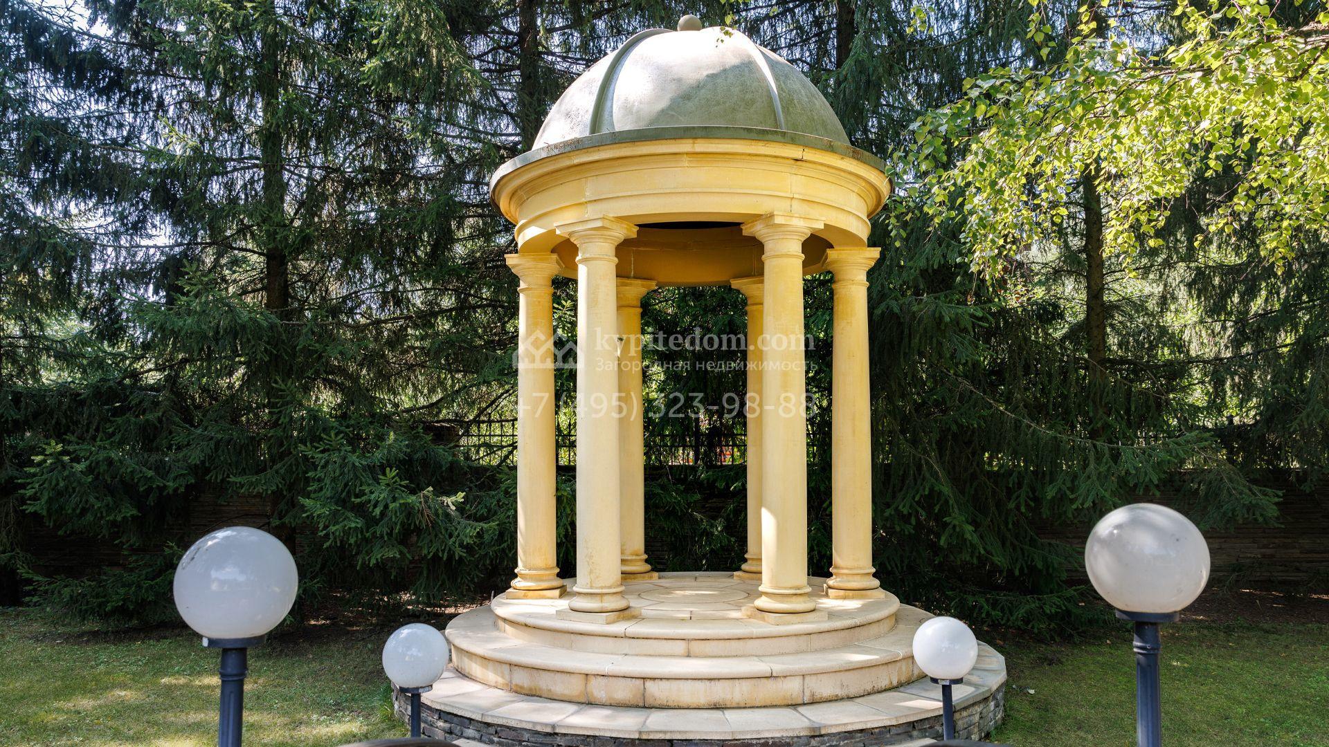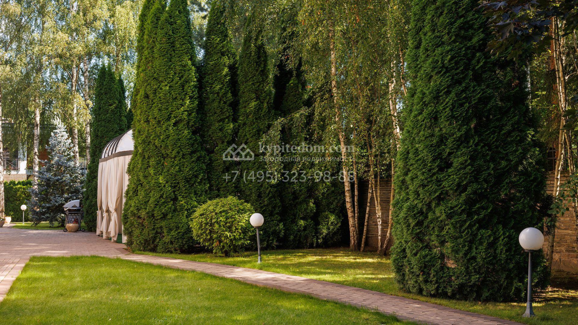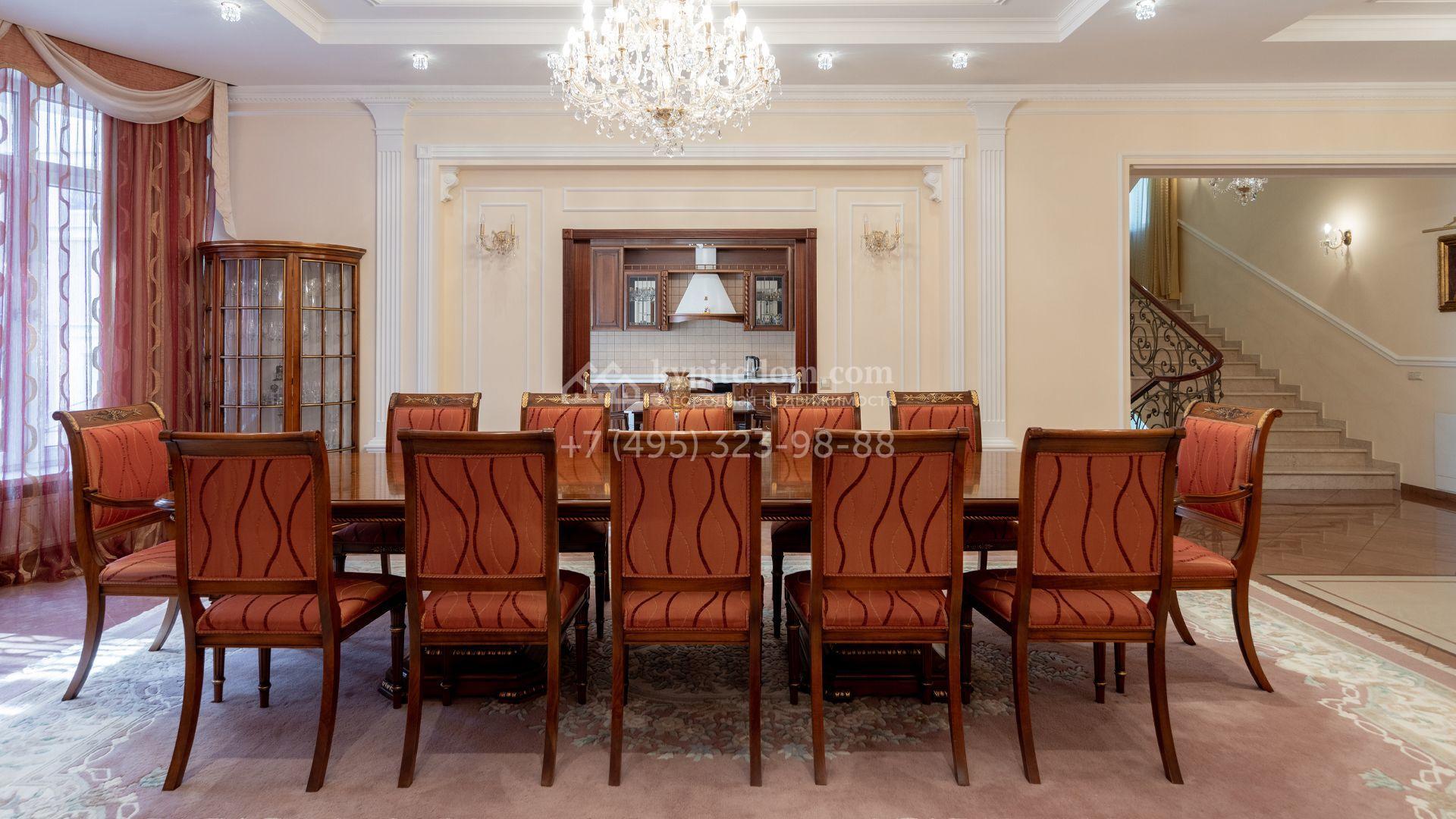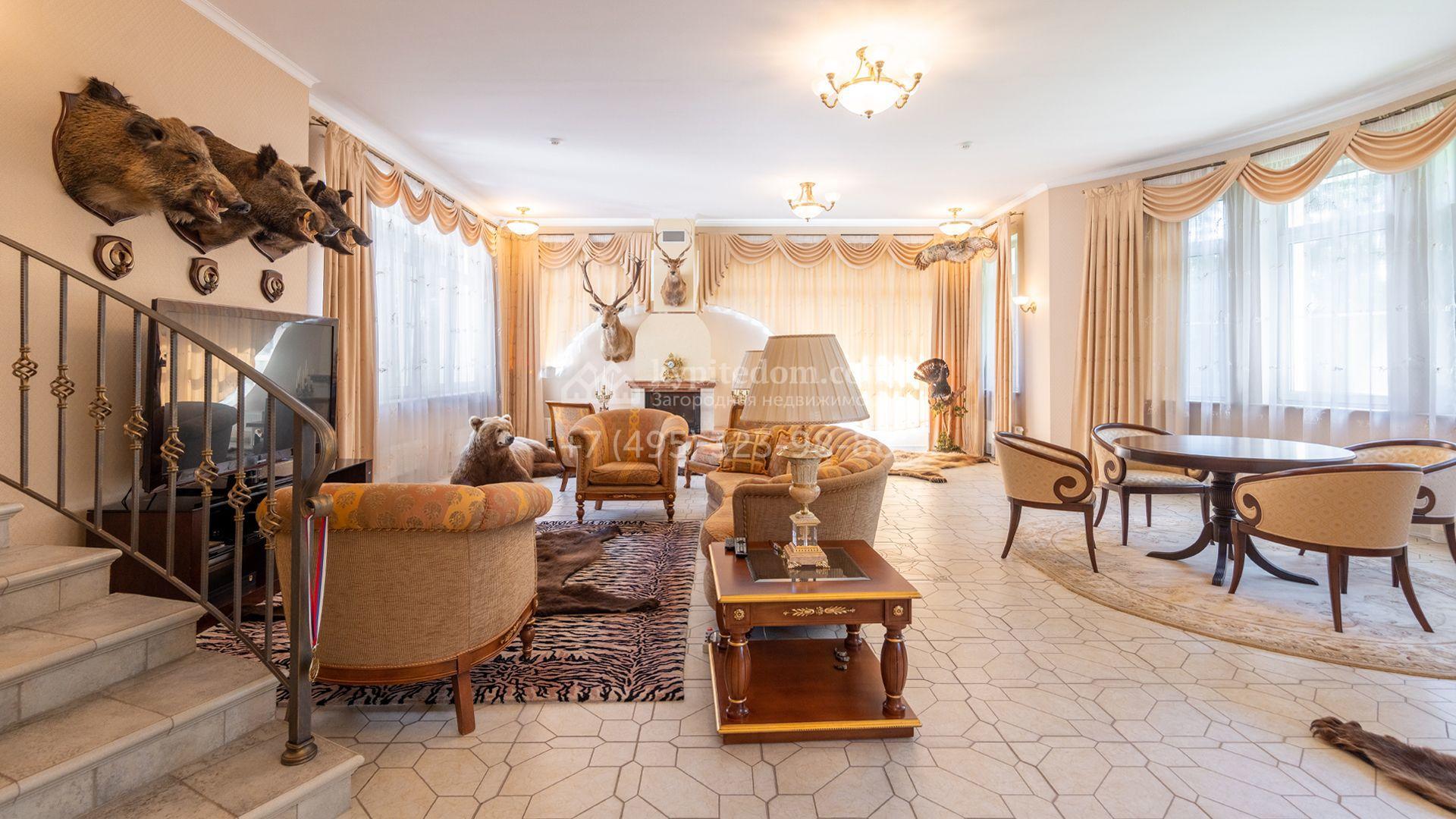 Загородный дом площадью 985 м² расположен на просторном лесном участке 31 сотка. Фасад здания облицован розово-персиковой штукатуркой, декорирован белыми наличниками и мозаичными панно. В отделке интерьера использованы тёплые оттенки, которые создают атмосферу домашнего уюта. В резиденции разместили семь спален, столовую-гостиную с камином, кухню с выходом на участок, кабинет, кинотеатр и спа-зону с бассейном и сауной. В контуре дома предусмотрен гараж на три машины. На участке выполнен ландшафтный дизайн, засеян газон, установлено уличное освещение, вымощены дорожки, высажены ели, туи, липы, березы и обустроен пруд.