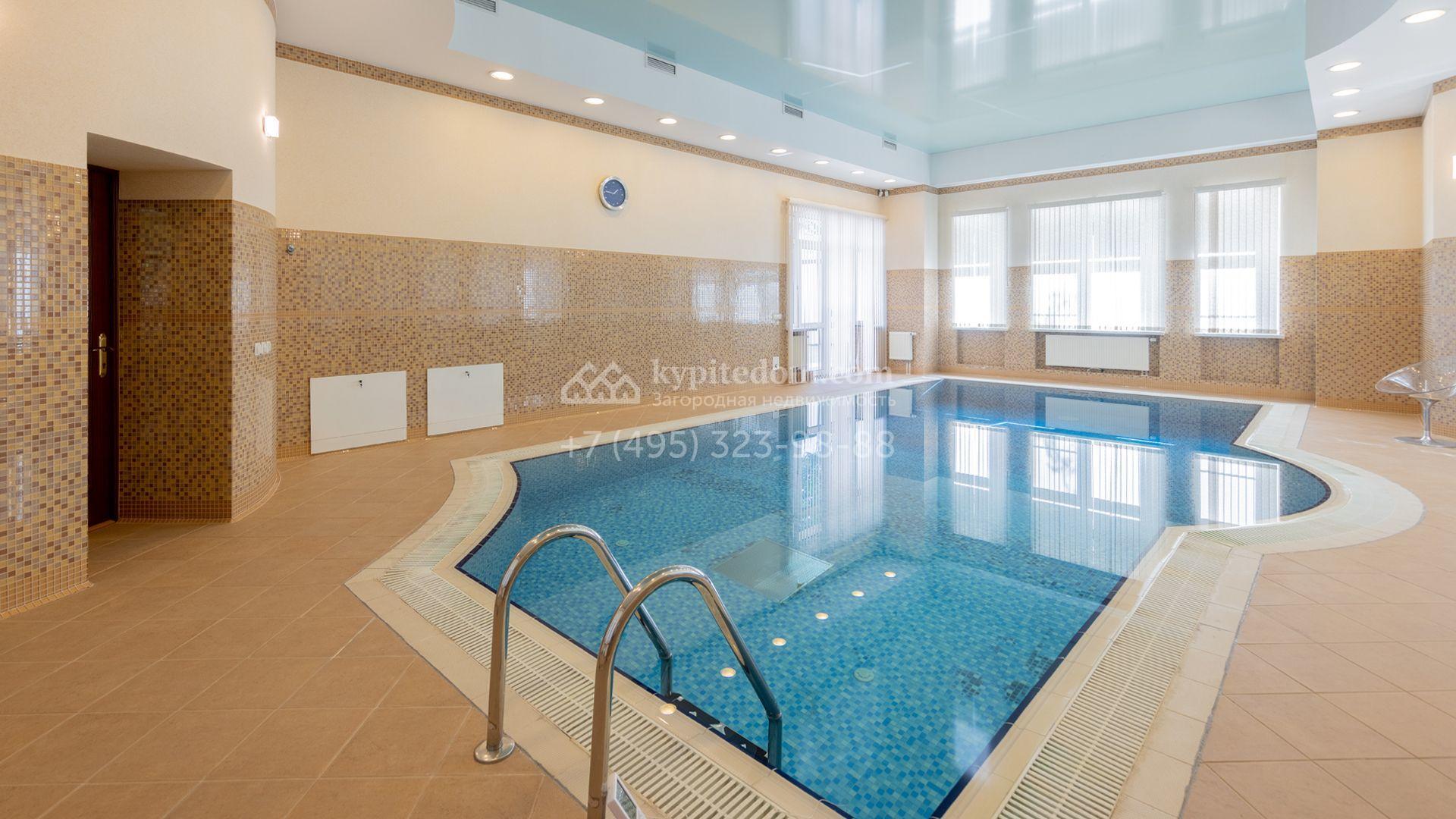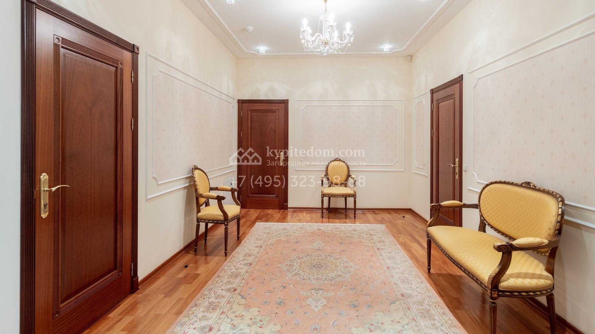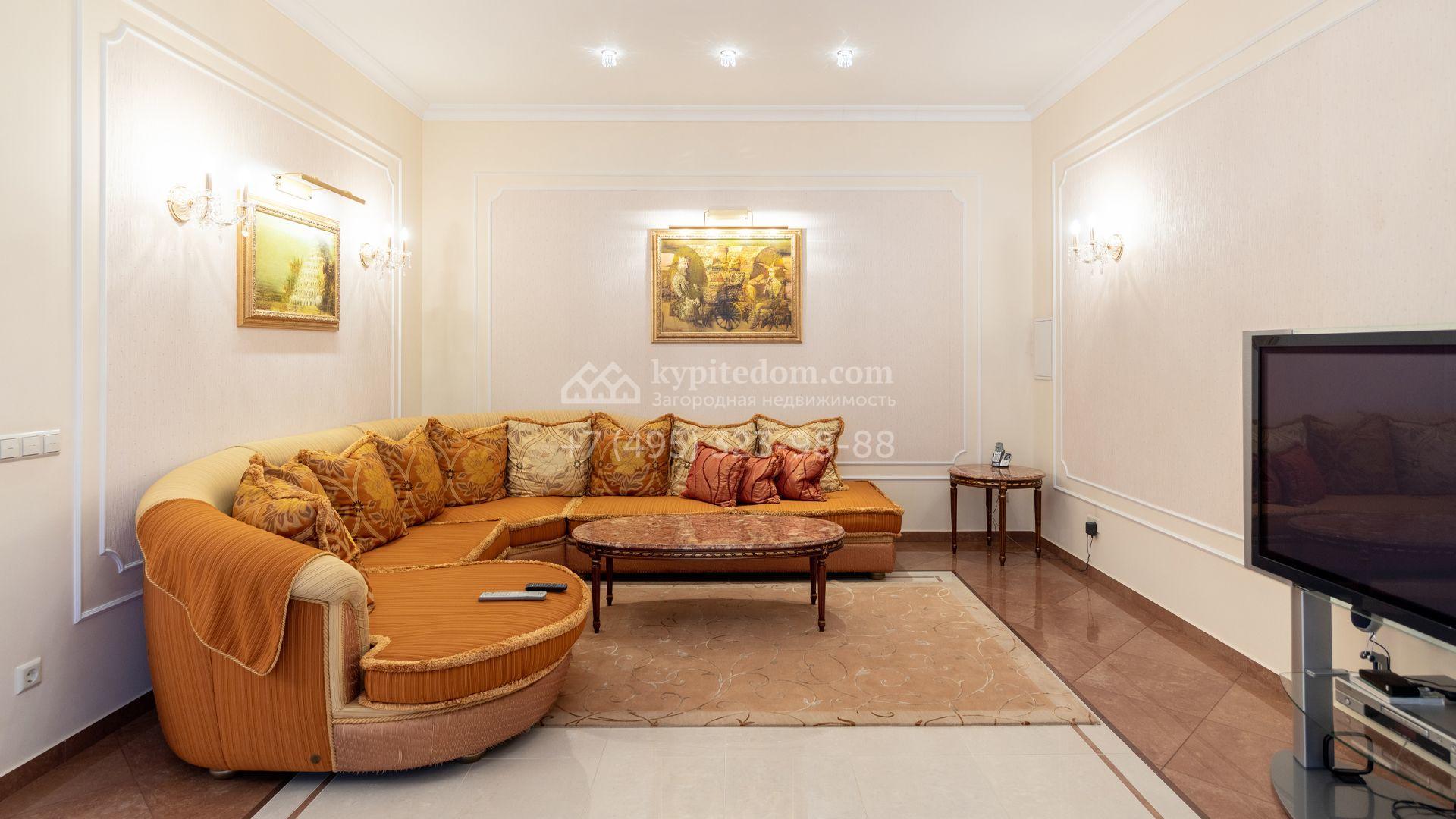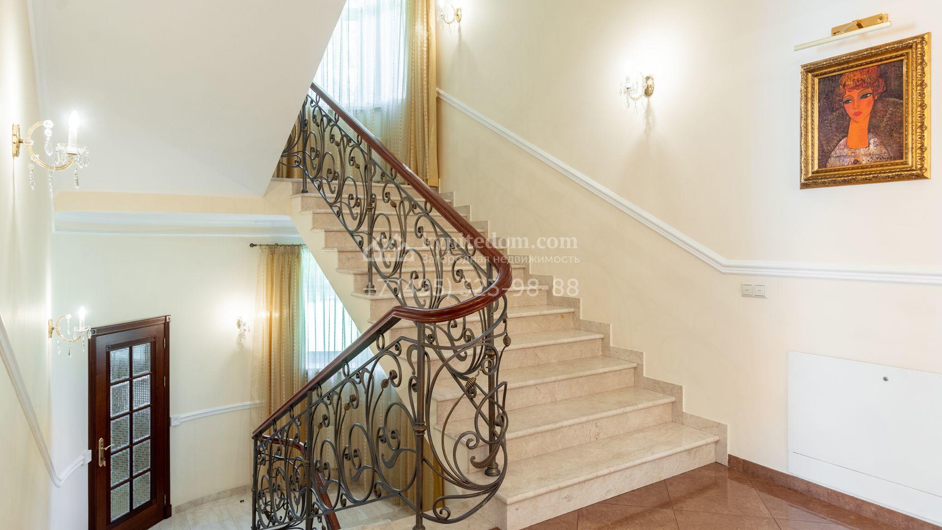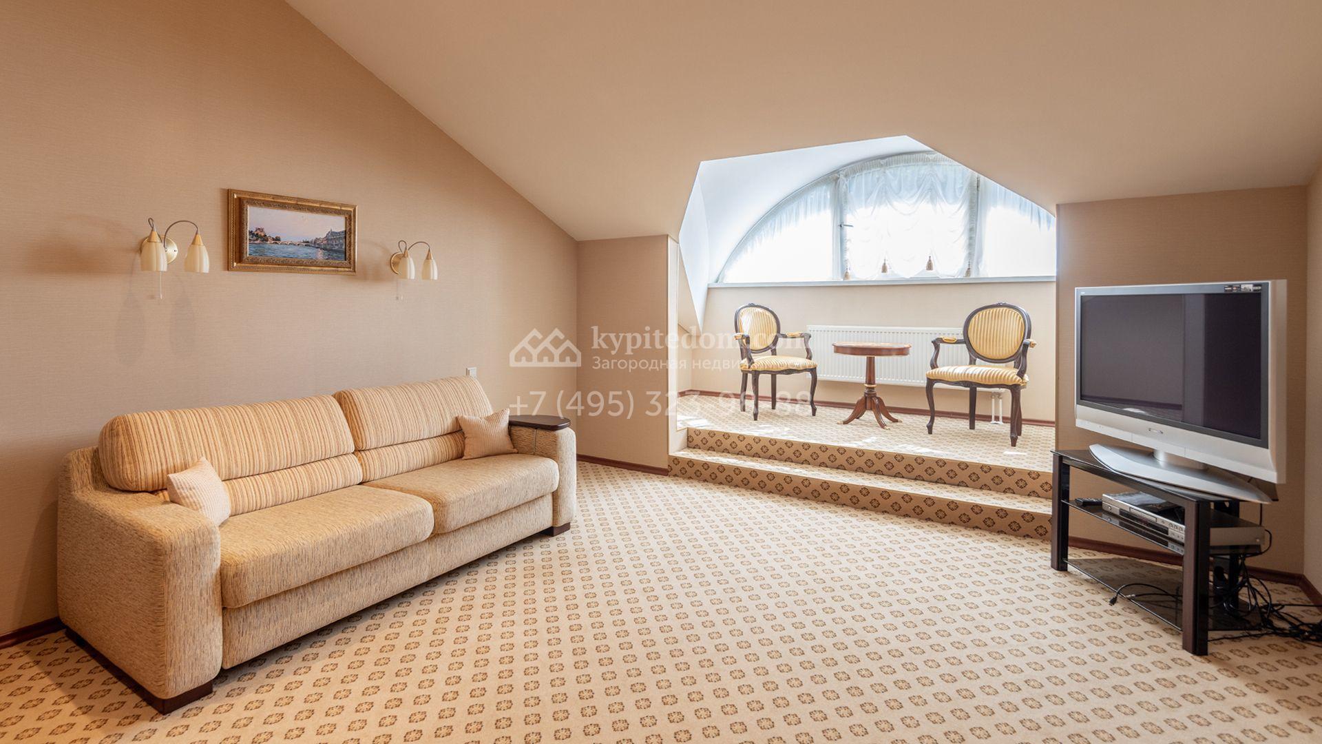 Загородный дом площадью 985 м² расположен на просторном лесном участке 31 сотка. Фасад здания облицован розово-персиковой штукатуркой, декорирован белыми наличниками и мозаичными панно. В отделке интерьера использованы тёплые оттенки, которые создают атмосферу домашнего уюта. В резиденции разместили семь спален, столовую-гостиную с камином, кухню с выходом на участок, кабинет, кинотеатр и спа-зону с бассейном и сауной. В контуре дома предусмотрен гараж на три машины. На участке выполнен ландшафтный дизайн, засеян газон, установлено уличное освещение, вымощены дорожки, высажены ели, туи, липы, березы и обустроен пруд.