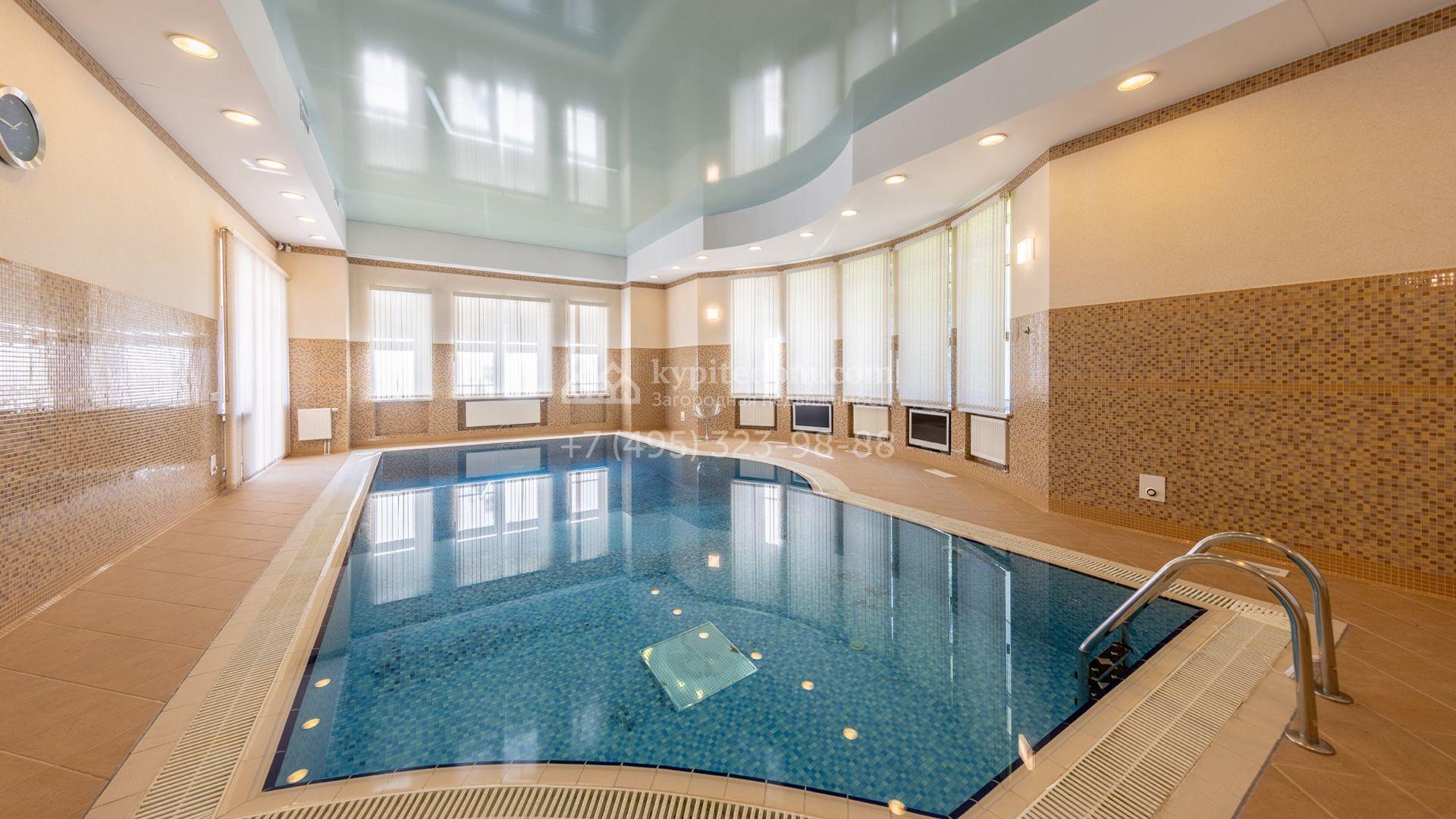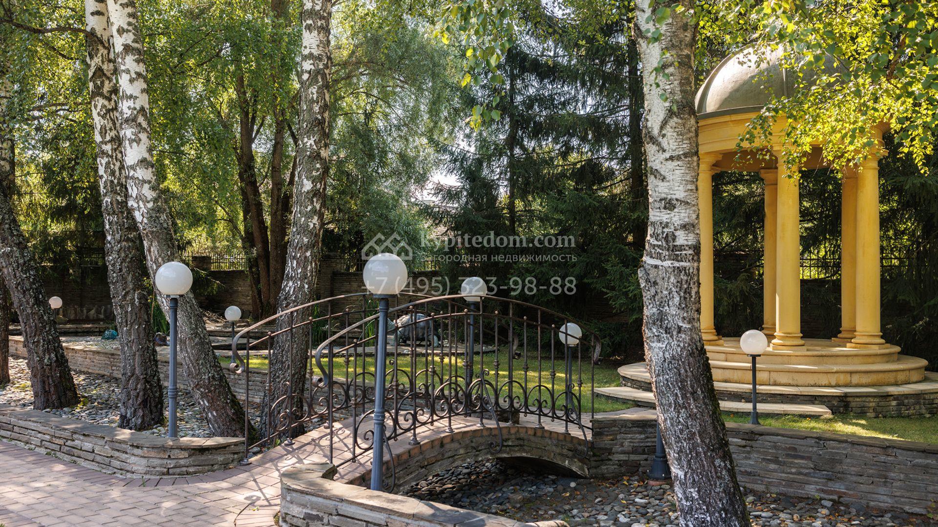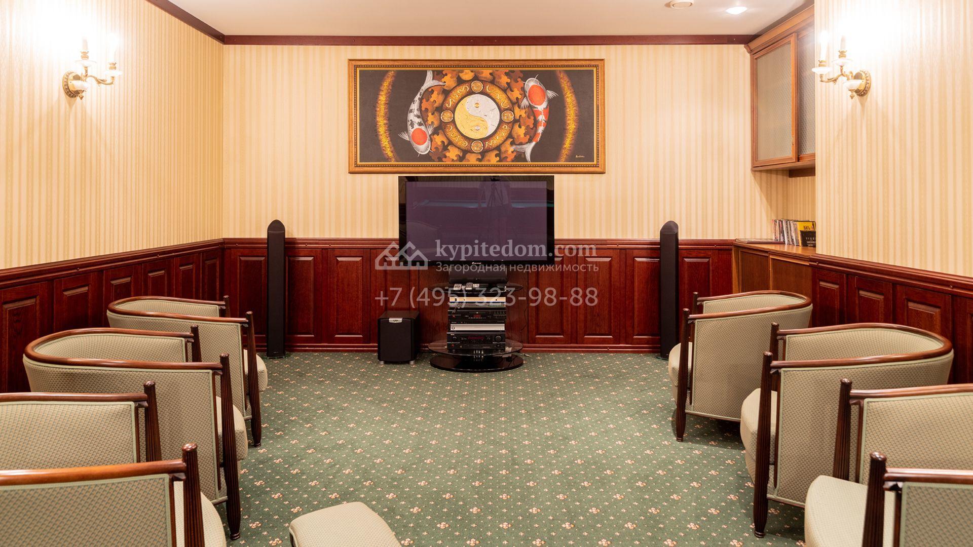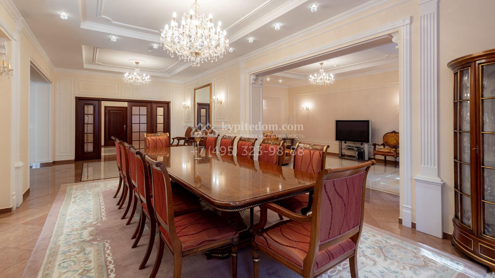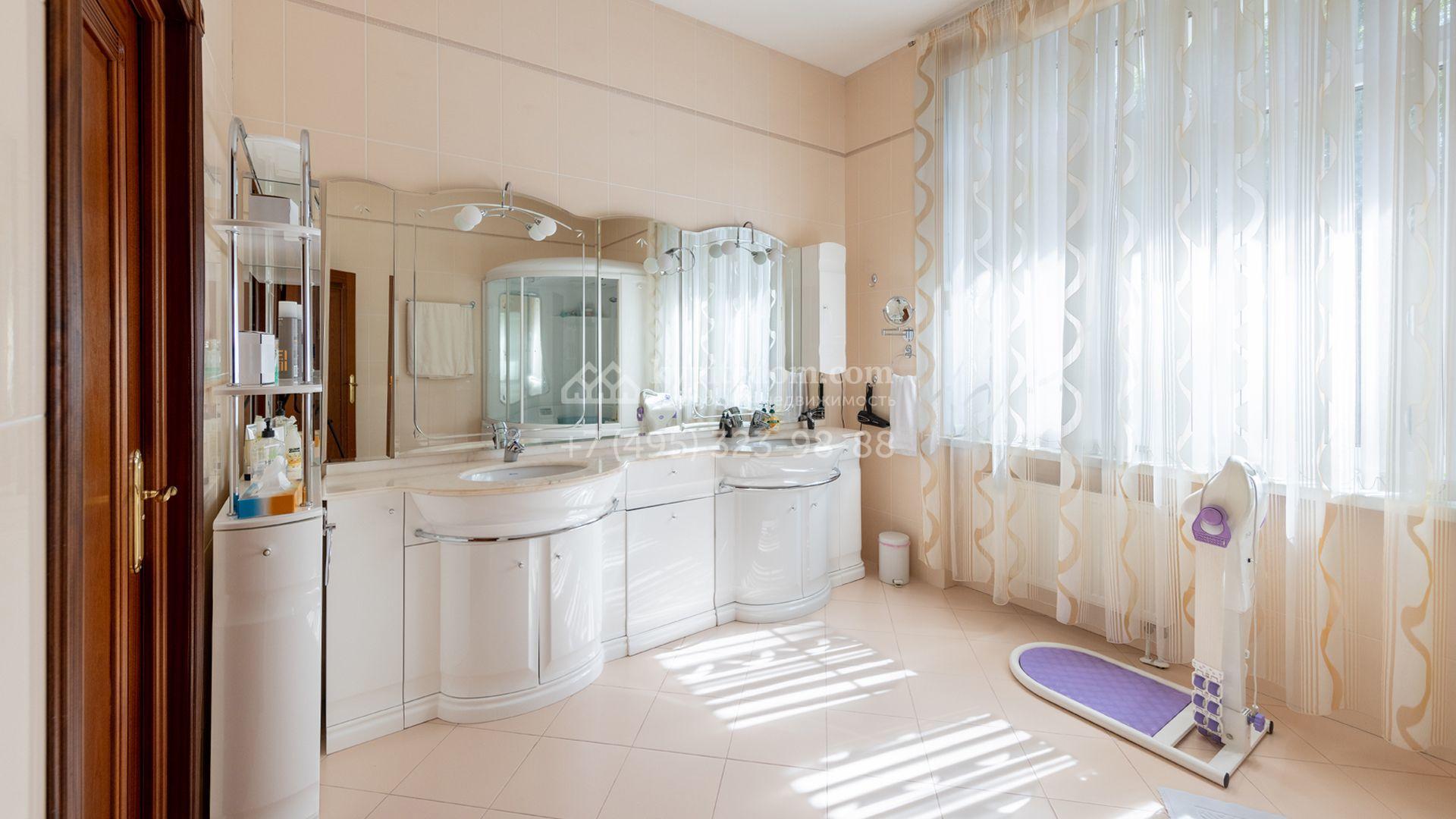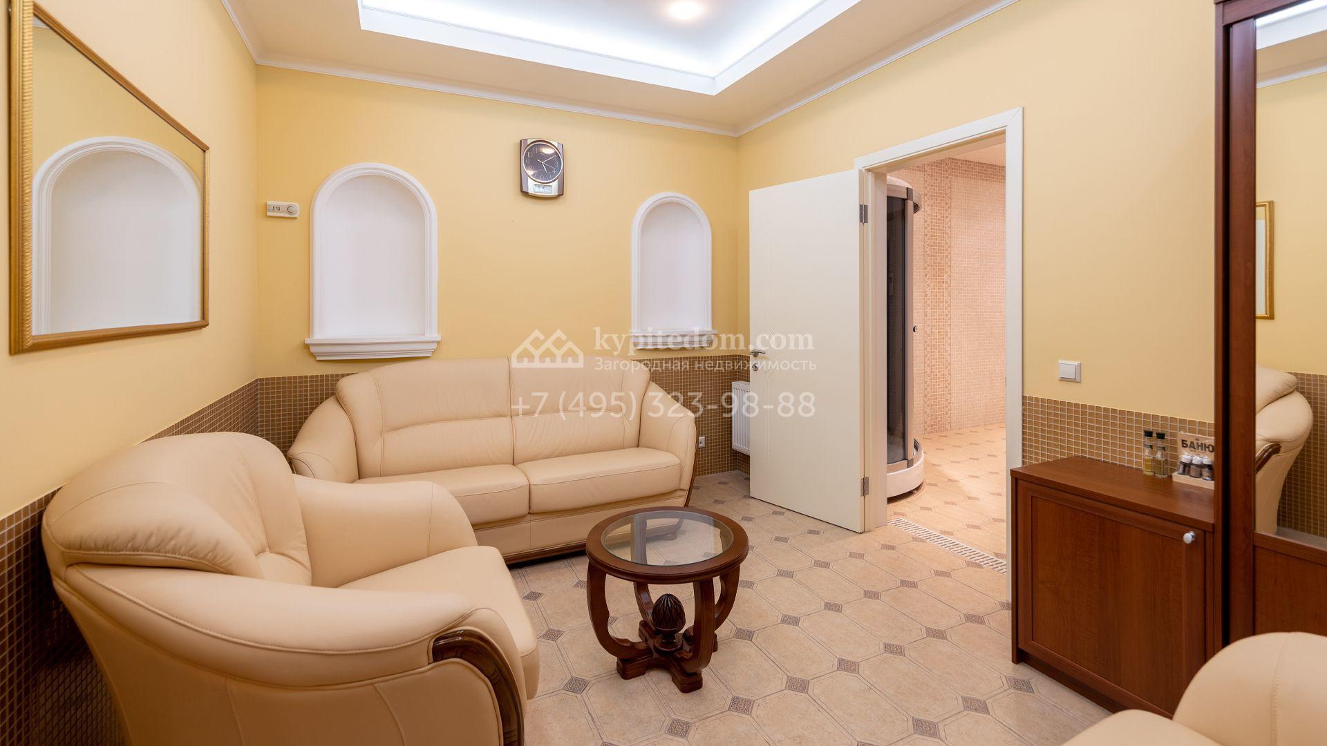 Загородный дом площадью 985 м² расположен на просторном лесном участке 31 сотка. Фасад здания облицован розово-персиковой штукатуркой, декорирован белыми наличниками и мозаичными панно. В отделке интерьера использованы тёплые оттенки, которые создают атмосферу домашнего уюта. В резиденции разместили семь спален, столовую-гостиную с камином, кухню с выходом на участок, кабинет, кинотеатр и спа-зону с бассейном и сауной. В контуре дома предусмотрен гараж на три машины. На участке выполнен ландшафтный дизайн, засеян газон, установлено уличное освещение, вымощены дорожки, высажены ели, туи, липы, березы и обустроен пруд.