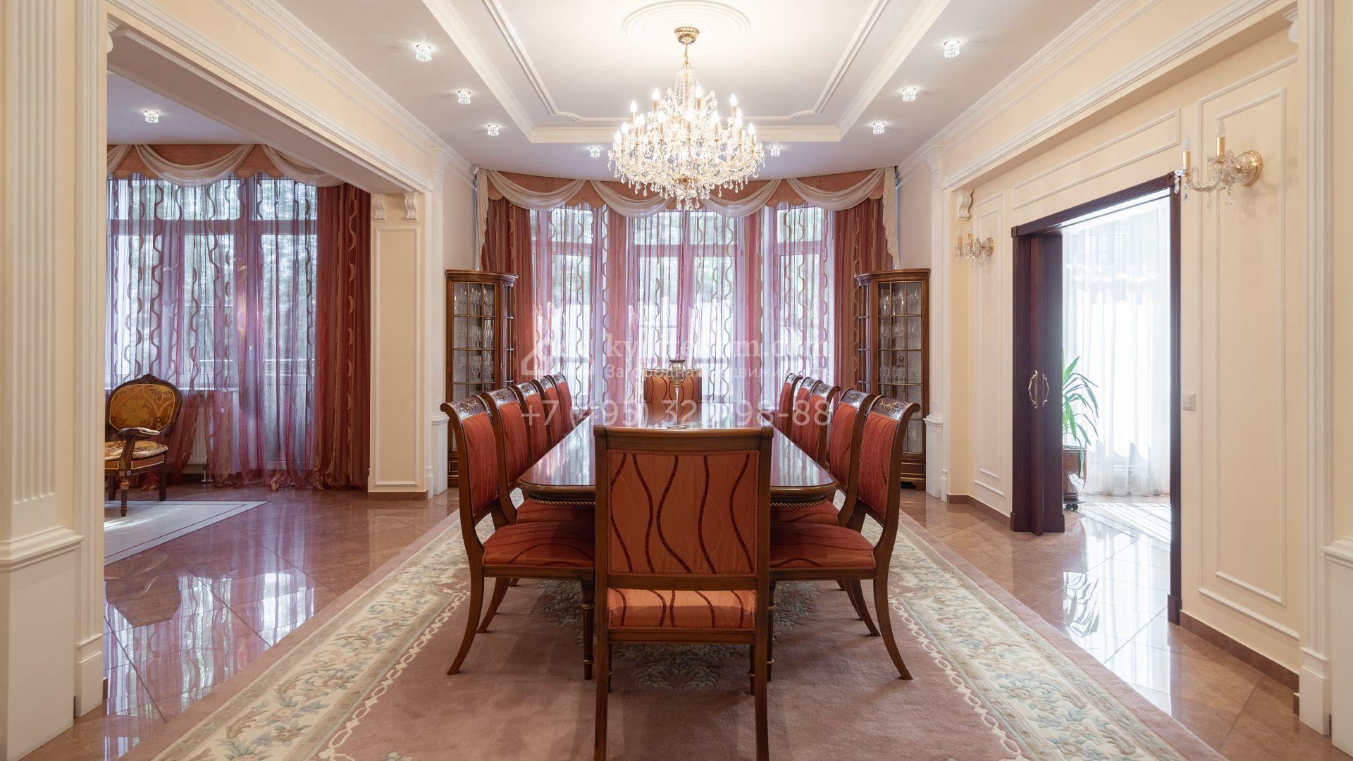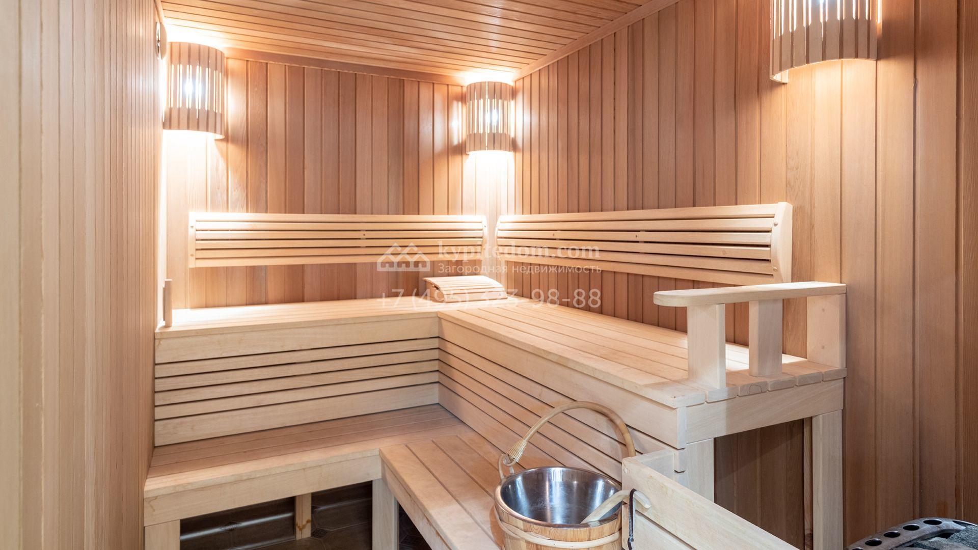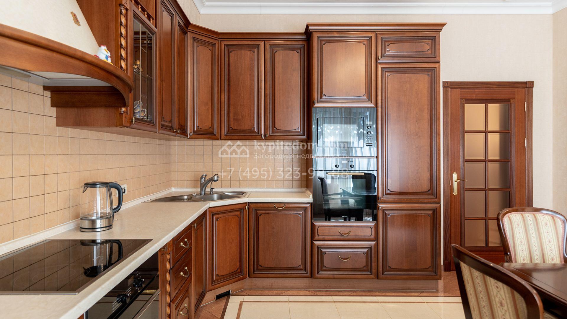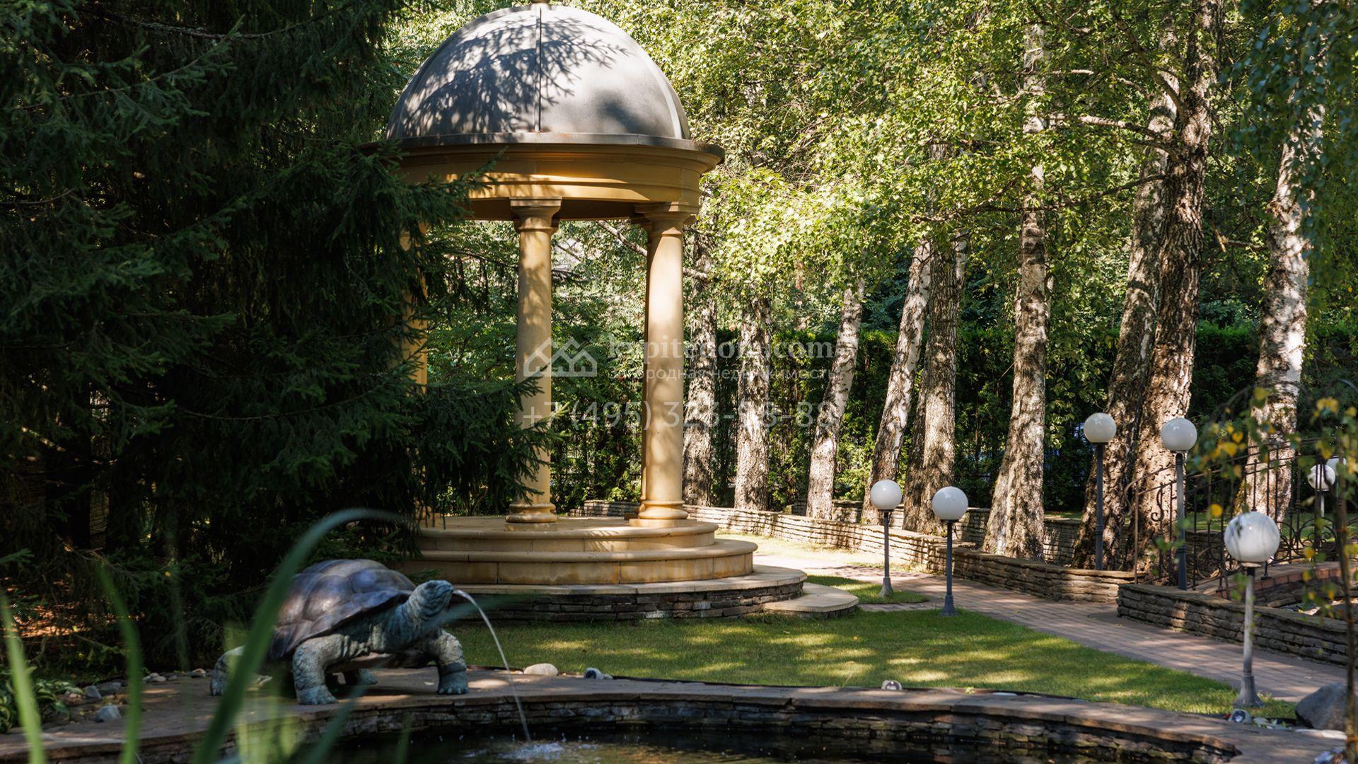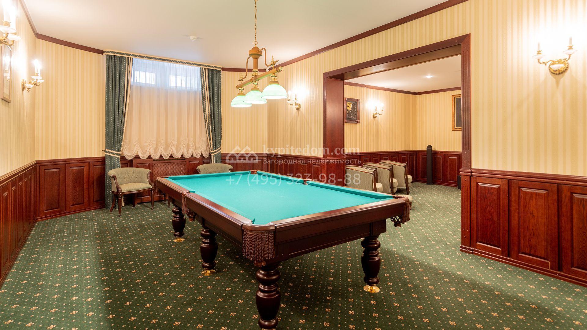 Загородный дом площадью 985 м² расположен на просторном лесном участке 31 сотка. Фасад здания облицован розово-персиковой штукатуркой, декорирован белыми наличниками и мозаичными панно. В отделке интерьера использованы тёплые оттенки, которые создают атмосферу домашнего уюта. В резиденции разместили семь спален, столовую-гостиную с камином, кухню с выходом на участок, кабинет, кинотеатр и спа-зону с бассейном и сауной. В контуре дома предусмотрен гараж на три машины. На участке выполнен ландшафтный дизайн, засеян газон, установлено уличное освещение, вымощены дорожки, высажены ели, туи, липы, березы и обустроен пруд.
