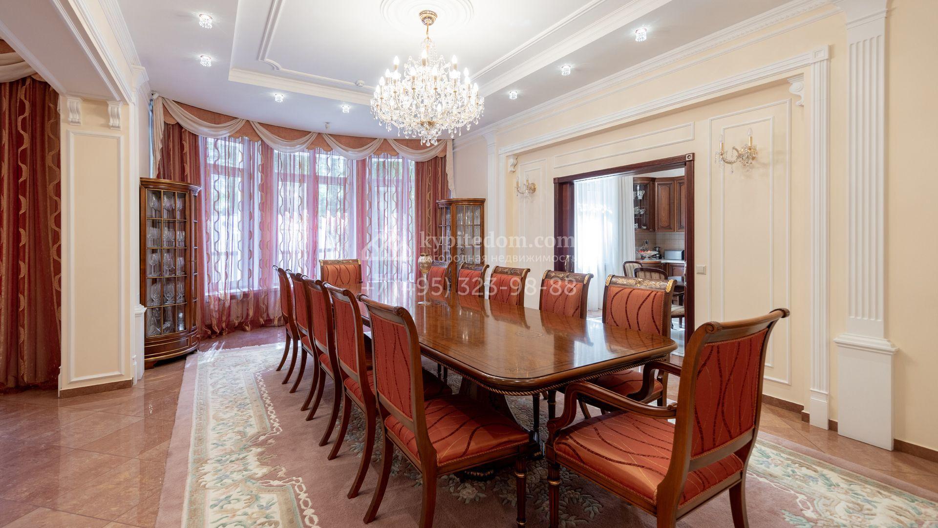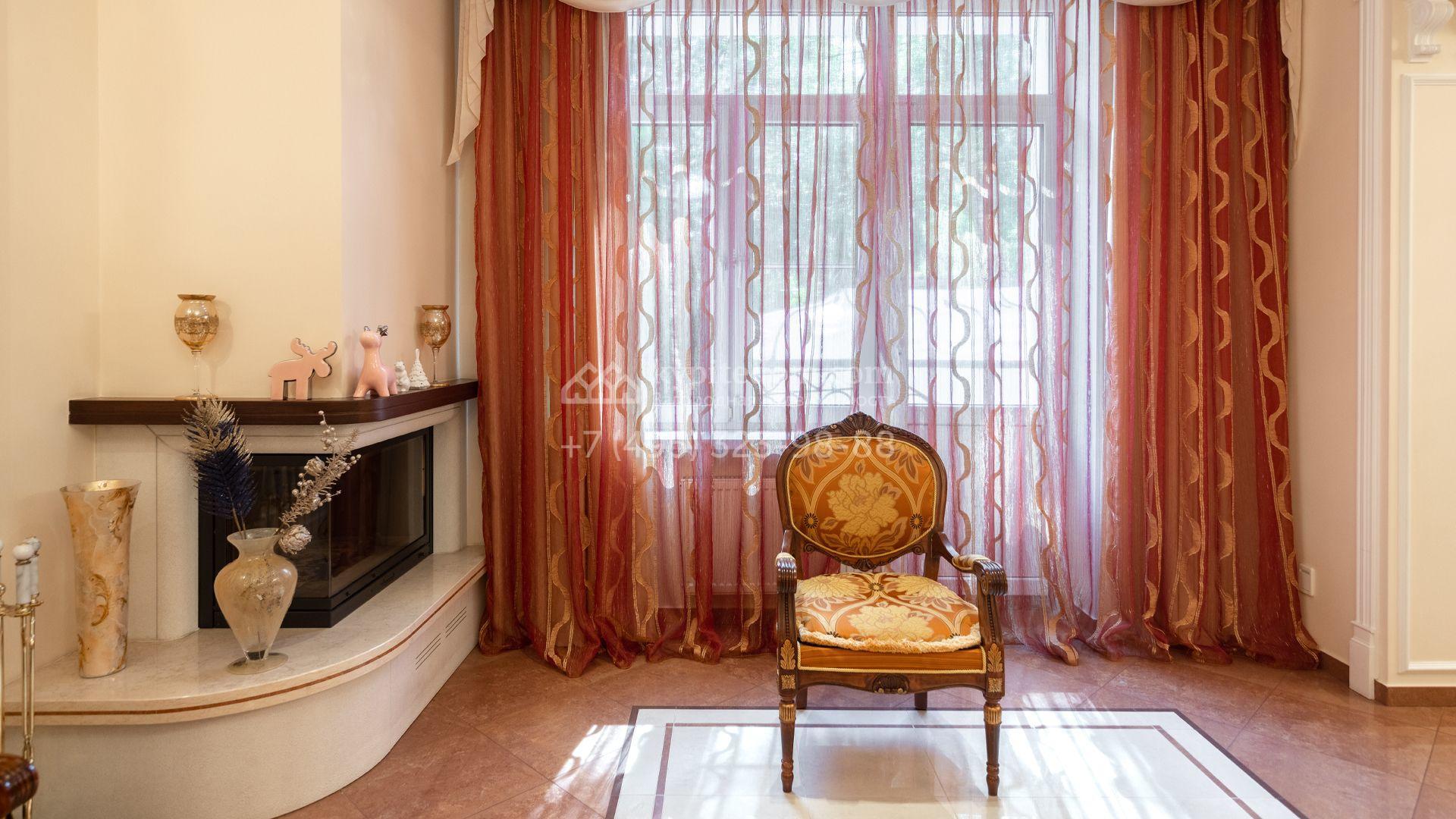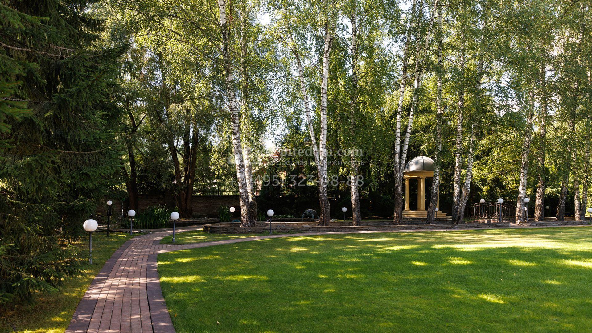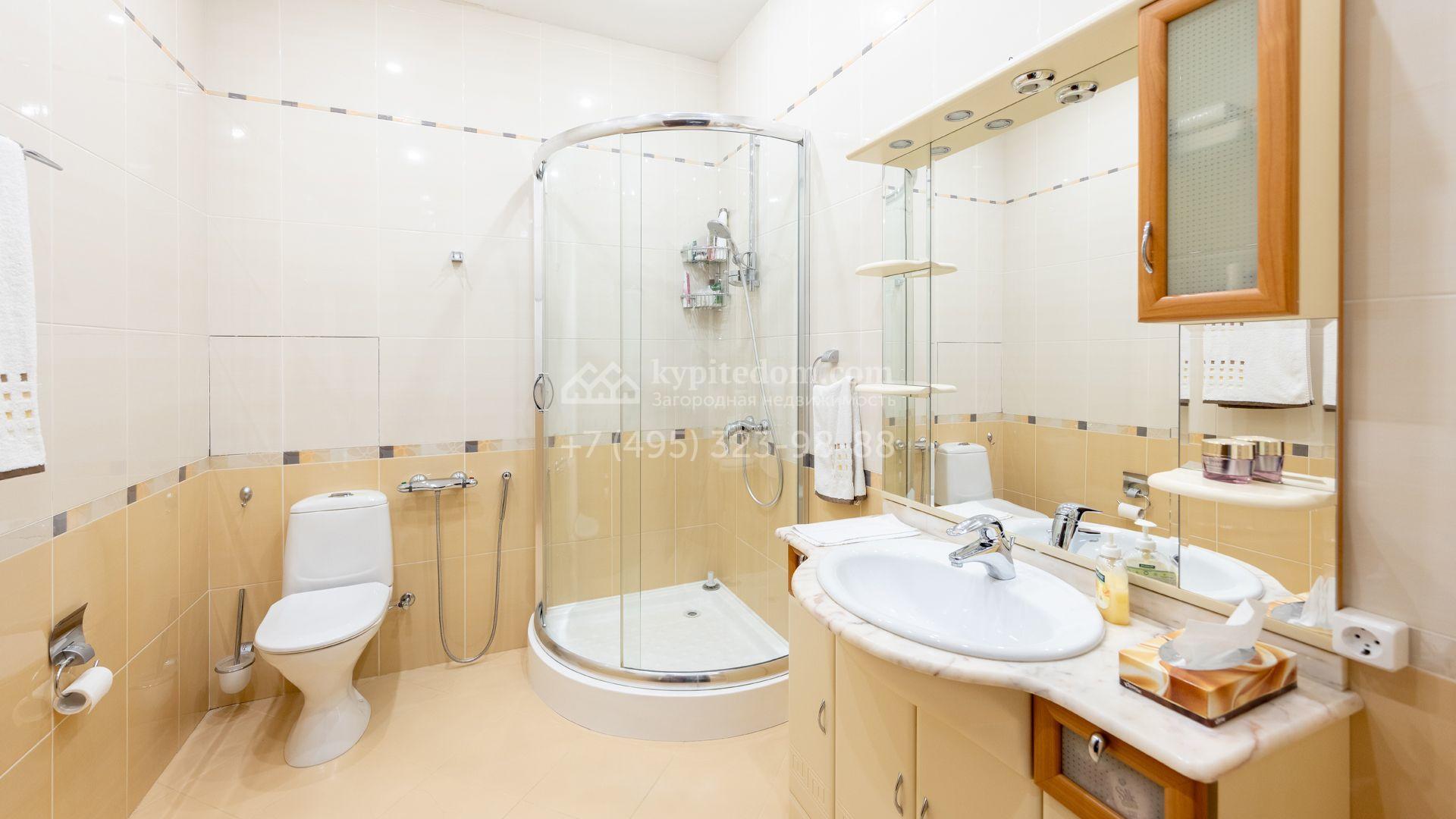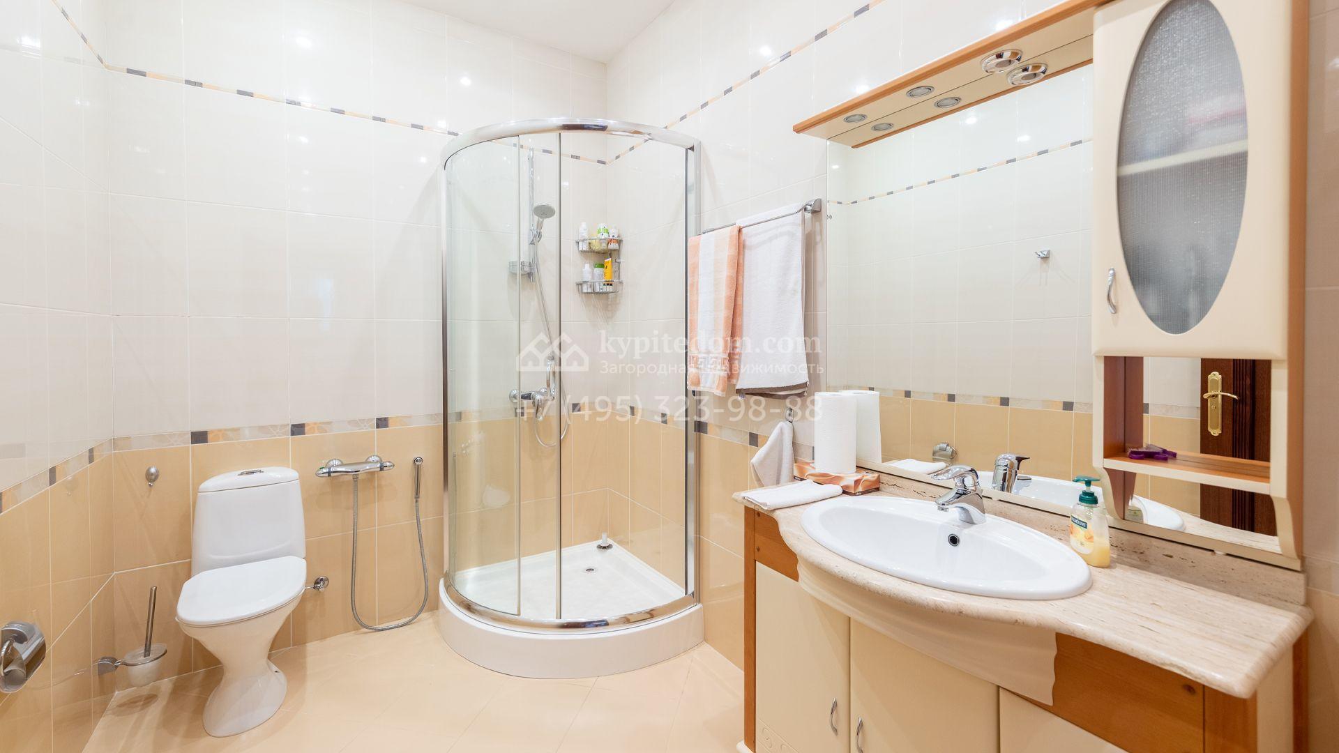 Загородный дом площадью 985 м² расположен на просторном лесном участке 31 сотка. Фасад здания облицован розово-персиковой штукатуркой, декорирован белыми наличниками и мозаичными панно. В отделке интерьера использованы тёплые оттенки, которые создают атмосферу домашнего уюта. В резиденции разместили семь спален, столовую-гостиную с камином, кухню с выходом на участок, кабинет, кинотеатр и спа-зону с бассейном и сауной. В контуре дома предусмотрен гараж на три машины. На участке выполнен ландшафтный дизайн, засеян газон, установлено уличное освещение, вымощены дорожки, высажены ели, туи, липы, березы и обустроен пруд.