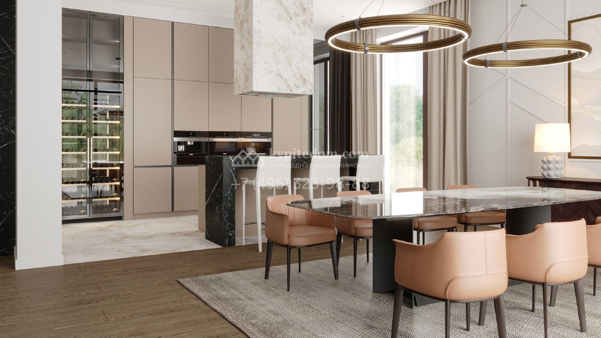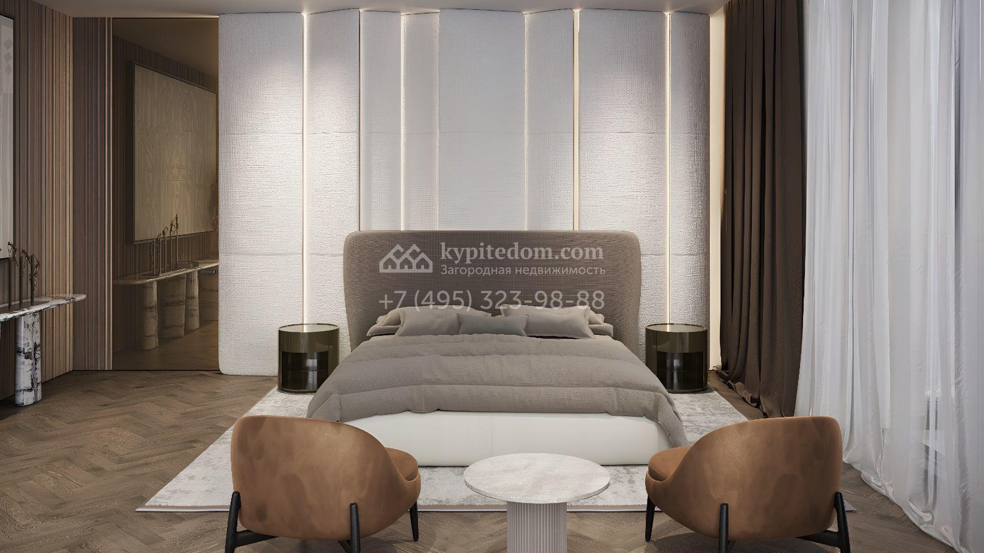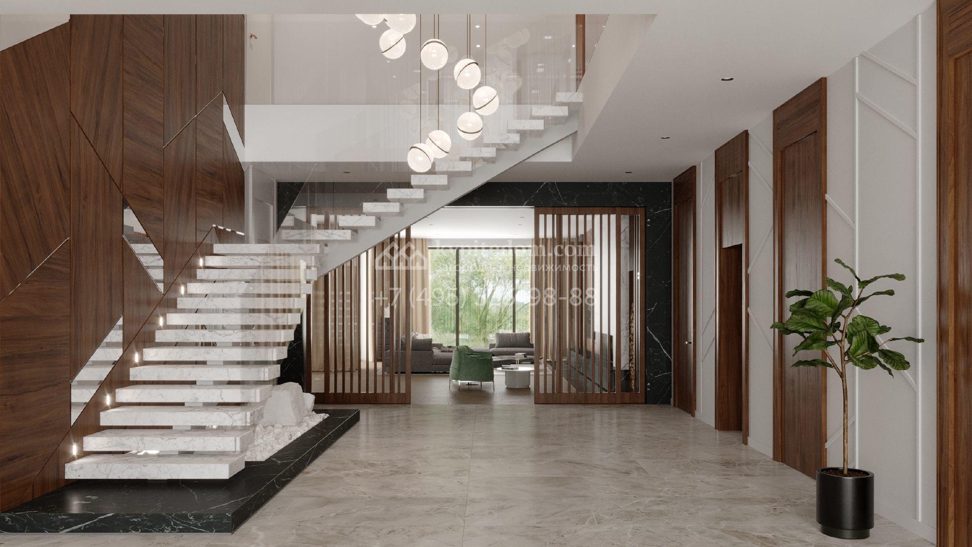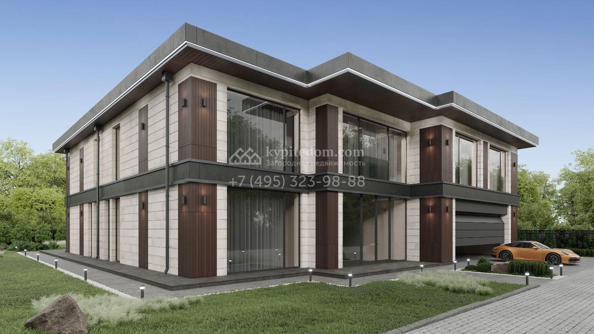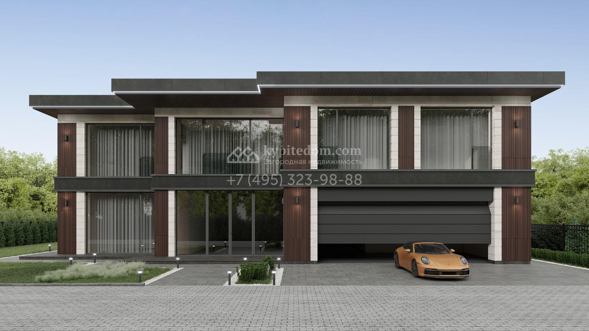 Загородная резиденция площадью 1596 м² построена на просторном участке 27,5 сотки. Фасад в современном стиле выполнен полностью из натуральных материалов. Интерьеры представлены с отделкой «под ключ». В коттедже разместили 7 спален, гостиную с камином, кухню, столовую, кабинет, тренажерный зал, игровую и SPA-зону с бассейном длиной 12 метров и большой сауной. В контуре дома предусмотрен блок для персонала с отдельным входом и гараж на 3 машины. На участке выполнены дренажные работы и ландшафтный дизайн, высажены высокие туи.