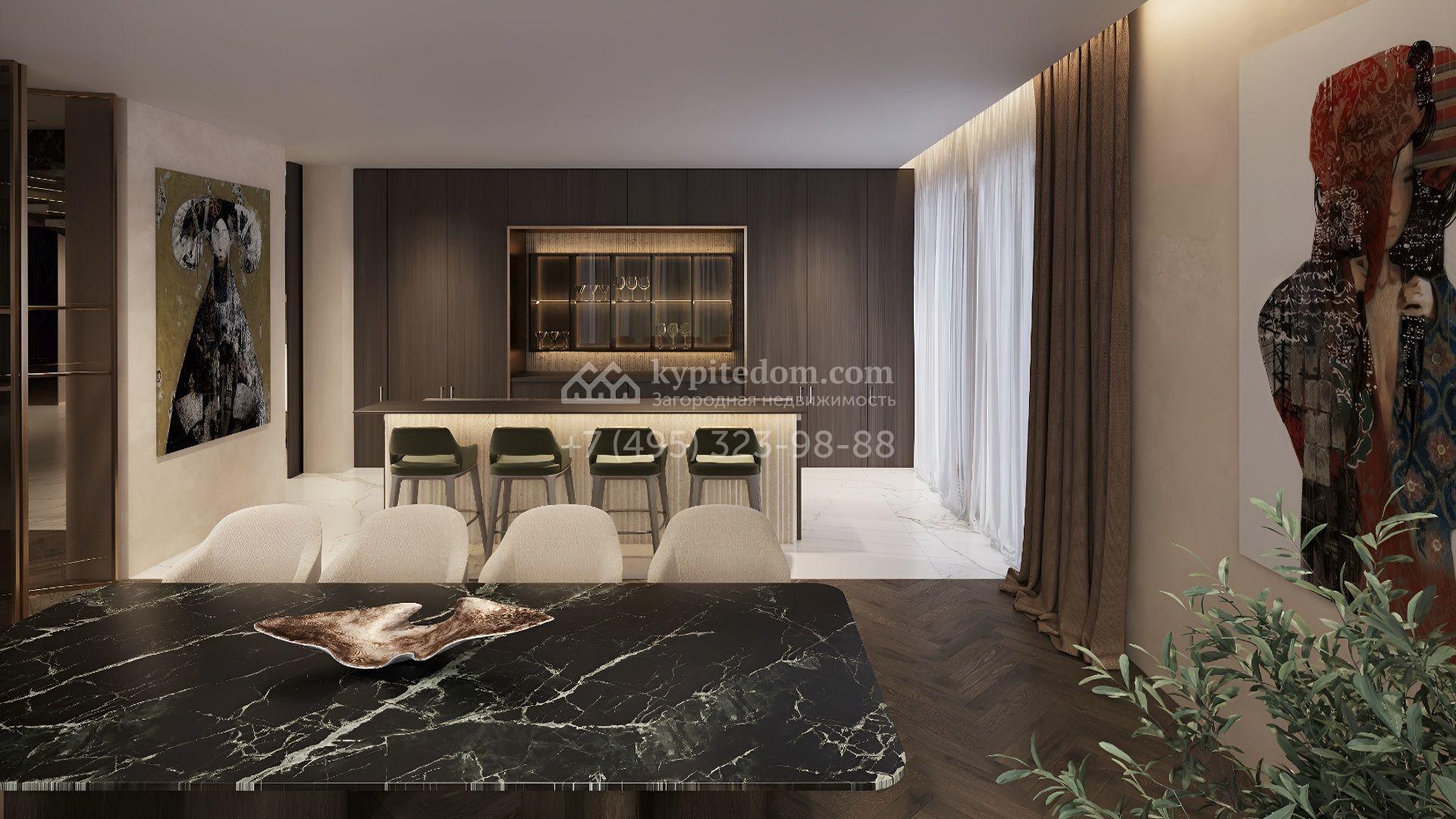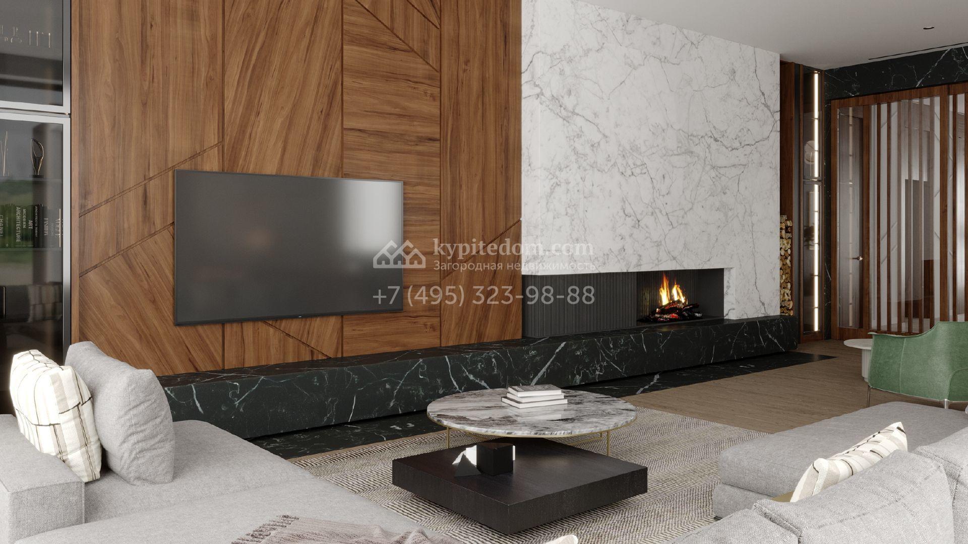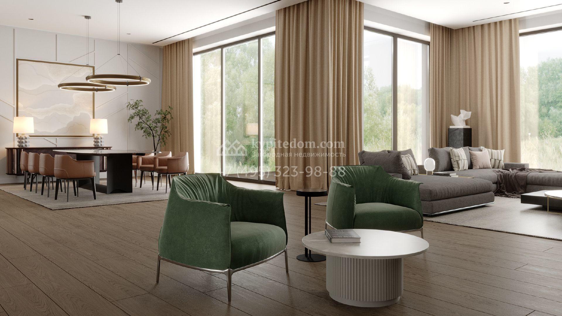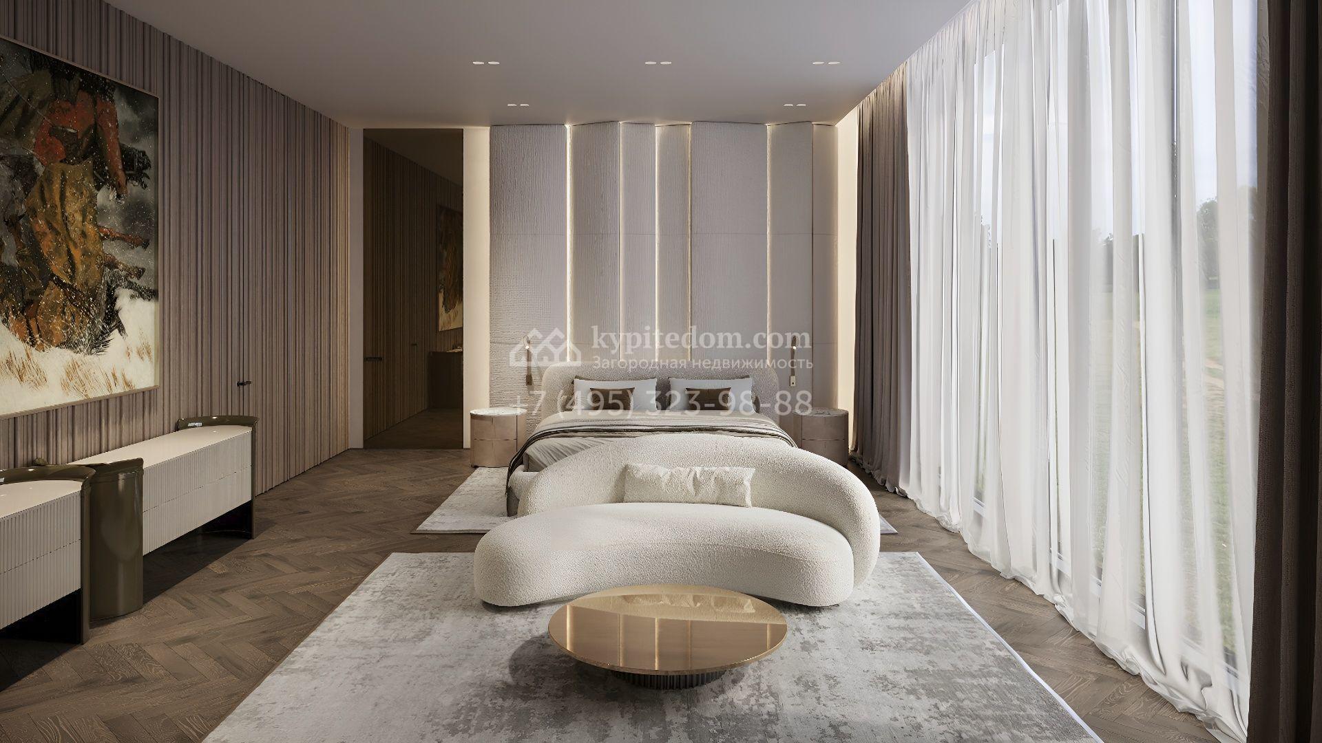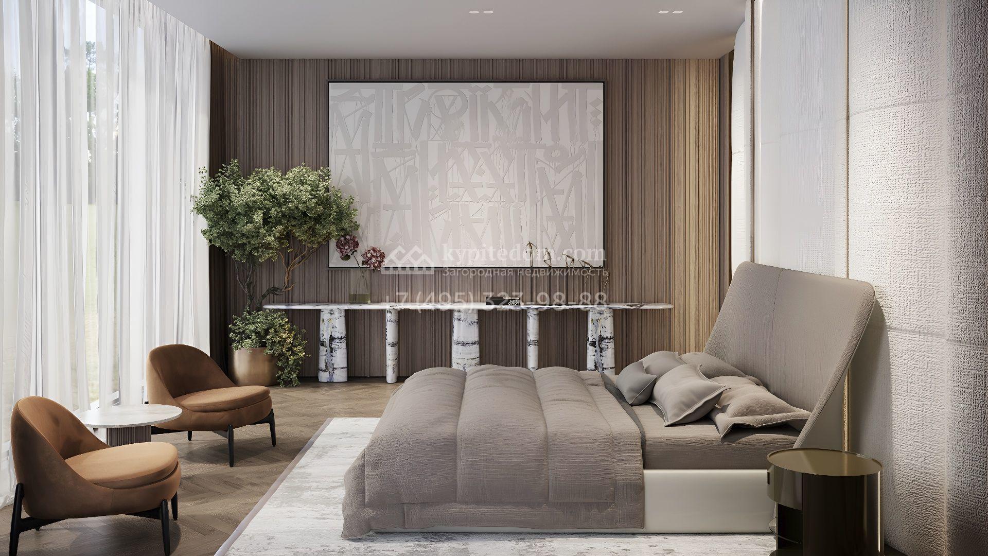 Загородная резиденция площадью 1596 м² построена на просторном участке 27,5 сотки. Фасад в современном стиле выполнен полностью из натуральных материалов. Интерьеры представлены с отделкой «под ключ». В коттедже разместили 7 спален, гостиную с камином, кухню, столовую, кабинет, тренажерный зал, игровую и SPA-зону с бассейном длиной 12 метров и большой сауной. В контуре дома предусмотрен блок для персонала с отдельным входом и гараж на 3 машины. На участке выполнены дренажные работы и ландшафтный дизайн, высажены высокие туи.