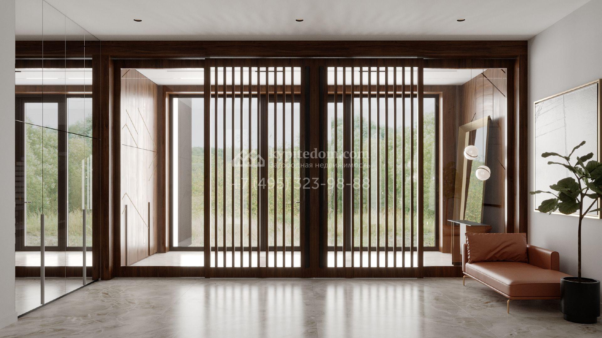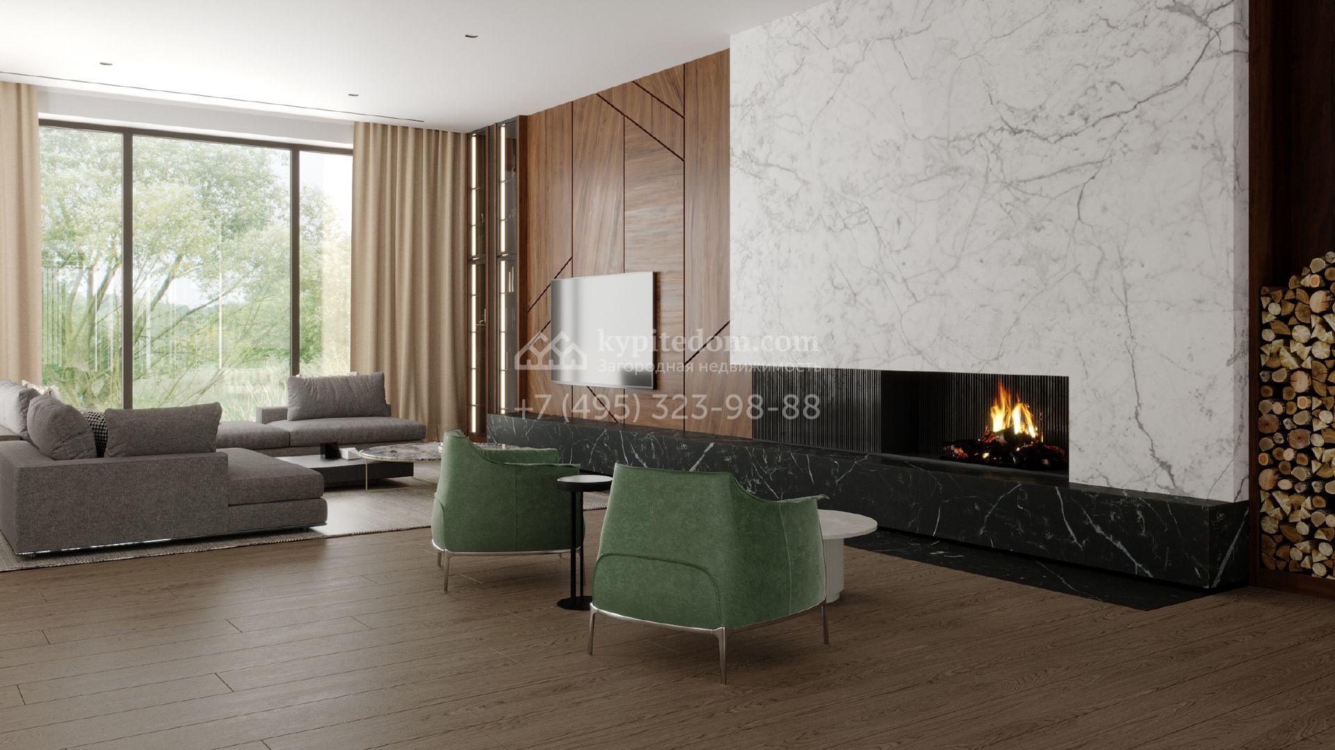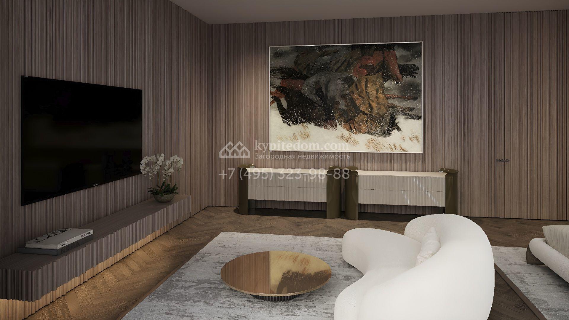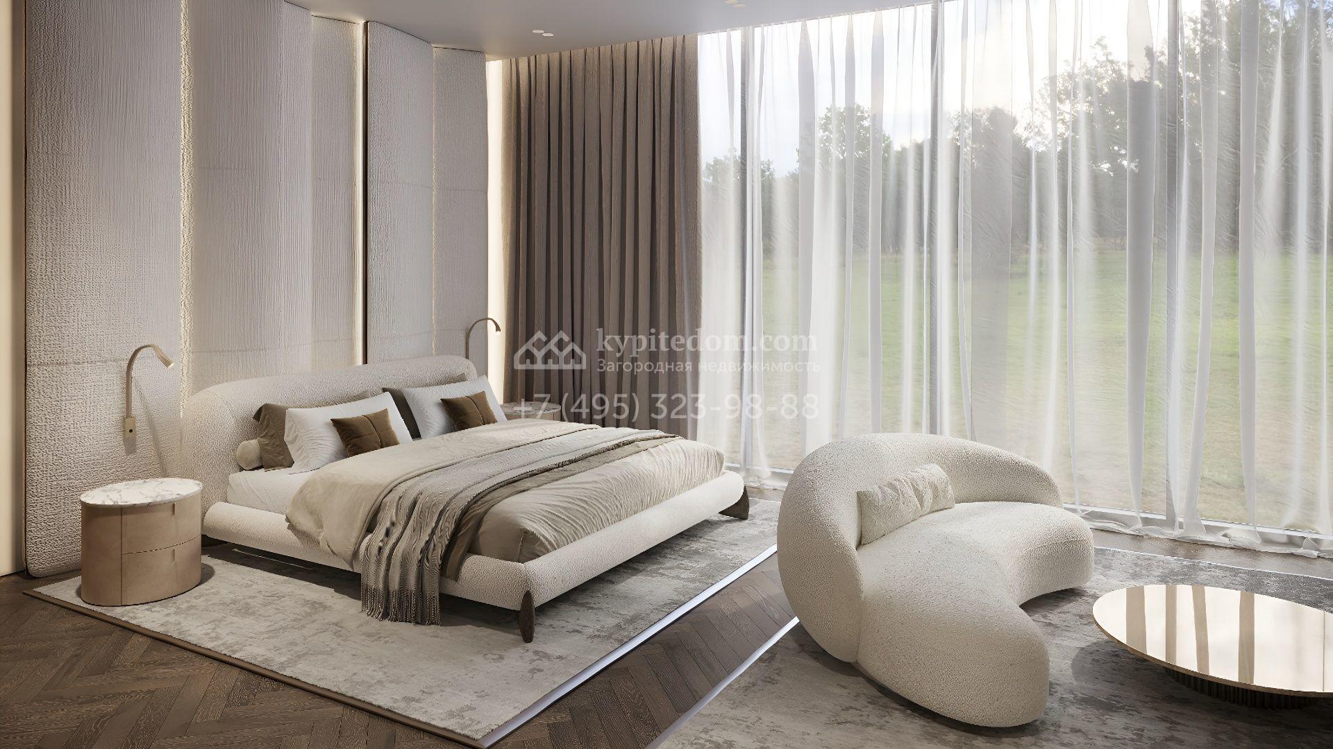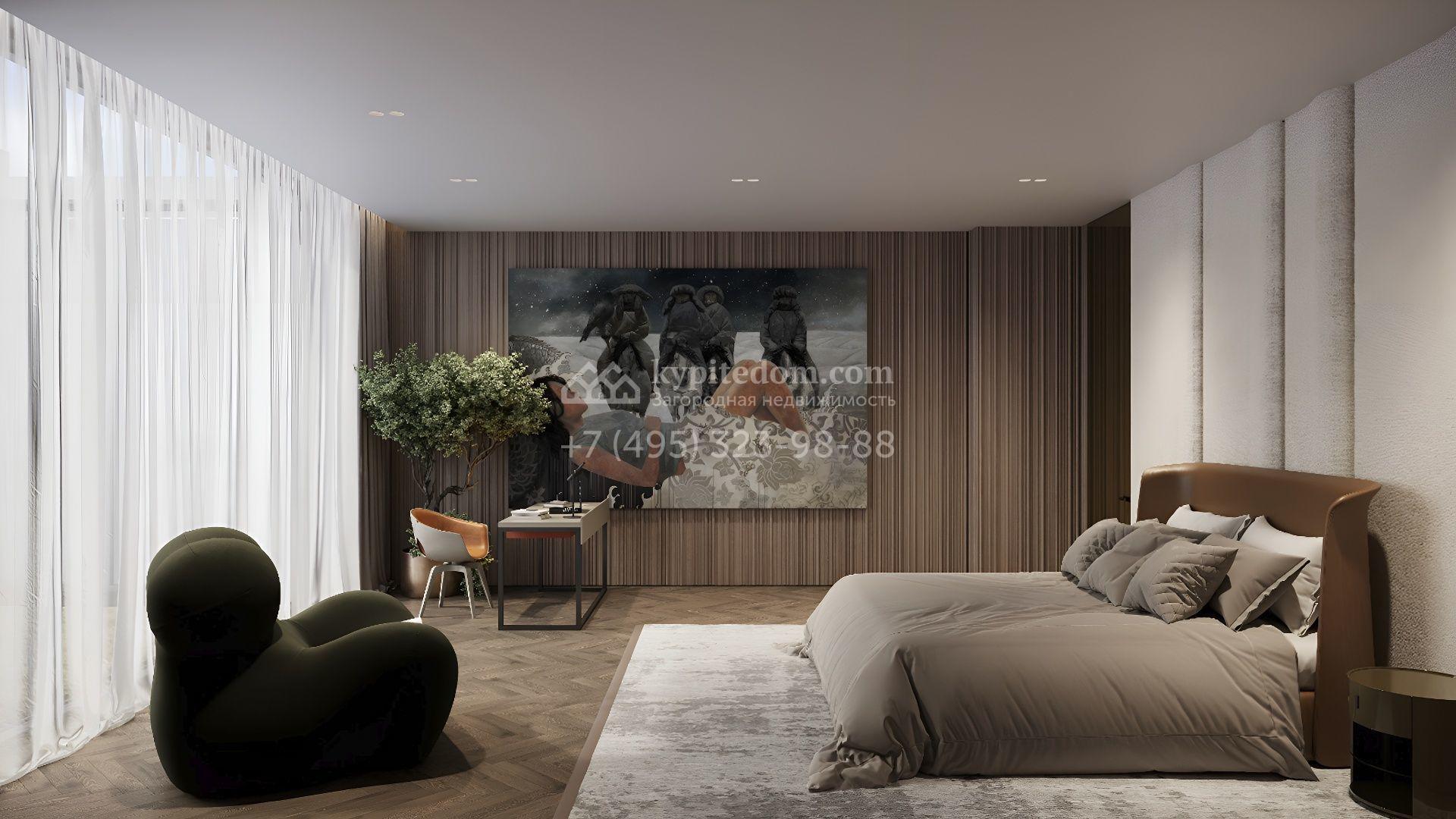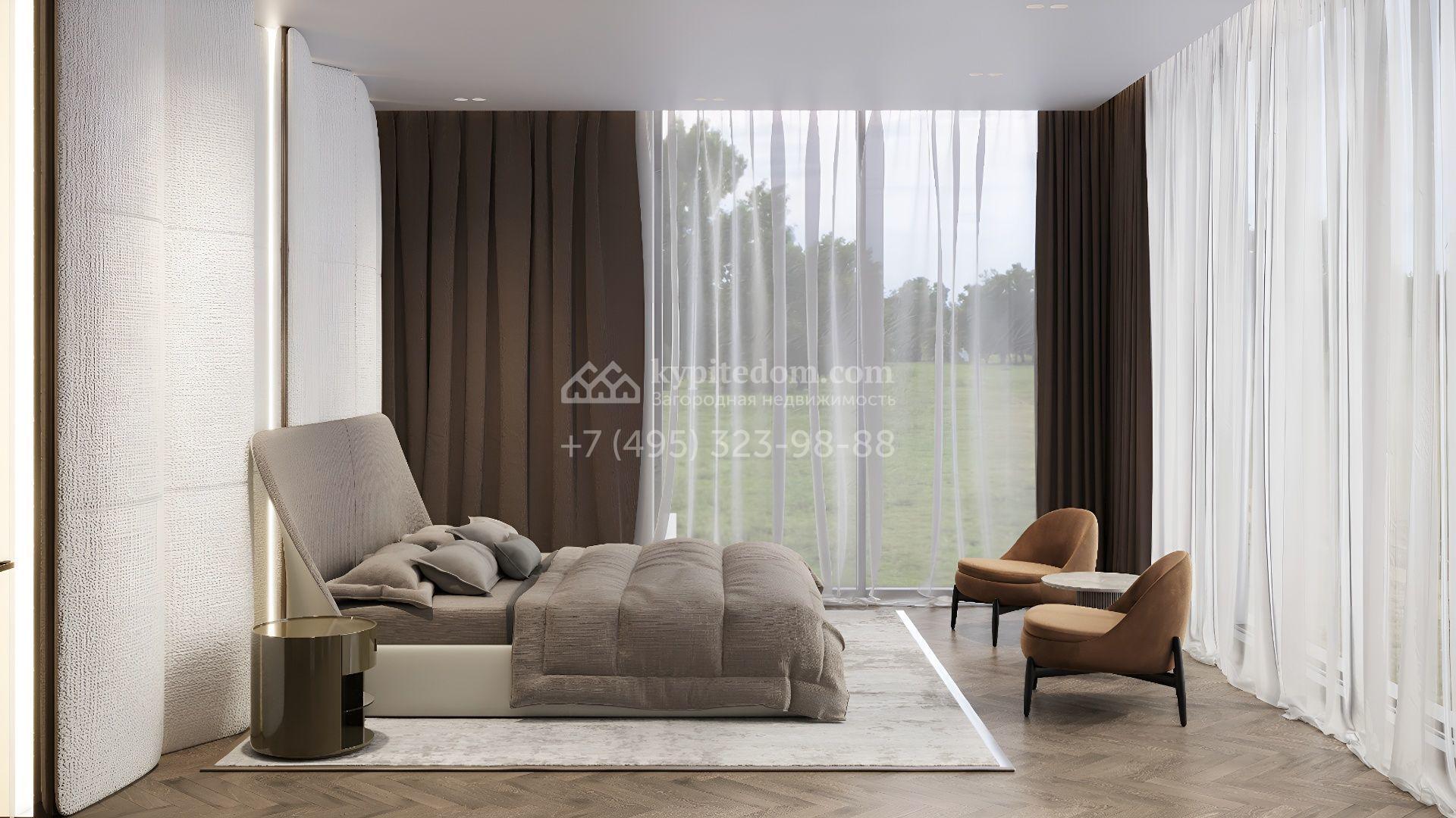 Загородная резиденция площадью 1596 м² построена на просторном участке 27,5 сотки. Фасад в современном стиле выполнен полностью из натуральных материалов. Интерьеры представлены с отделкой «под ключ». В коттедже разместили 7 спален, гостиную с камином, кухню, столовую, кабинет, тренажерный зал, игровую и SPA-зону с бассейном длиной 12 метров и большой сауной. В контуре дома предусмотрен блок для персонала с отдельным входом и гараж на 3 машины. На участке выполнены дренажные работы и ландшафтный дизайн, высажены высокие туи.