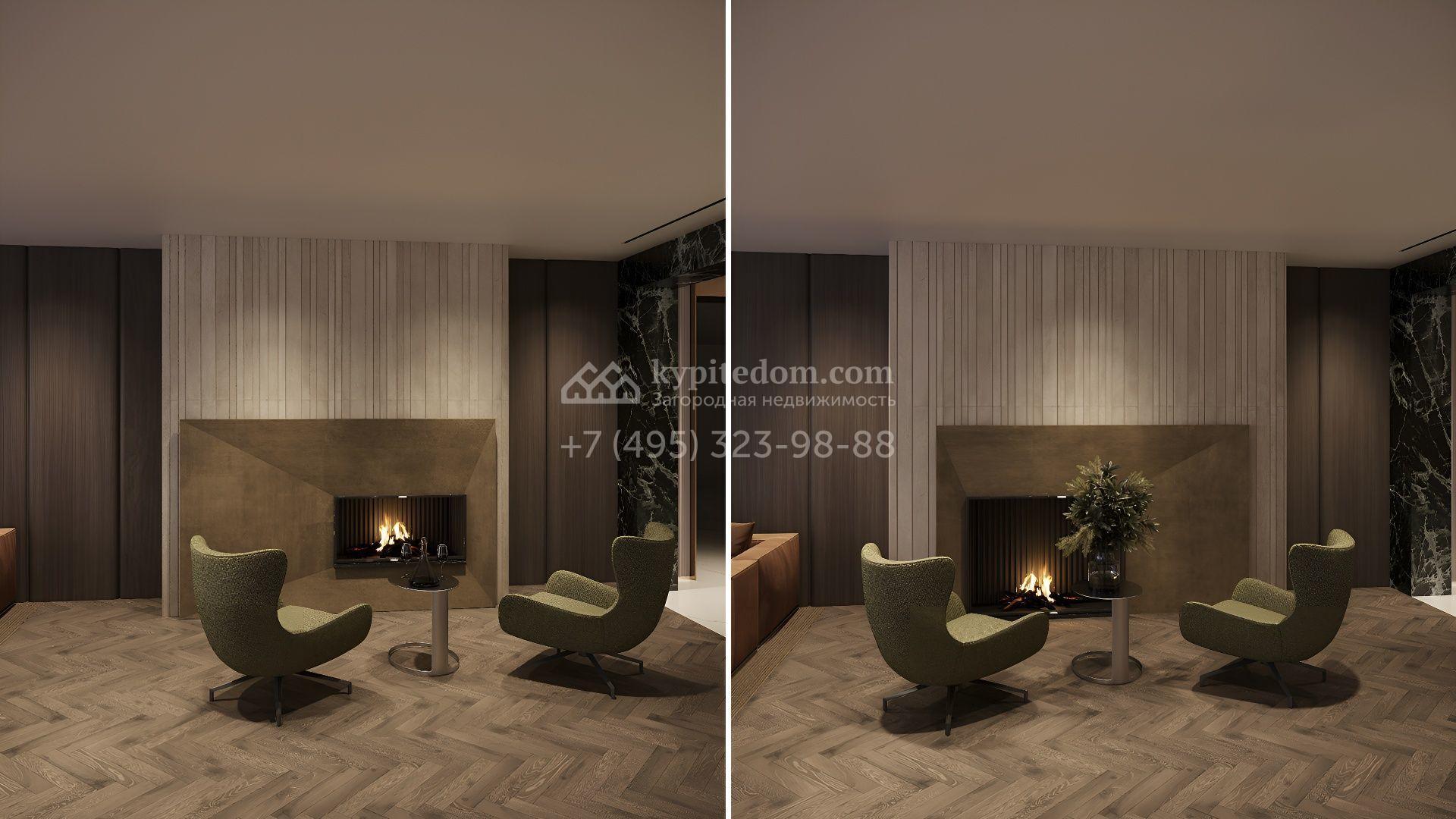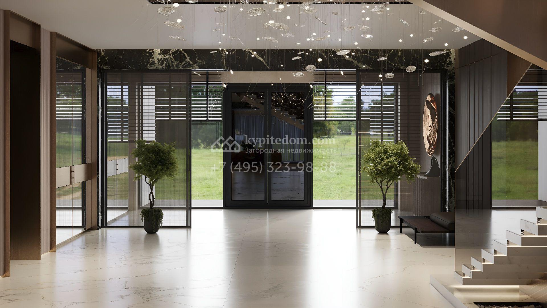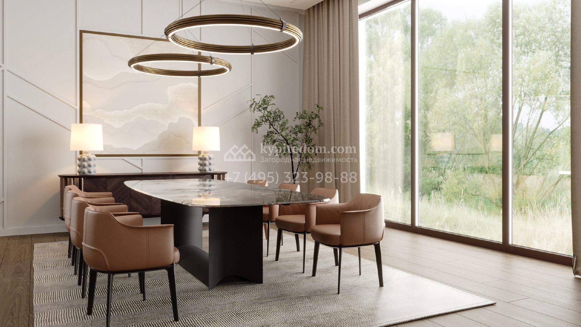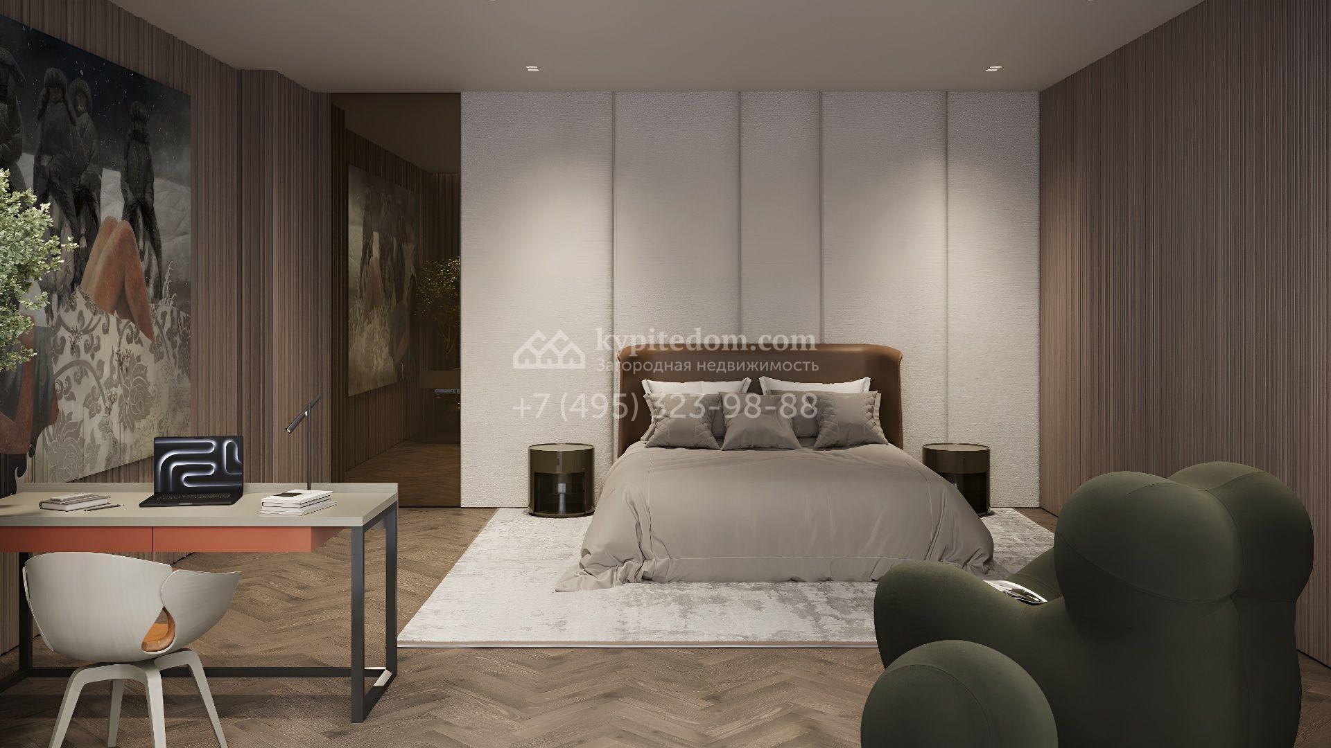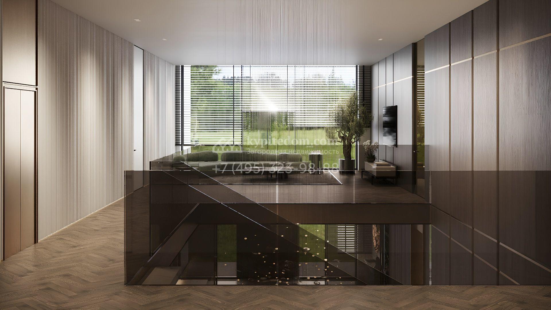 Загородная резиденция площадью 1596 м² построена на просторном участке 27,5 сотки. Фасад в современном стиле выполнен полностью из натуральных материалов. Интерьеры представлены с отделкой «под ключ». В коттедже разместили 7 спален, гостиную с камином, кухню, столовую, кабинет, тренажерный зал, игровую и SPA-зону с бассейном длиной 12 метров и большой сауной. В контуре дома предусмотрен блок для персонала с отдельным входом и гараж на 3 машины. На участке выполнены дренажные работы и ландшафтный дизайн, высажены высокие туи.