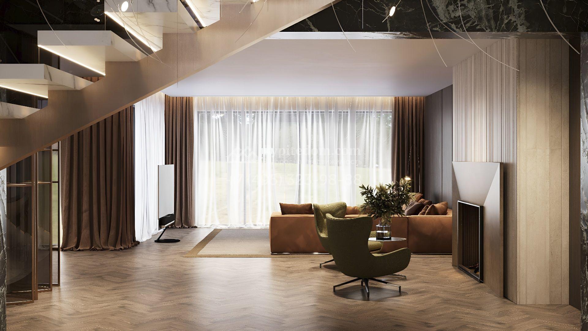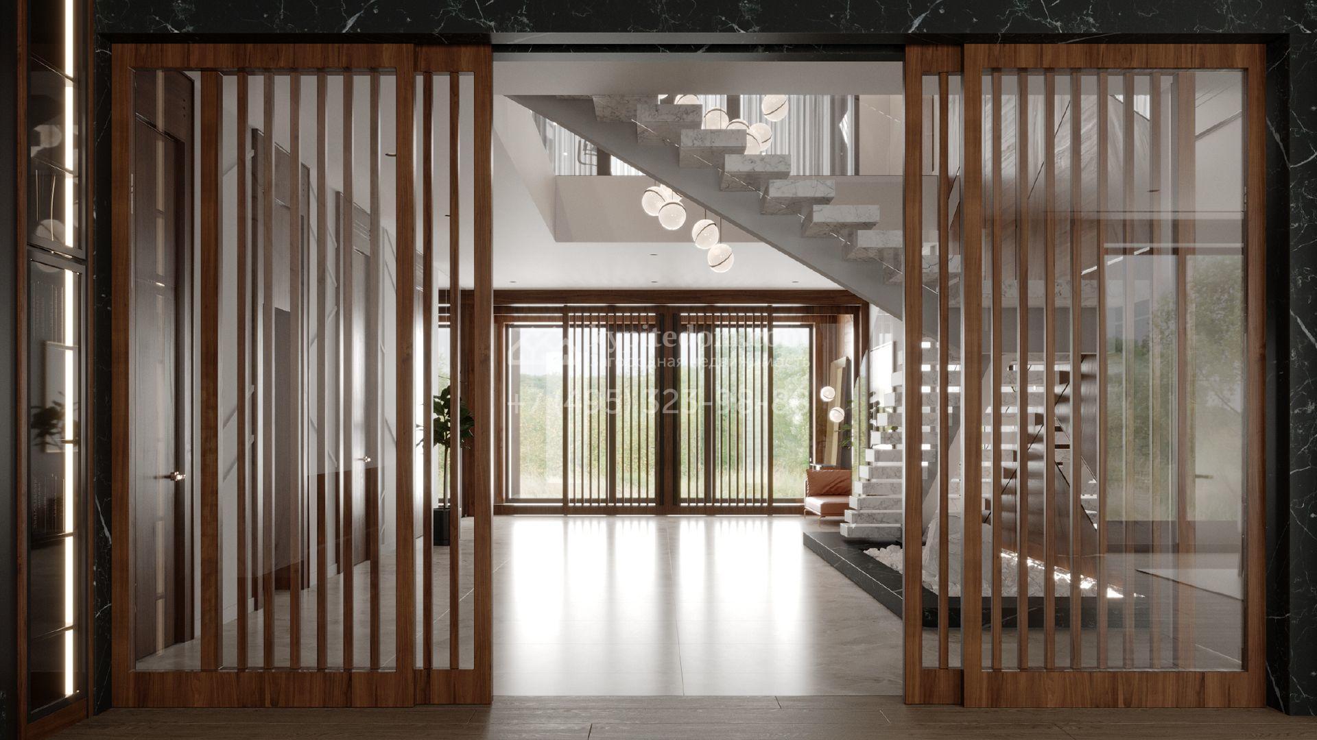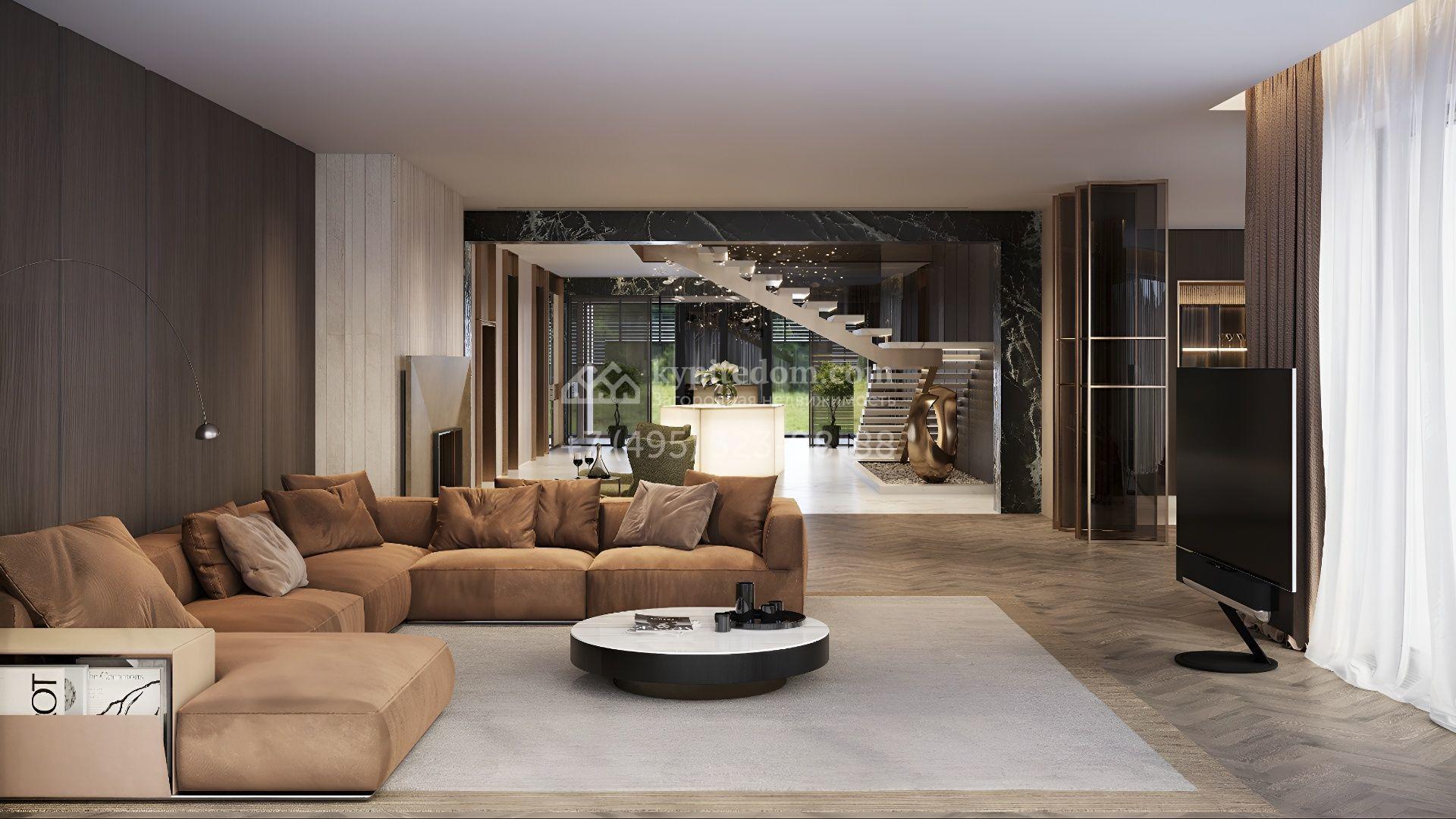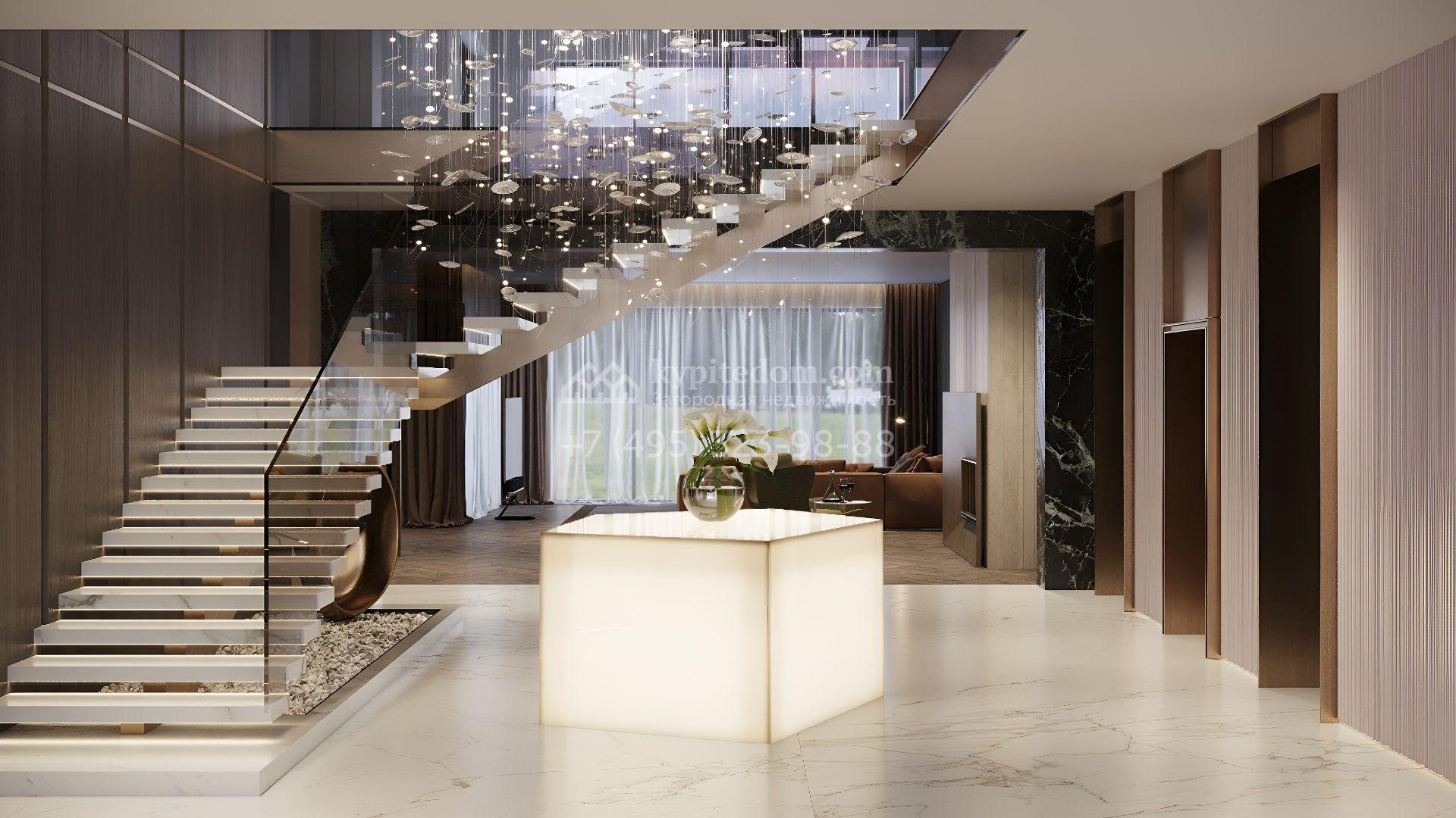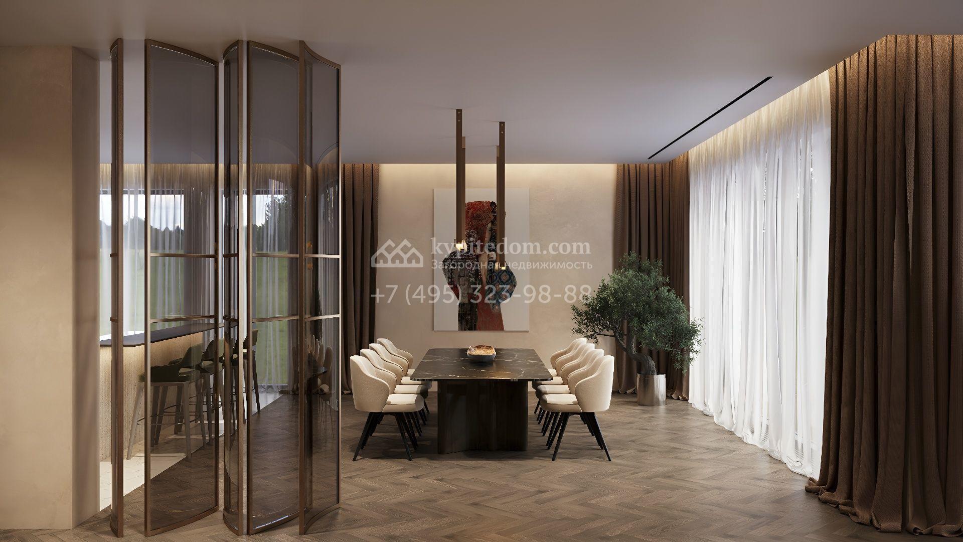 Загородная резиденция площадью 1596 м² построена на просторном участке 27,5 сотки. Фасад в современном стиле выполнен полностью из натуральных материалов. Интерьеры представлены с отделкой «под ключ». В коттедже разместили 7 спален, гостиную с камином, кухню, столовую, кабинет, тренажерный зал, игровую и SPA-зону с бассейном длиной 12 метров и большой сауной. В контуре дома предусмотрен блок для персонала с отдельным входом и гараж на 3 машины. На участке выполнены дренажные работы и ландшафтный дизайн, высажены высокие туи.