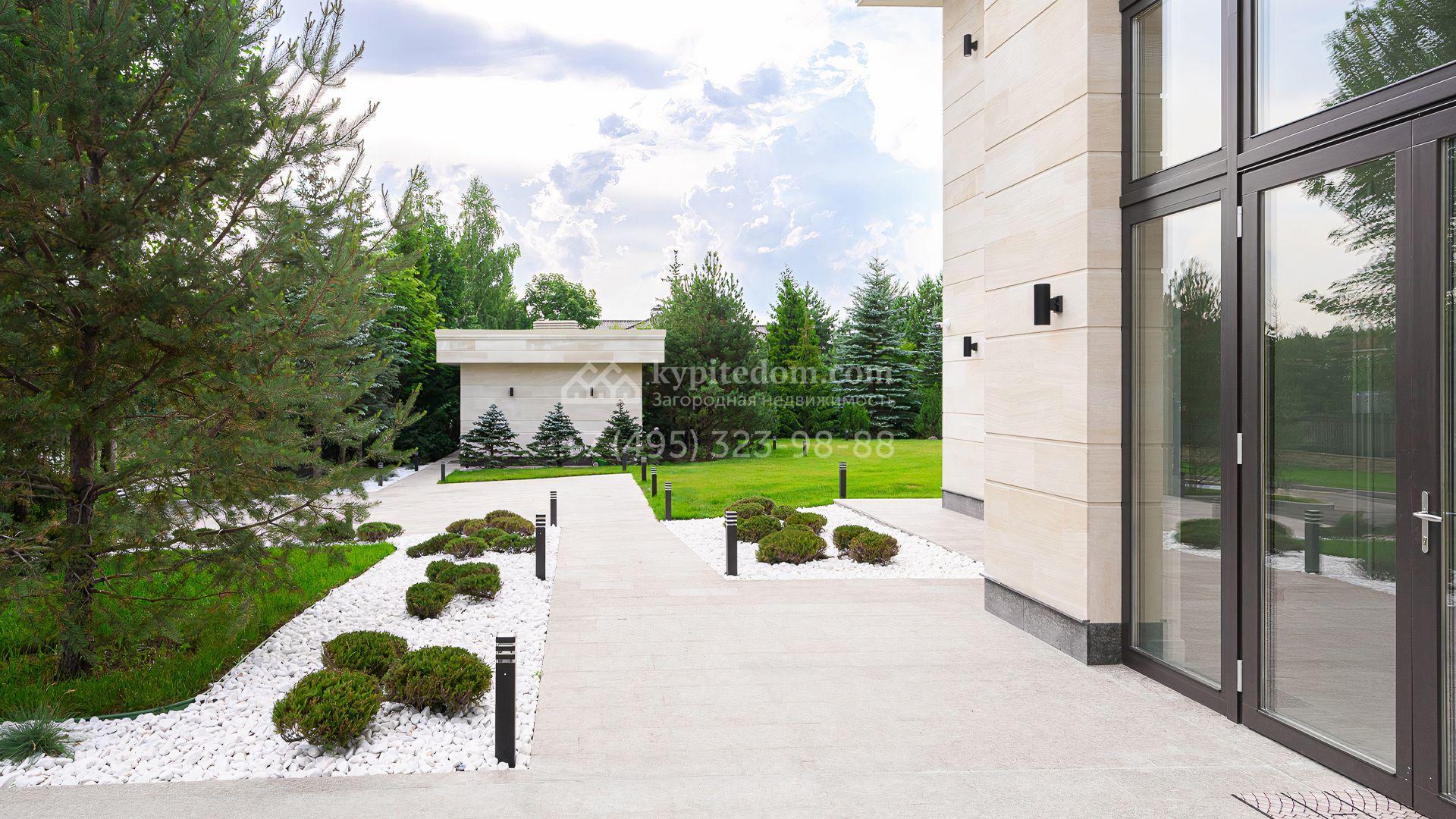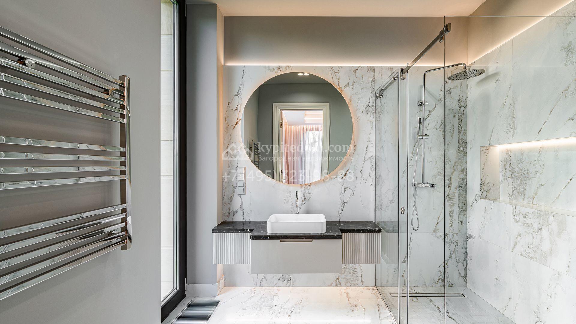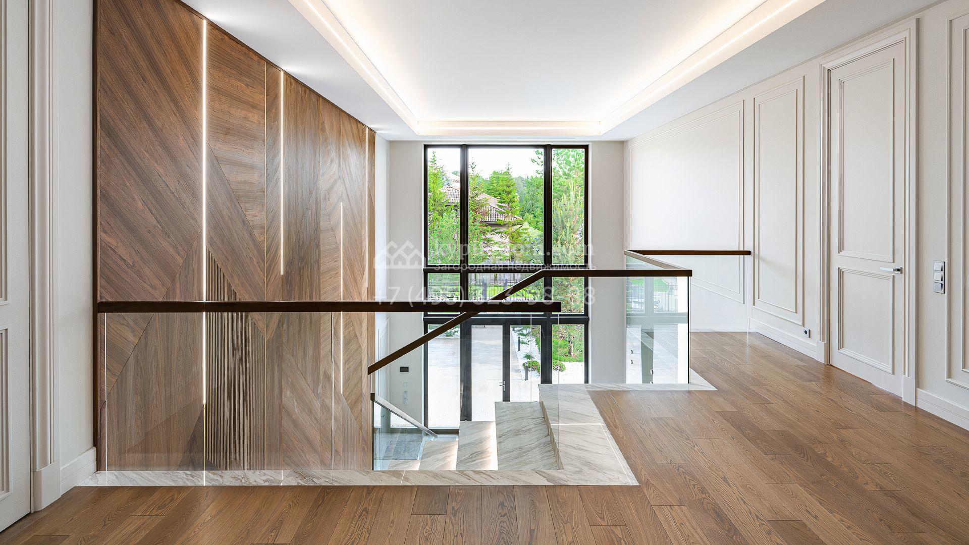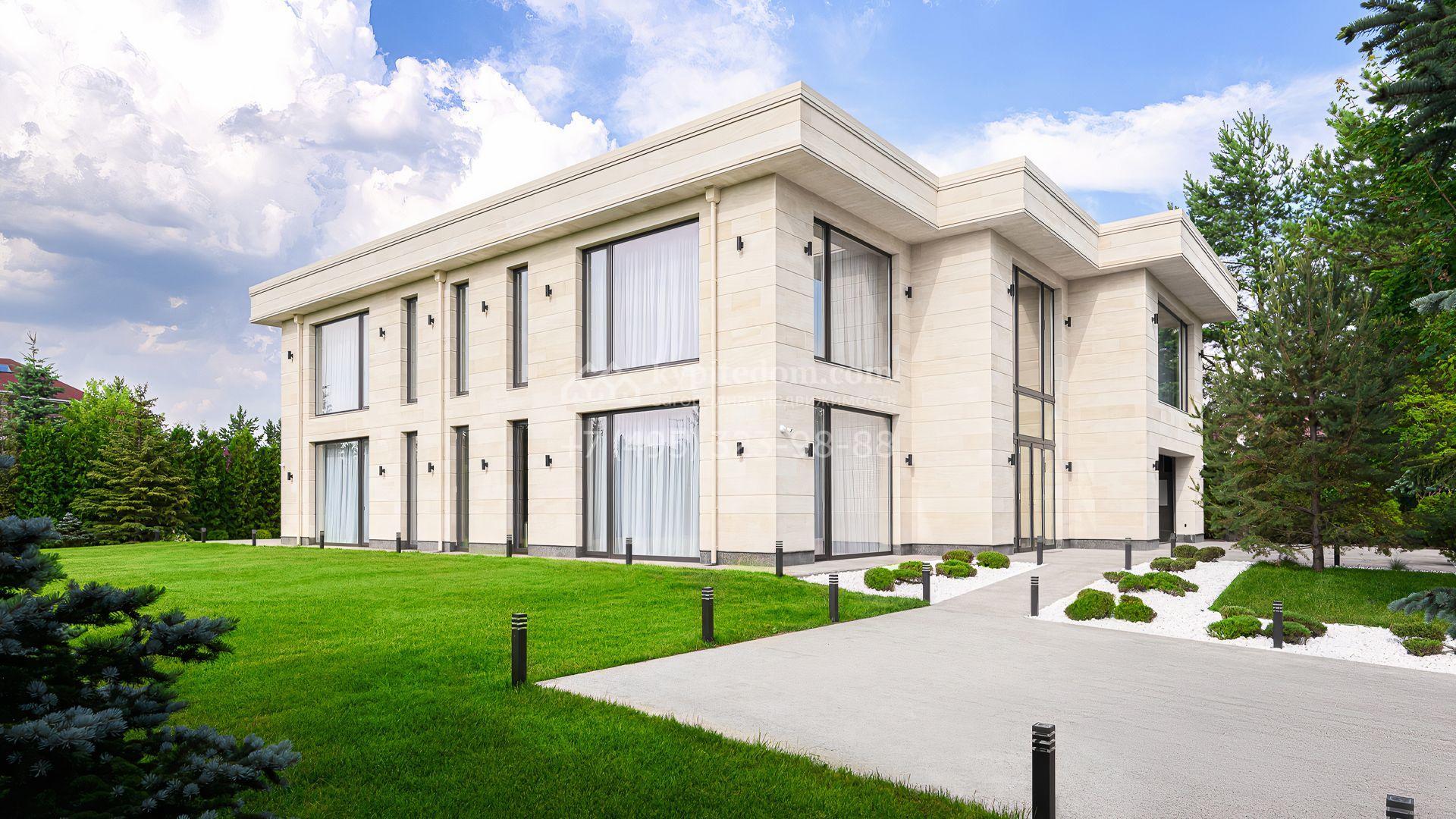 Загородный особняк площадью 1071 м² расположен на просторном полевом участке 27 соток с ландшафтным дизайном. Интерьер, сочетающий элементы современности и классики, выполнен в кремово-кофейных оттенках, в отделке использованы фактура мрамора, дерева, позолота, стекло и многоуровневое освещение. Планировкой резиденции предусмотрены шесть спален, уютная гостиная с камином, объединенная с кухней-столовой, рабочая кухня и терраса для отдыха на свежем воздухе. Расслабиться в конце насыщенного дня можно в SPA-зоне с бассейном, сауной и хаммамом. В контуре дома расположен гараж на две машины. Рядом разместили гостевой дом площадью 87 м².