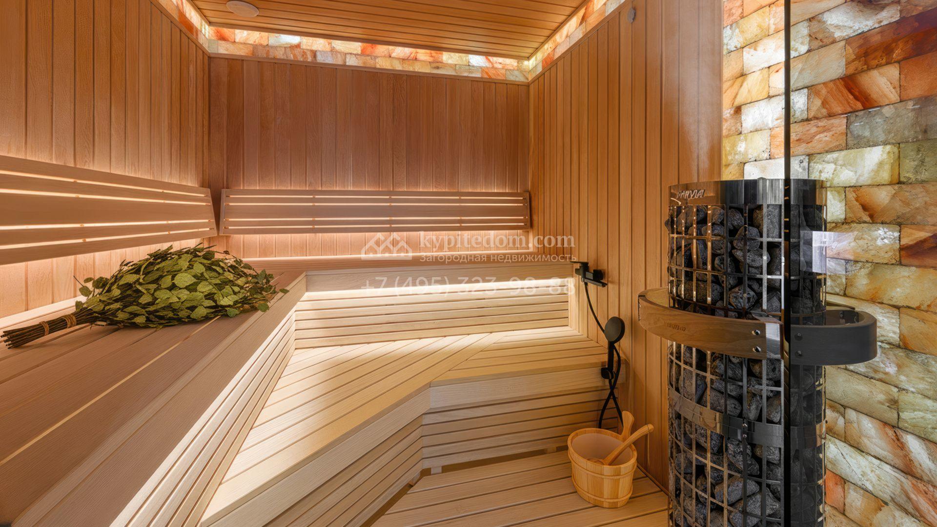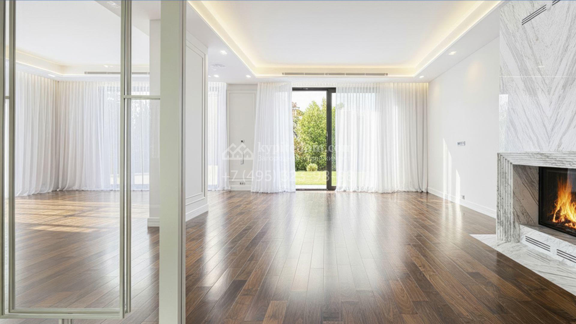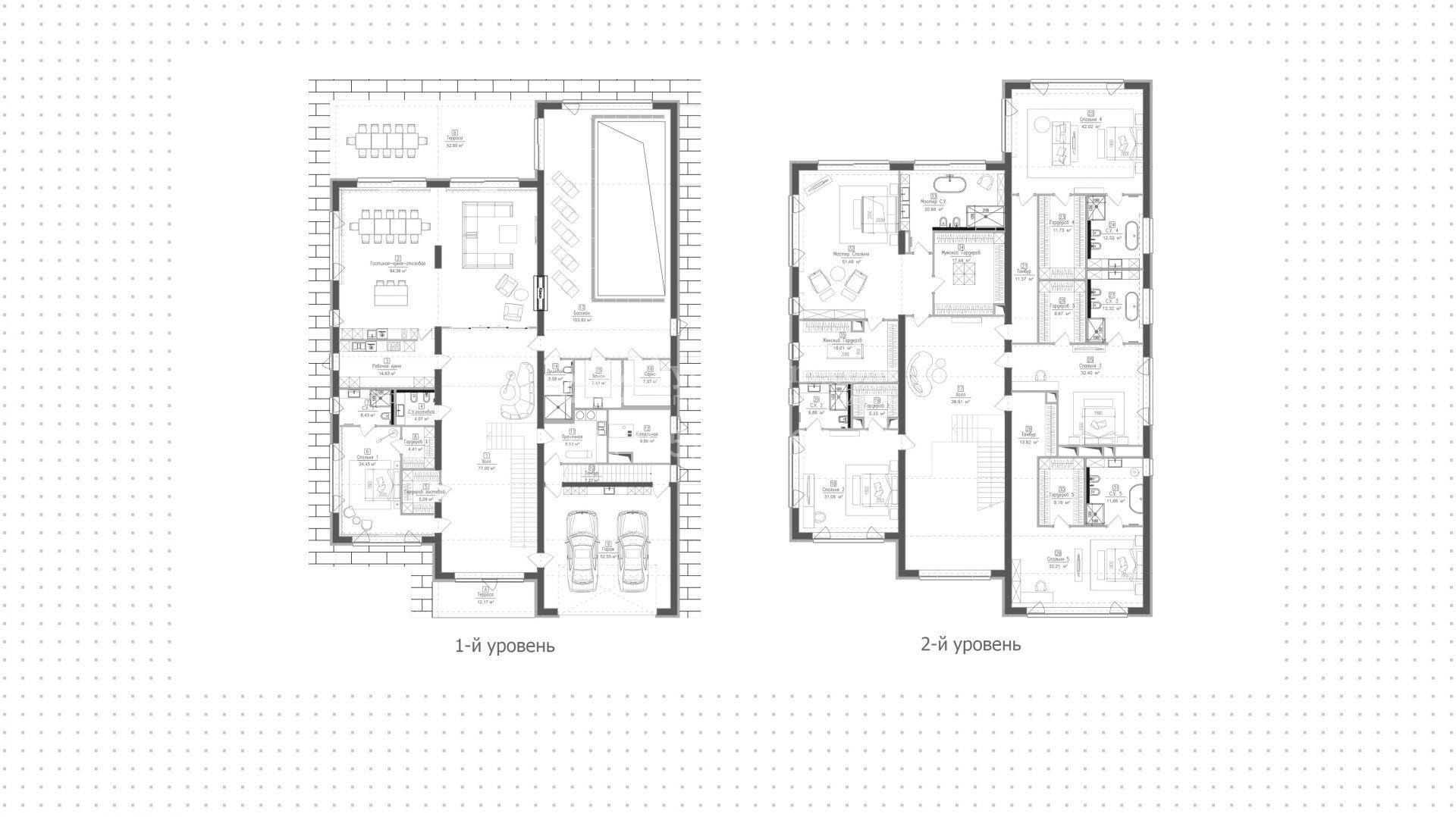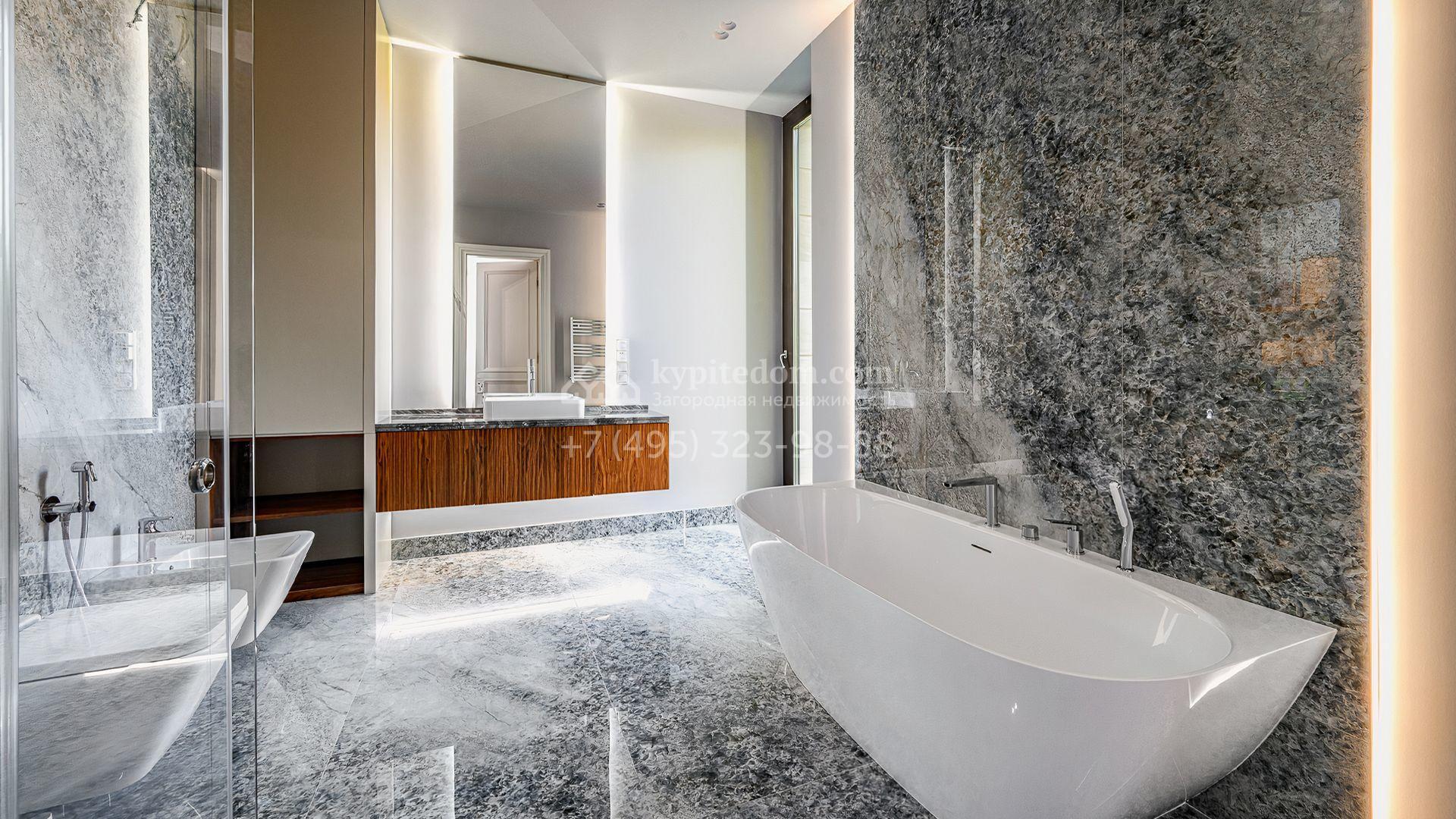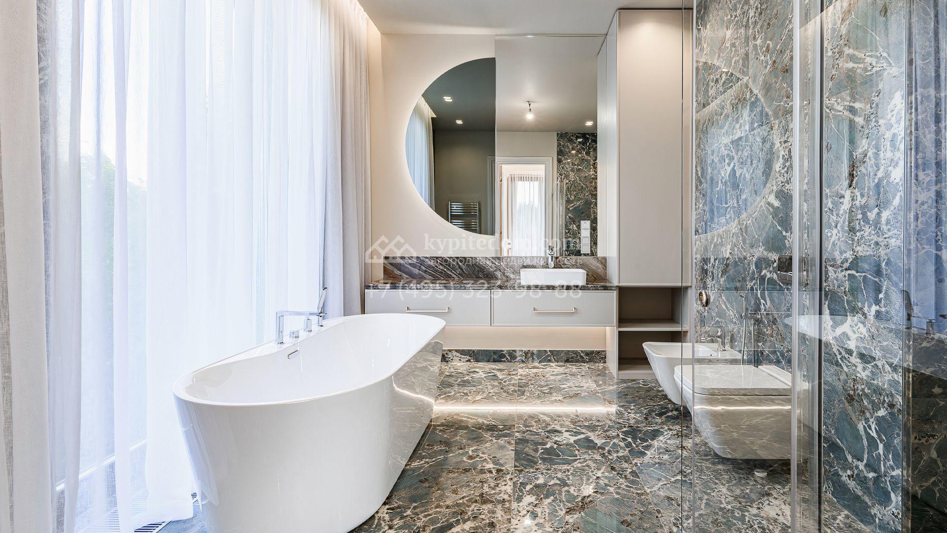 Загородный особняк площадью 1071 м² расположен на просторном полевом участке 27 соток с ландшафтным дизайном. Интерьер, сочетающий элементы современности и классики, выполнен в кремово-кофейных оттенках, в отделке использованы фактура мрамора, дерева, позолота, стекло и многоуровневое освещение. Планировкой резиденции предусмотрены шесть спален, уютная гостиная с камином, объединенная с кухней-столовой, рабочая кухня и терраса для отдыха на свежем воздухе. Расслабиться в конце насыщенного дня можно в SPA-зоне с бассейном, сауной и хаммамом. В контуре дома расположен гараж на две машины. Рядом разместили гостевой дом площадью 87 м².