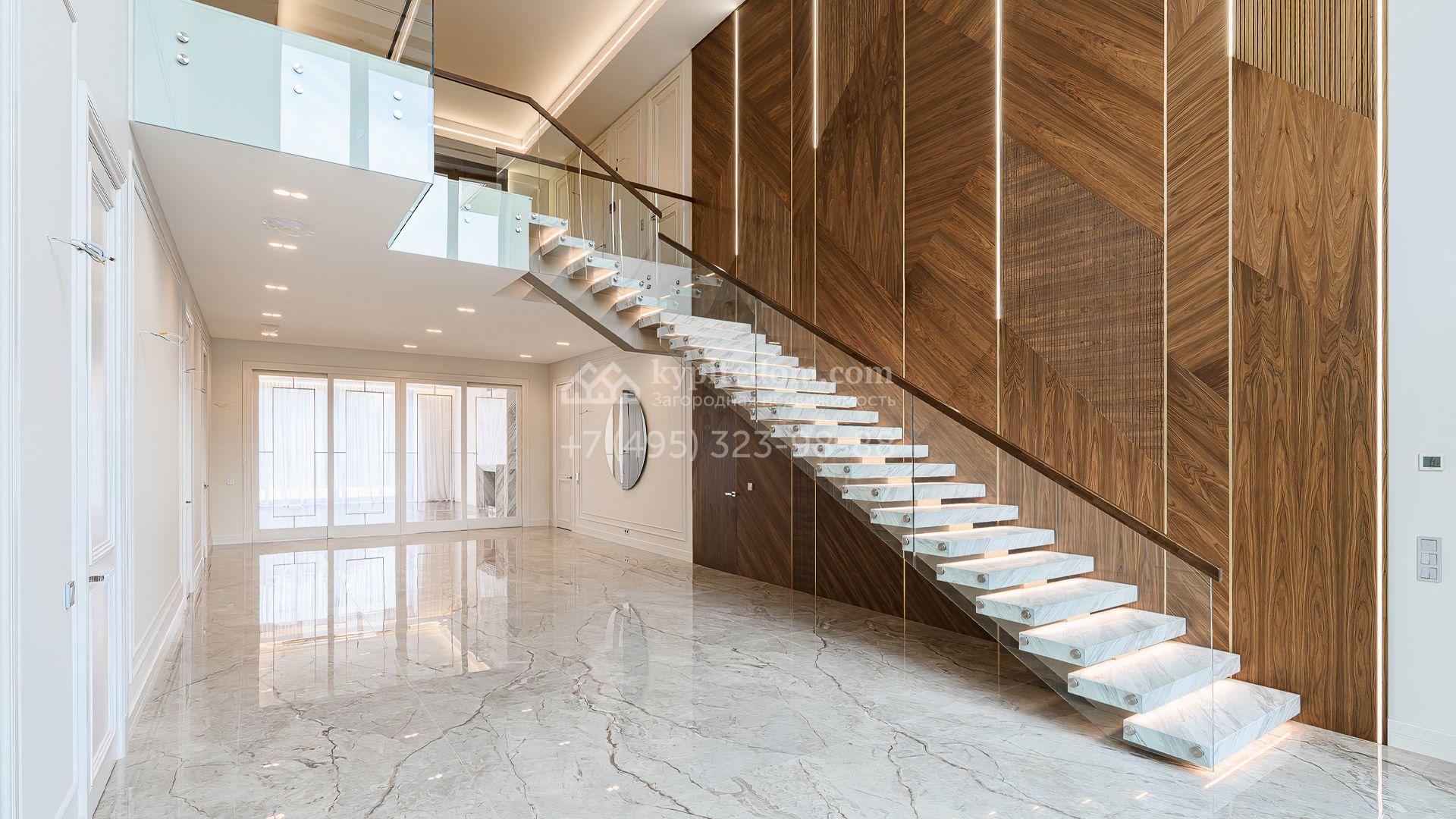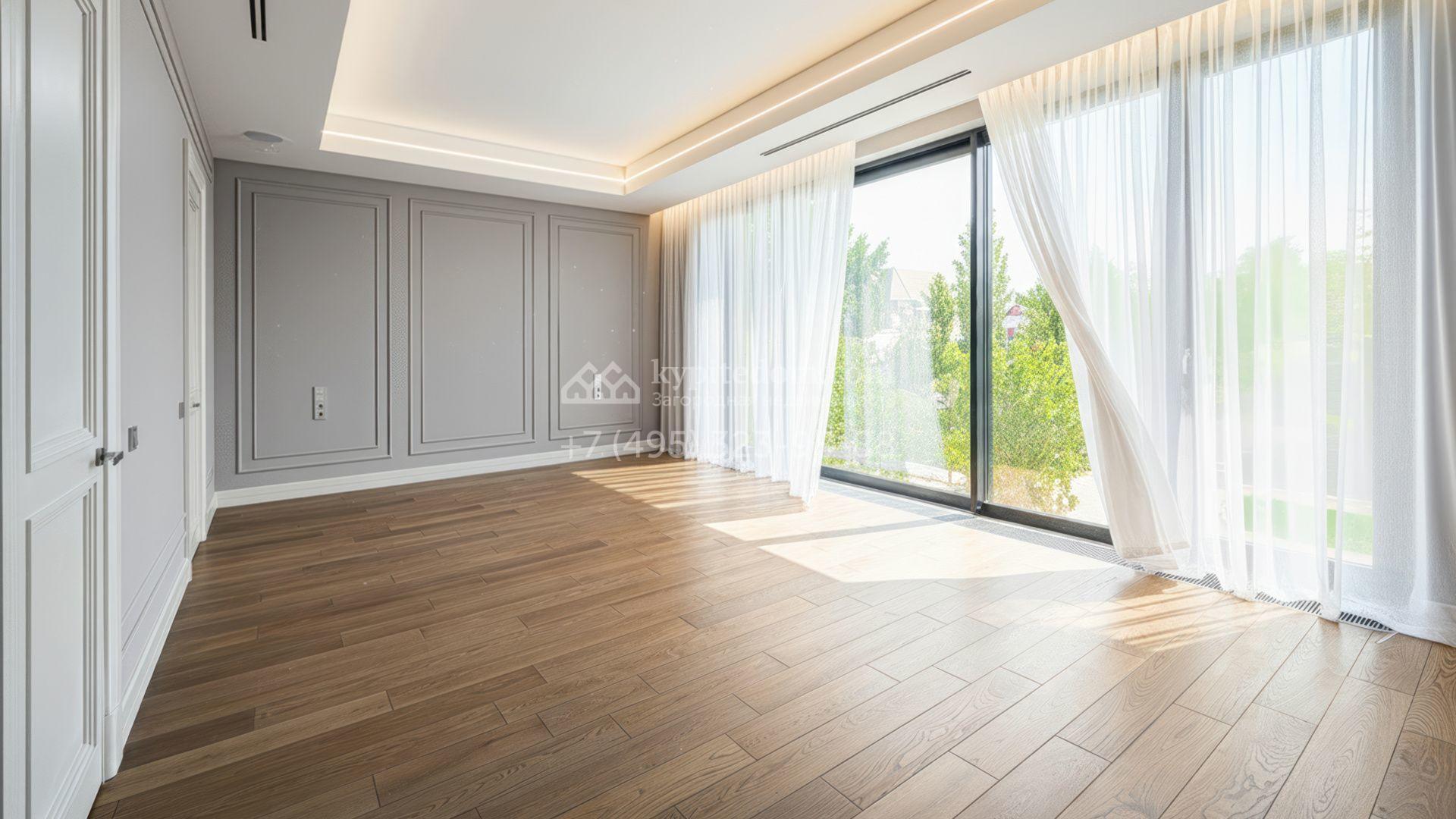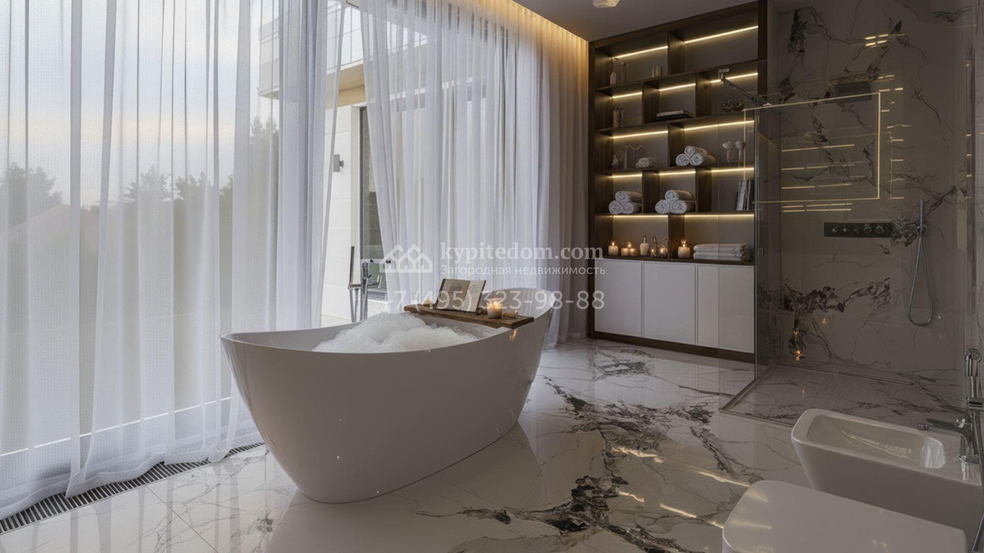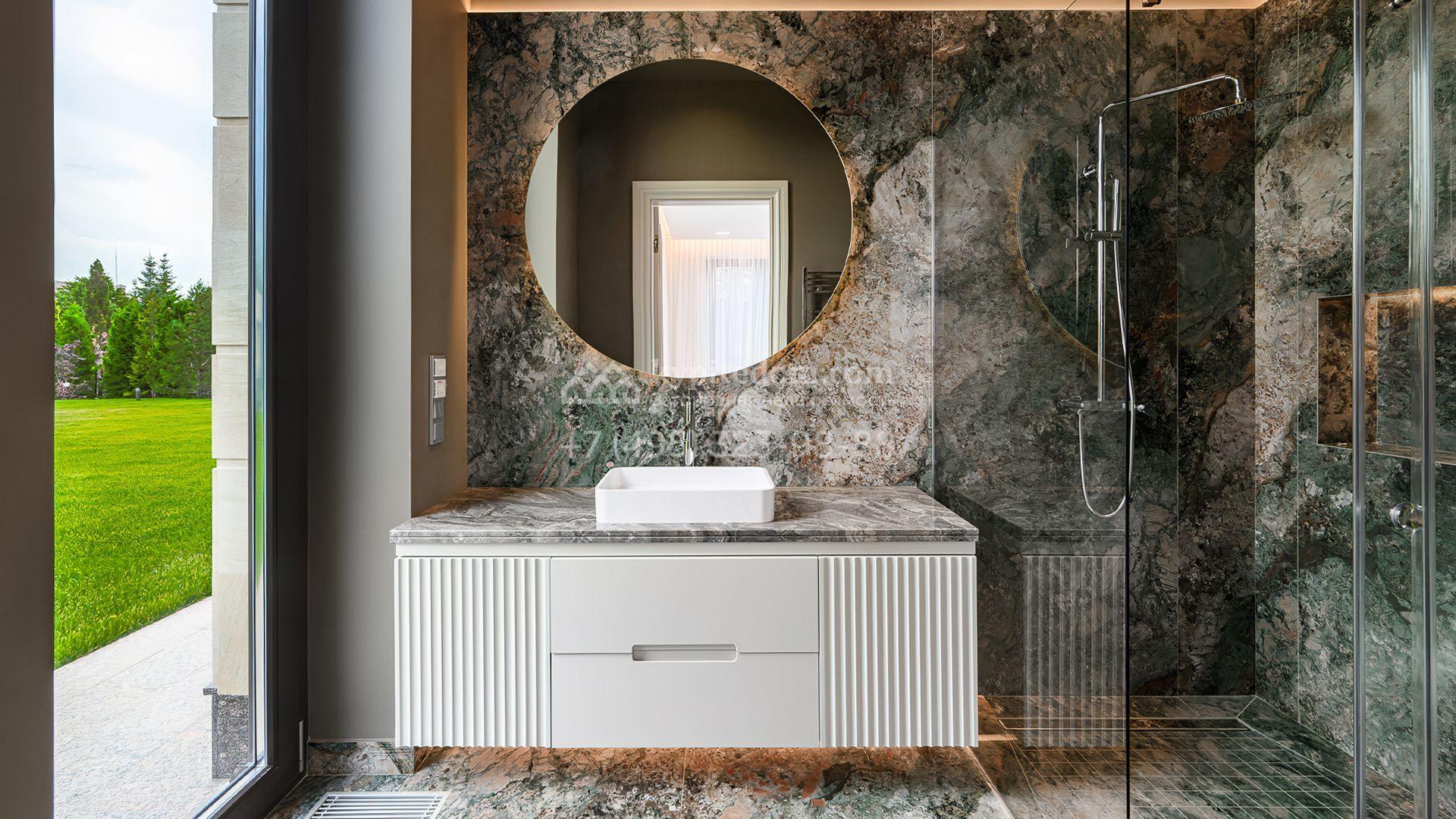 Загородный особняк площадью 1071 м² расположен на просторном полевом участке 27 соток с ландшафтным дизайном. Интерьер, сочетающий элементы современности и классики, выполнен в кремово-кофейных оттенках, в отделке использованы фактура мрамора, дерева, позолота, стекло и многоуровневое освещение. Планировкой резиденции предусмотрены шесть спален, уютная гостиная с камином, объединенная с кухней-столовой, рабочая кухня и терраса для отдыха на свежем воздухе. Расслабиться в конце насыщенного дня можно в SPA-зоне с бассейном, сауной и хаммамом. В контуре дома расположен гараж на две машины. Рядом разместили гостевой дом площадью 87 м².