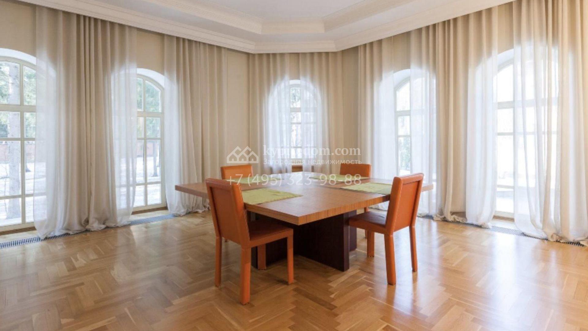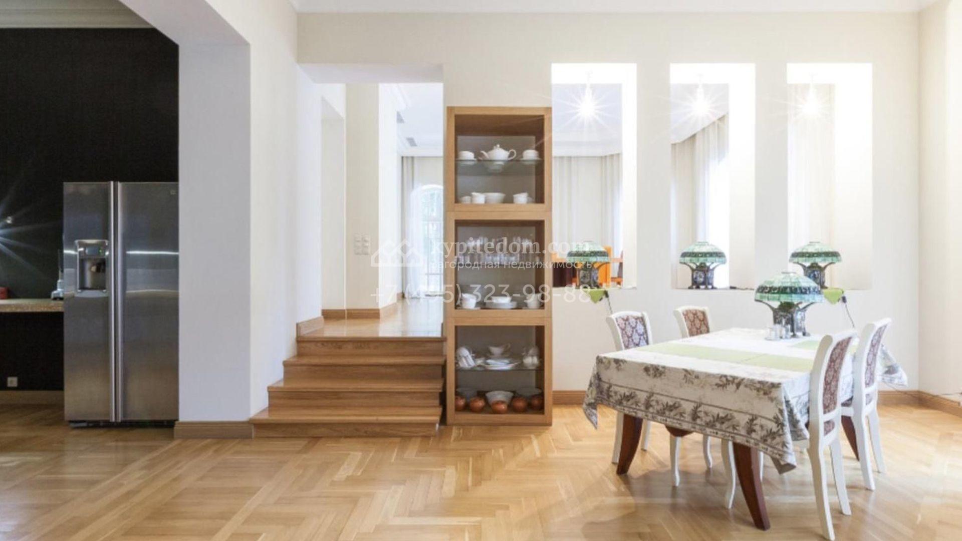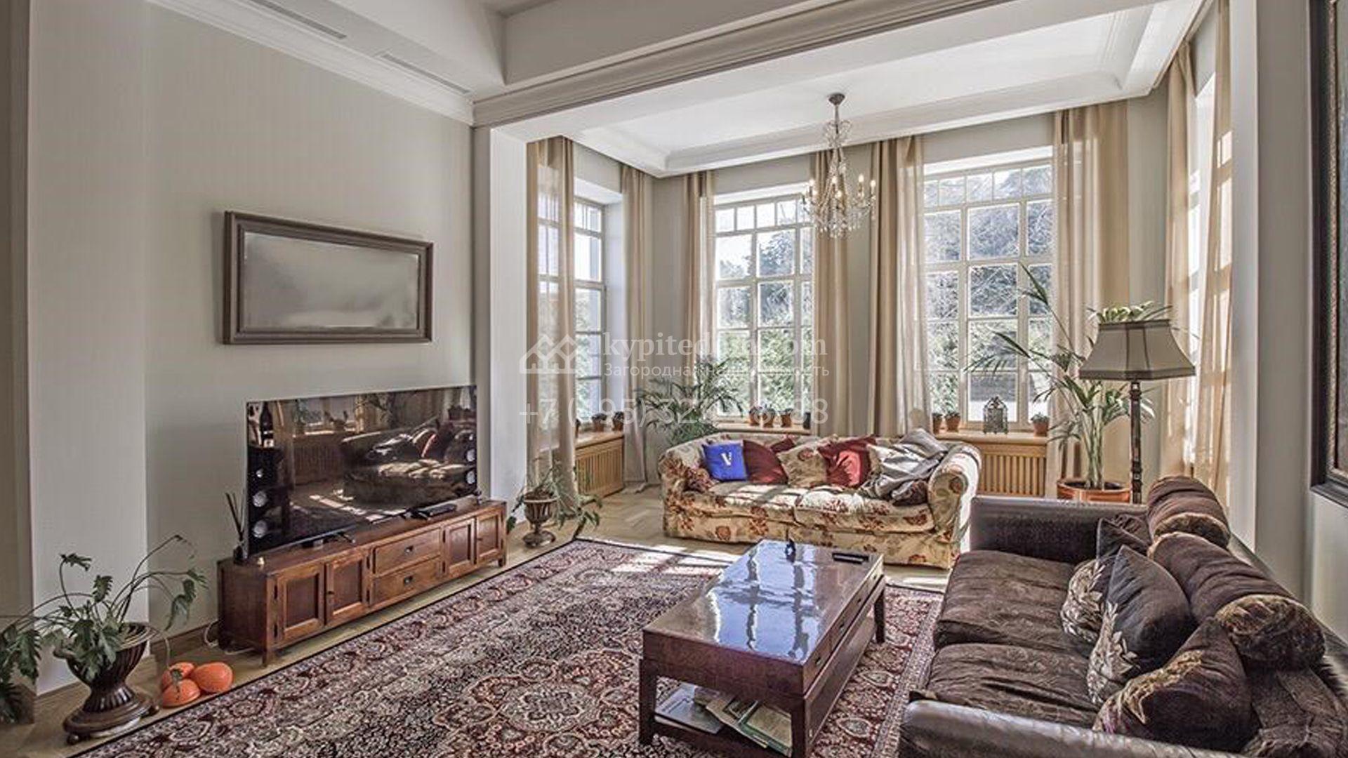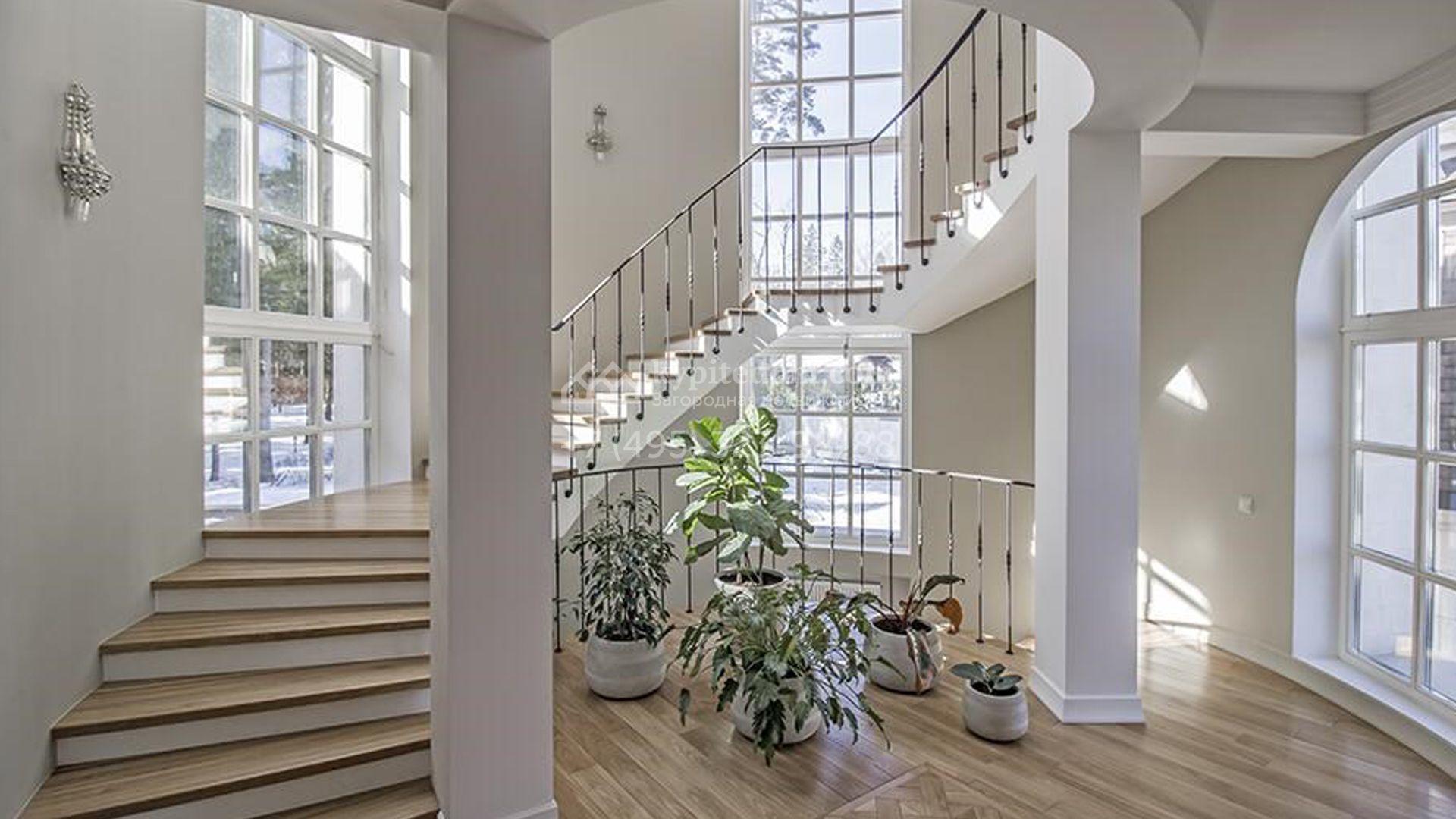 Загородный особняк площадью 1200 м² расположен на просторном участке 45 соток с лесными деревьями. Светлый фасад здания облицован бежевой штукатуркой. В отделке интерьера преобладают кремовые оттенки в сочетании с фактурой дерева. В резиденции спланировали 4 спальни, уютную гостиную с камином, столовую, кухню, домашний кинотеатр и тренажерный зал. Для отдыха и расслабления предусмотрен SPA с бассейном, сауной и лаунж-зоной. Рядом с коттеджем расположены дом для персонала и гараж. На участке выполнен ландшафтный дизайн и вымощены дорожки.