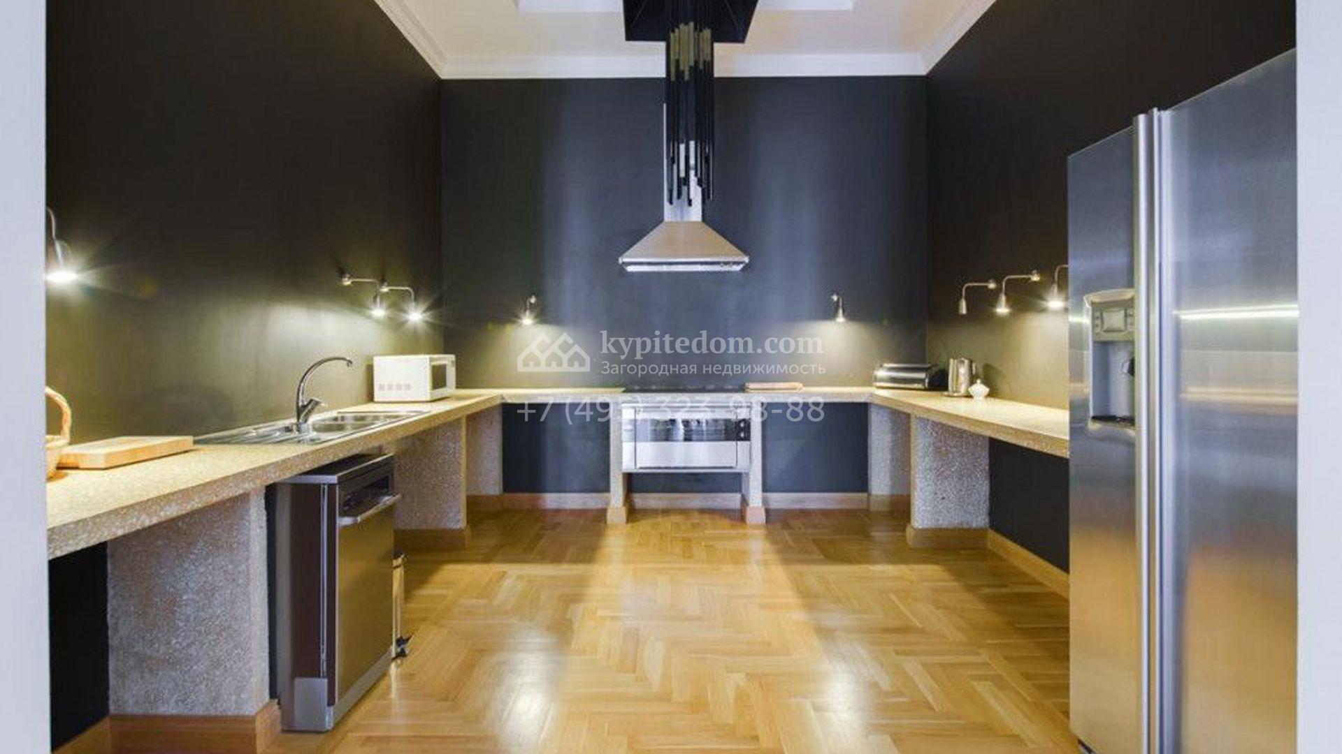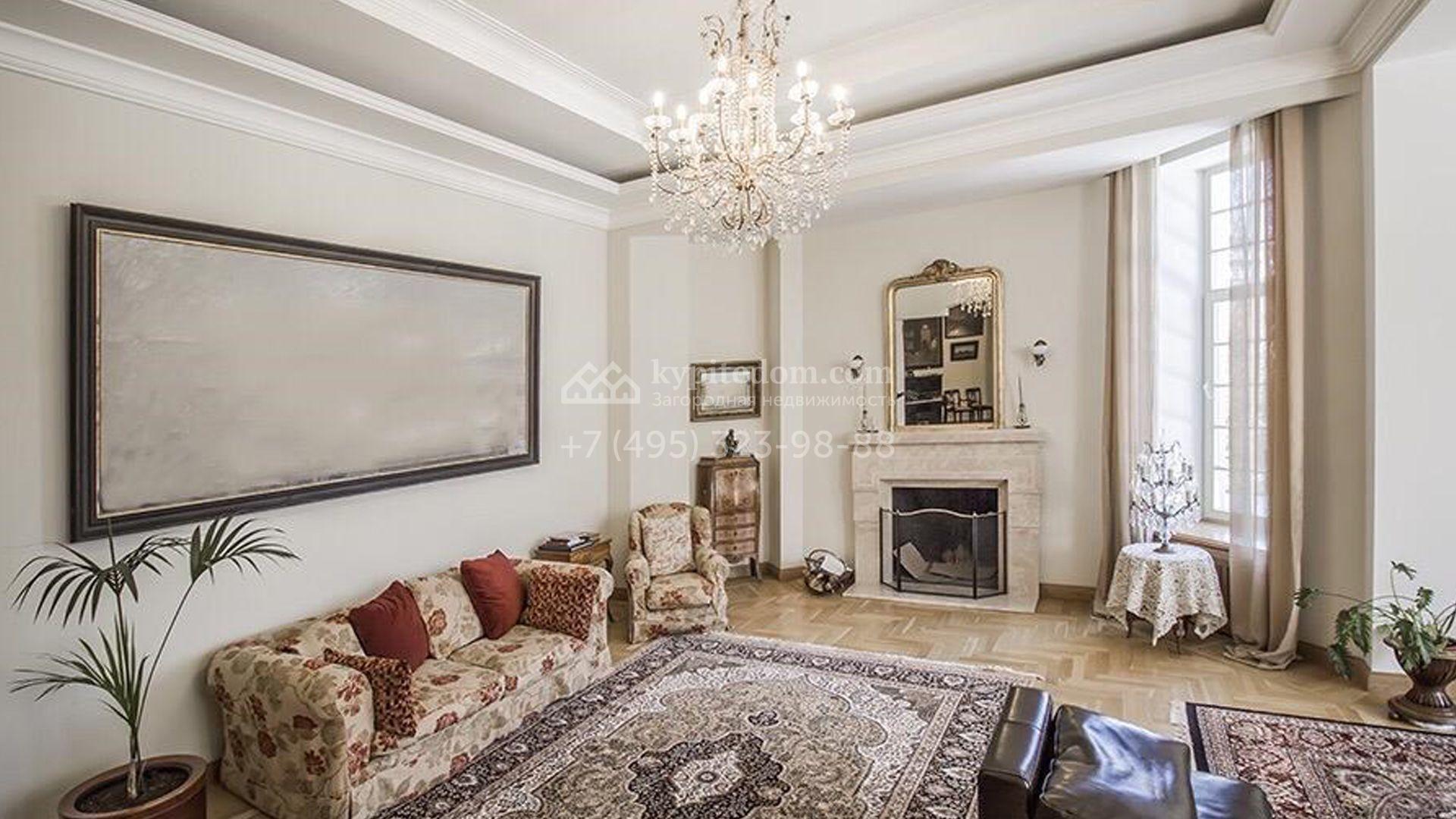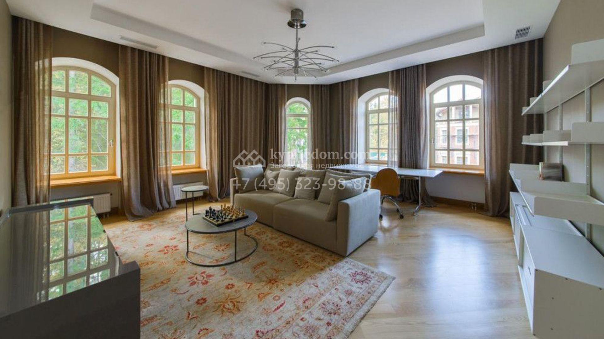 Загородный особняк площадью 1200 м² расположен на просторном участке 45 соток с лесными деревьями. Светлый фасад здания облицован бежевой штукатуркой. В отделке интерьера преобладают кремовые оттенки в сочетании с фактурой дерева. В резиденции спланировали 4 спальни, уютную гостиную с камином, столовую, кухню, домашний кинотеатр и тренажерный зал. Для отдыха и расслабления предусмотрен SPA с бассейном, сауной и лаунж-зоной. Рядом с коттеджем расположены дом для персонала и гараж. На участке выполнен ландшафтный дизайн и вымощены дорожки.