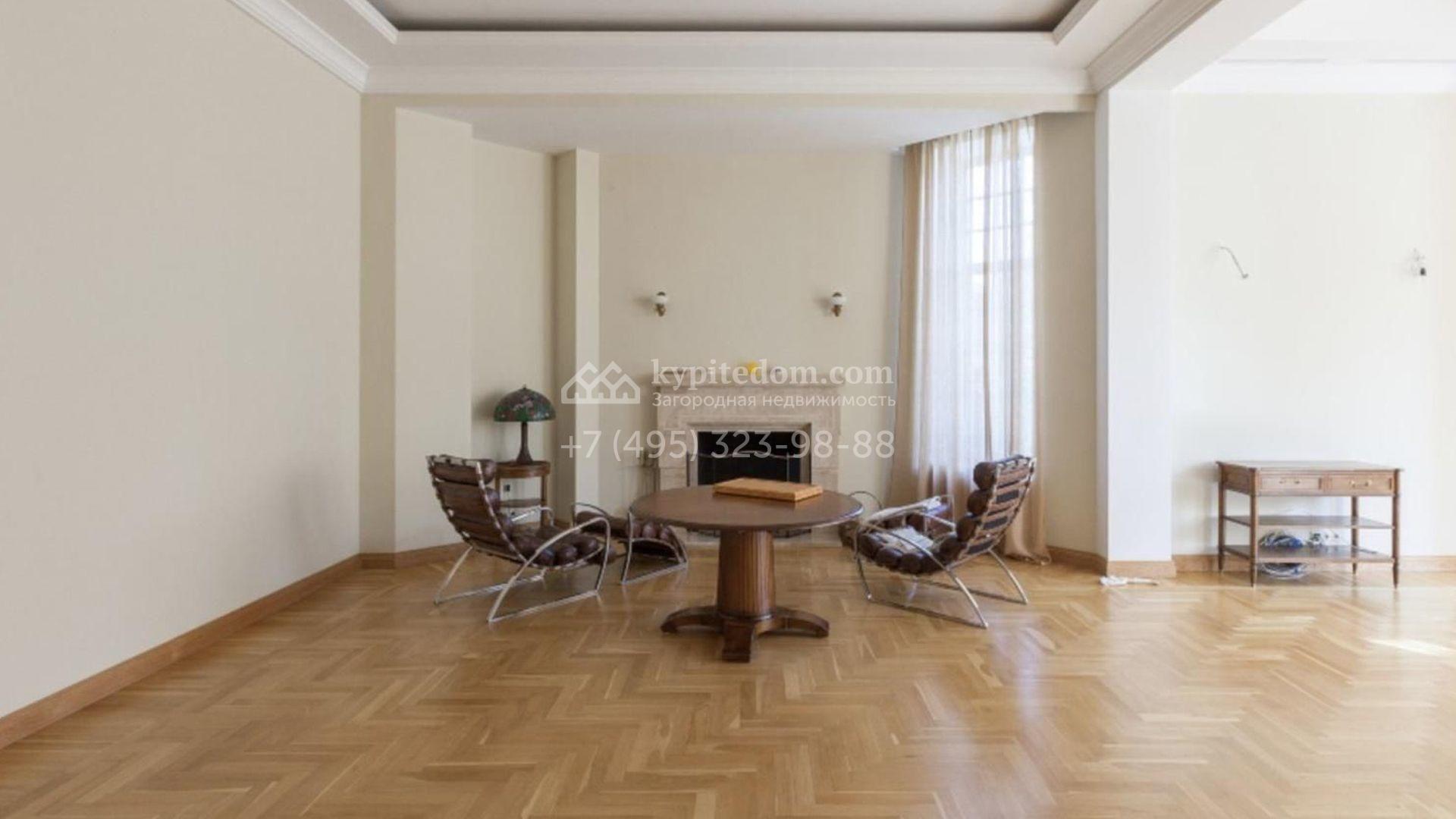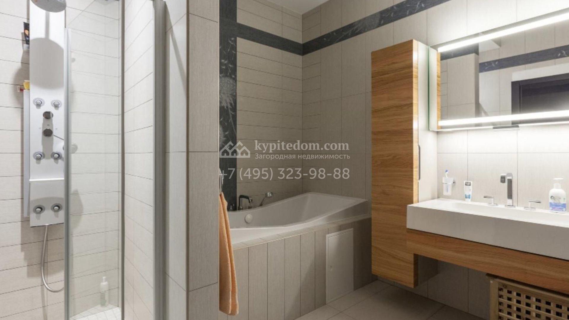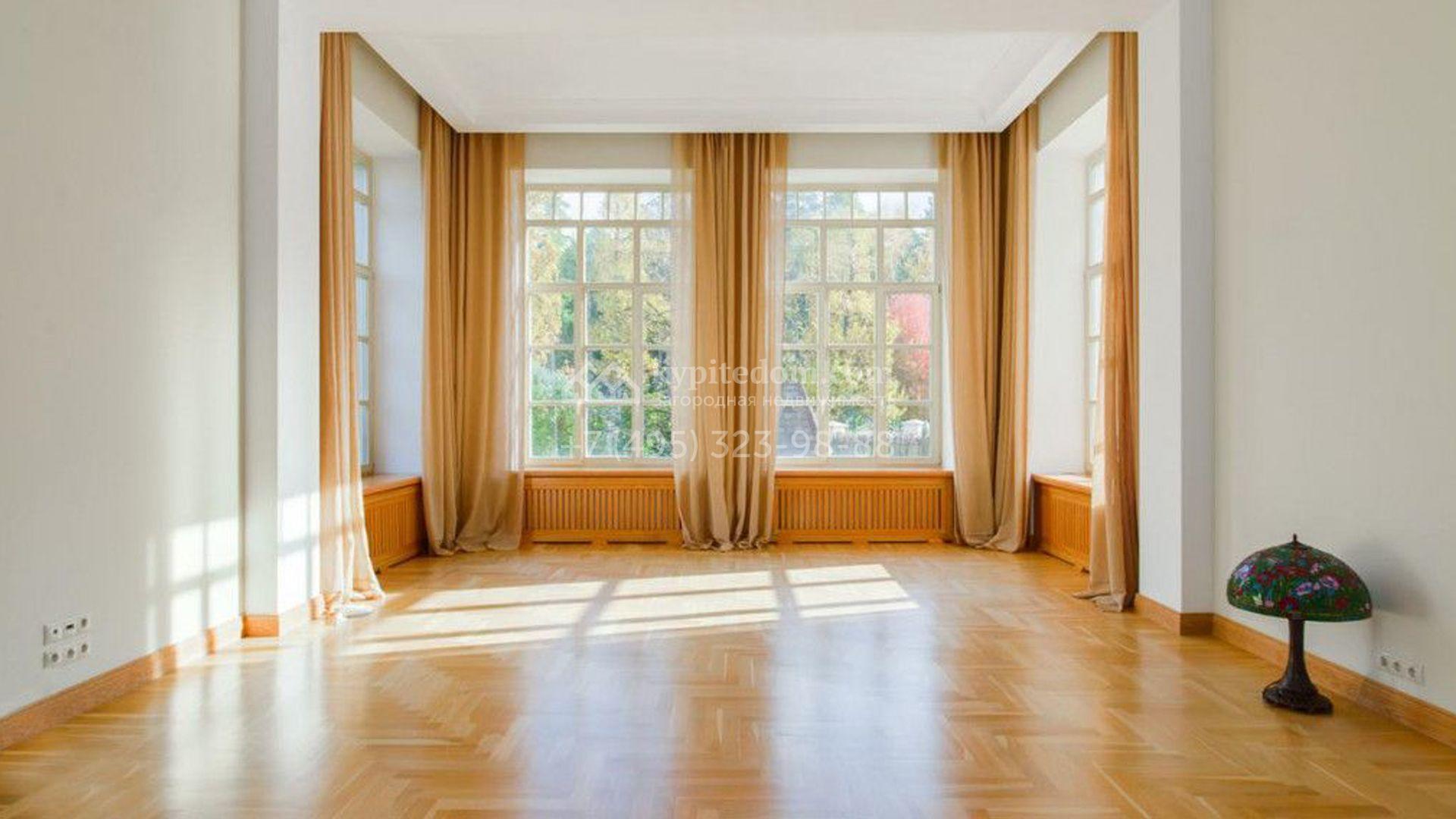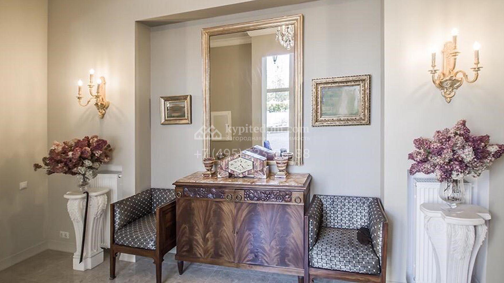 Загородный особняк площадью 1200 м² расположен на просторном участке 45 соток с лесными деревьями. Светлый фасад здания облицован бежевой штукатуркой. В отделке интерьера преобладают кремовые оттенки в сочетании с фактурой дерева. В резиденции спланировали 4 спальни, уютную гостиную с камином, столовую, кухню, домашний кинотеатр и тренажерный зал. Для отдыха и расслабления предусмотрен SPA с бассейном, сауной и лаунж-зоной. Рядом с коттеджем расположены дом для персонала и гараж. На участке выполнен ландшафтный дизайн и вымощены дорожки.