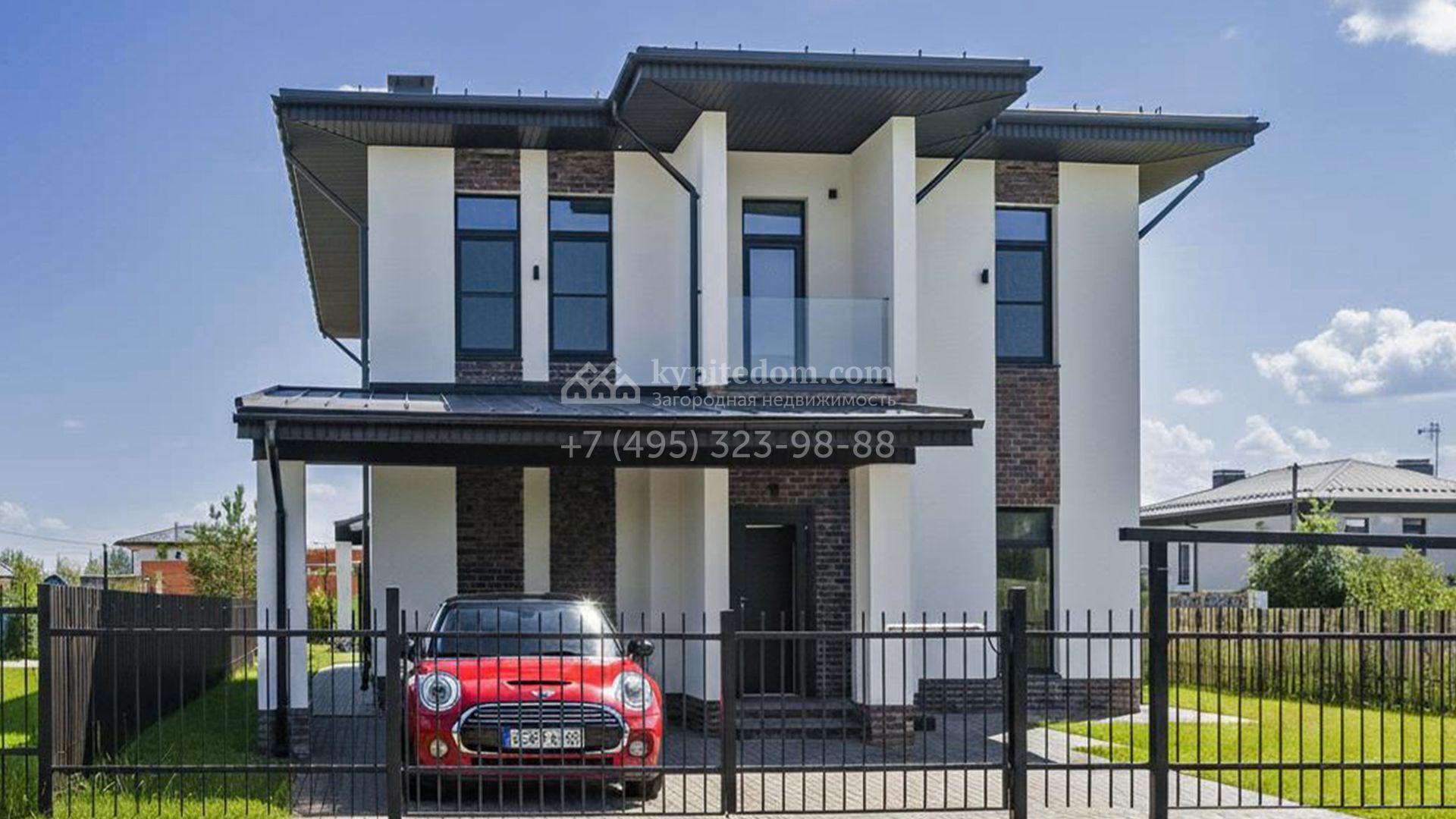 В коттедже спланировали четыре спальни и кухню-гостиную с выходом на крытую веранду. К дому пристроен навес на две машины с вымощенной брусчаткой площадкой. На участке уложен газон, высажены хвойные деревья, а также здесь можно обустроить зону барбекю.