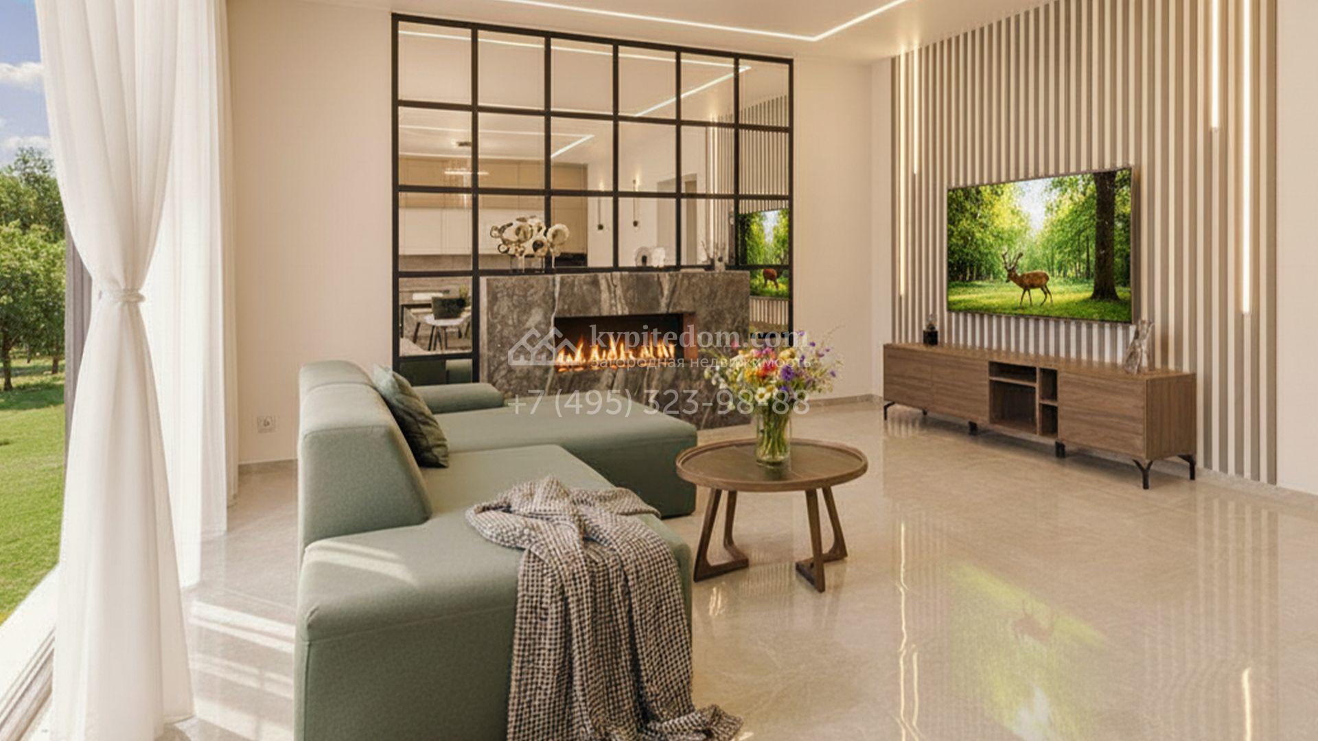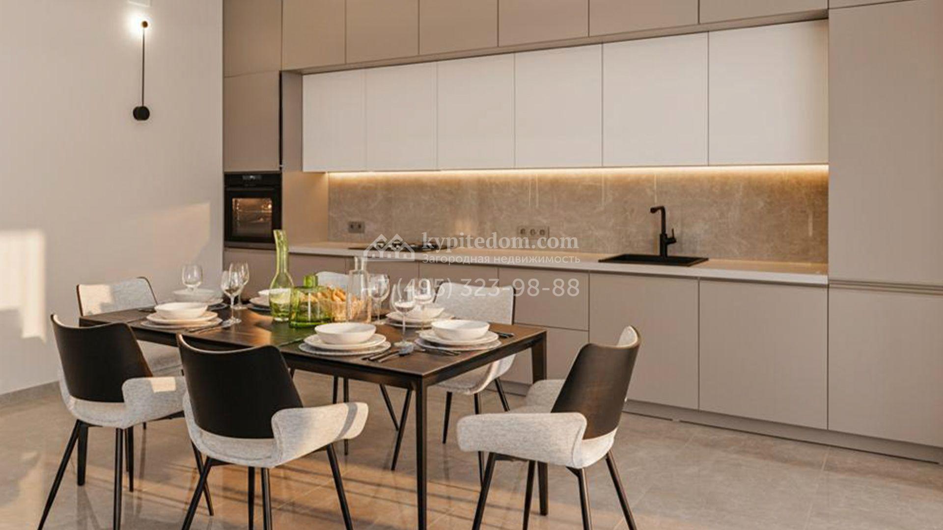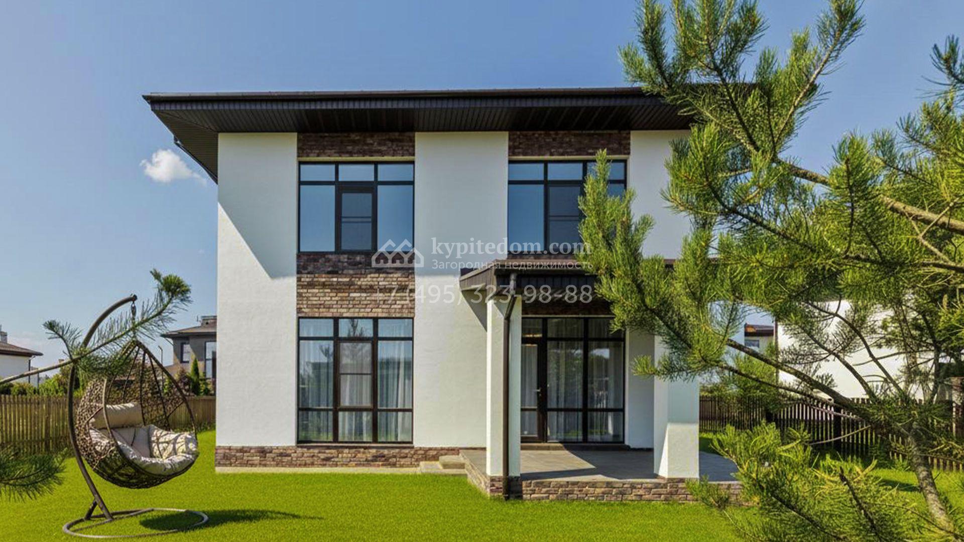 Загородный дом площадью 240 м² расположен на полевом участке 6 соток. Фасад облицован белой штукатуркой и клинкерной плиткой. Интерьер в современном стиле оформлен в светлых бежевых тонах.