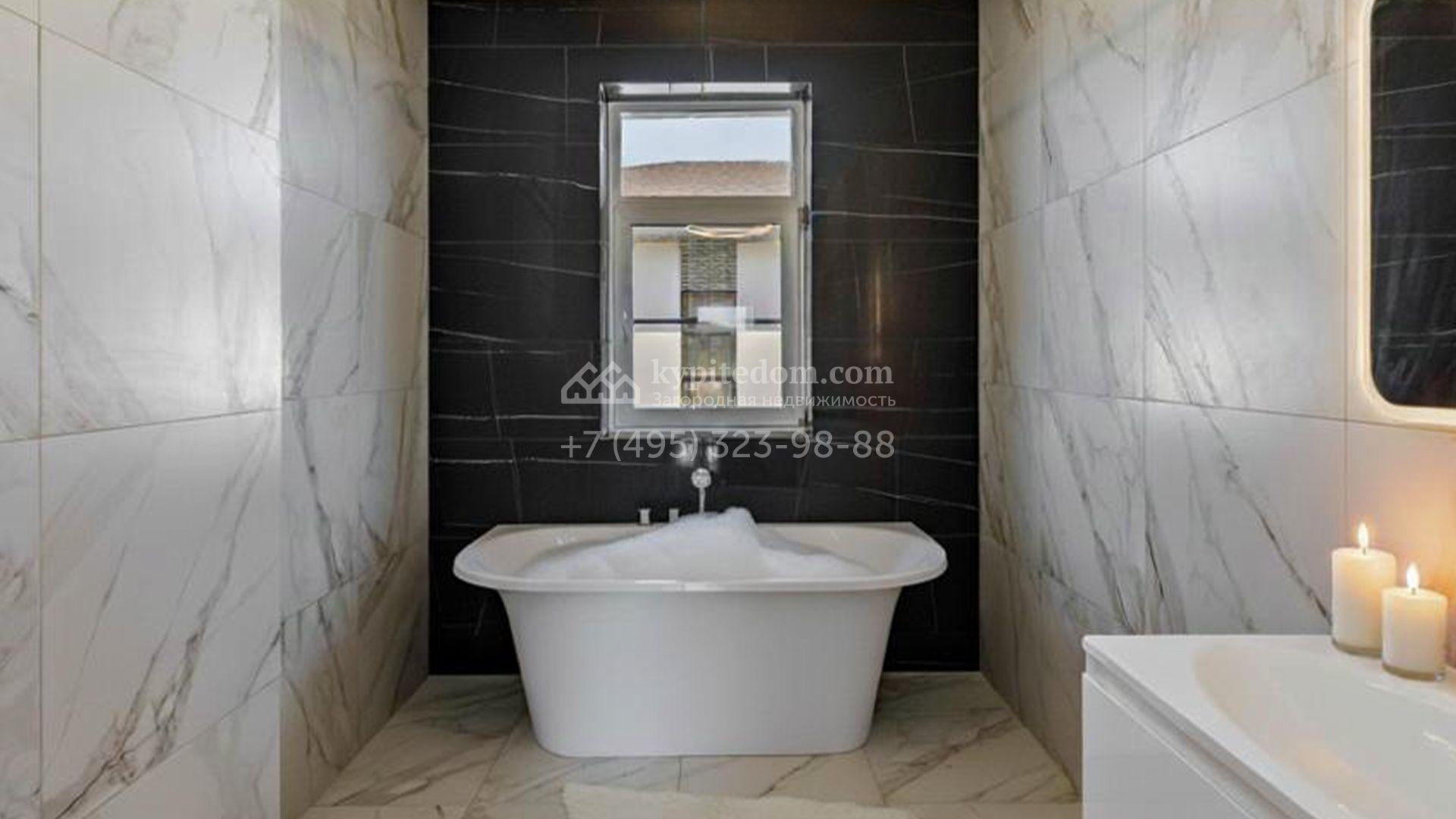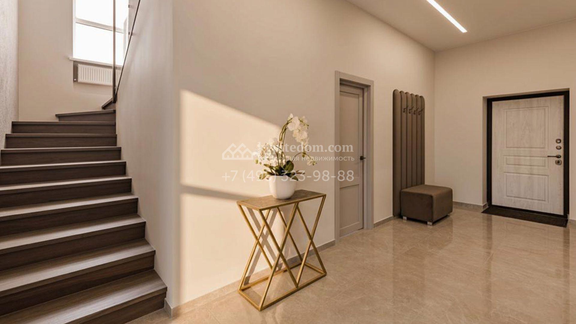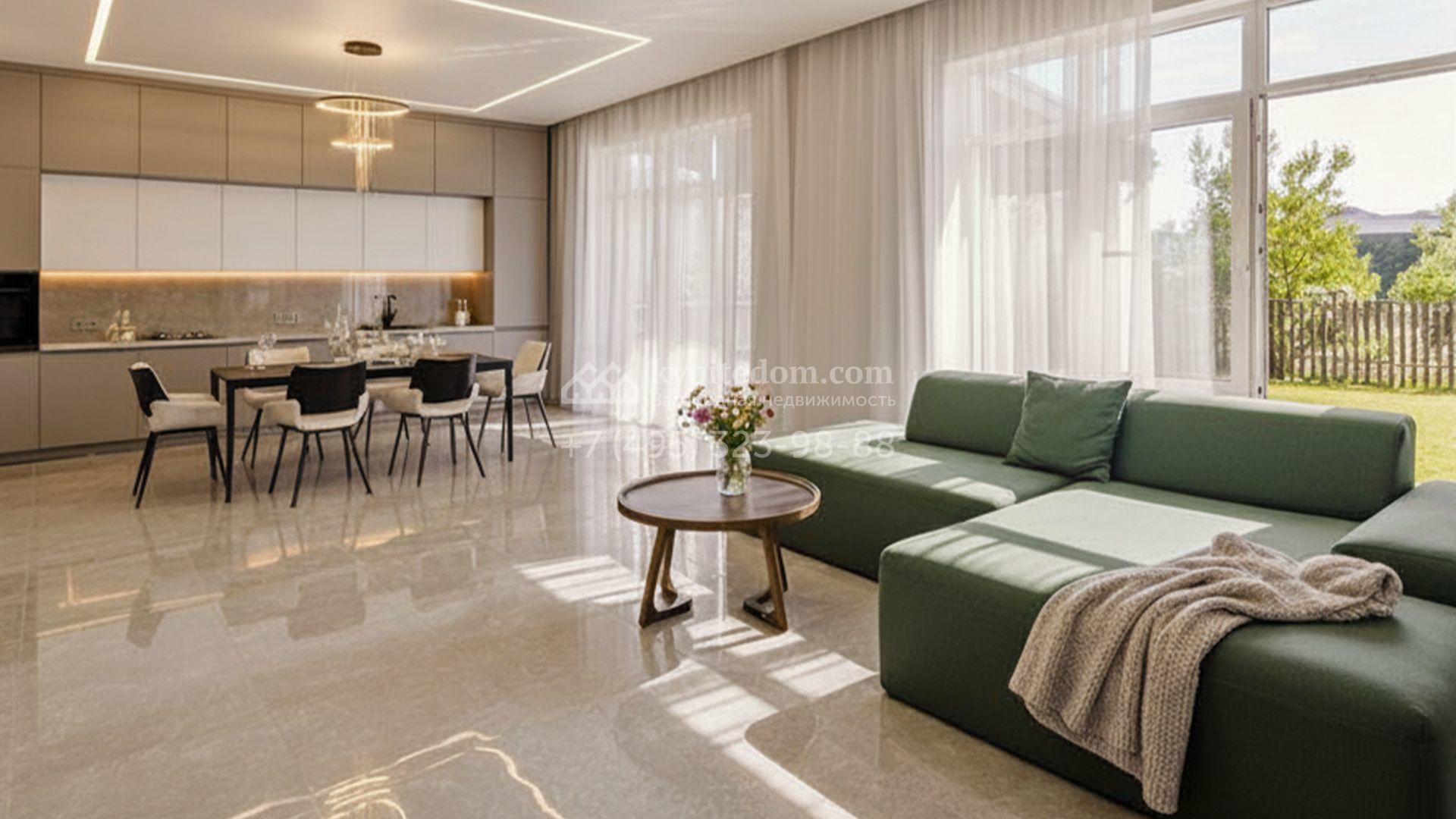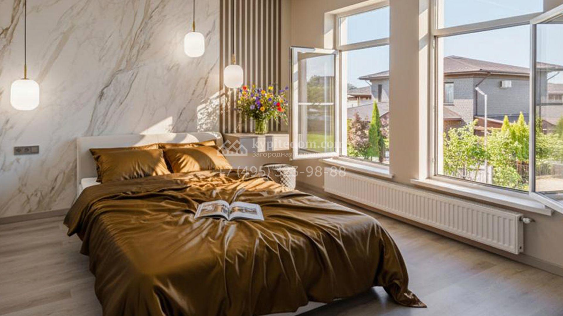 Загородный дом площадью 240 м² расположен на полевом участке 6 соток. Фасад облицован белой штукатуркой и клинкерной плиткой. Интерьер в современном стиле оформлен в светлых бежевых тонах.