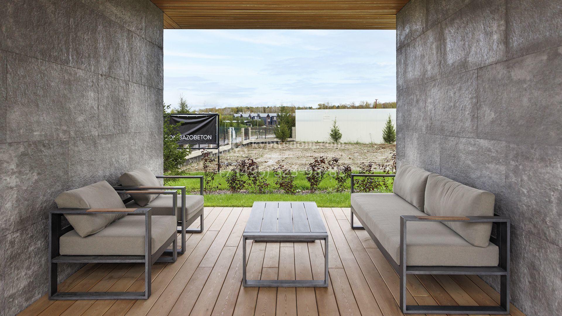 Загородный коттедж площадью 283 м², возведённый компанией DOMGAZOBETON, расположен на полевом участке 12 соток. Архитектура здания впечатляет гармоничным сочетанием благородного клинкерного кирпича с фактурами камня и дерева, где консольный вынос и элегантная подсветка создают впечатляющий образ. Безрамное панорамное остекление не только открывает великолепные виды на озеро, но и наполняет внутренние пространства солнечным теплом.