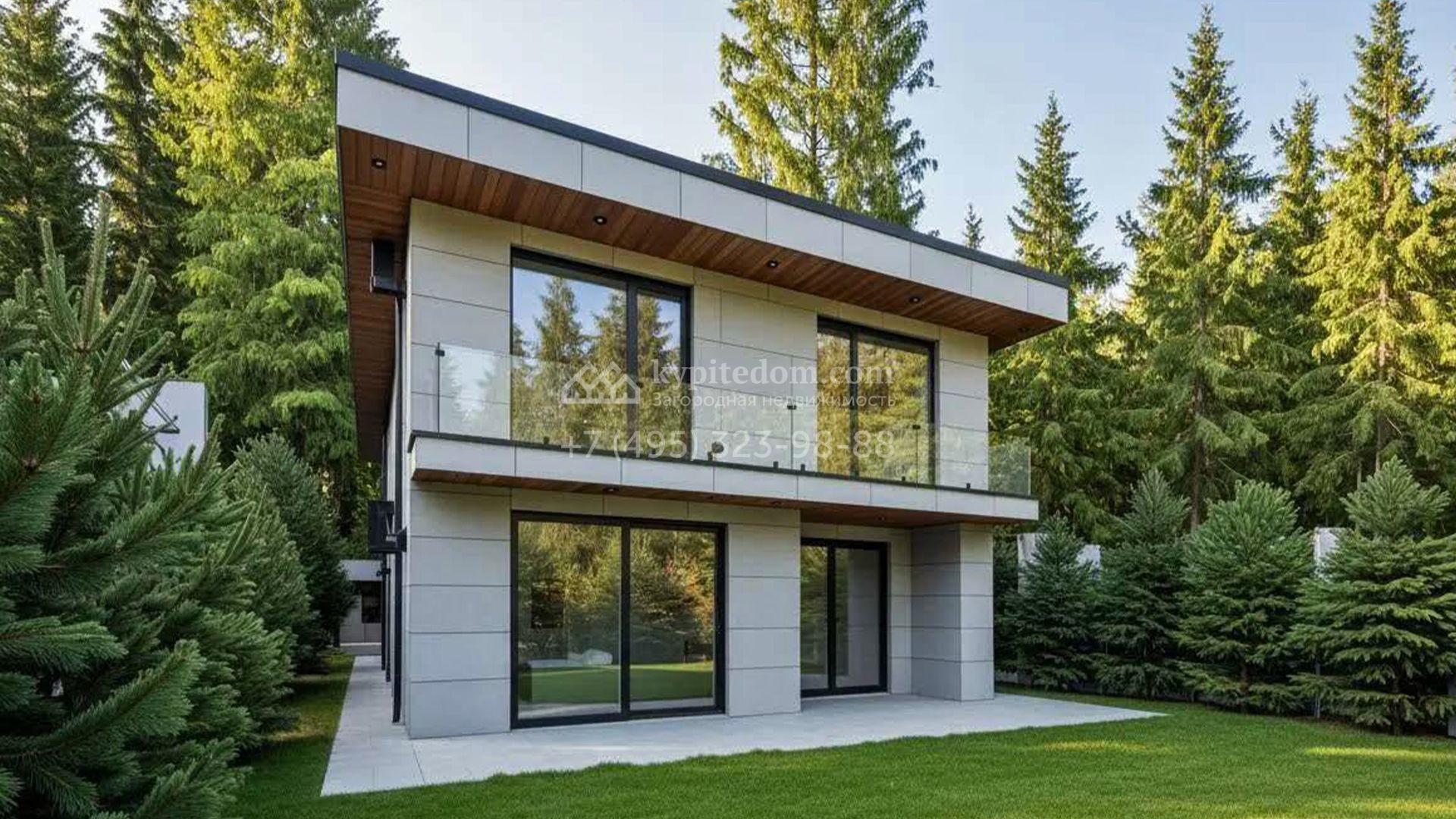 Планировка включает просторную гостиную-кухню-столовую с выходом на террасу, четыре спальни и спа-зону с сауной. Для машин предусмотрен двухместный навес. Участок благоустроен — здесь засеян аккуратный газон, а пушистые ели, высаженные по периметру, создают ощущение приватности.