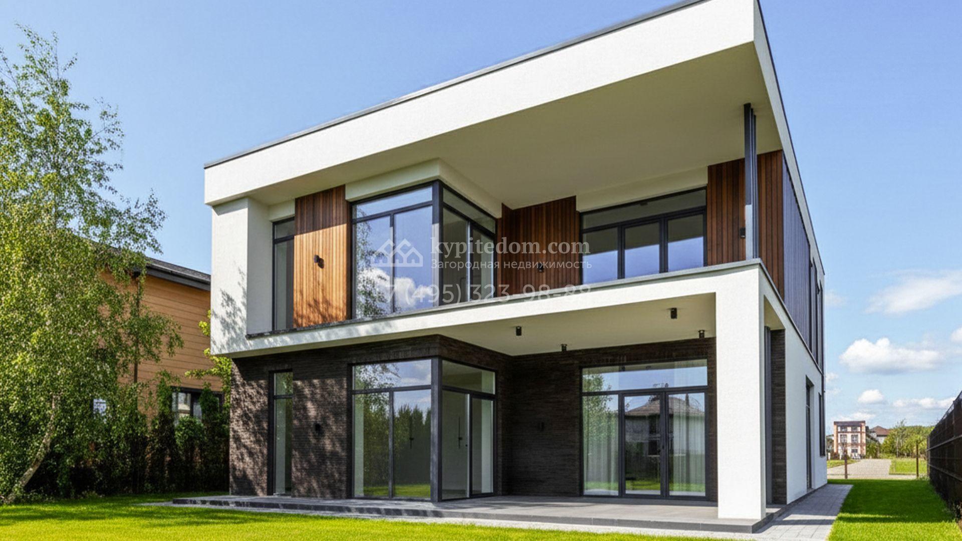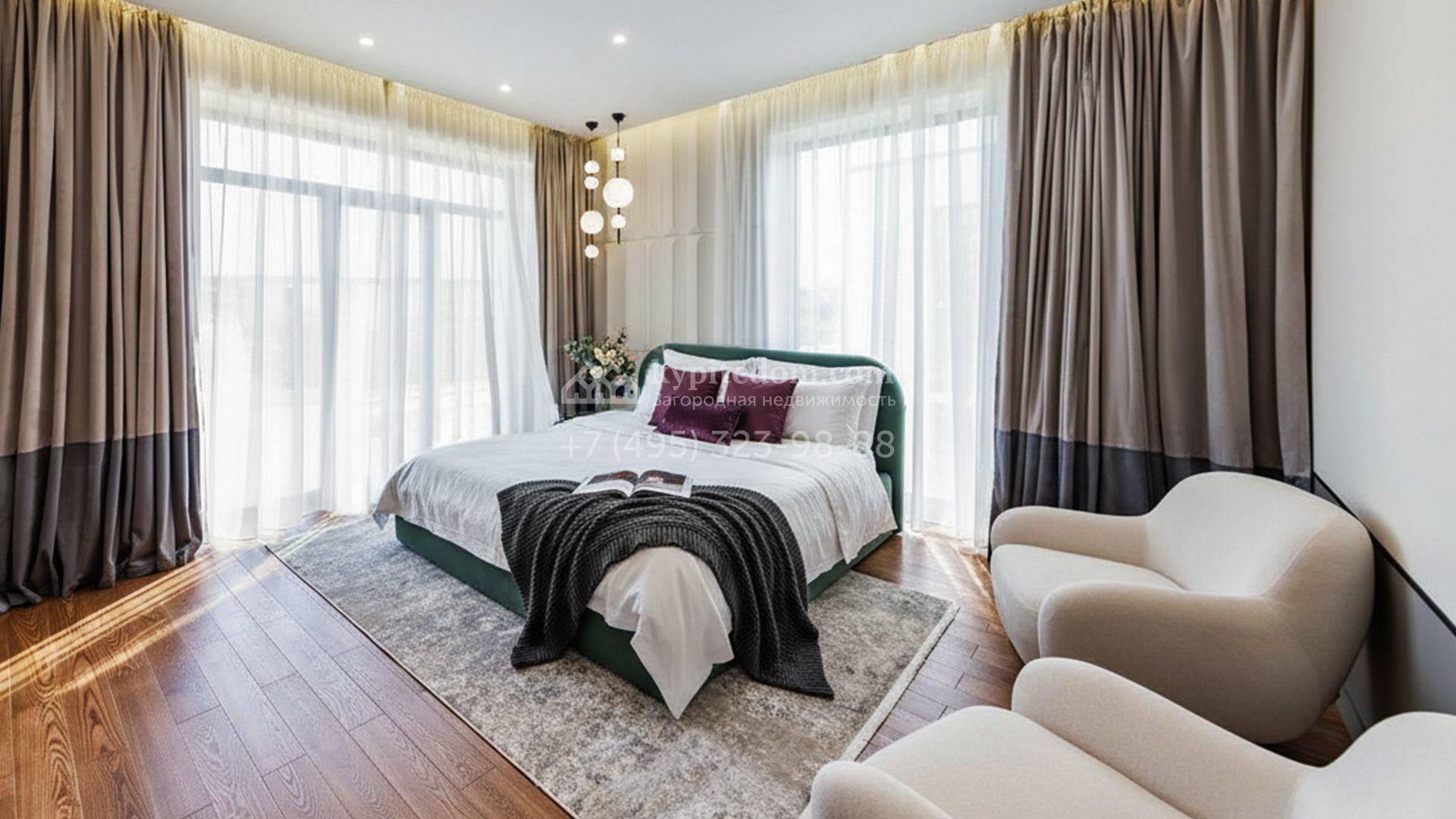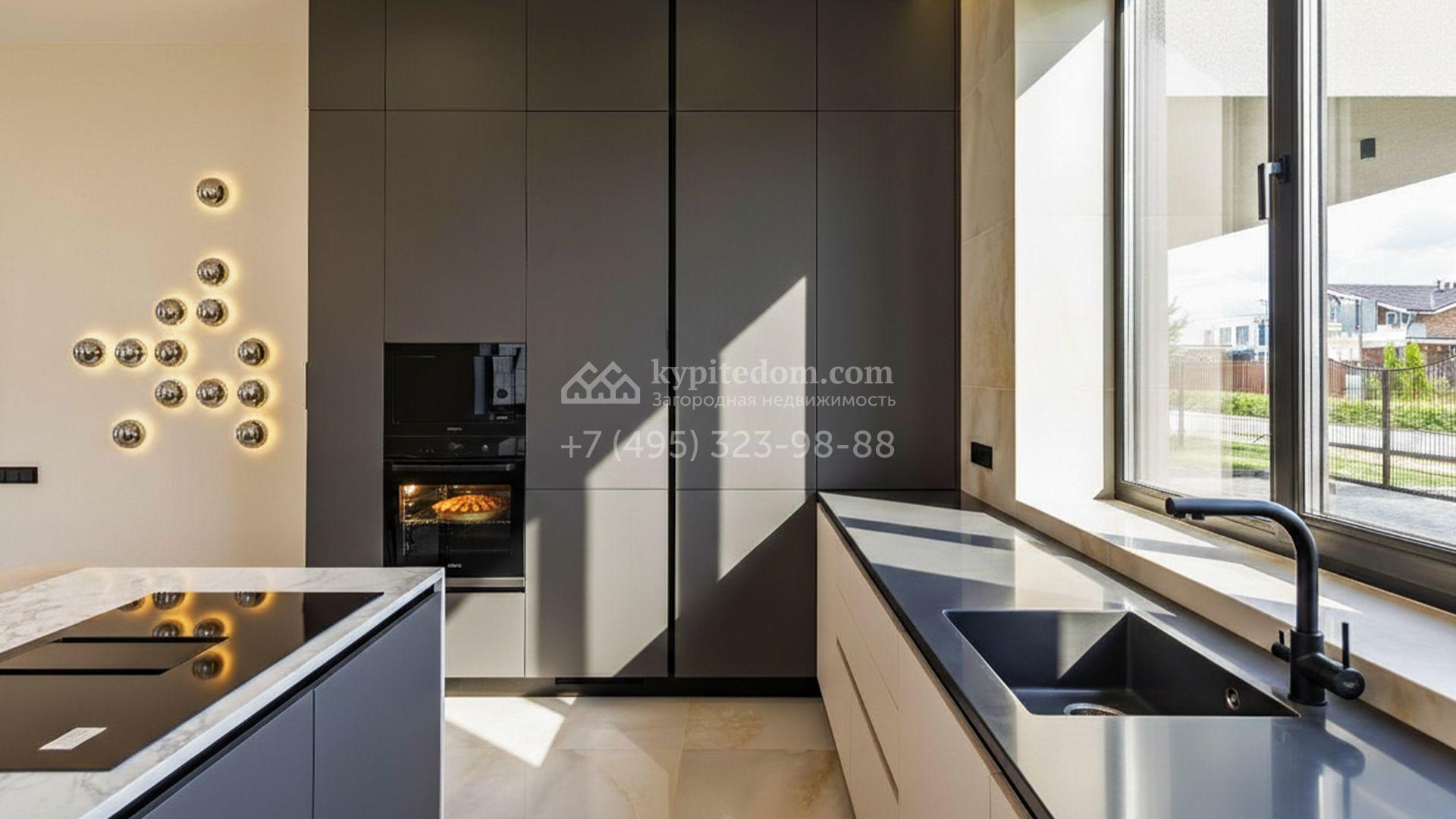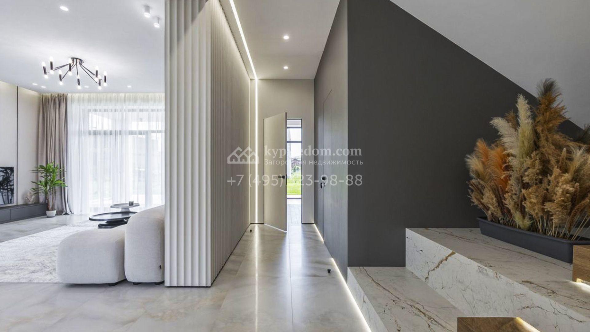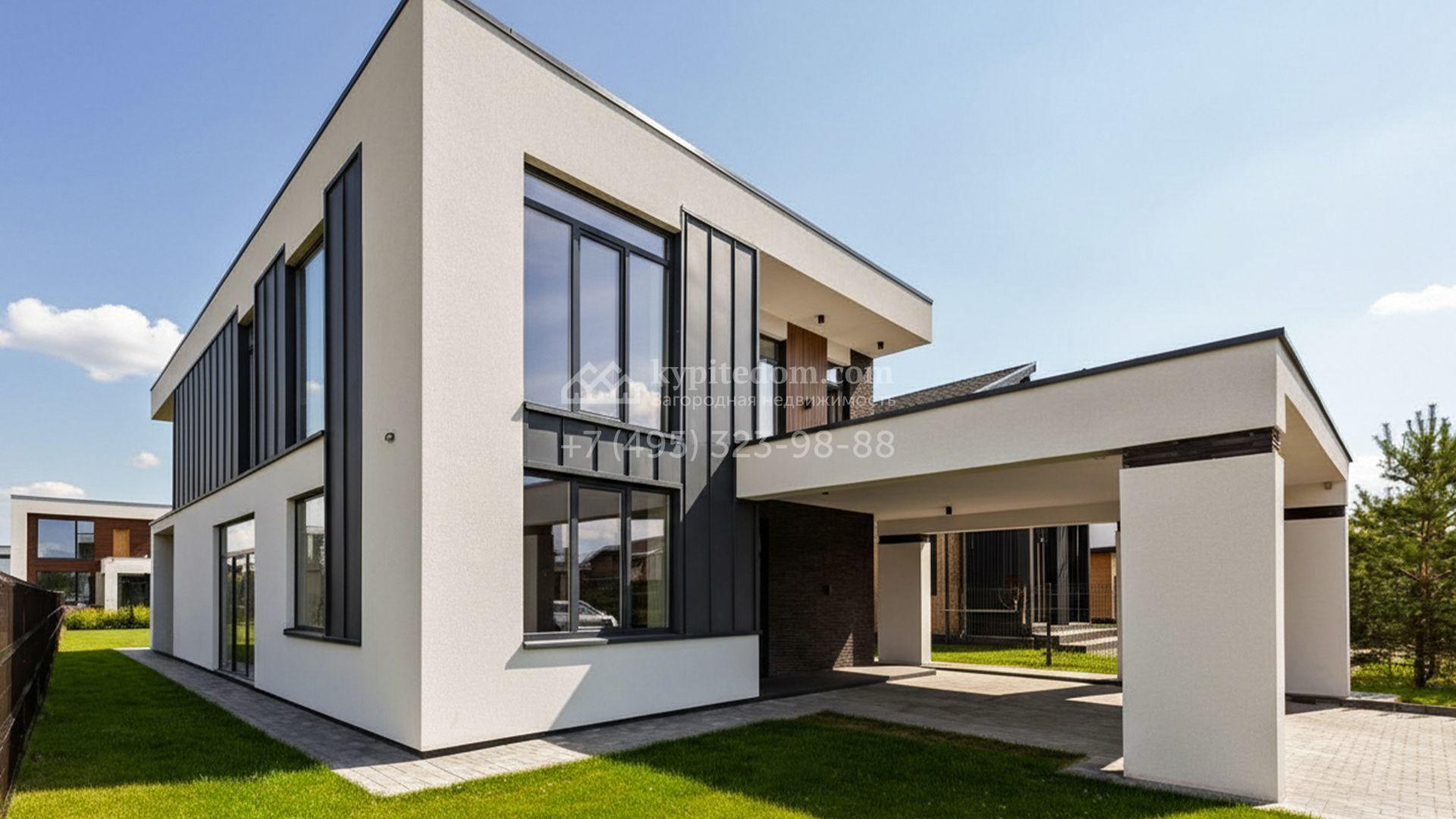 Планировка включает просторную гостиную, объединённую с кухней-столовой, приватный кабинет для работы и три спальни с вместительными гардеробными. С открытых террас открываются живописные виды на посёлок — идеальные места для отдыха с чашкой кофе в лучах заката и отдыха на свежем воздухе. Благоустроенный участок со свежескошенным газоном и вымощенной брусчаткой въездной группой можно дополнить стройными туями и яркими цветниками.