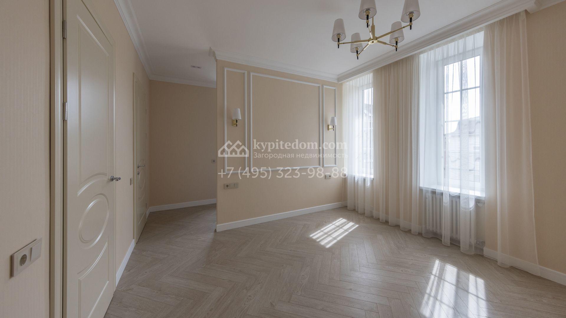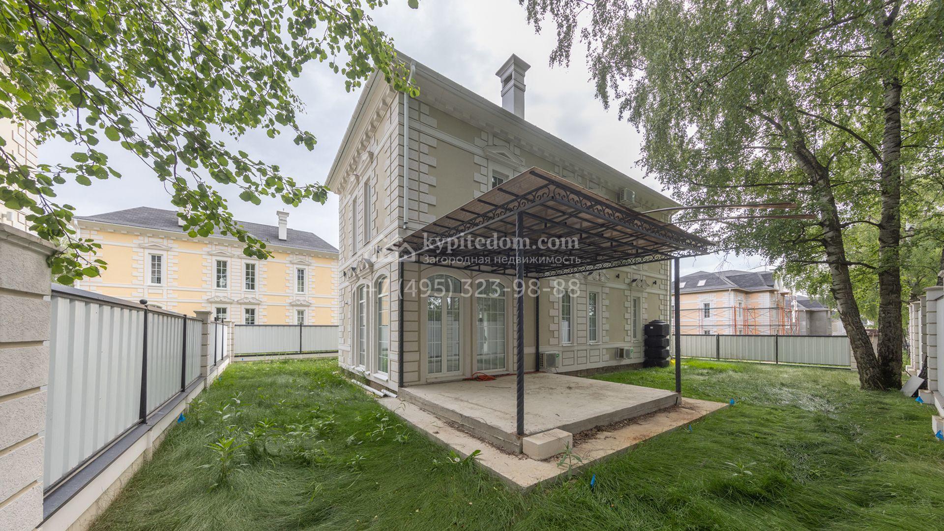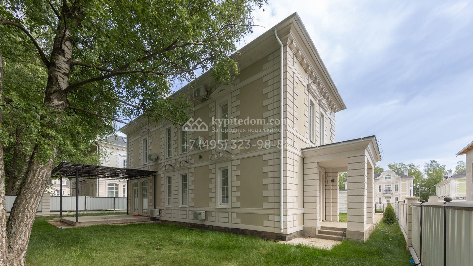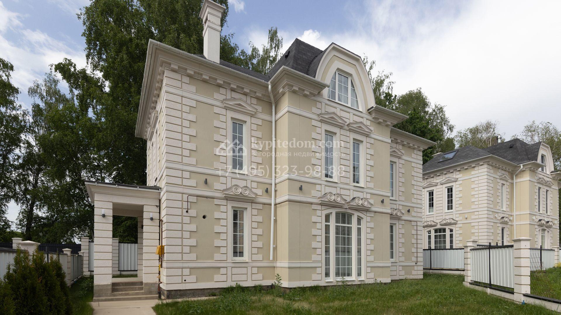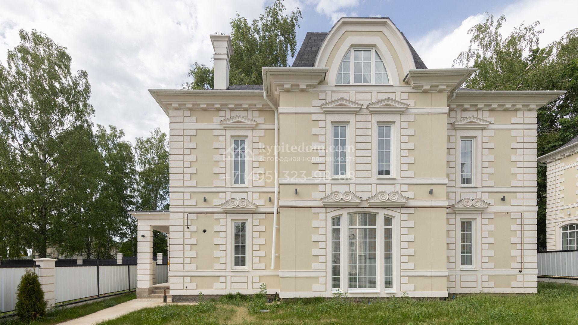 Загородный дом площадью 222 м² построен на уютном полевом участке 5,5 сотки. Фасад здания выдержан в классическом французском стиле, облицован жёлто-бежевой штукатуркой, а также декорирован белыми резными элементами и подсветкой. В отделке светлого интерьера с потолками высотой 2,9 метра преобладают тёплые оттенки, установлена итальянская сантехника.