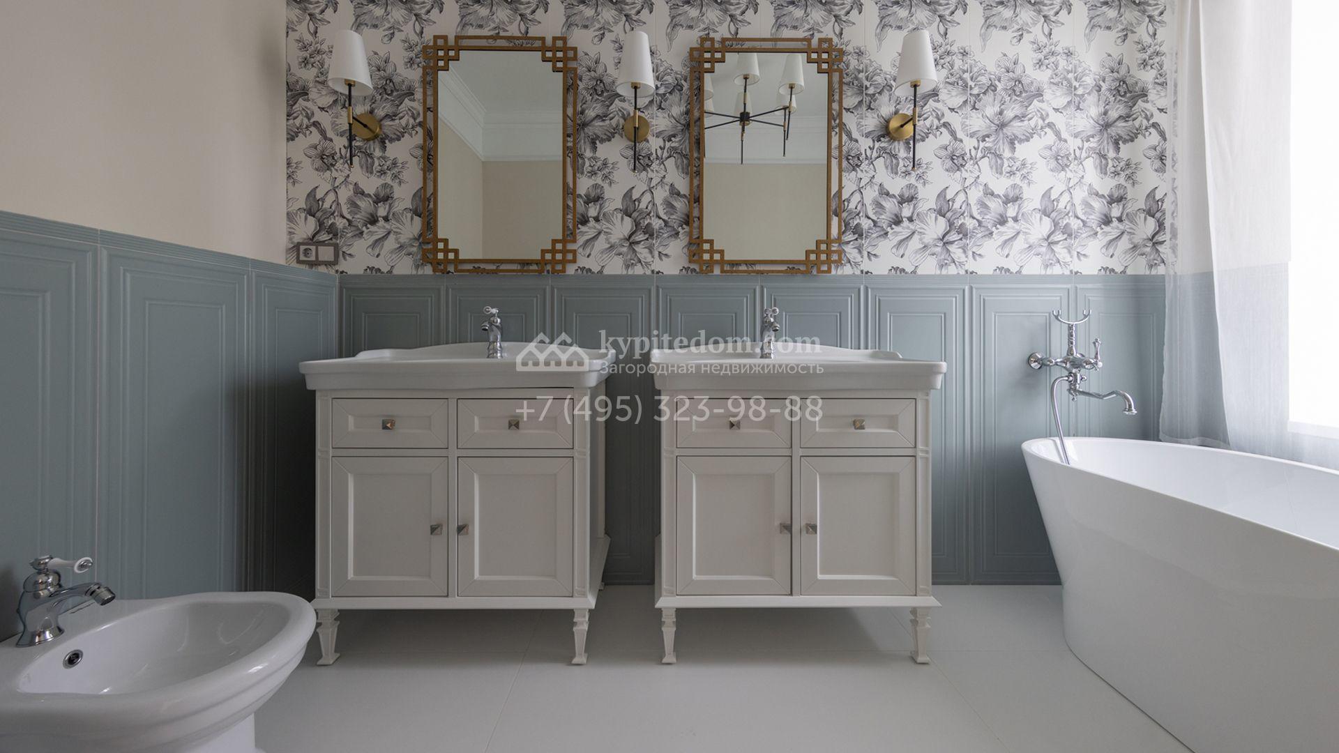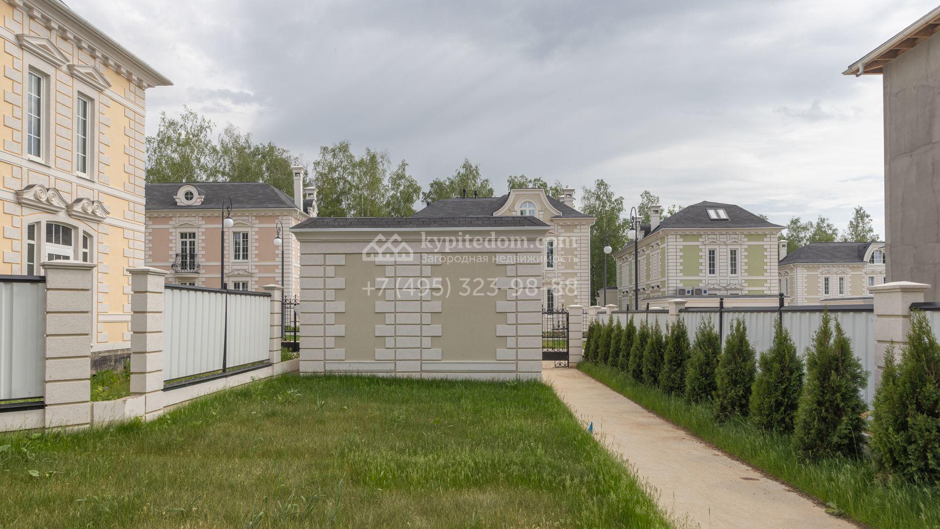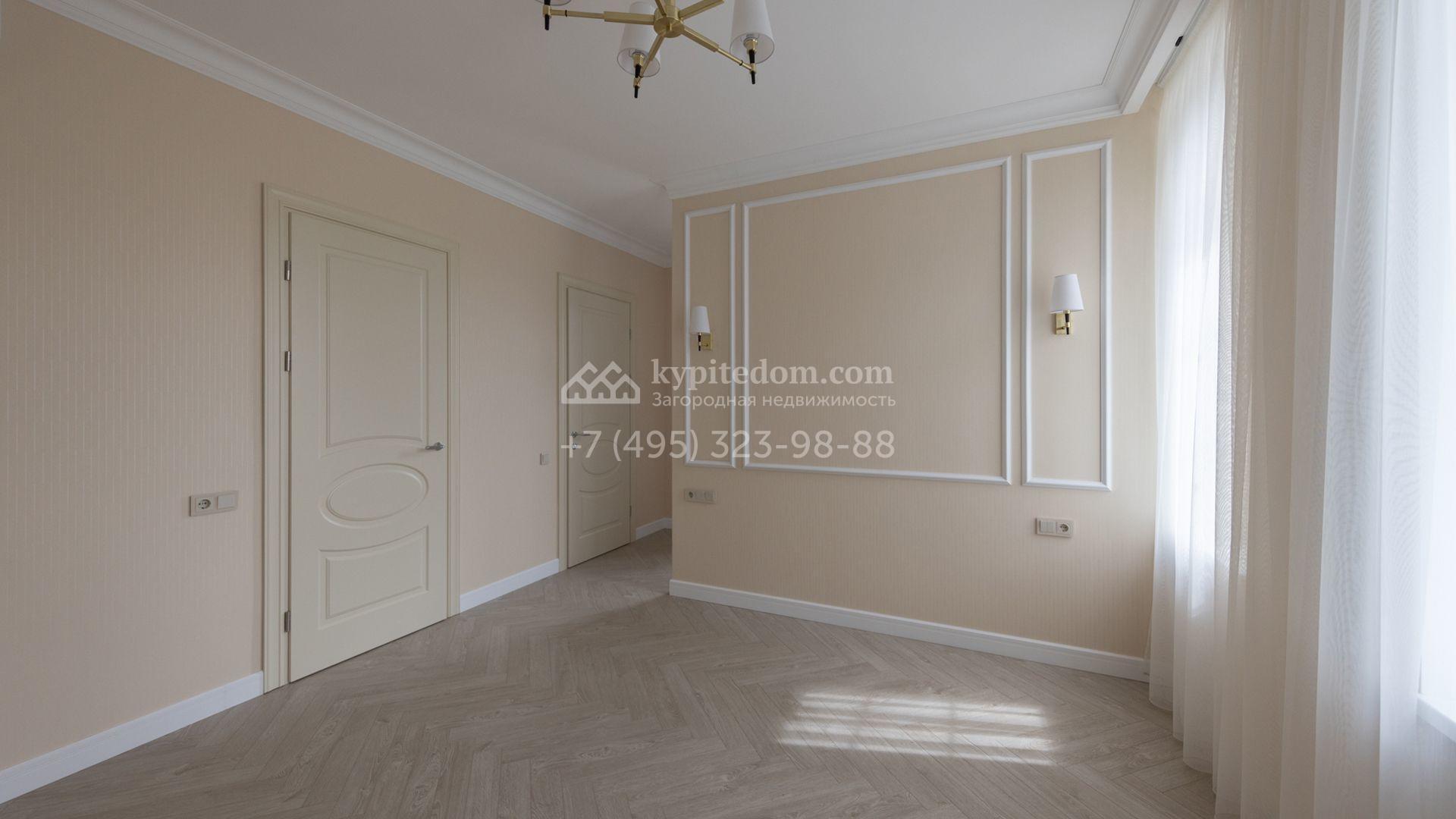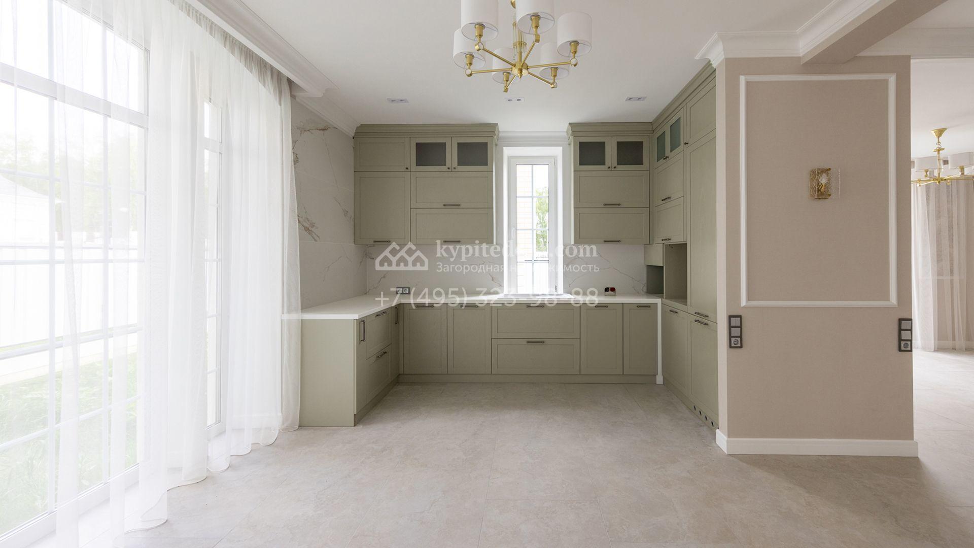 Загородный дом площадью 222 м² построен на уютном полевом участке 5,5 сотки. Фасад здания выдержан в классическом французском стиле, облицован жёлто-бежевой штукатуркой, а также декорирован белыми резными элементами и подсветкой. В отделке светлого интерьера с потолками высотой 2,9 метра преобладают тёплые оттенки, установлена итальянская сантехника.