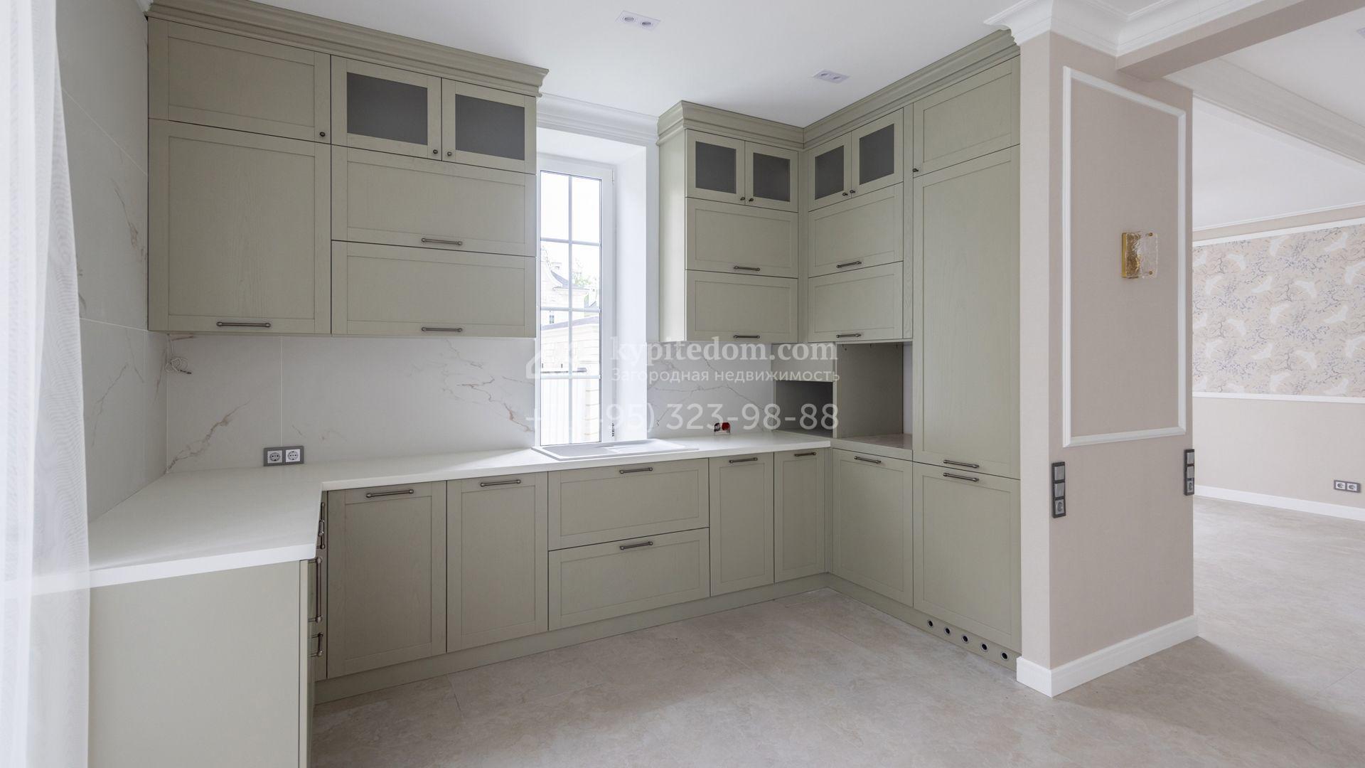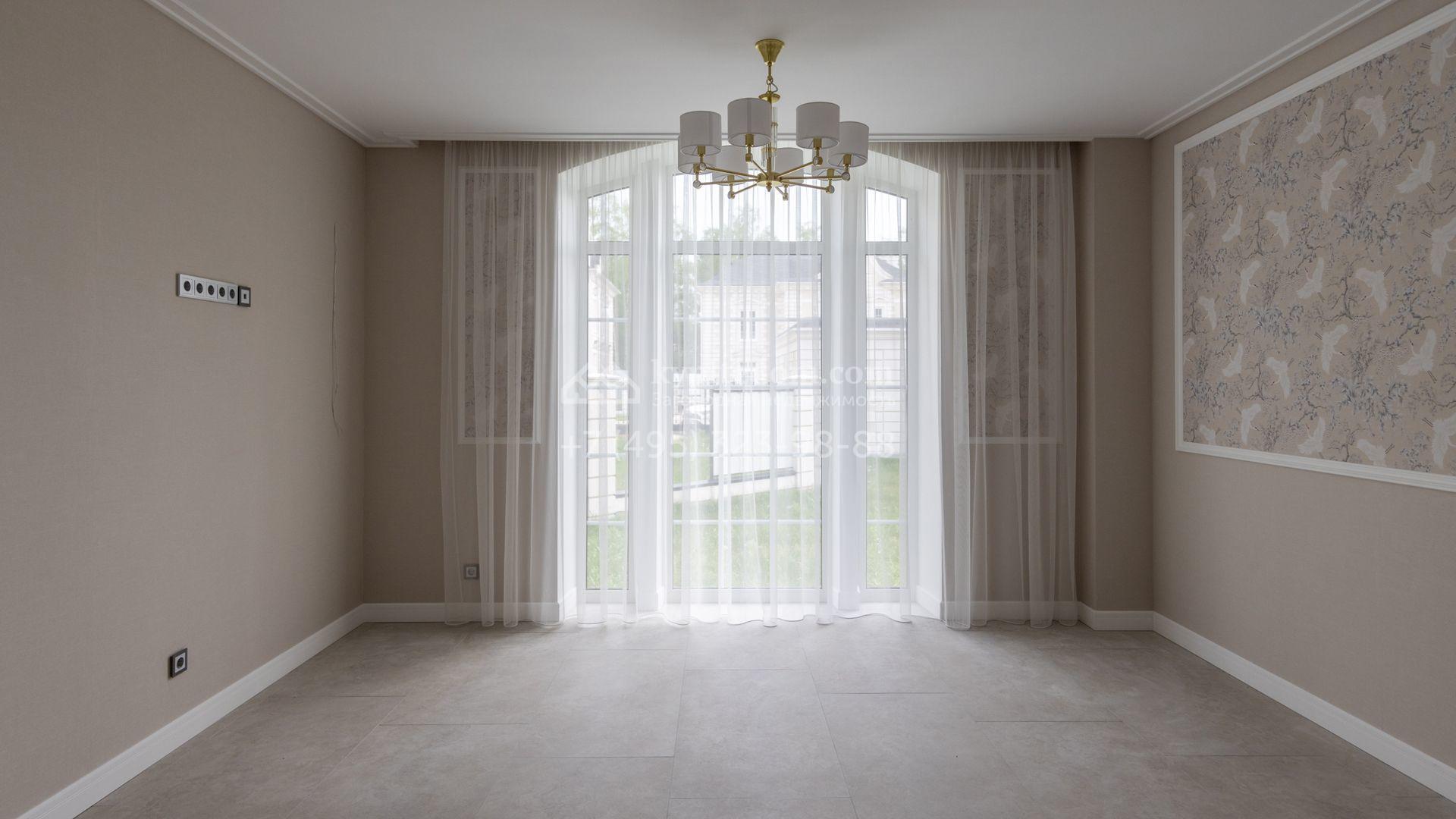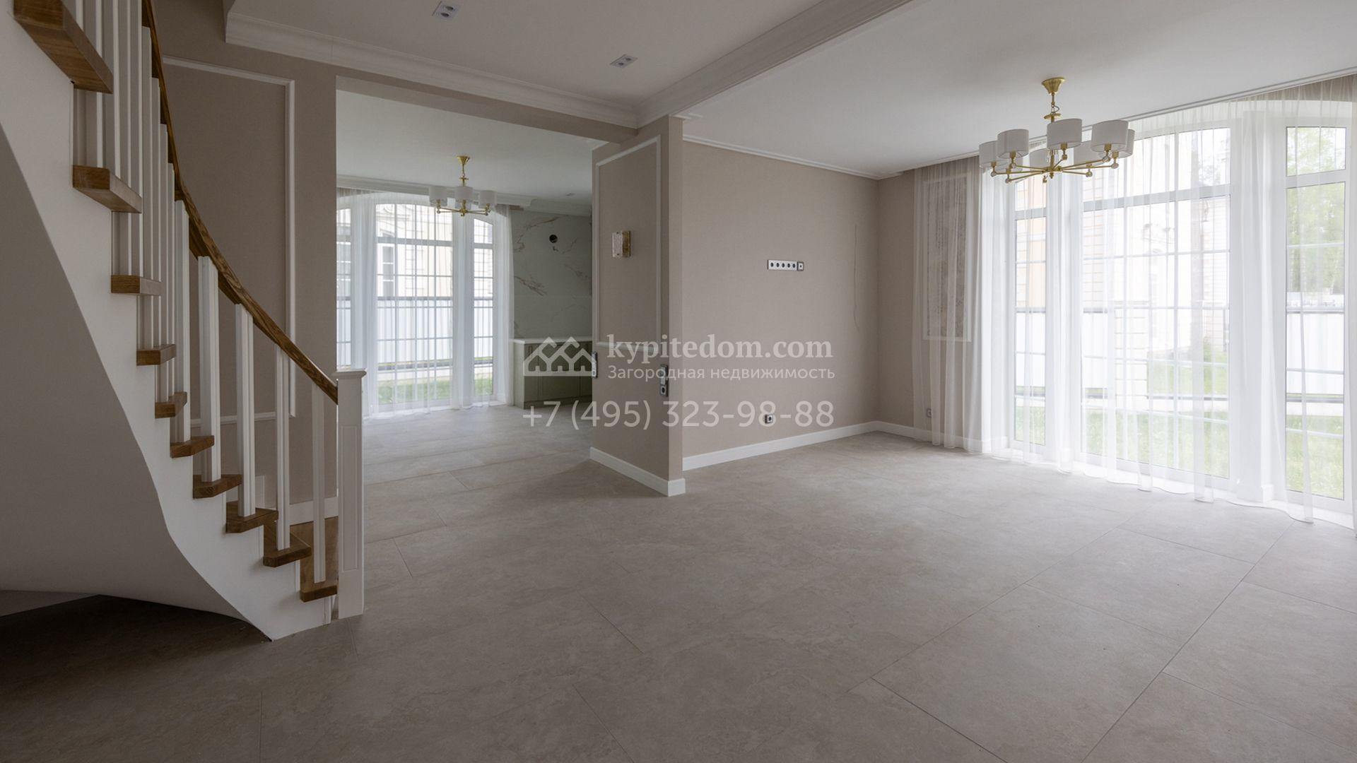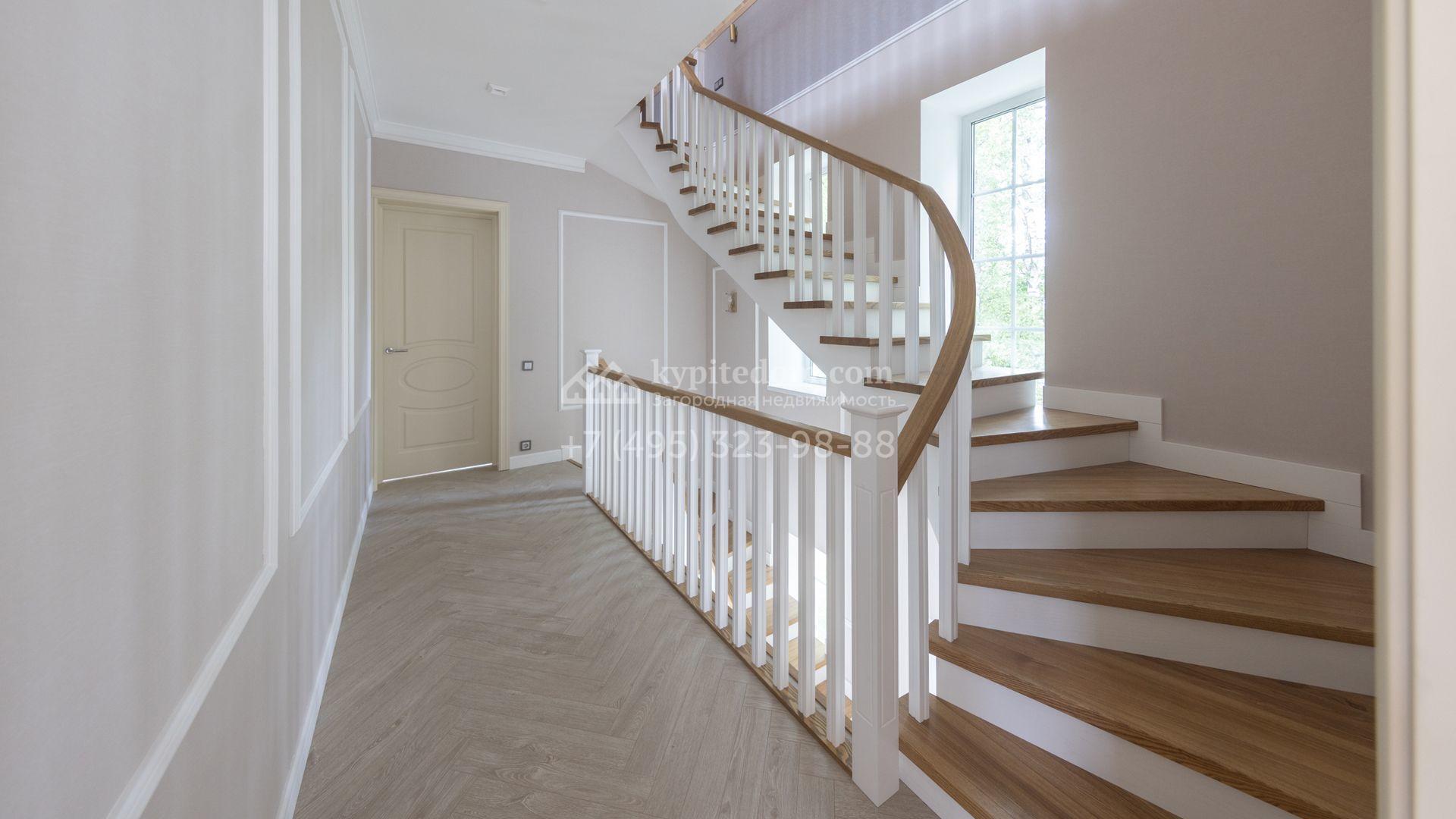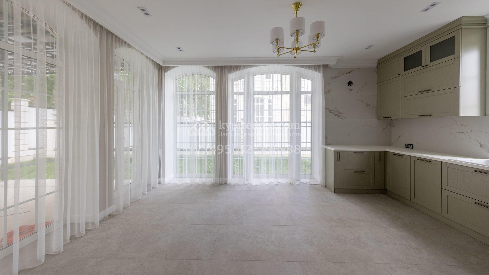 Загородный дом площадью 222 м² построен на уютном полевом участке 5,5 сотки. Фасад здания выдержан в классическом французском стиле, облицован жёлто-бежевой штукатуркой, а также декорирован белыми резными элементами и подсветкой. В отделке светлого интерьера с потолками высотой 2,9 метра преобладают тёплые оттенки, установлена итальянская сантехника.