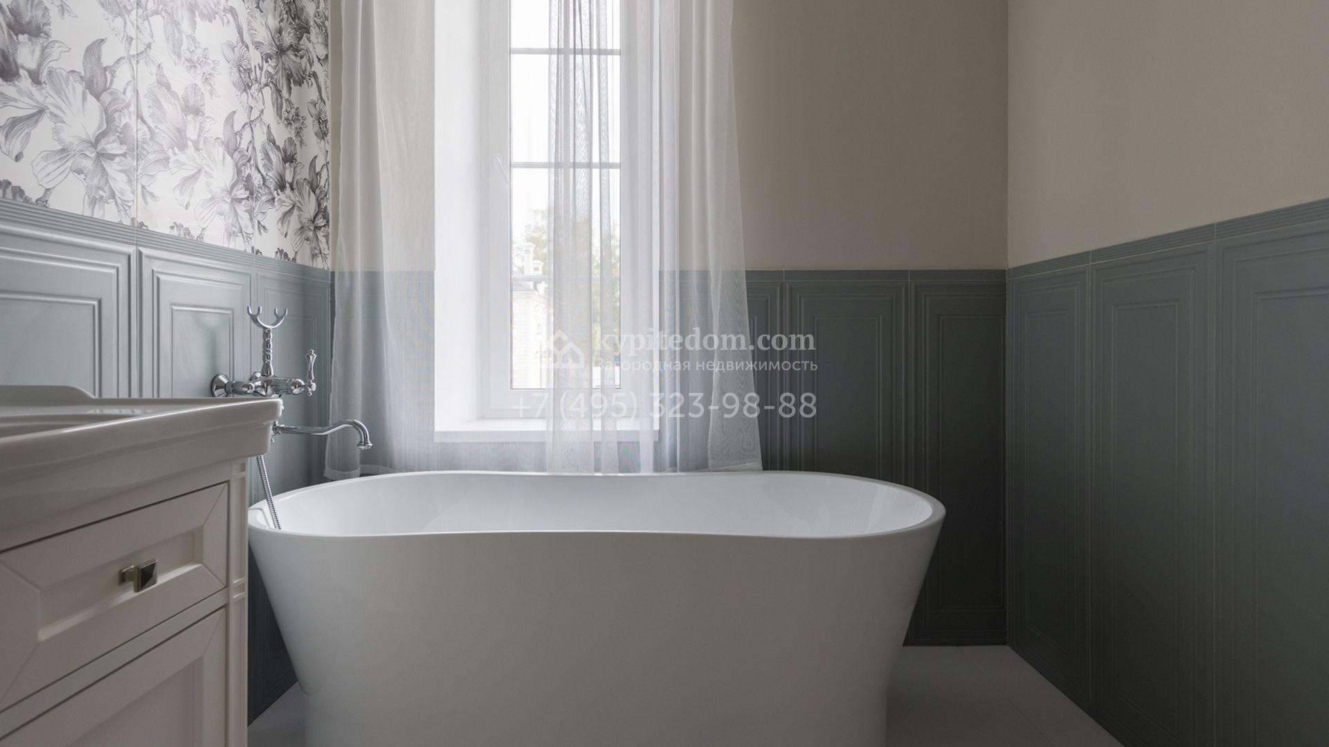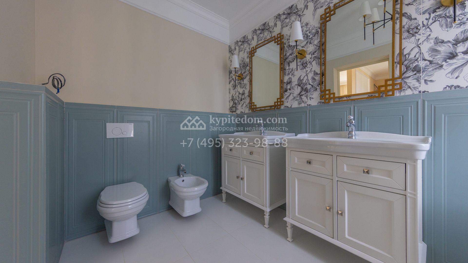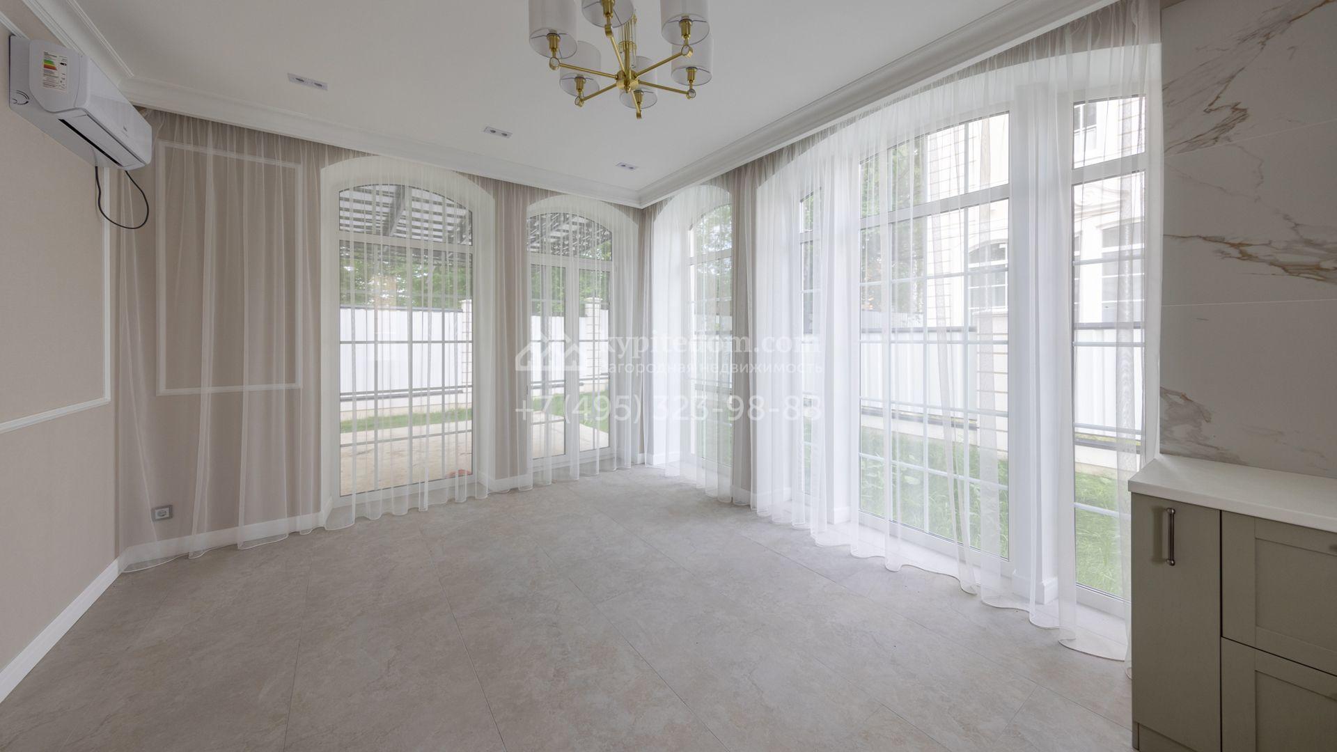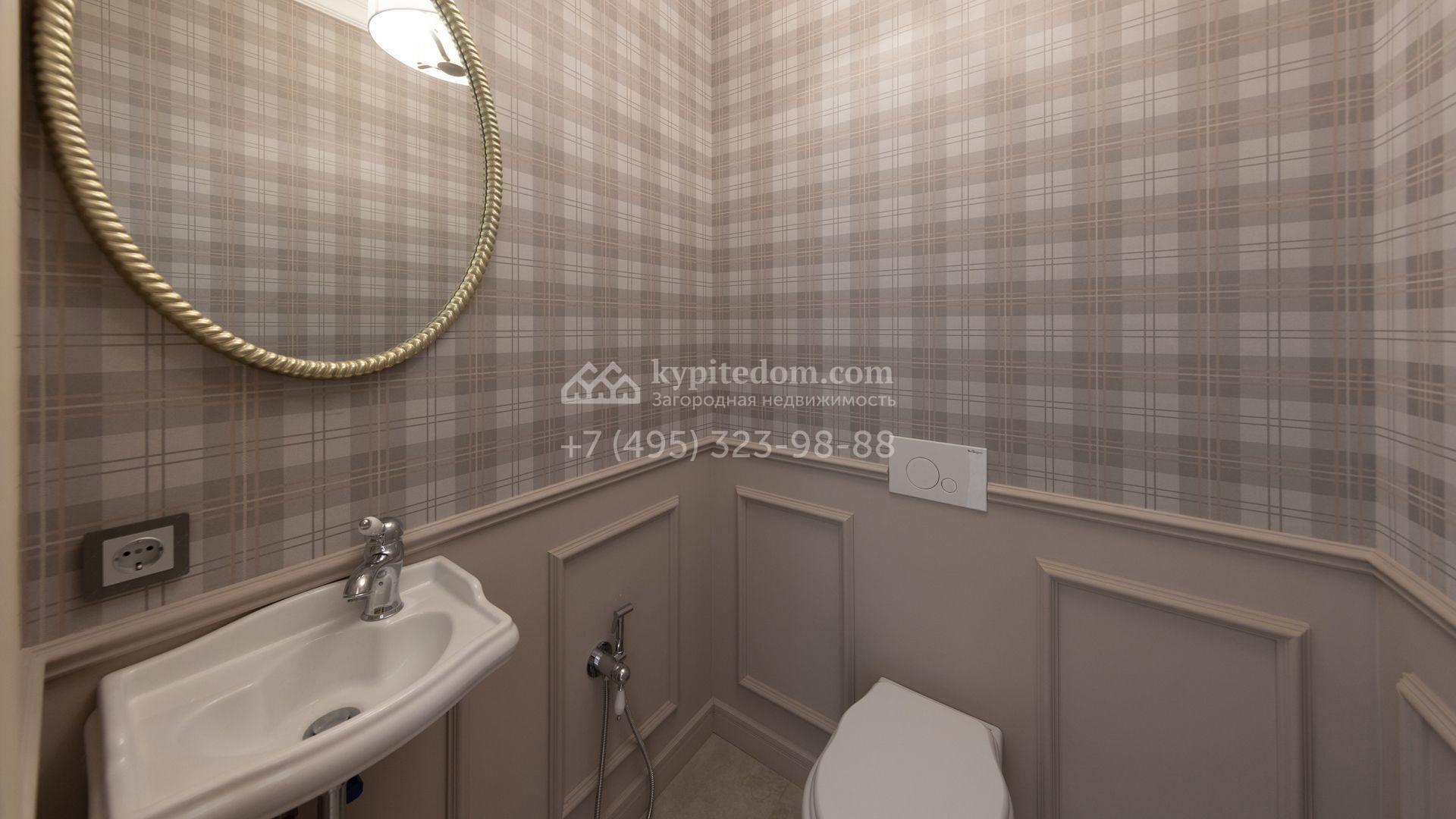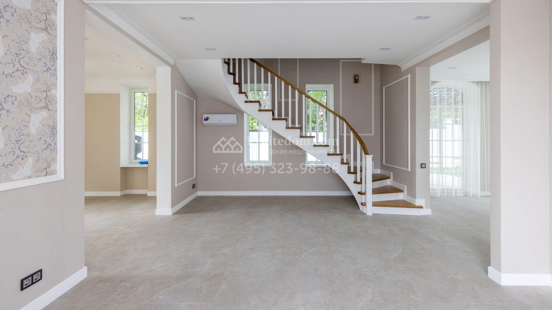 Загородный дом площадью 222 м² построен на уютном полевом участке 5,5 сотки. Фасад здания выдержан в классическом французском стиле, облицован жёлто-бежевой штукатуркой, а также декорирован белыми резными элементами и подсветкой. В отделке светлого интерьера с потолками высотой 2,9 метра преобладают тёплые оттенки, установлена итальянская сантехника.