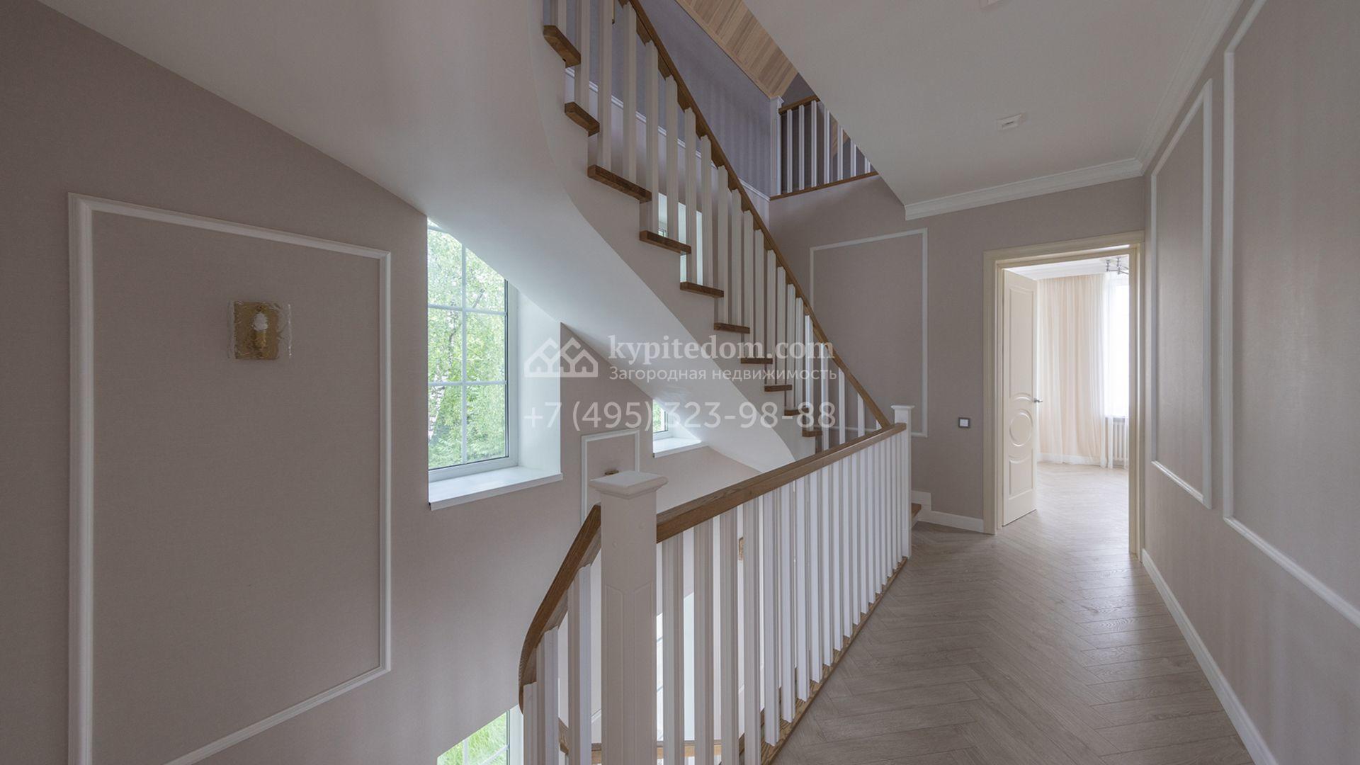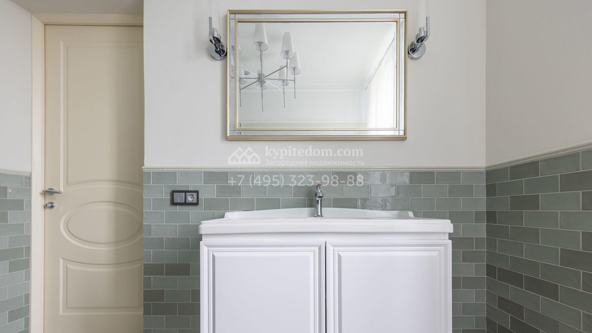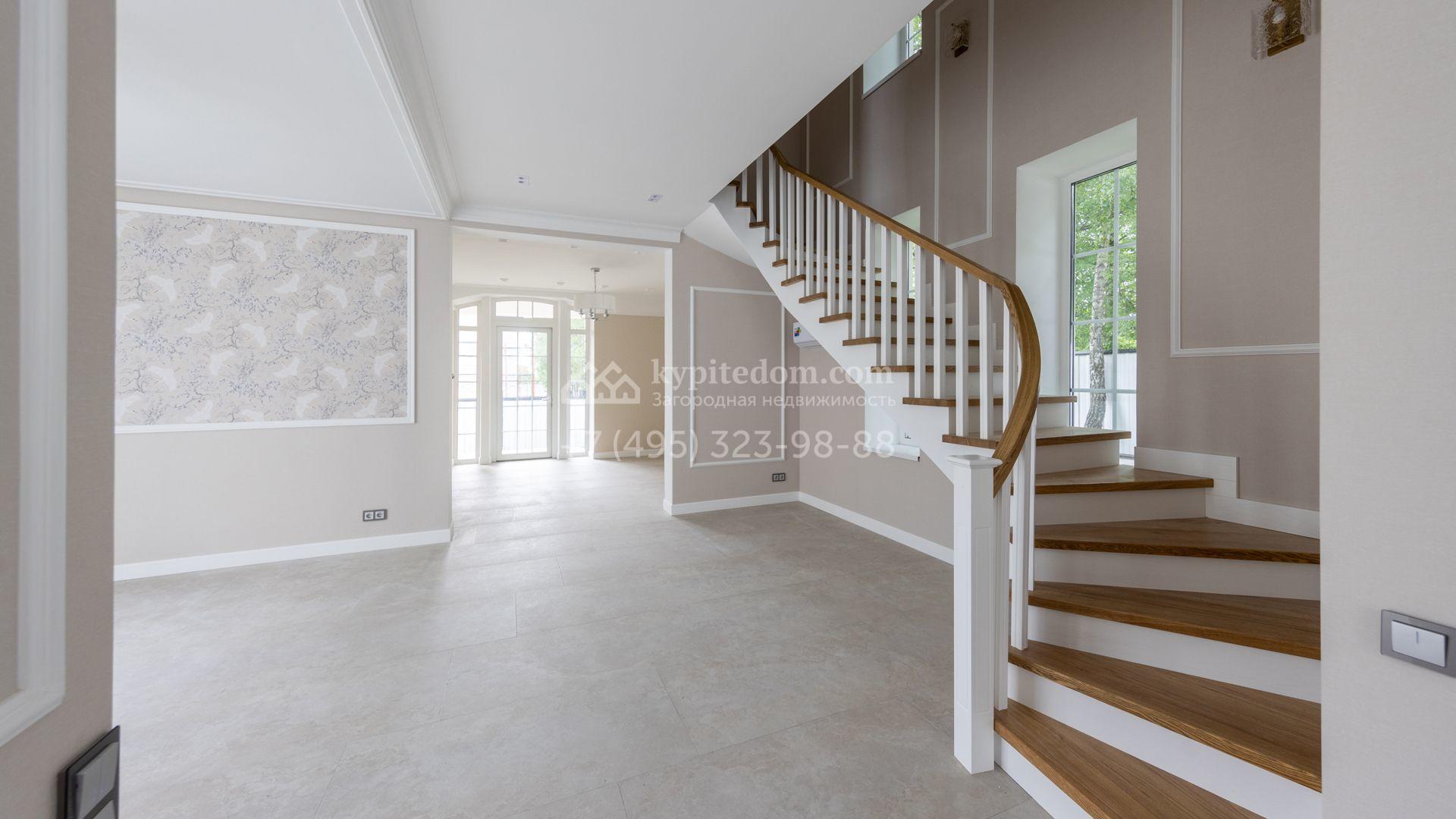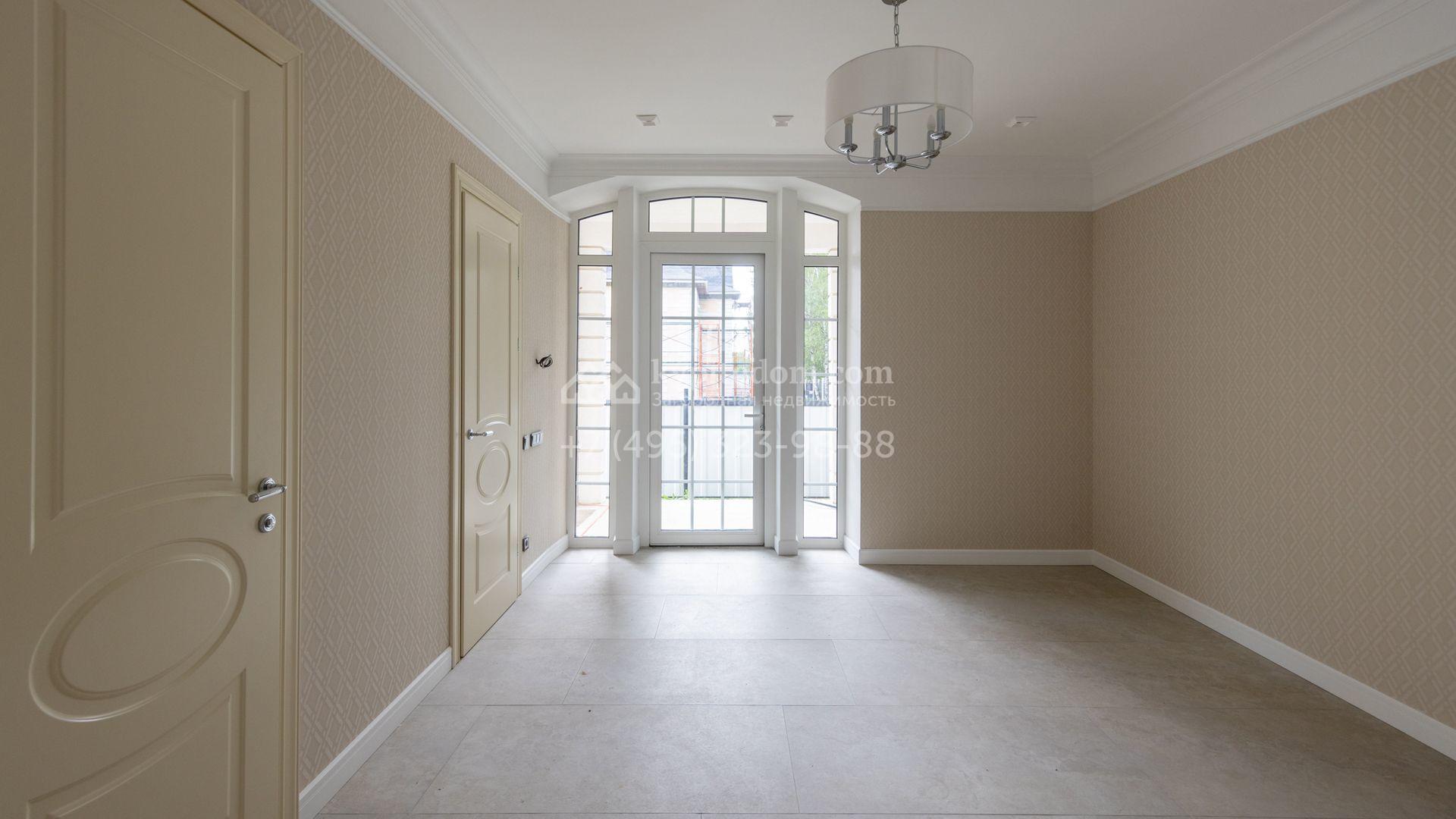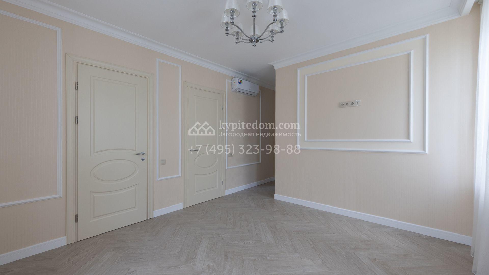 Загородный дом площадью 222 м² построен на уютном полевом участке 5,5 сотки. Фасад здания выдержан в классическом французском стиле, облицован жёлто-бежевой штукатуркой, а также декорирован белыми резными элементами и подсветкой. В отделке светлого интерьера с потолками высотой 2,9 метра преобладают тёплые оттенки, установлена итальянская сантехника.