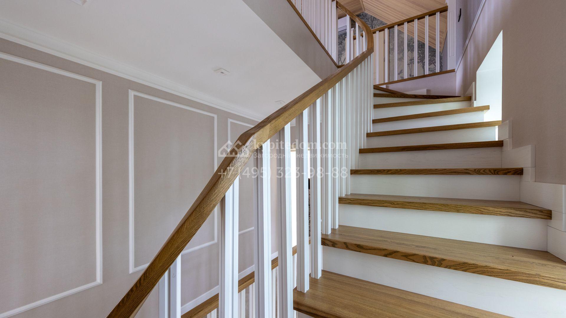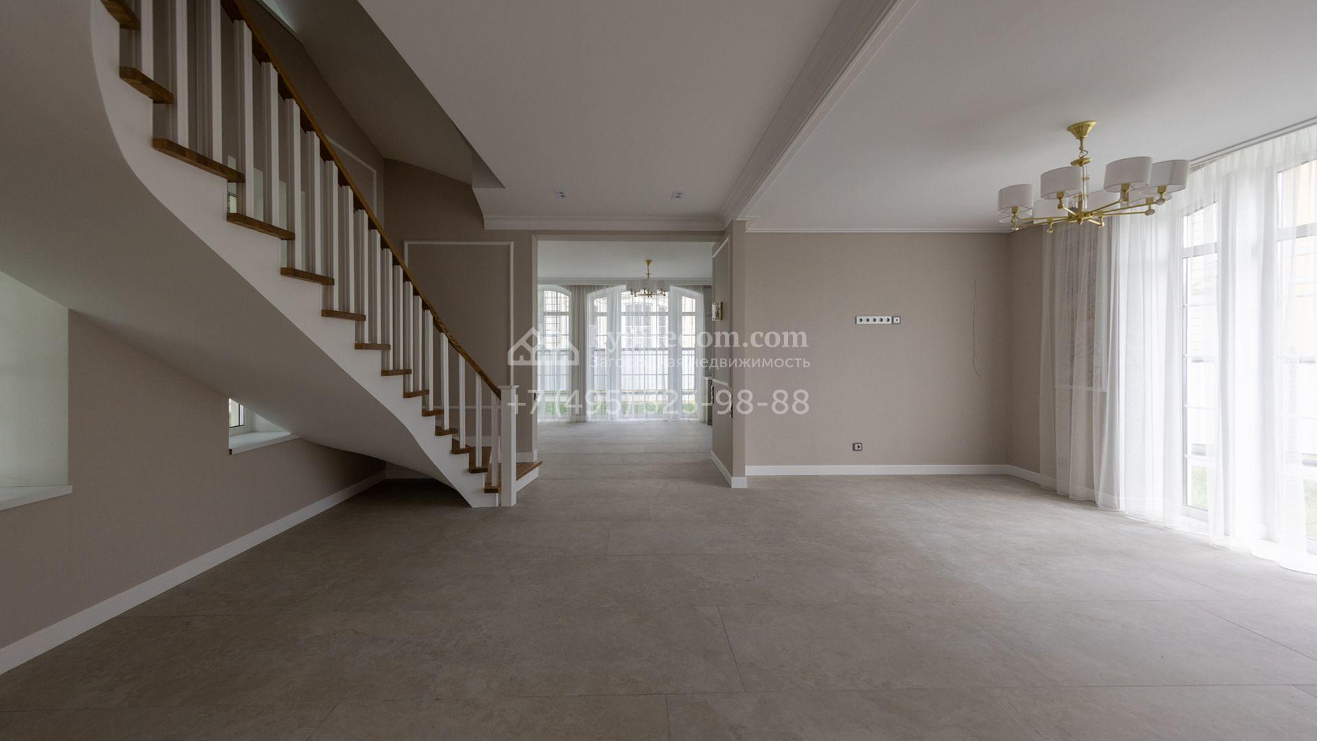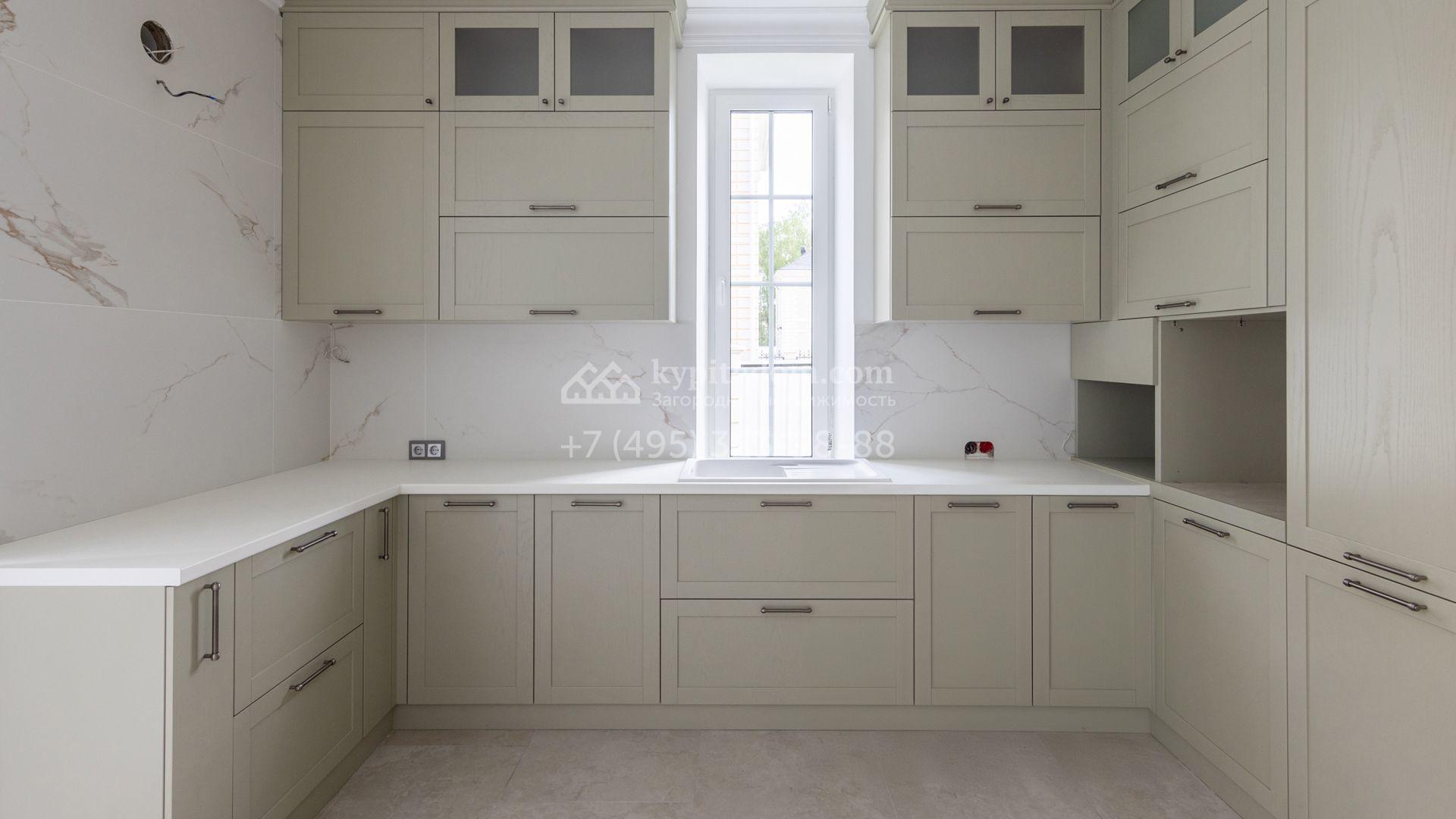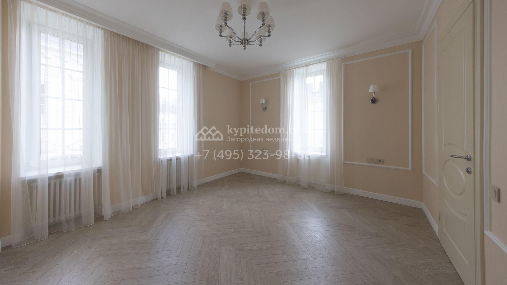 Загородный дом площадью 222 м² построен на уютном полевом участке 5,5 сотки. Фасад здания выдержан в классическом французском стиле, облицован жёлто-бежевой штукатуркой, а также декорирован белыми резными элементами и подсветкой. В отделке светлого интерьера с потолками высотой 2,9 метра преобладают тёплые оттенки, установлена итальянская сантехника.