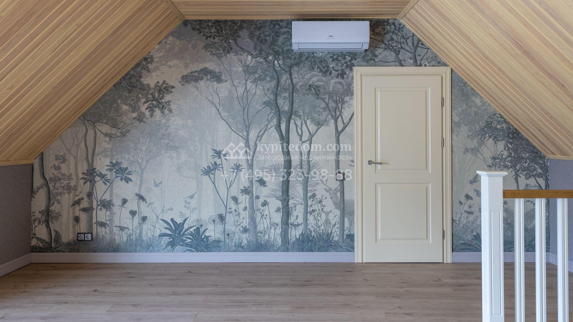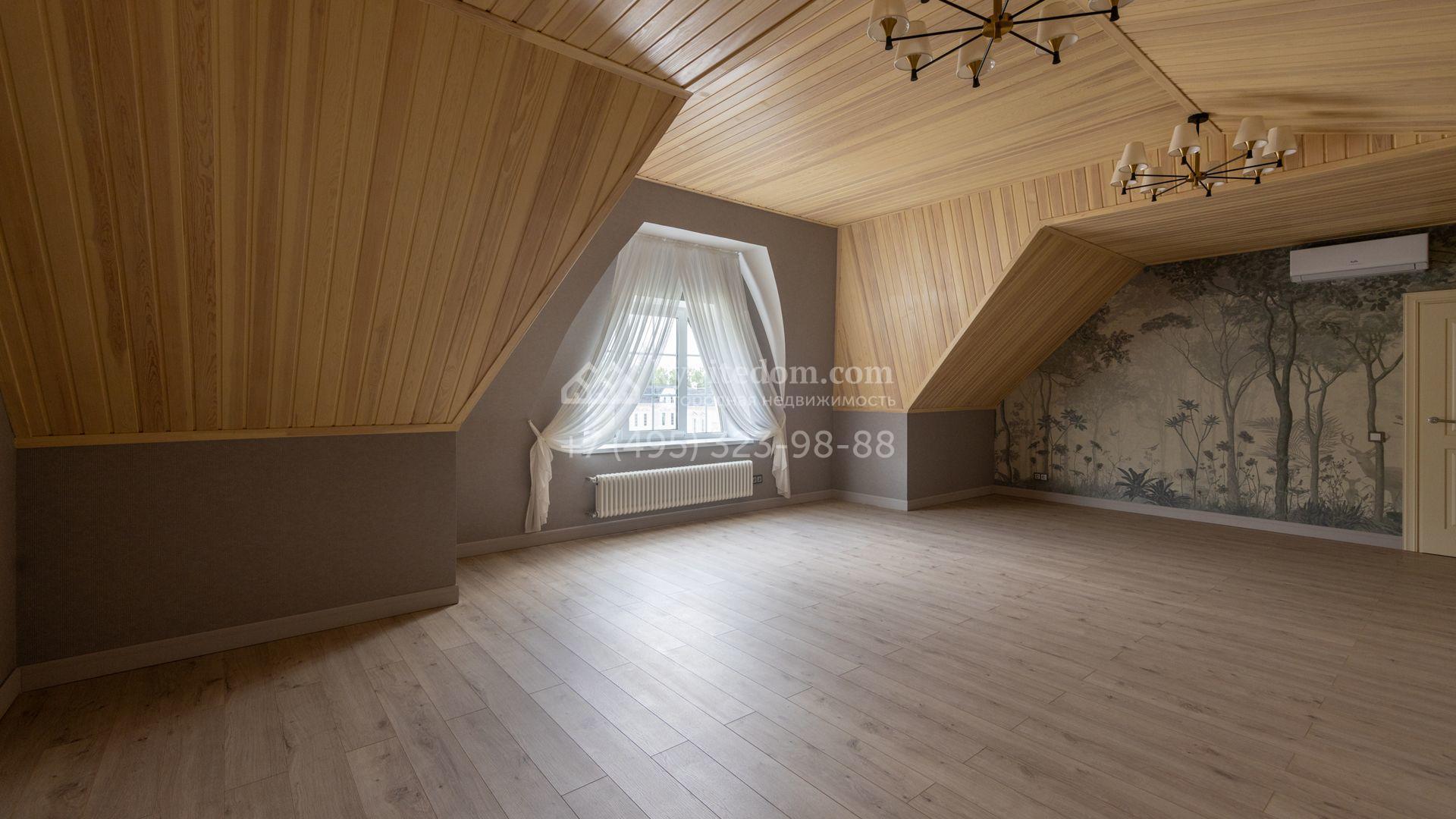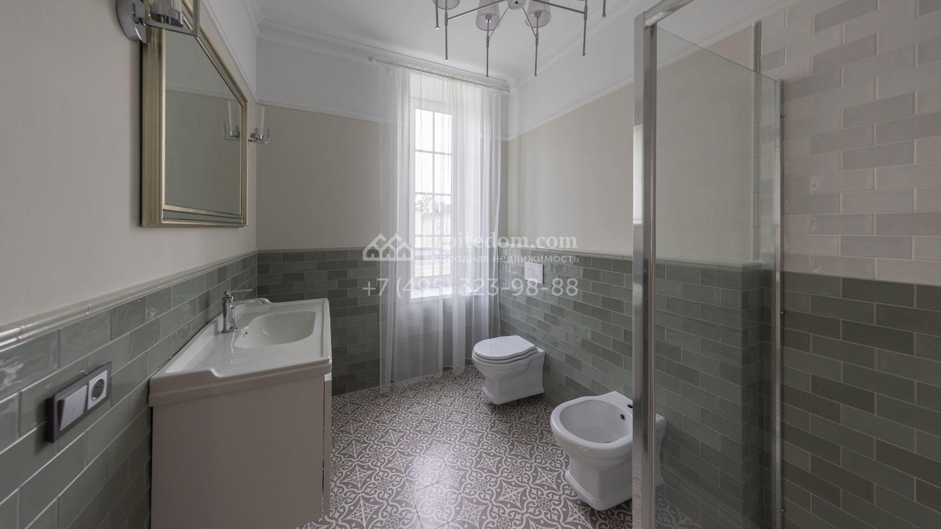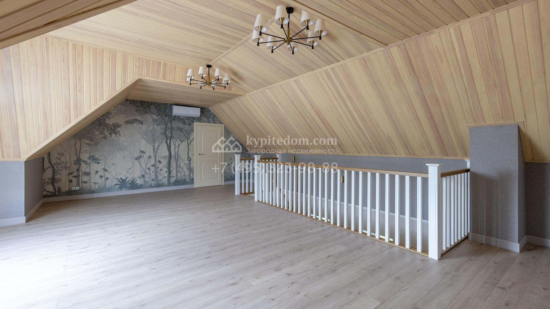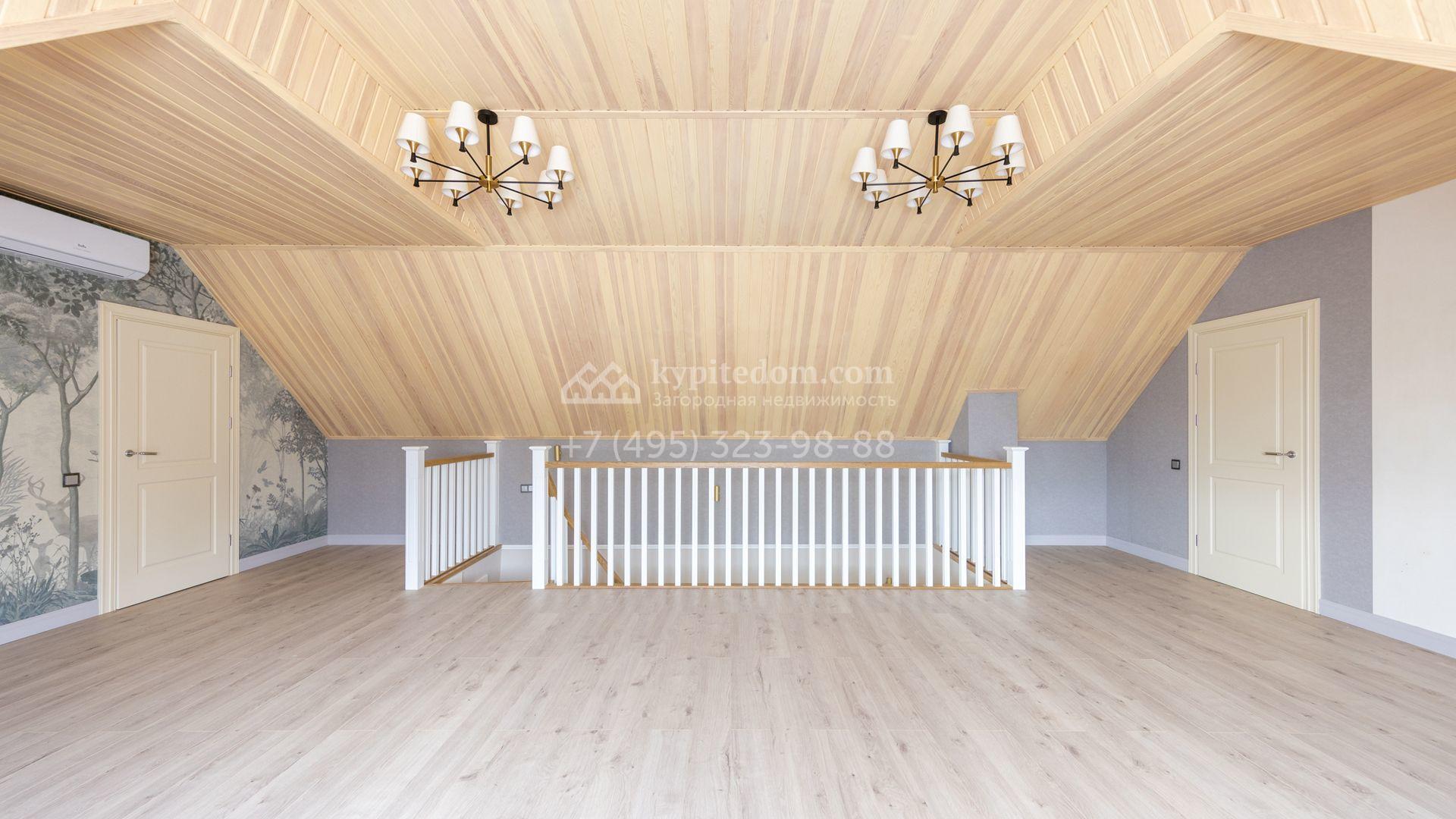 Загородный дом площадью 222 м² построен на уютном полевом участке 5,5 сотки. Фасад здания выдержан в классическом французском стиле, облицован жёлто-бежевой штукатуркой, а также декорирован белыми резными элементами и подсветкой. В отделке светлого интерьера с потолками высотой 2,9 метра преобладают тёплые оттенки, установлена итальянская сантехника.
