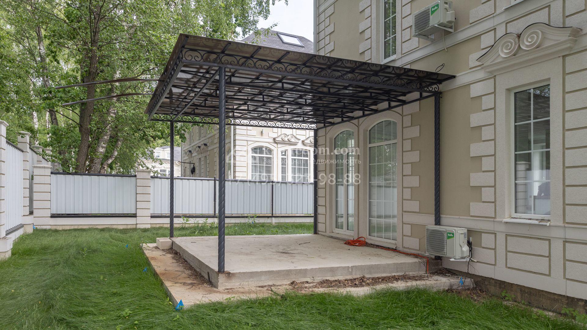Планировка включает две спальни с гардеробными и санузлами, гостиную, кухню, укомплектованную гарнитуром с фасадами, отделанными ясеневым шпоном, кабинет и уютную террасу. Для машин предусмотрен отдельностоящий гараж. На участке уложен рулонный газон с автополивом и высажены стройные туи вдоль забора.