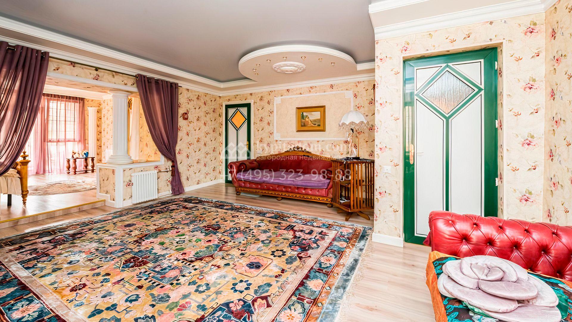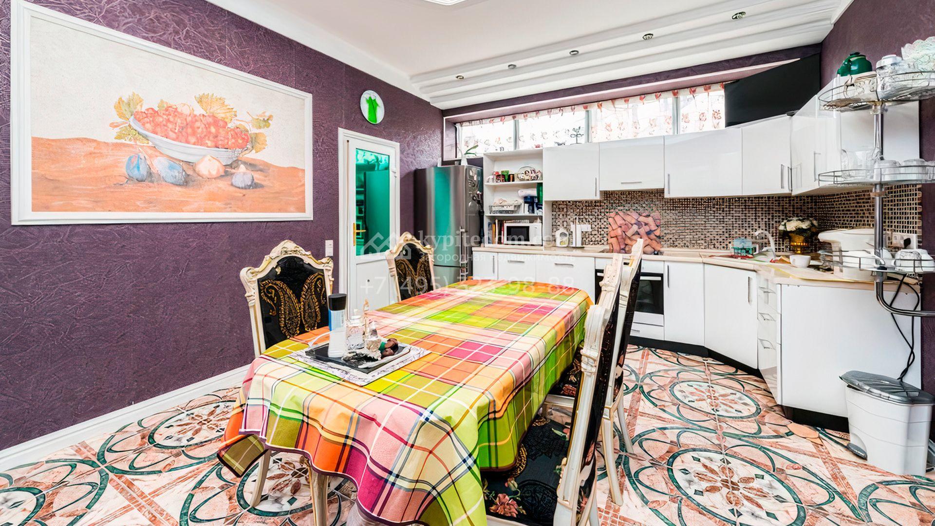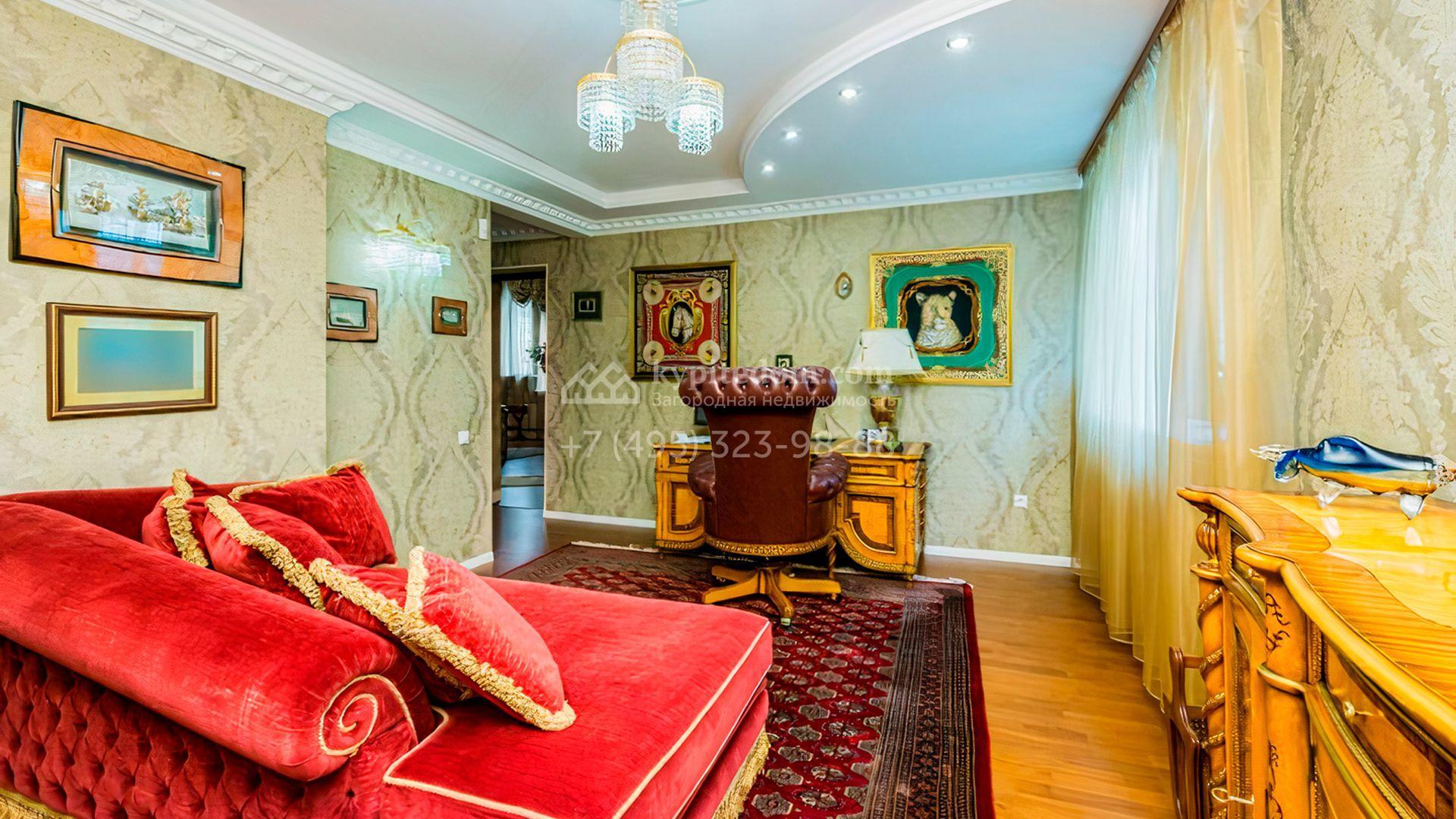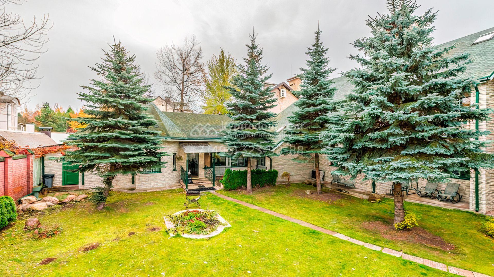 Загородная резиденция площадью 700 м² расположена на участке 12 соток. Фасад выполнен из кирпича и облицован под светлый камень, декорирован балясинами и зелеными коваными элементами. Интерьер оформлен в теплых тонах с добавлением ярких цветовых акцентов. В доме расположили просторную гостиную с камином и вторым светом, 4 спальни, кабинет, кухню, столовую, SPA-зону с сауной и массажным кабинетом. К дому пристроен гараж на 2 машины, над которым предусмотрен блок для персонала с отдельным входом. На участке выполнен ландшафтный дизайн, вымощены дорожки, растут хвойные деревья.