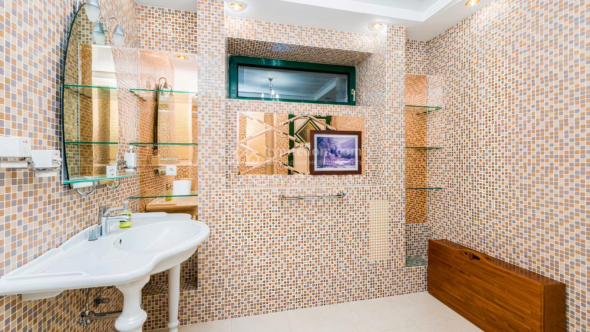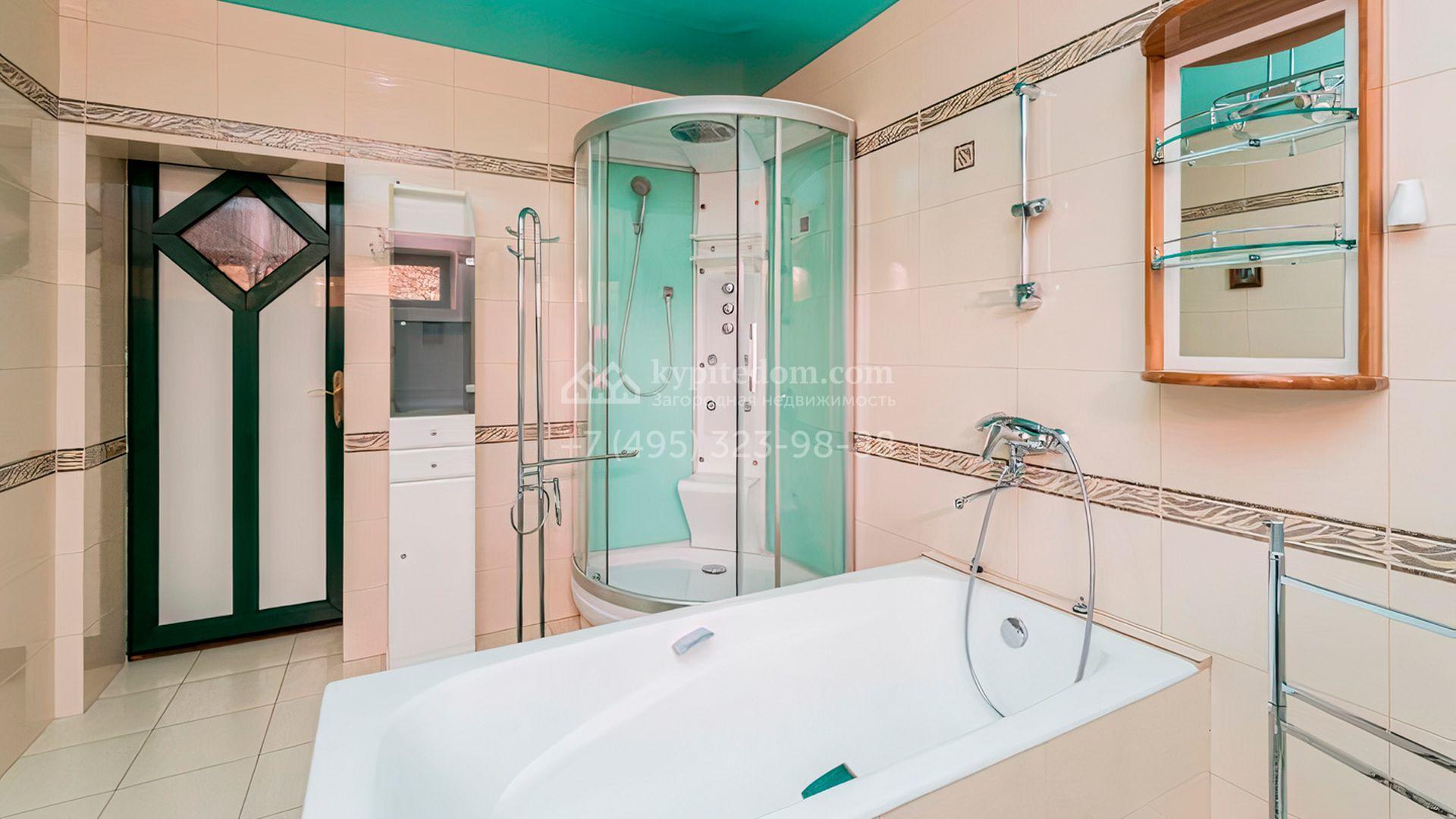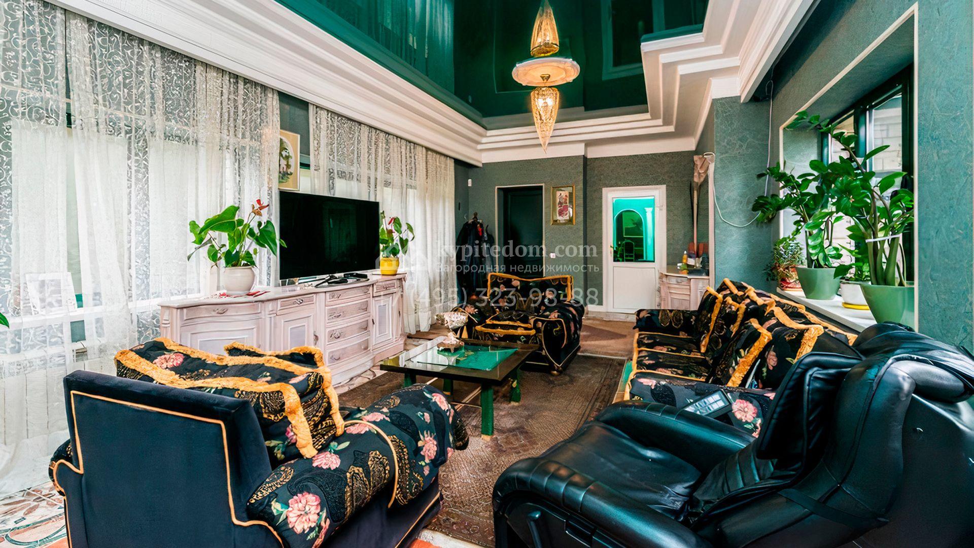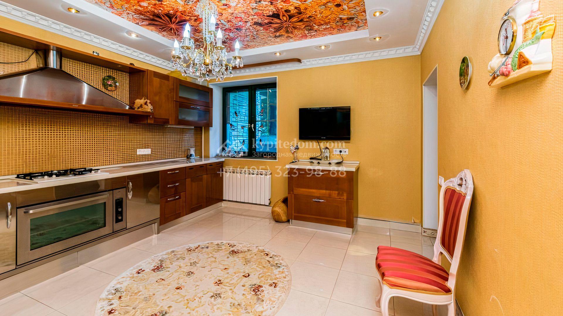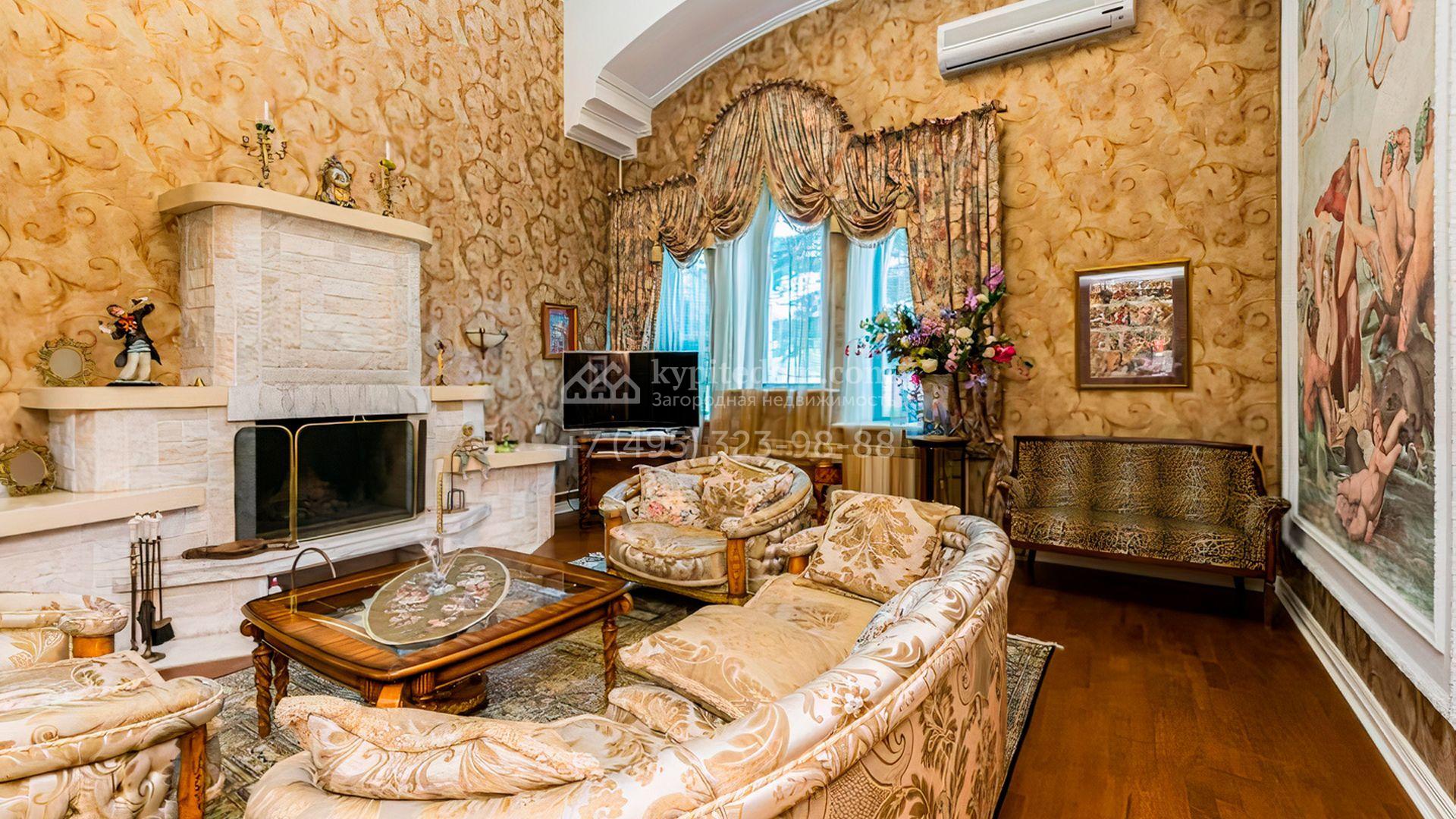 Загородная резиденция площадью 700 м² расположена на участке 12 соток. Фасад выполнен из кирпича и облицован под светлый камень, декорирован балясинами и зелеными коваными элементами. Интерьер оформлен в теплых тонах с добавлением ярких цветовых акцентов. В доме расположили просторную гостиную с камином и вторым светом, 4 спальни, кабинет, кухню, столовую, SPA-зону с сауной и массажным кабинетом. К дому пристроен гараж на 2 машины, над которым предусмотрен блок для персонала с отдельным входом. На участке выполнен ландшафтный дизайн, вымощены дорожки, растут хвойные деревья.