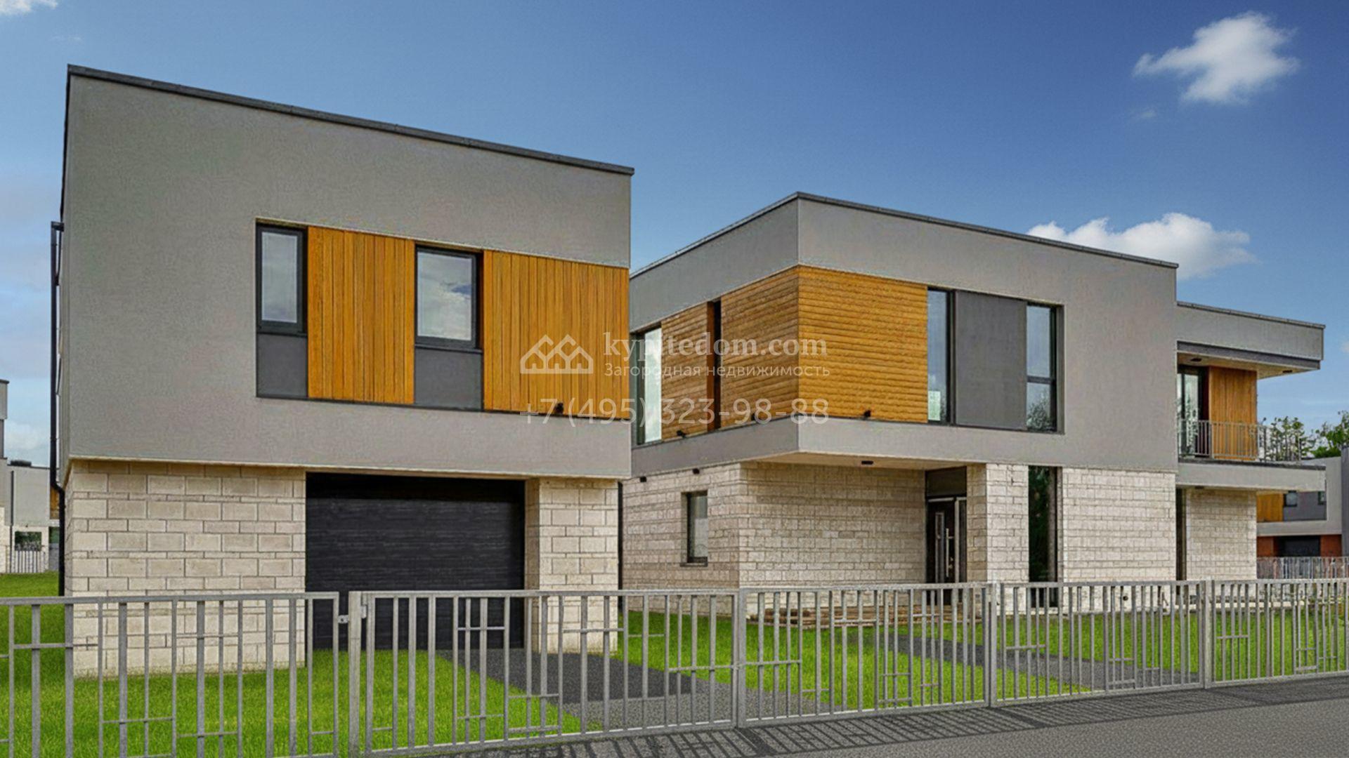 Загородный дом площадью 363 м² построен на полевом участке 11,2 соток. Фасад выполнен в современном стиле и облицован белой штукатуркой, клинкерной плиткой и декорирован вставками под дерево. Коттедж представлен без отделки, что позволяет реализовать индивидуальный дизайн-проект. Участок с газоном окружен изгородью.