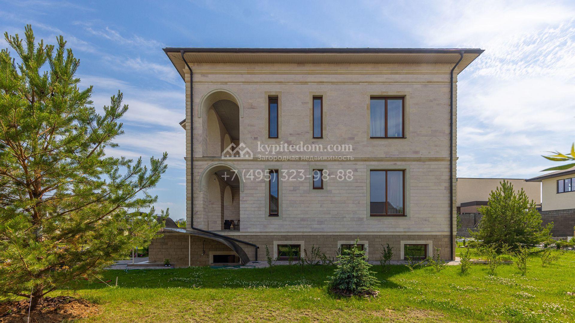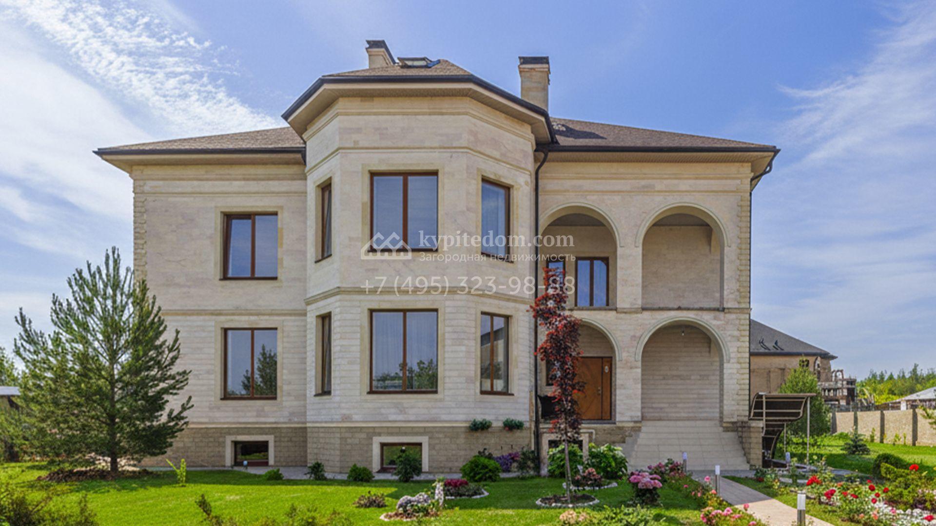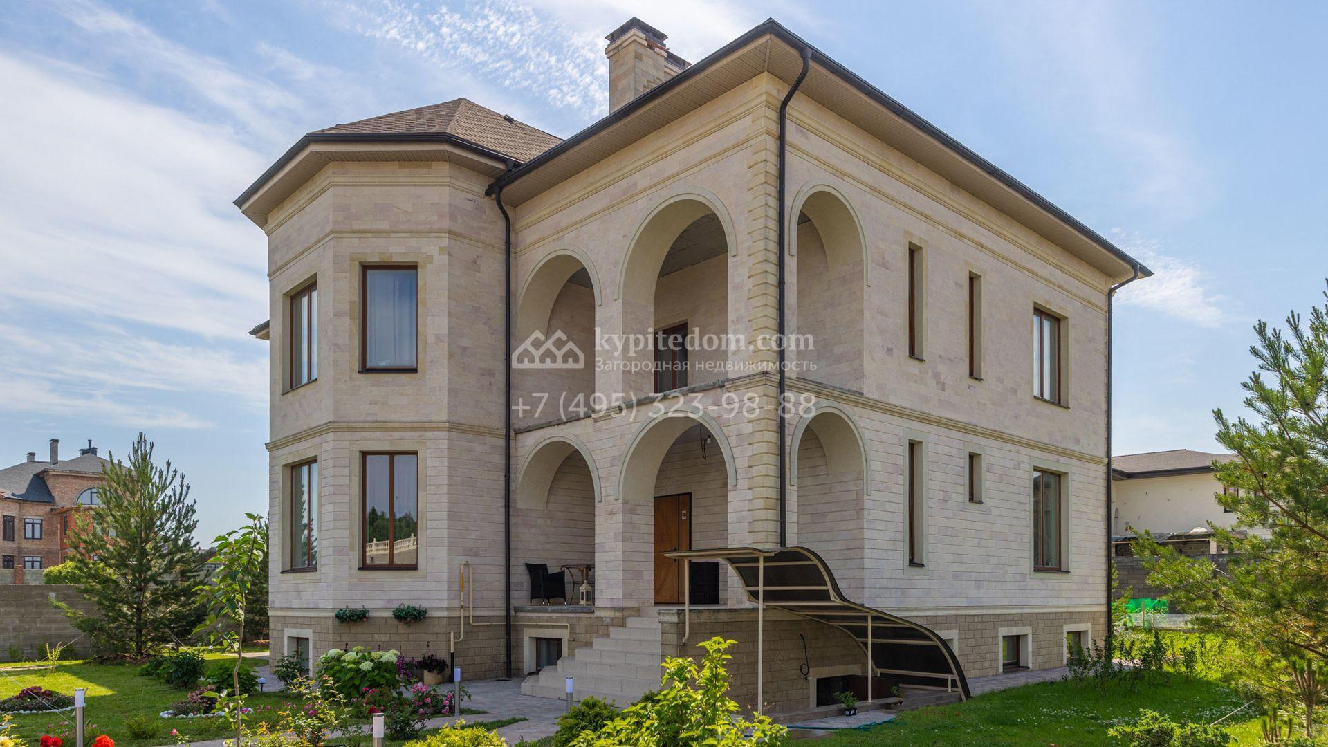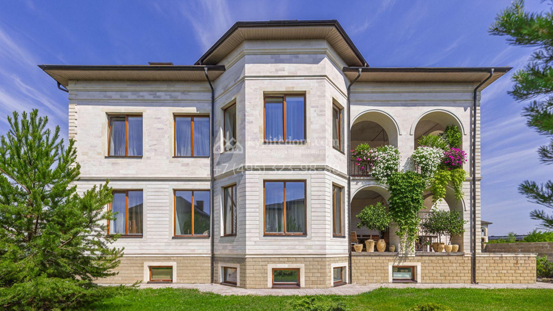 Загородный дом площадью 750 м² построен на полевом участке 21 сотка. Фасад в европейском стиле отделан камнем бежевого цвета и декорирован арками. Интерьер оформлен в светлых тёплых оттенках. В коттедже разместили пять спален, гостиную, каминную, кухню-столовую с верандой, кабинет, зону отдыха, кинотеатр, сауну и хаммам. Предусмотрен блок для персонала с двумя спальнями и кухней. На участке с газоном и вымощенными дорожками можно обустроить беседку с зоной барбекю.