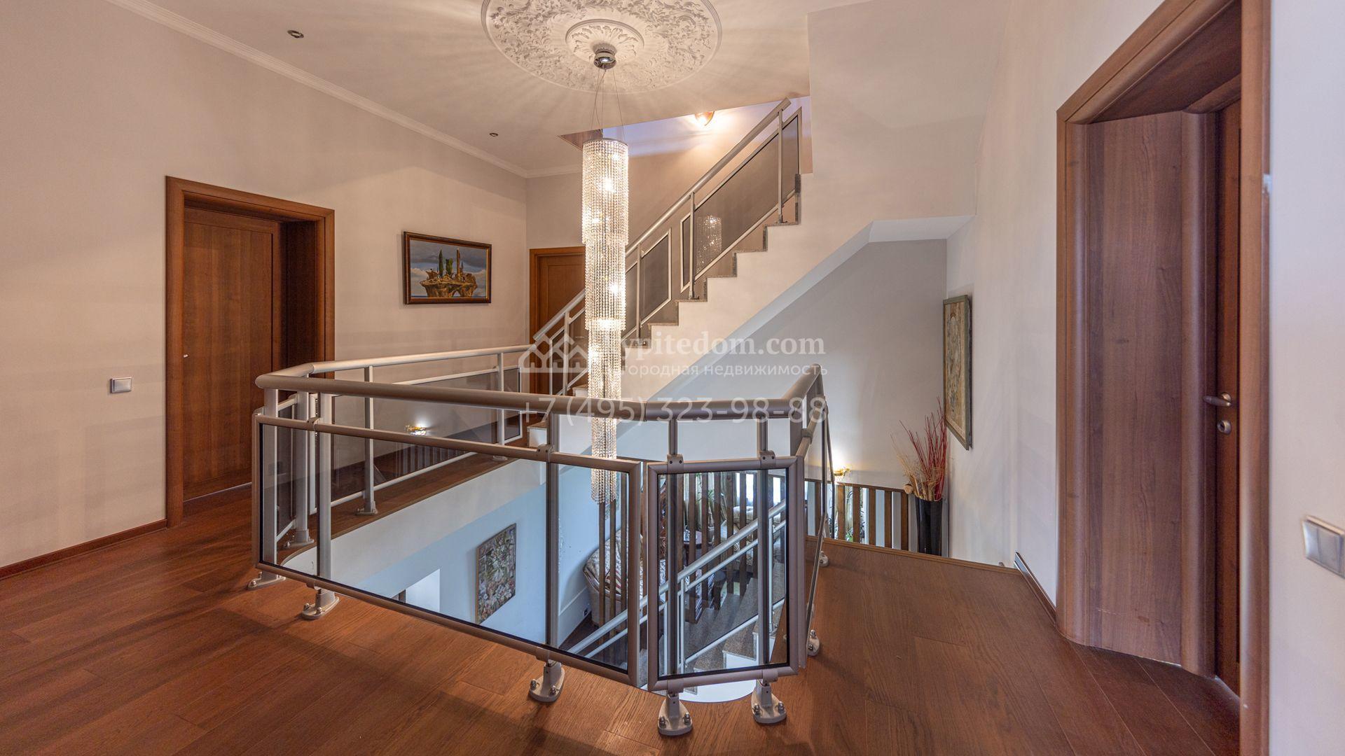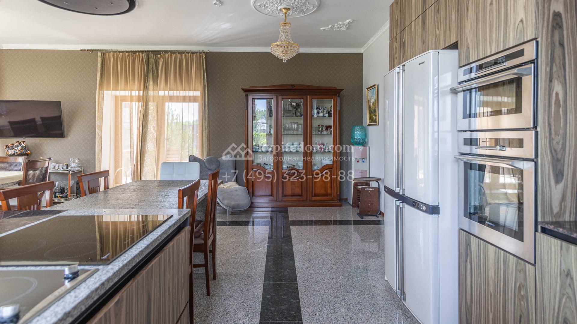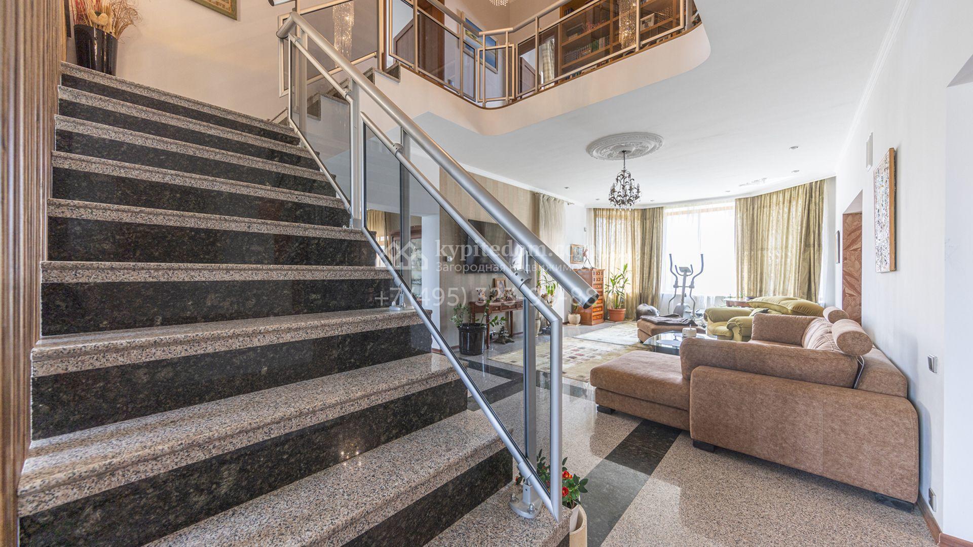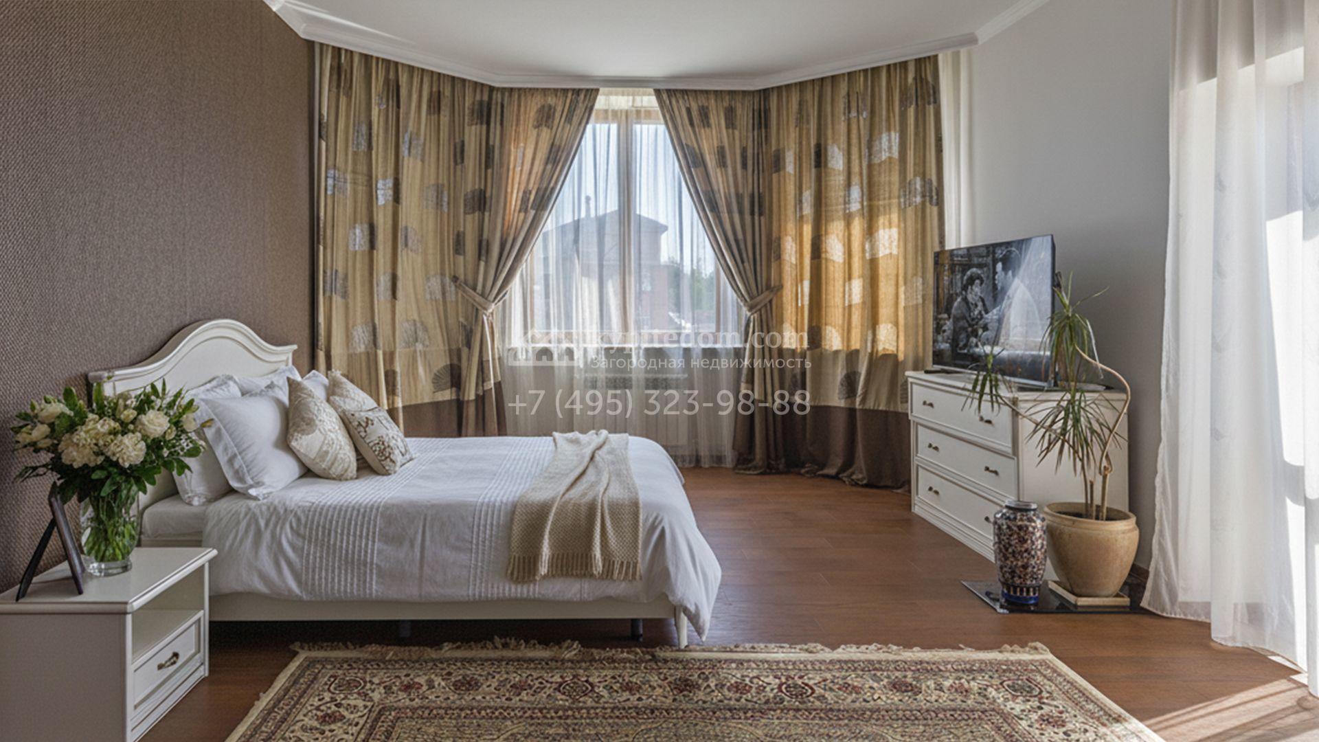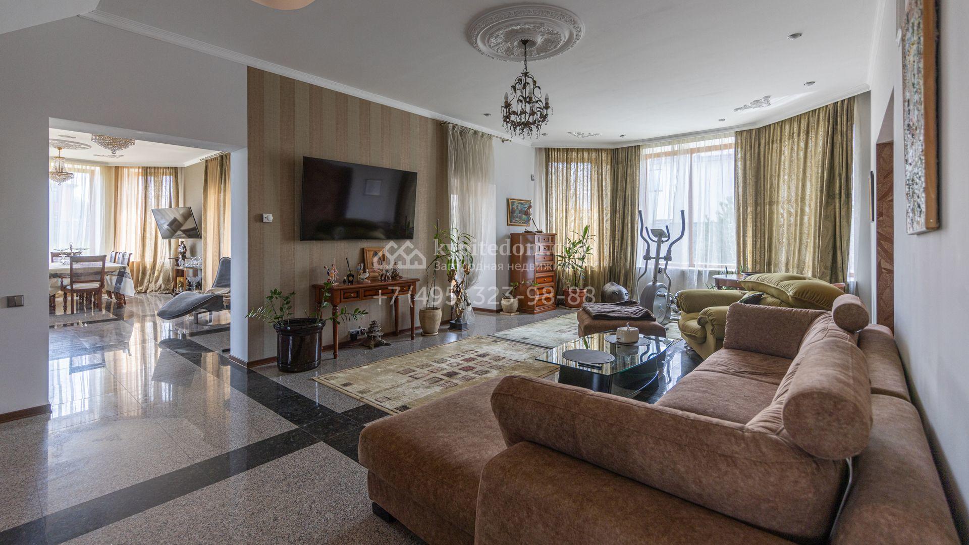 Загородный дом площадью 750 м² построен на полевом участке 21 сотка. Фасад в европейском стиле отделан камнем бежевого цвета и декорирован арками. Интерьер оформлен в светлых тёплых оттенках. В коттедже разместили пять спален, гостиную, каминную, кухню-столовую с верандой, кабинет, зону отдыха, кинотеатр, сауну и хаммам. Предусмотрен блок для персонала с двумя спальнями и кухней. На участке с газоном и вымощенными дорожками можно обустроить беседку с зоной барбекю.