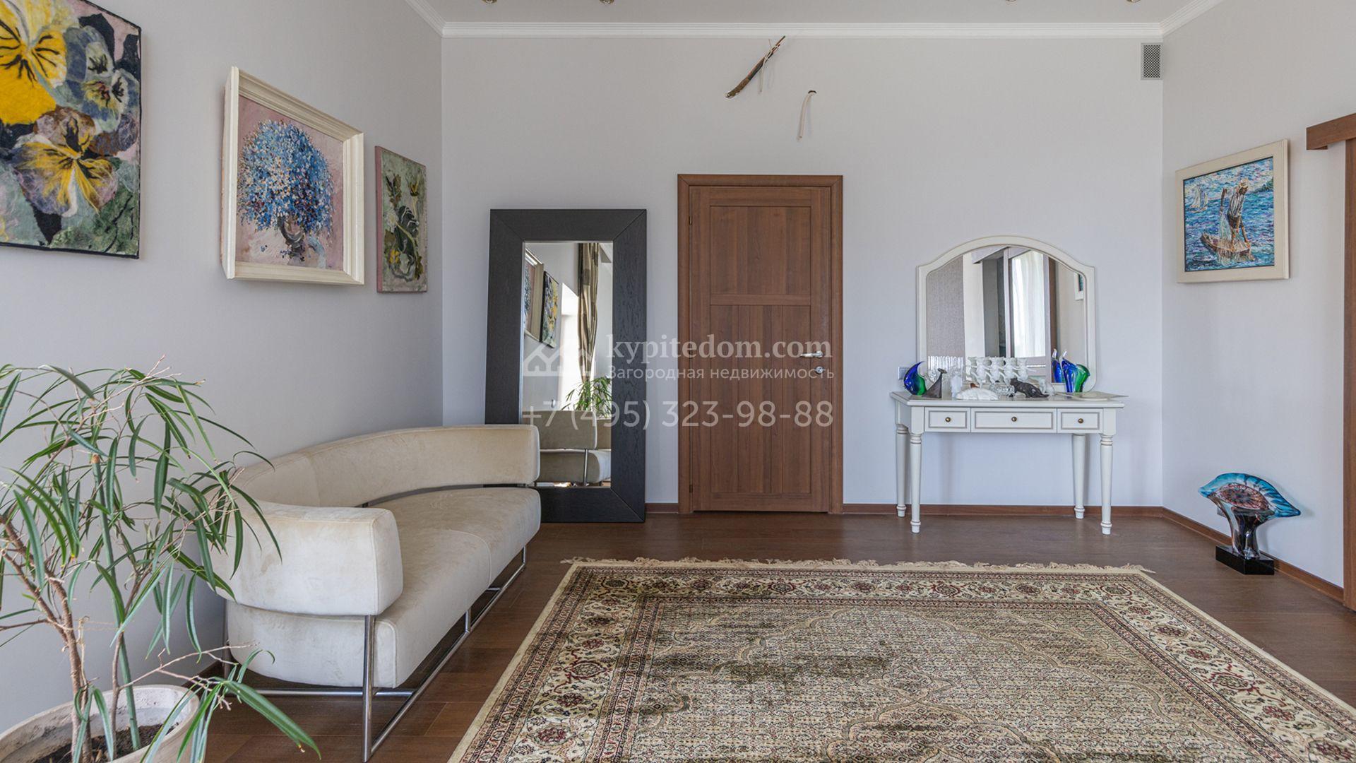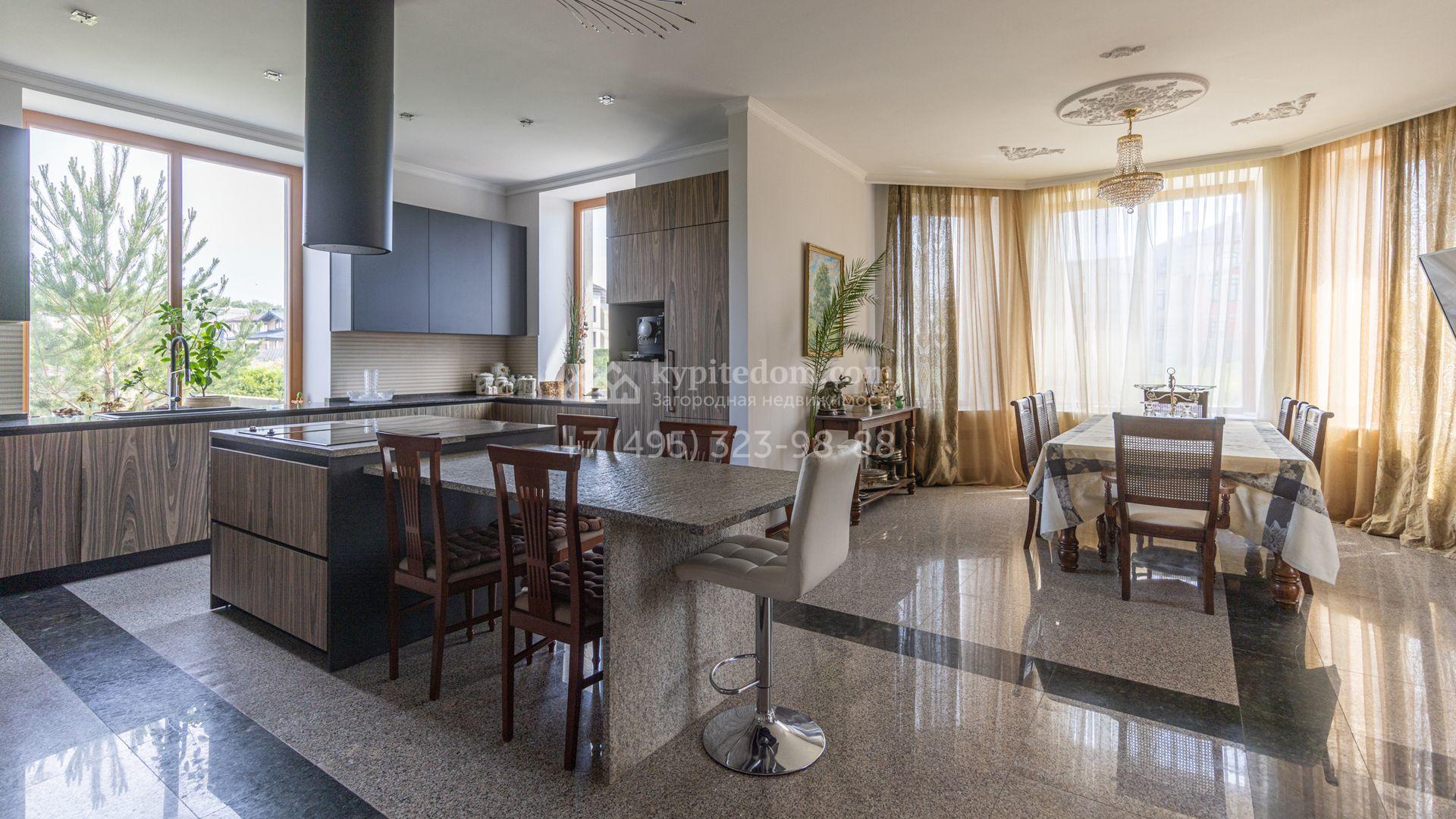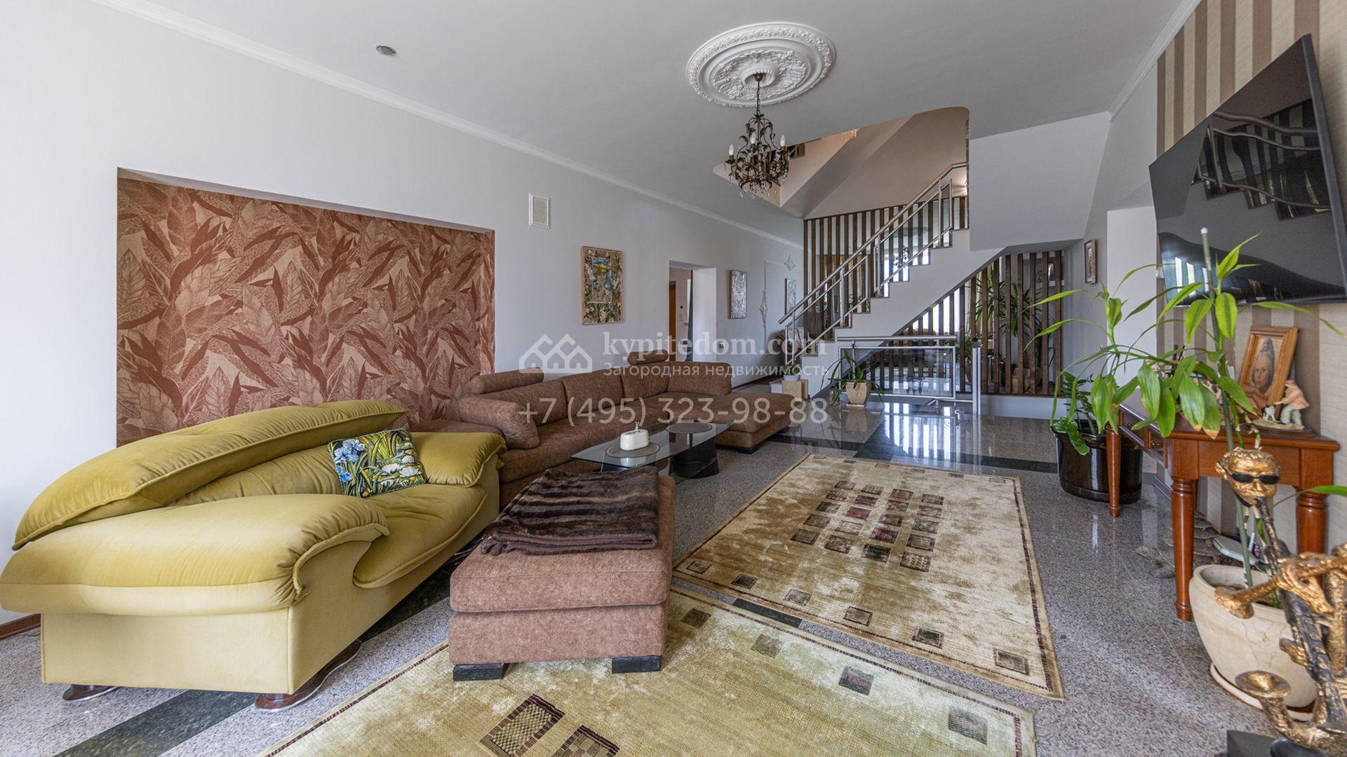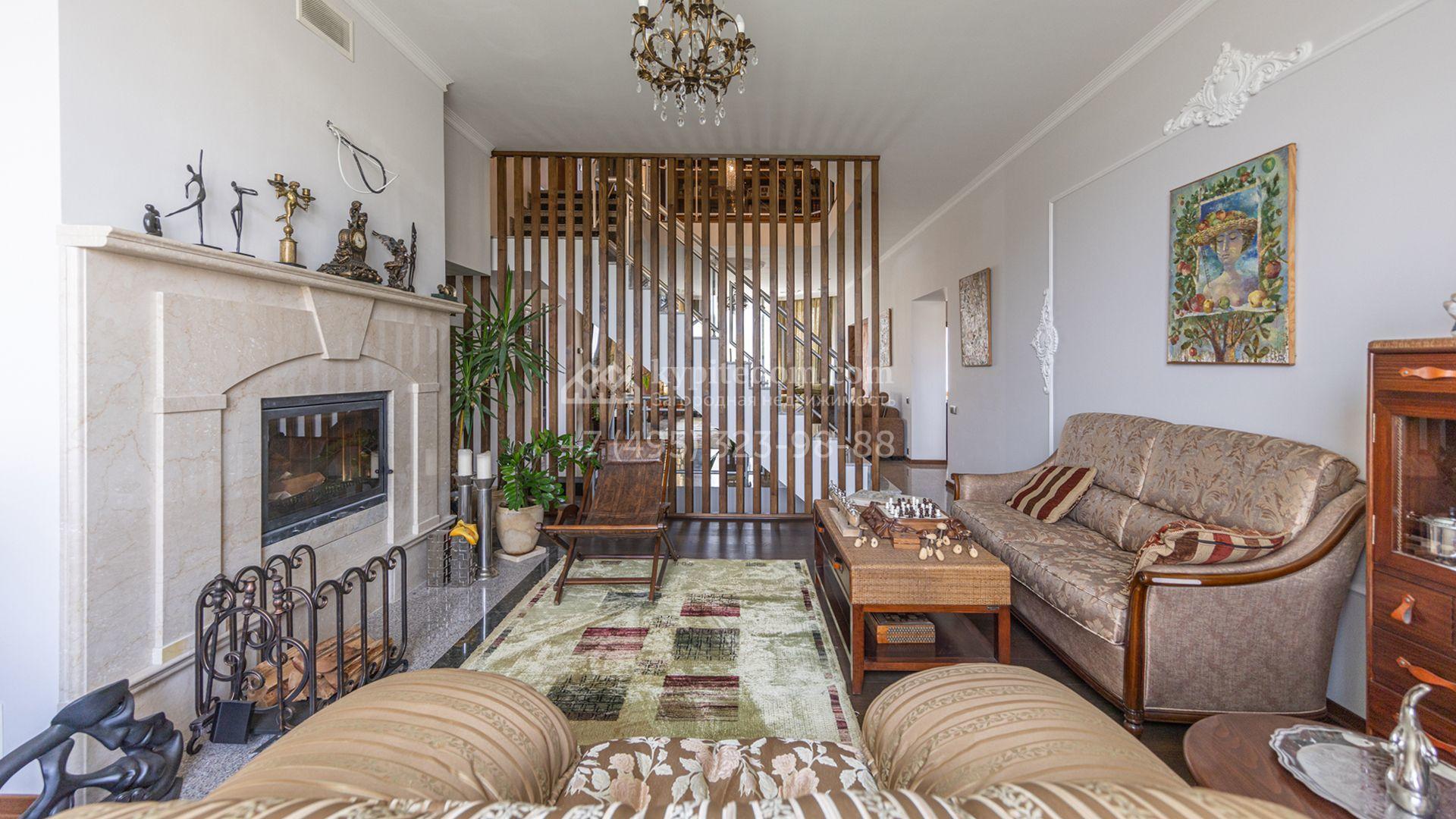 Загородный дом площадью 750 м² построен на полевом участке 21 сотка. Фасад в европейском стиле отделан камнем бежевого цвета и декорирован арками. Интерьер оформлен в светлых тёплых оттенках. В коттедже разместили пять спален, гостиную, каминную, кухню-столовую с верандой, кабинет, зону отдыха, кинотеатр, сауну и хаммам. Предусмотрен блок для персонала с двумя спальнями и кухней. На участке с газоном и вымощенными дорожками можно обустроить беседку с зоной барбекю.