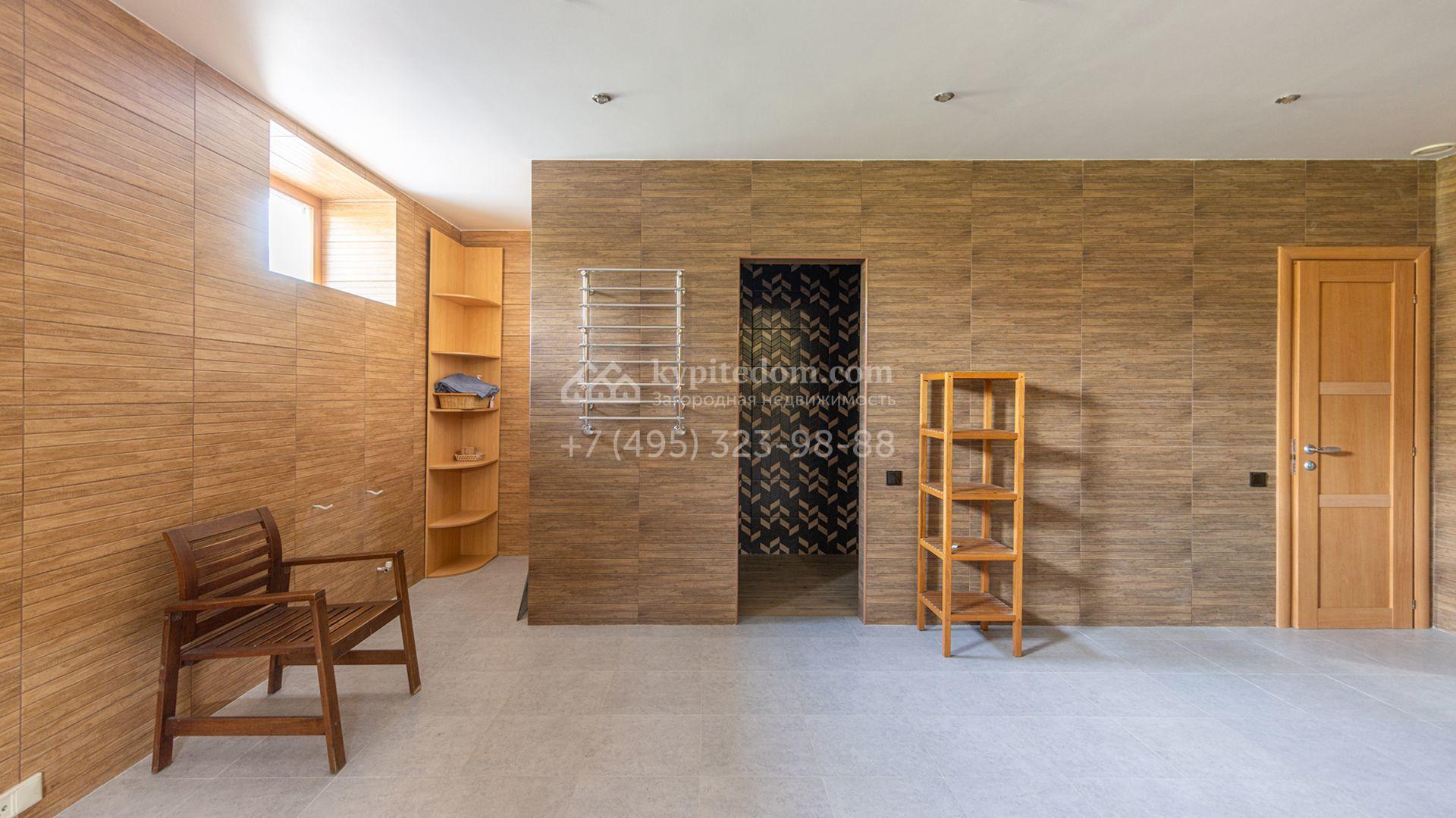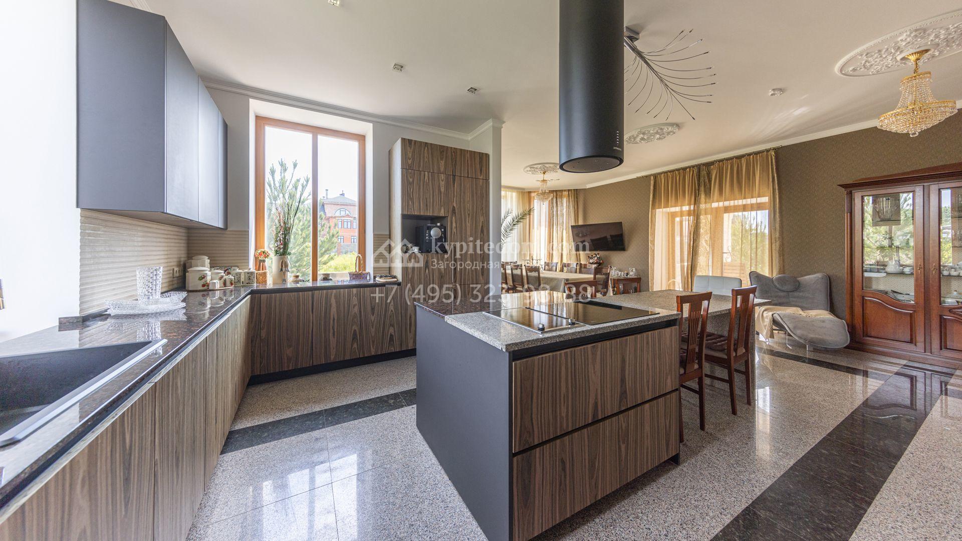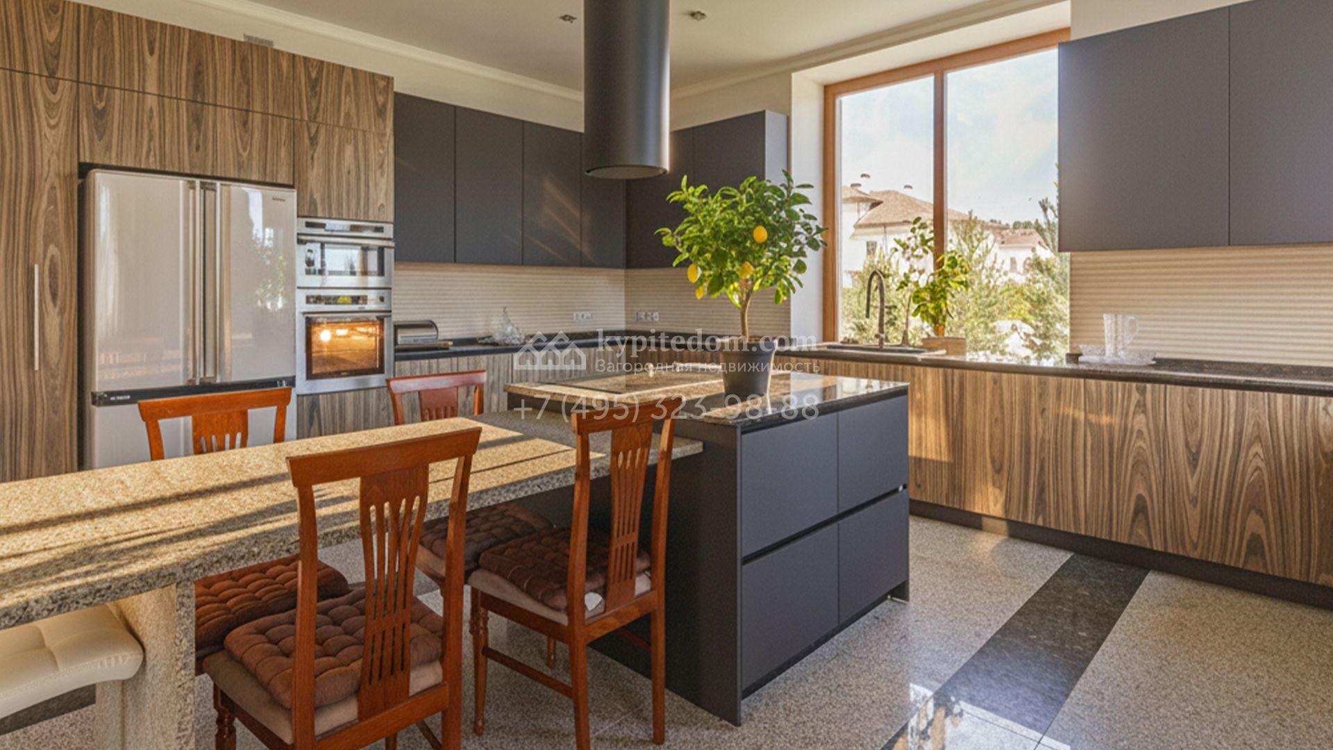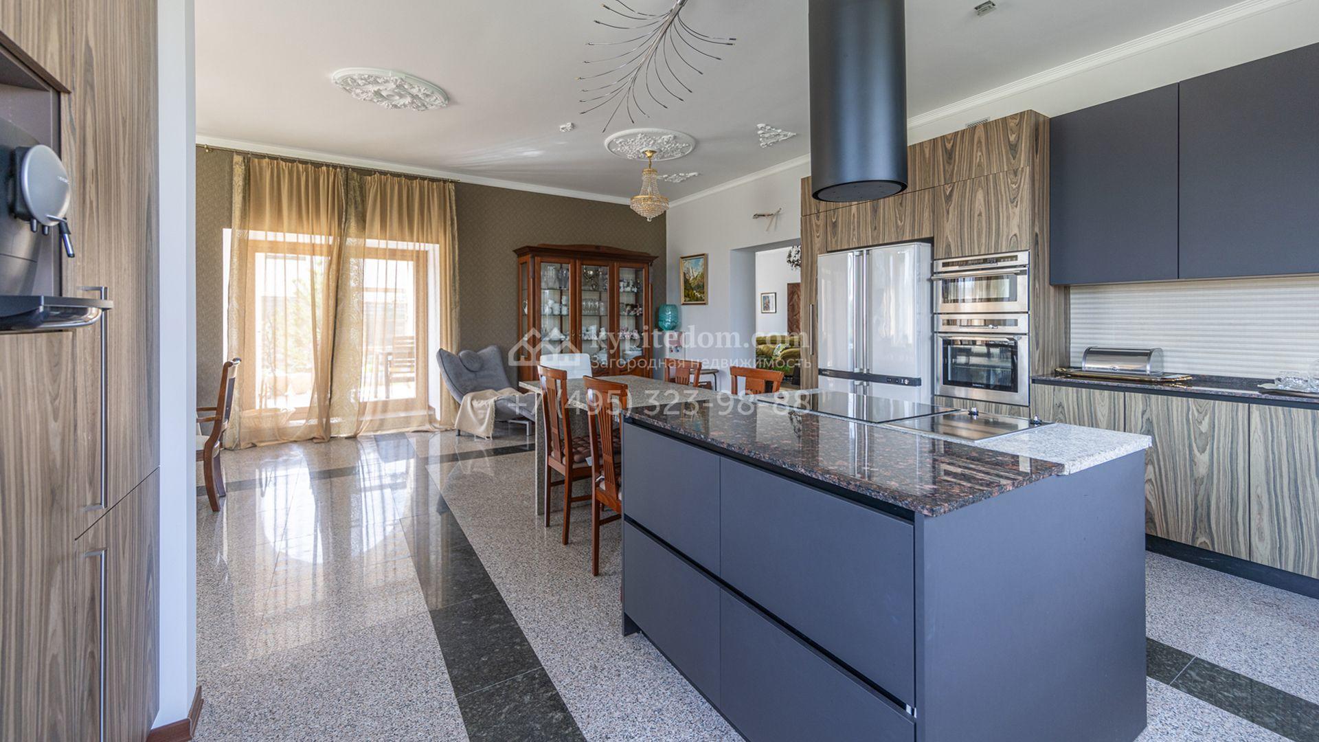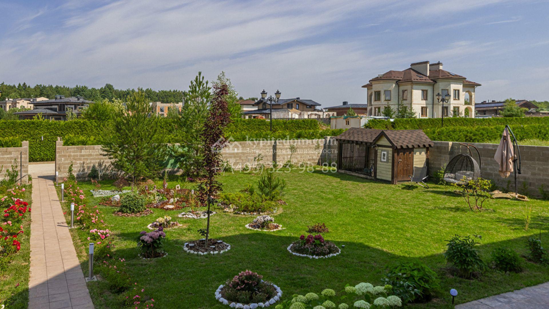 Загородный дом площадью 750 м² построен на полевом участке 21 сотка. Фасад в европейском стиле отделан камнем бежевого цвета и декорирован арками. Интерьер оформлен в светлых тёплых оттенках. В коттедже разместили пять спален, гостиную, каминную, кухню-столовую с верандой, кабинет, зону отдыха, кинотеатр, сауну и хаммам. Предусмотрен блок для персонала с двумя спальнями и кухней. На участке с газоном и вымощенными дорожками можно обустроить беседку с зоной барбекю.
