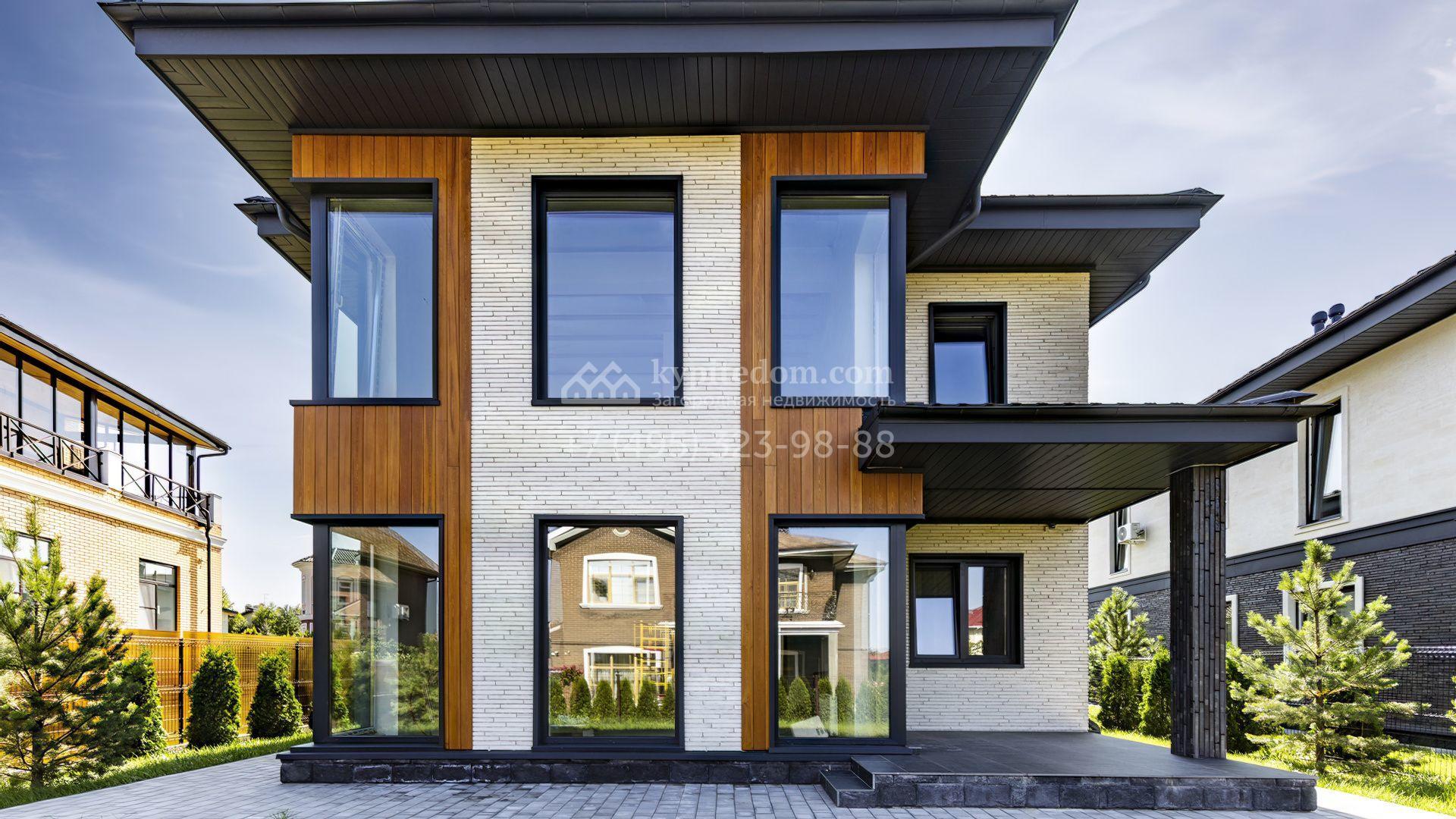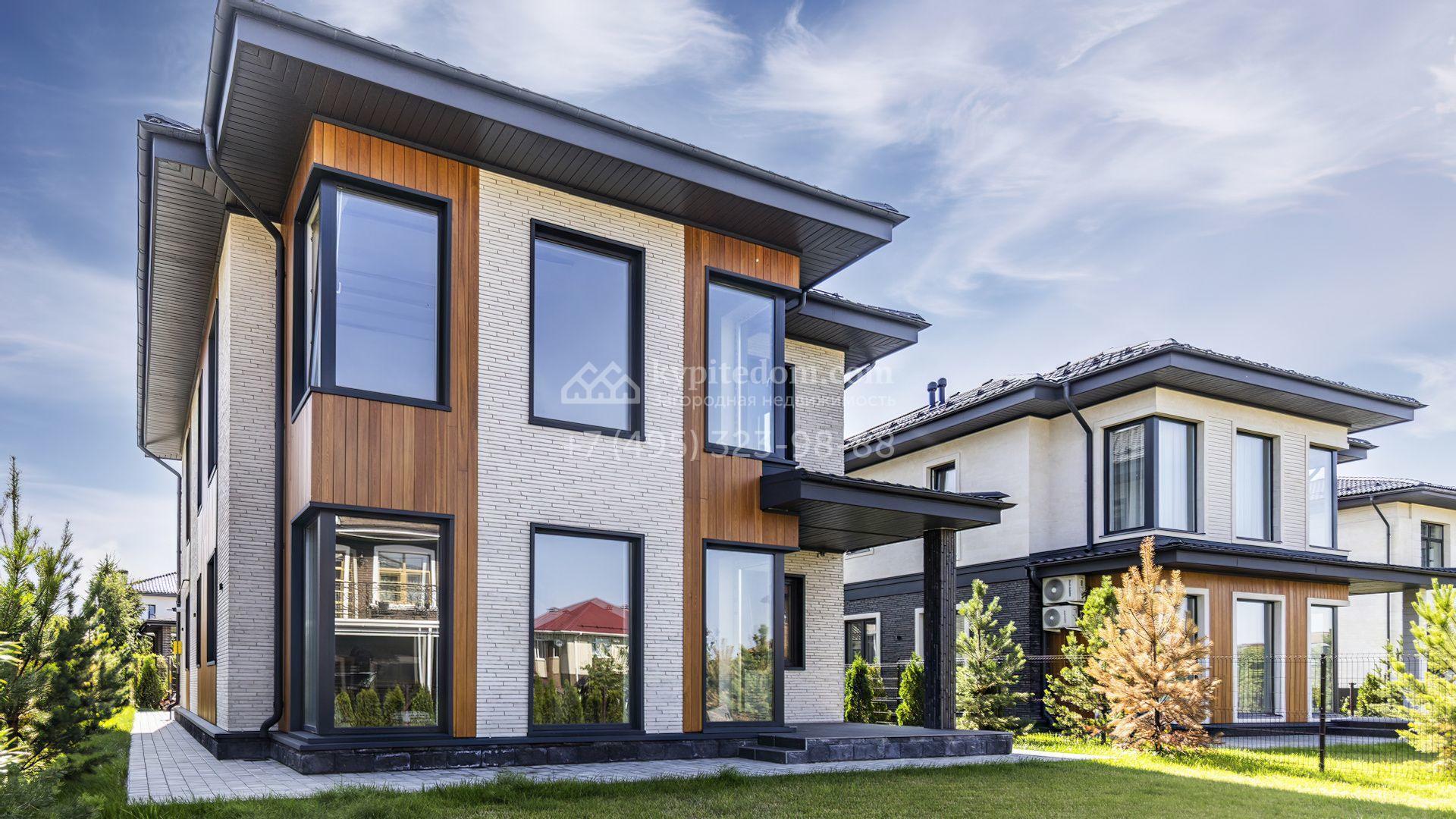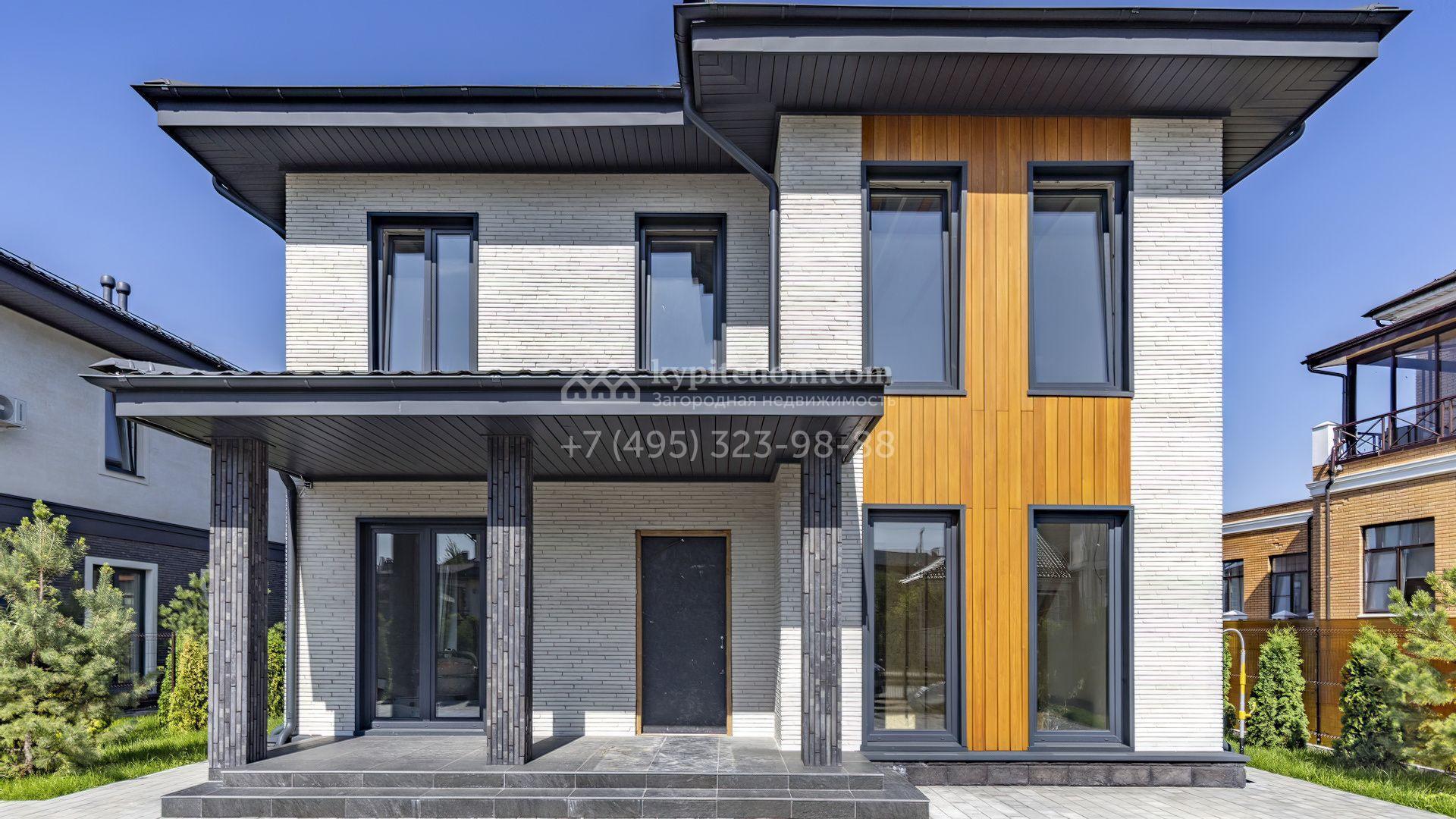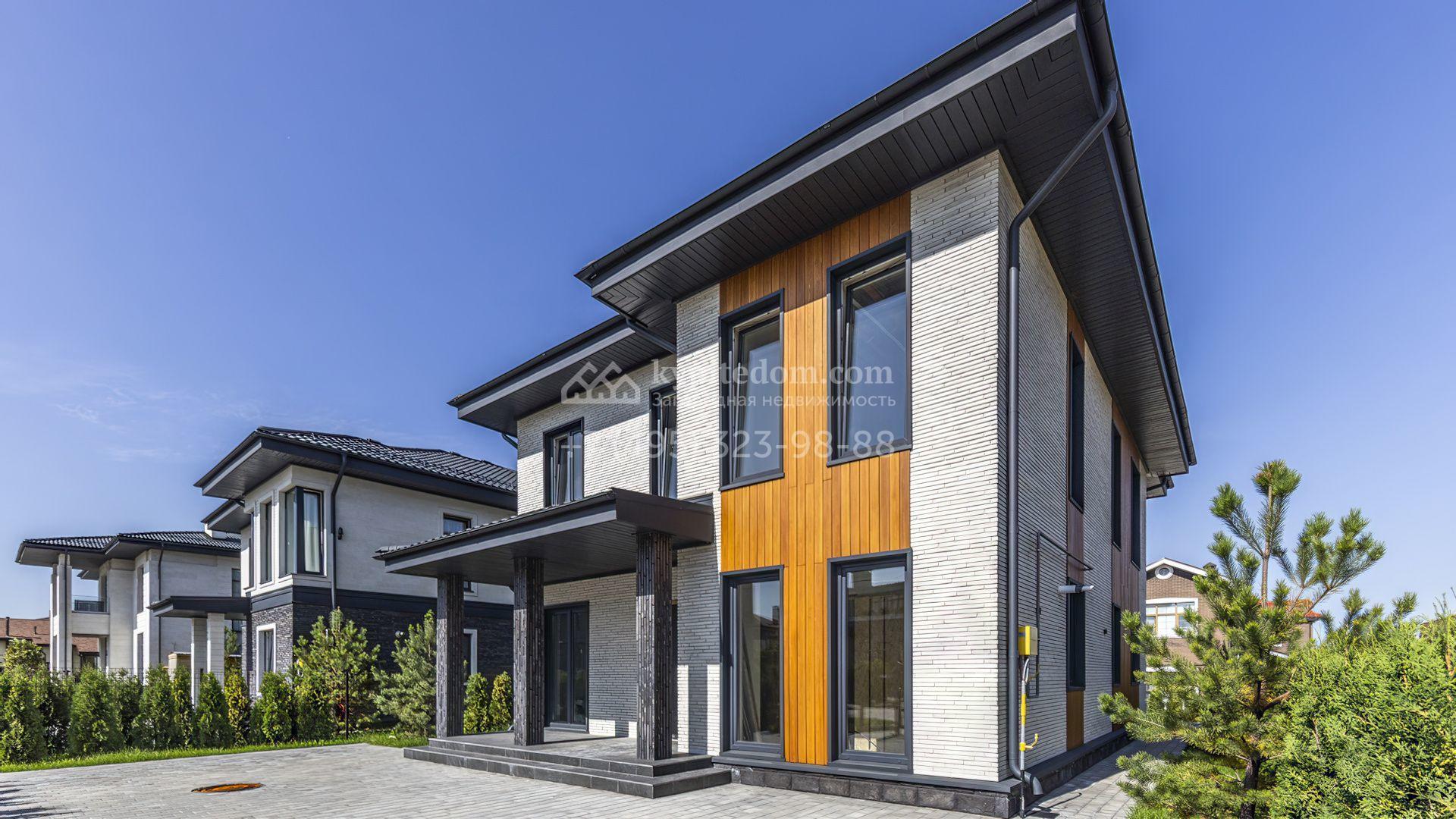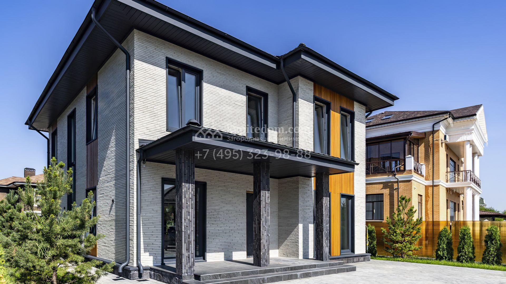Загородный дом площадью 241 м² расположен на полевом участке 6 соток. Здание спроектировано по индивидуальному проекту архитектурного бюро Артема Кузнецова. Лаконичный фасад облицован дагестанским камнем, панелями из лиственницы и плиткой ручной формовки Tegla. Установлены окна Rehau Intelio 80.
