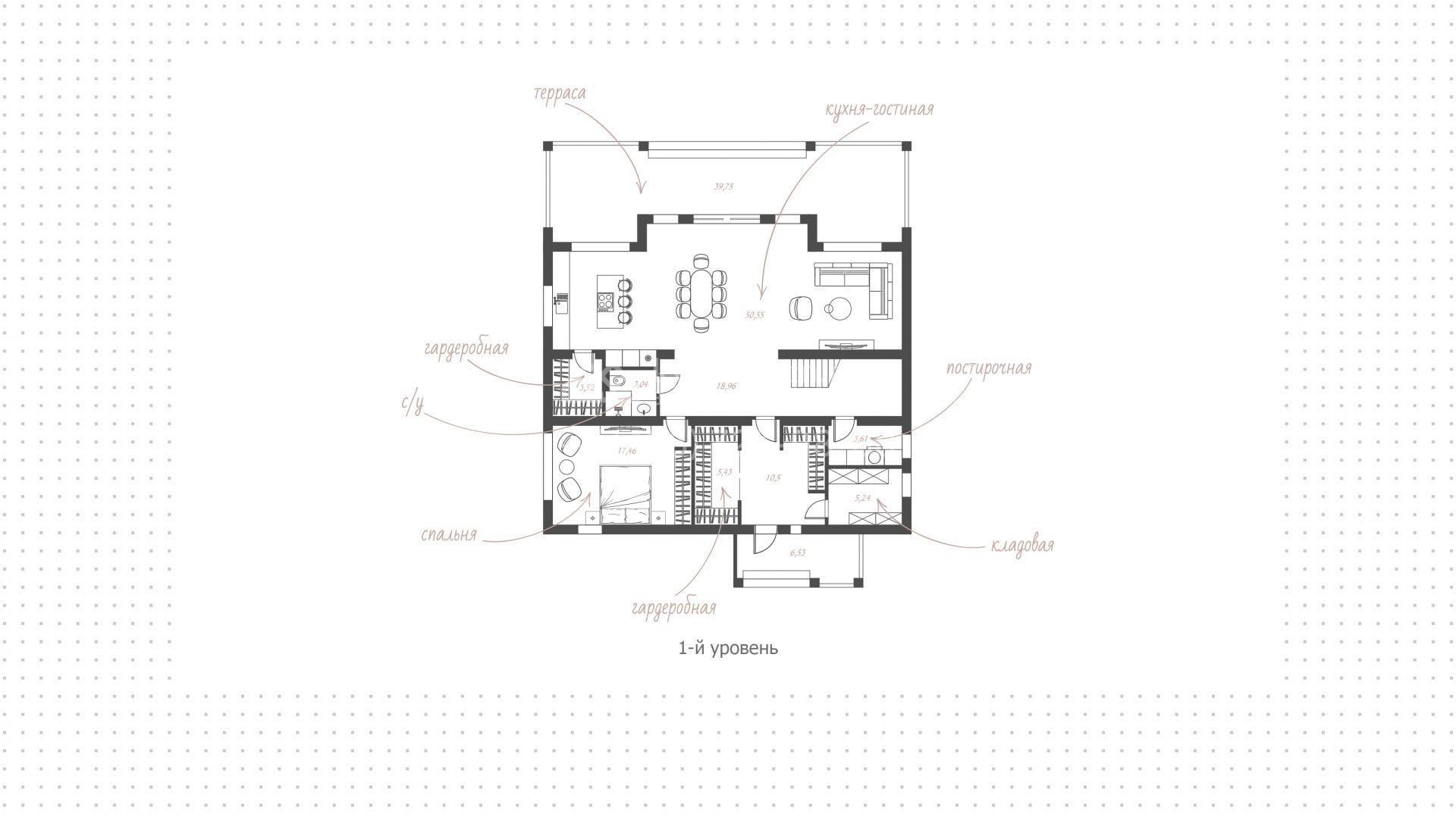 Внутри выполнена предчистовая отделка white box, что позволяет воплотить множество интерьерных решений. На первом уровне спроектированы кухня-гостиная площадью 51 м² с выходом на террасу, спальня, 2 санузла, гардеробная и постирочная. На втором уровне — 3 спальни с гардеробными, гостевая спальня, 2 санузла. На участке проведены дренажные работы, высажены кустарники, проложены дорожки и организовано уличное освещение.