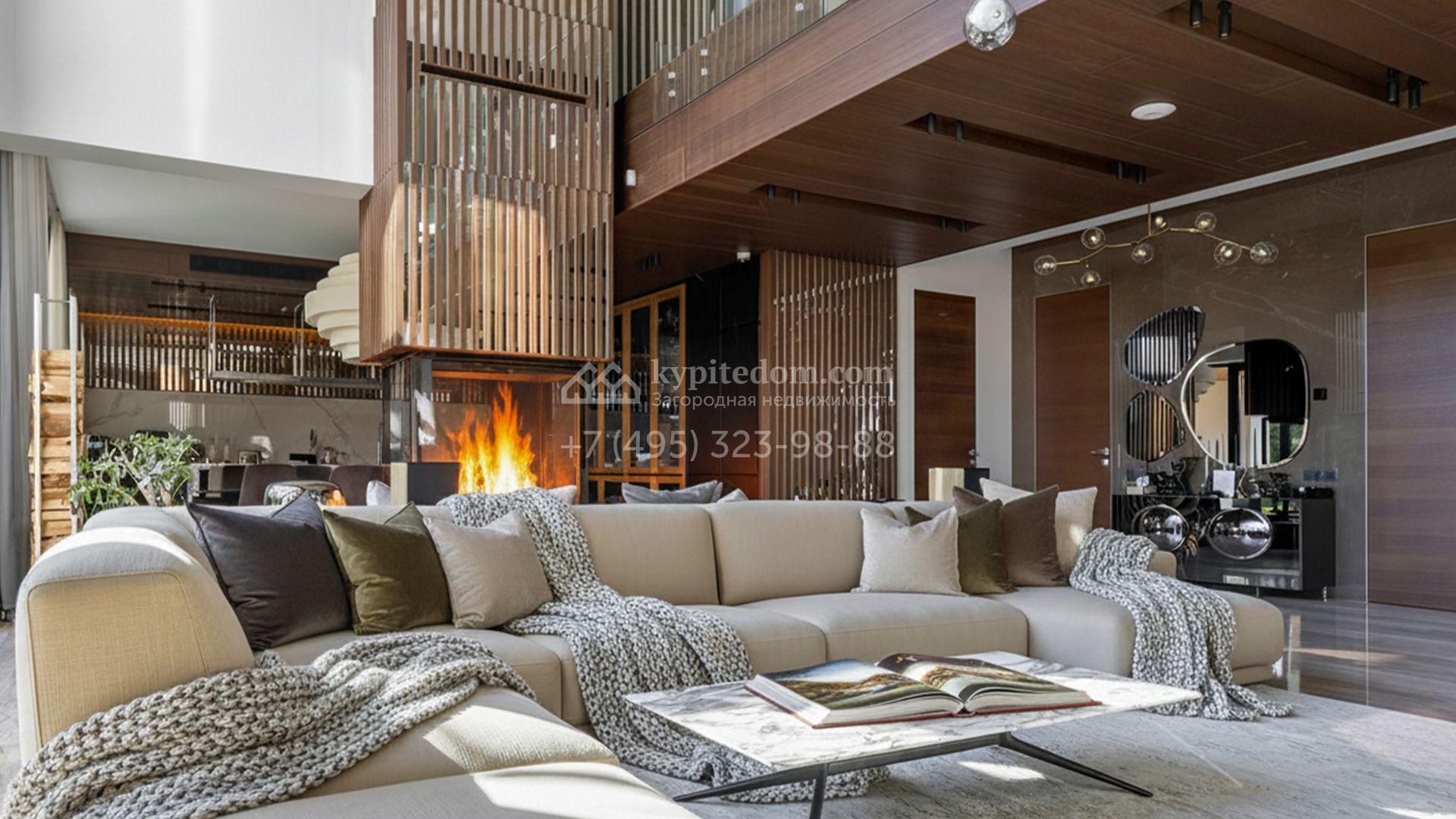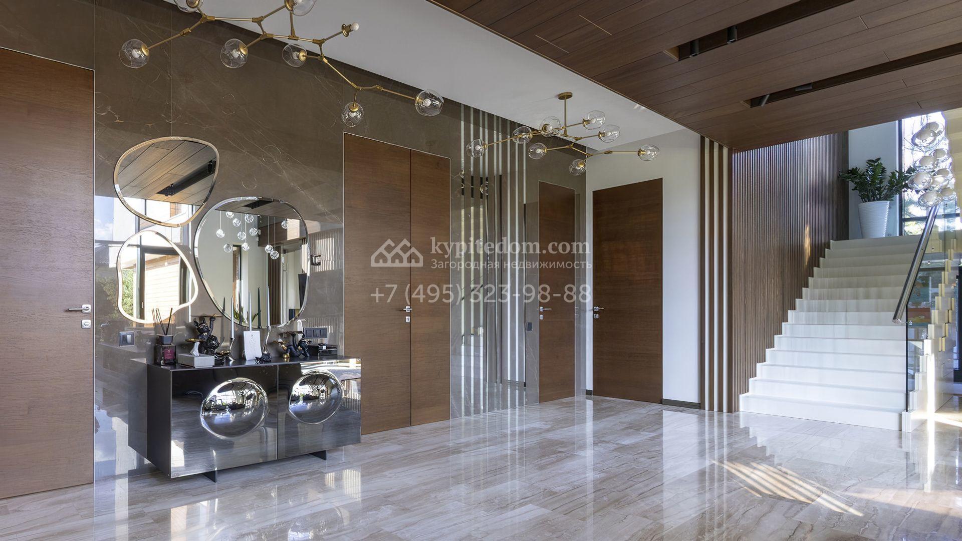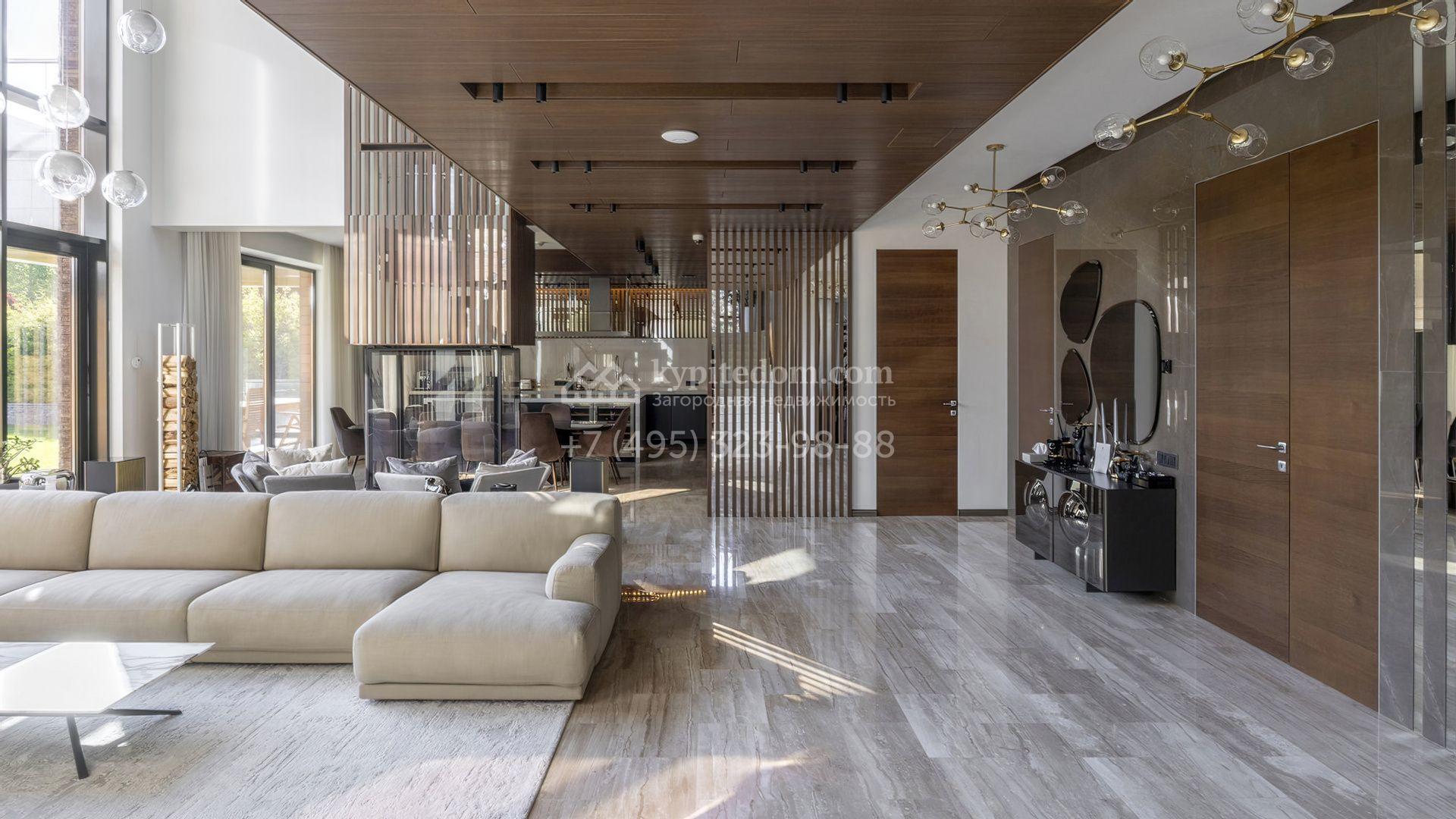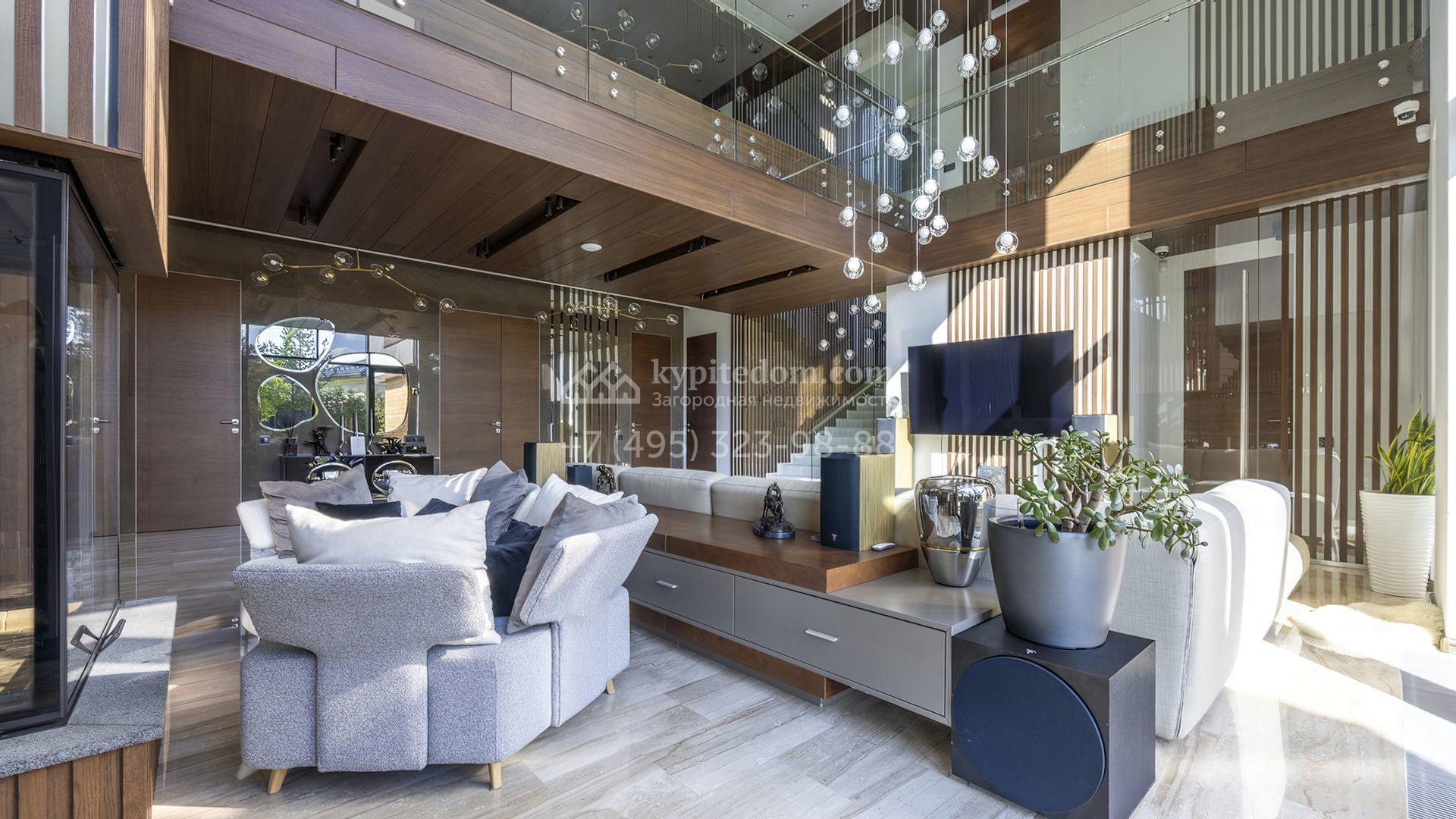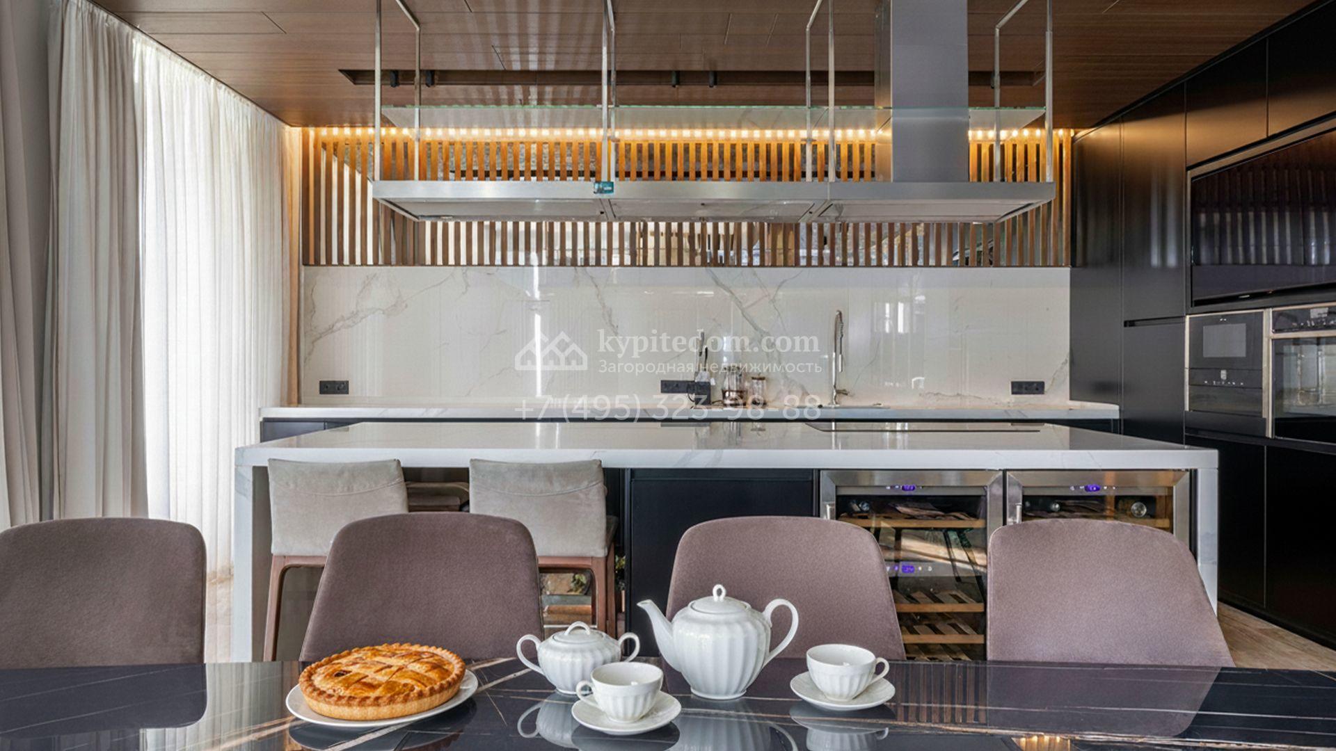 Интерьеры оформлены в сдержанной цветовой гамме с акцентом на натуральные материалы, текстуры и свет. Пространство наполнено мебелью итальянского бренда Poliform, кухонная техника представлена Neff, Teka, Bosch, Liebherr. Установлены два винных шкафа с раздельными температурными зонами. В доме предусмотрены сауна, купель и комната отдыха, а также гидромассажная ванна на открытом воздухе.
