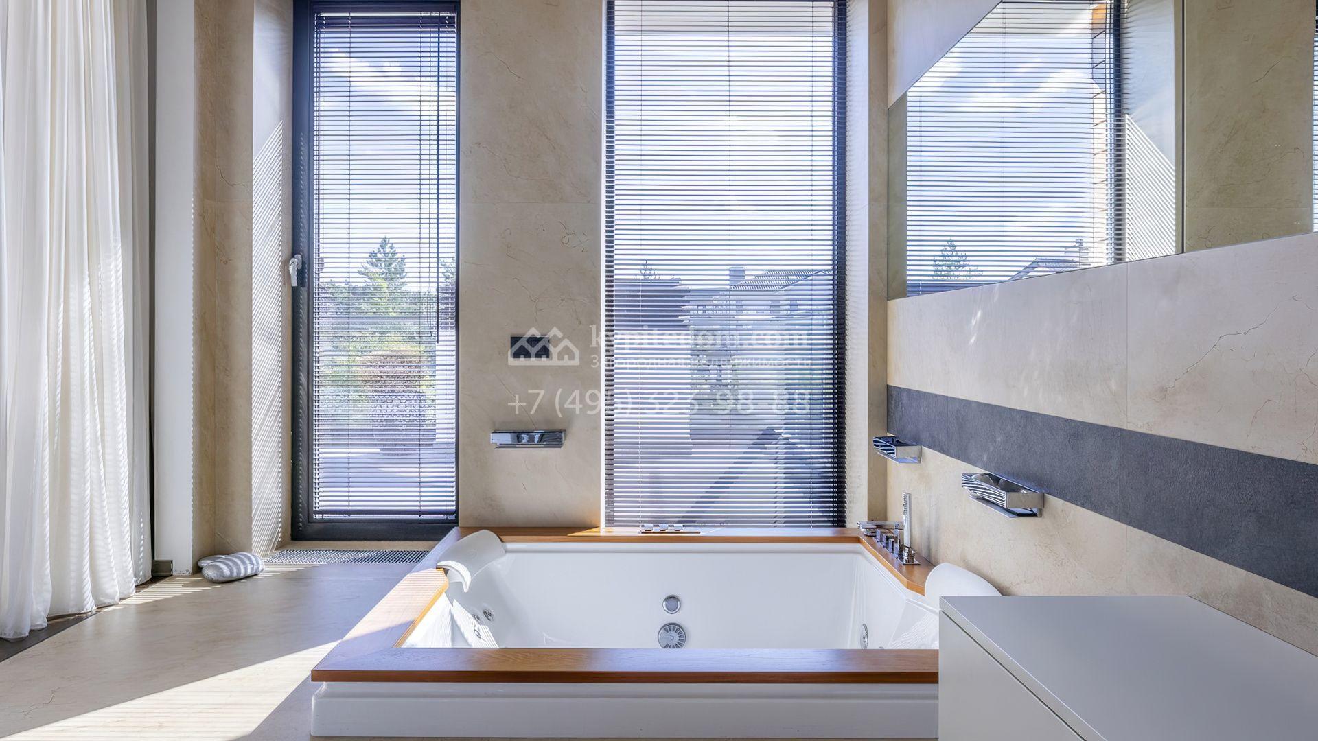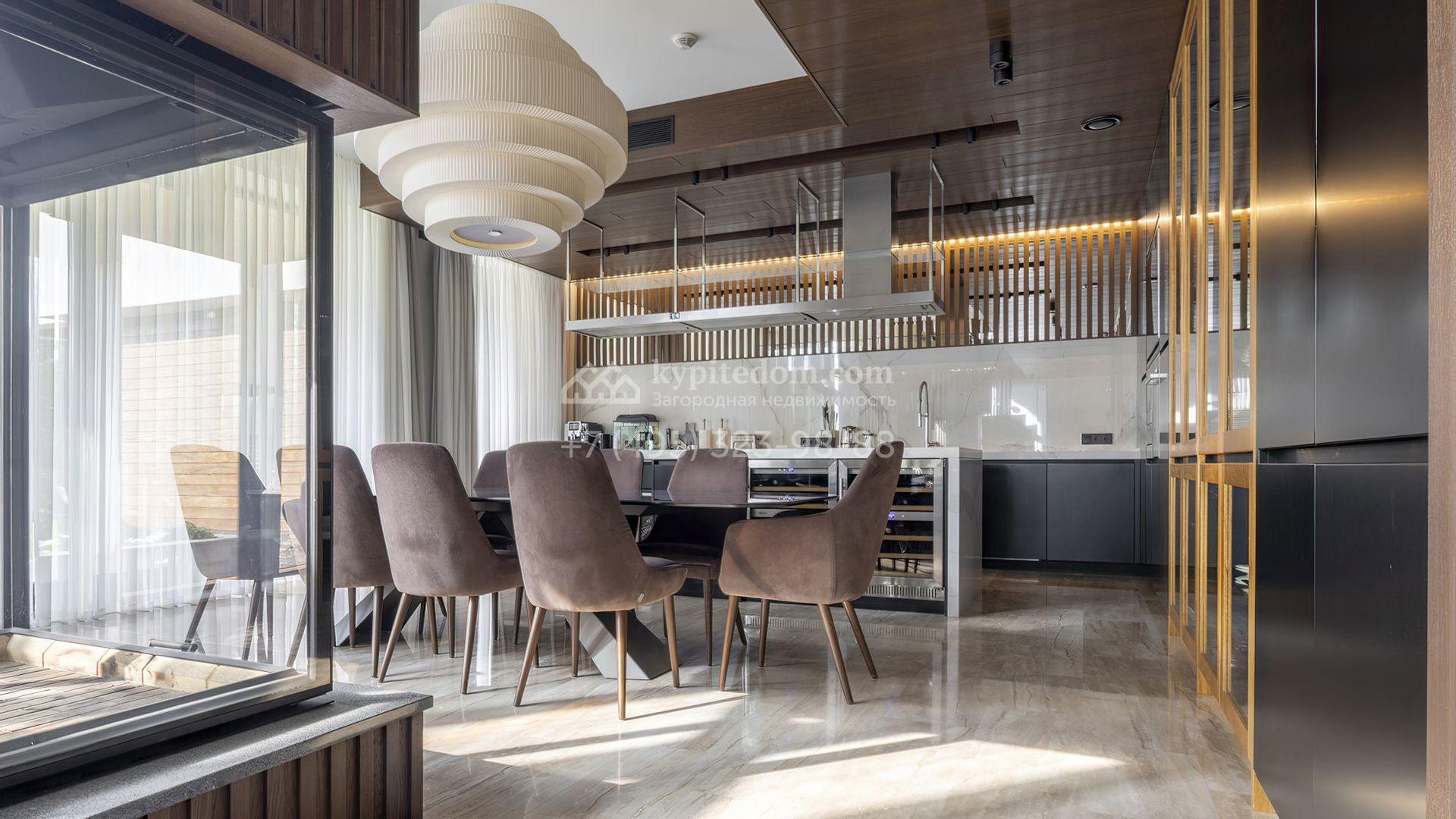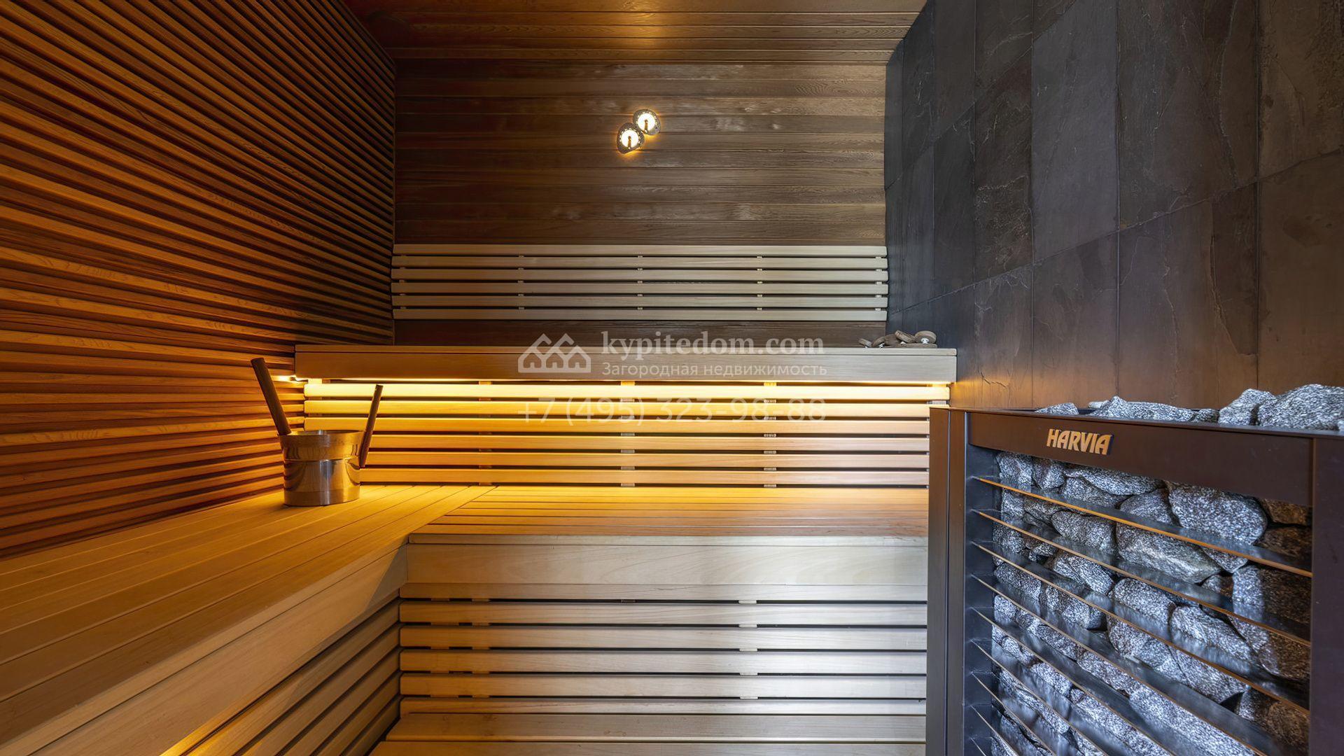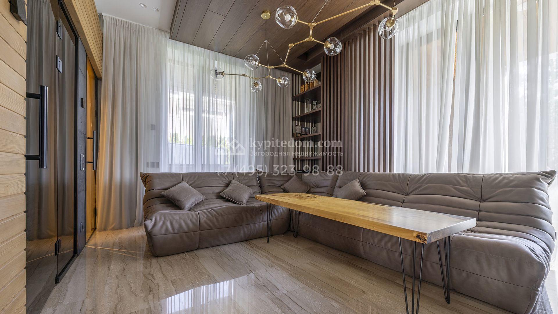 Интерьеры оформлены в сдержанной цветовой гамме с акцентом на натуральные материалы, текстуры и свет. Пространство наполнено мебелью итальянского бренда Poliform, кухонная техника представлена Neff, Teka, Bosch, Liebherr. Установлены два винных шкафа с раздельными температурными зонами. В доме предусмотрены сауна, купель и комната отдыха, а также гидромассажная ванна на открытом воздухе.