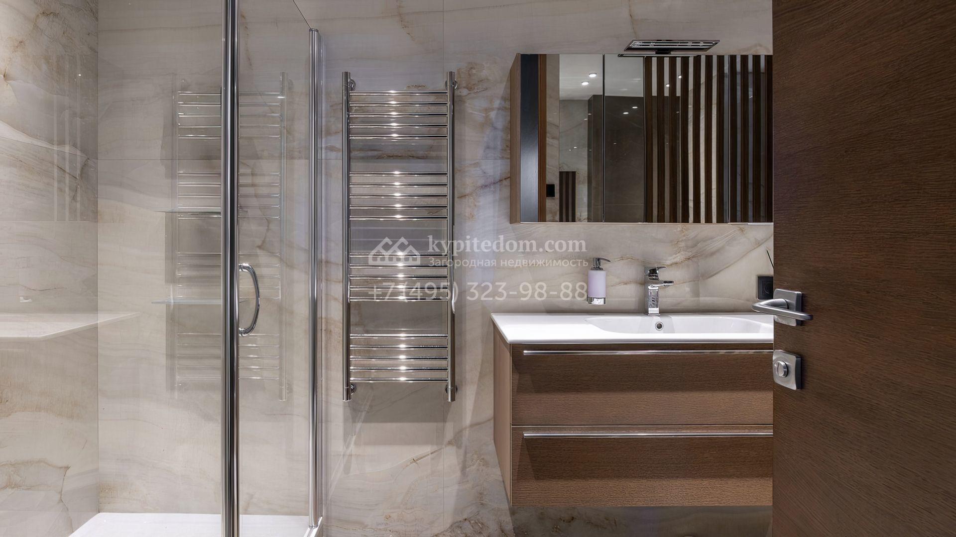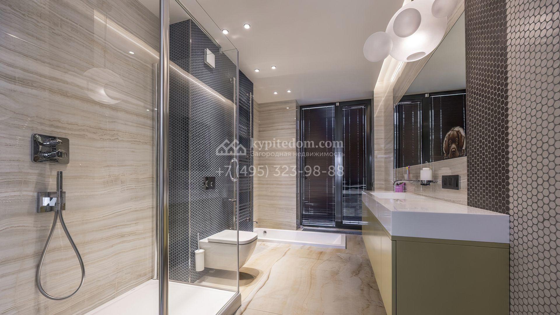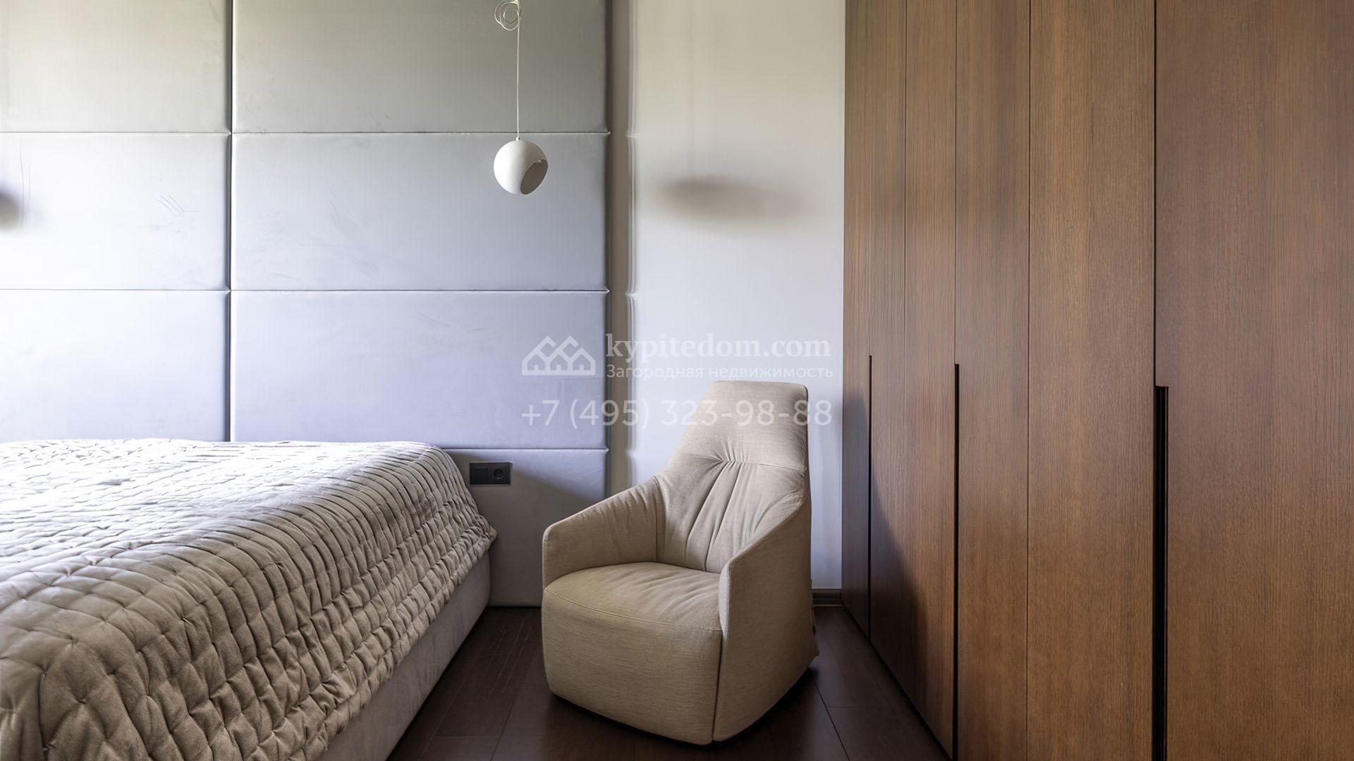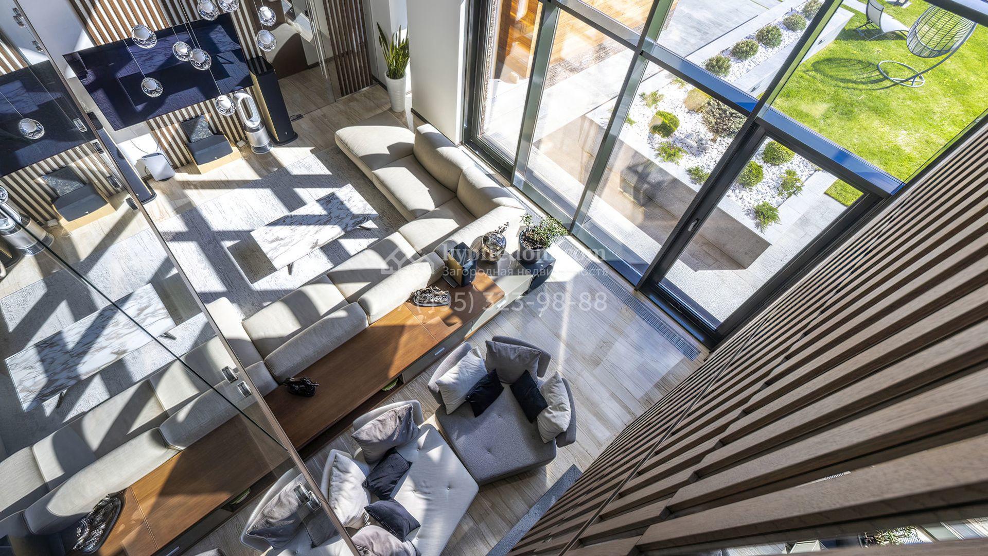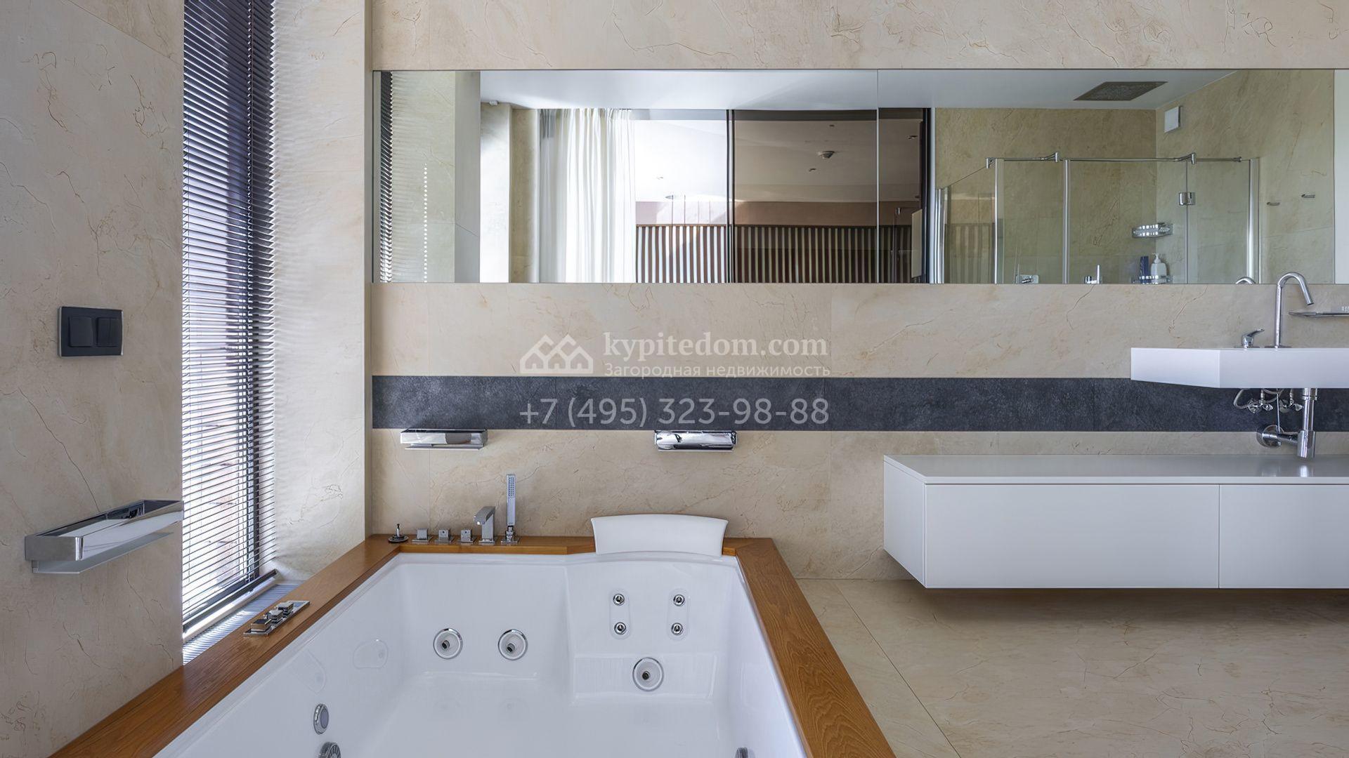 Интерьеры оформлены в сдержанной цветовой гамме с акцентом на натуральные материалы, текстуры и свет. Пространство наполнено мебелью итальянского бренда Poliform, кухонная техника представлена Neff, Teka, Bosch, Liebherr. Установлены два винных шкафа с раздельными температурными зонами. В доме предусмотрены сауна, купель и комната отдыха, а также гидромассажная ванна на открытом воздухе.