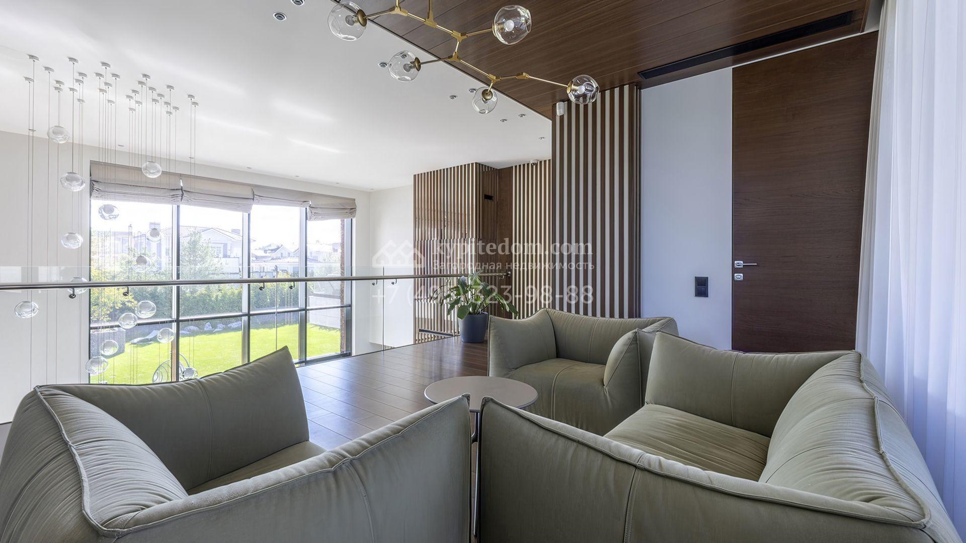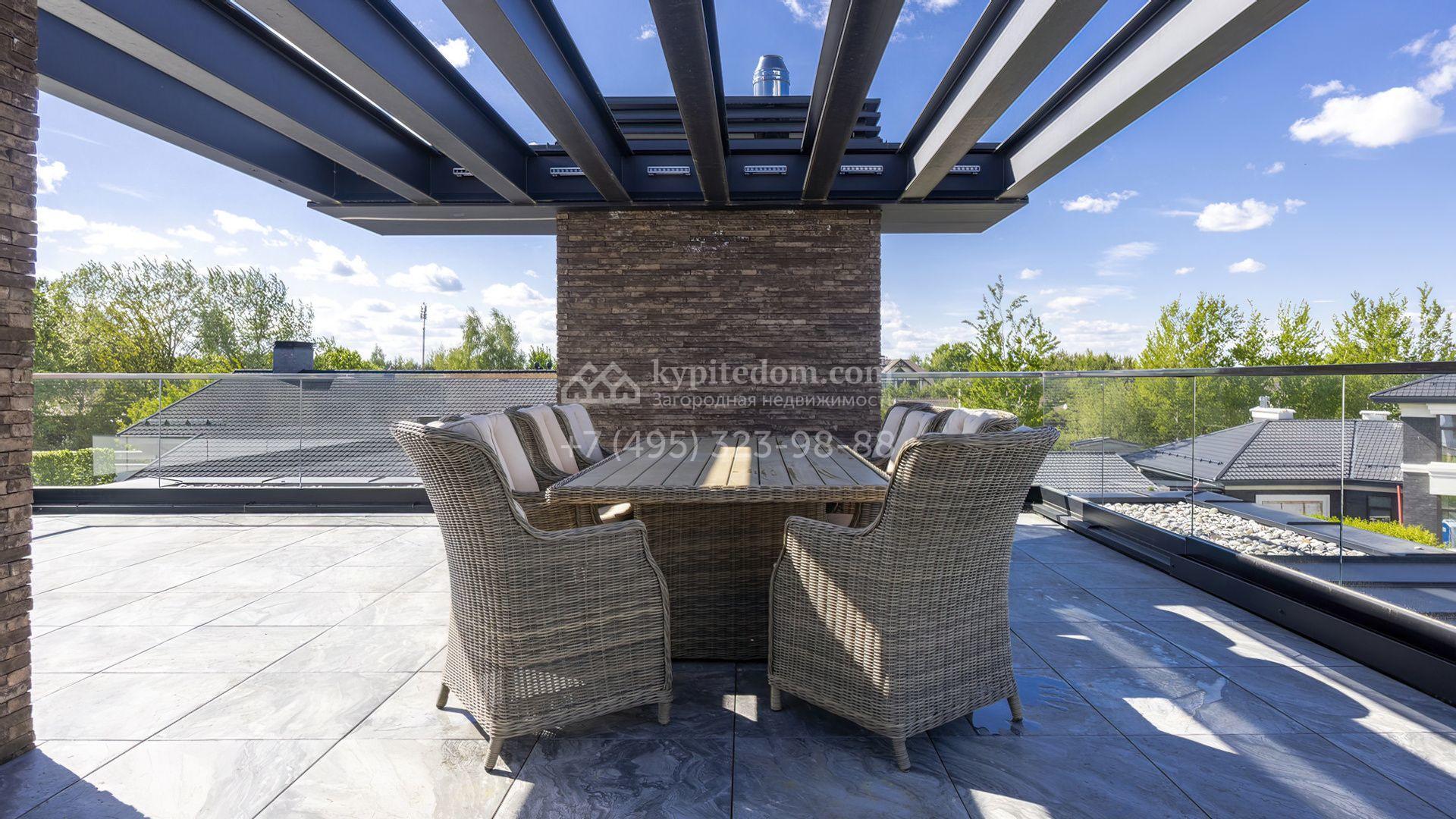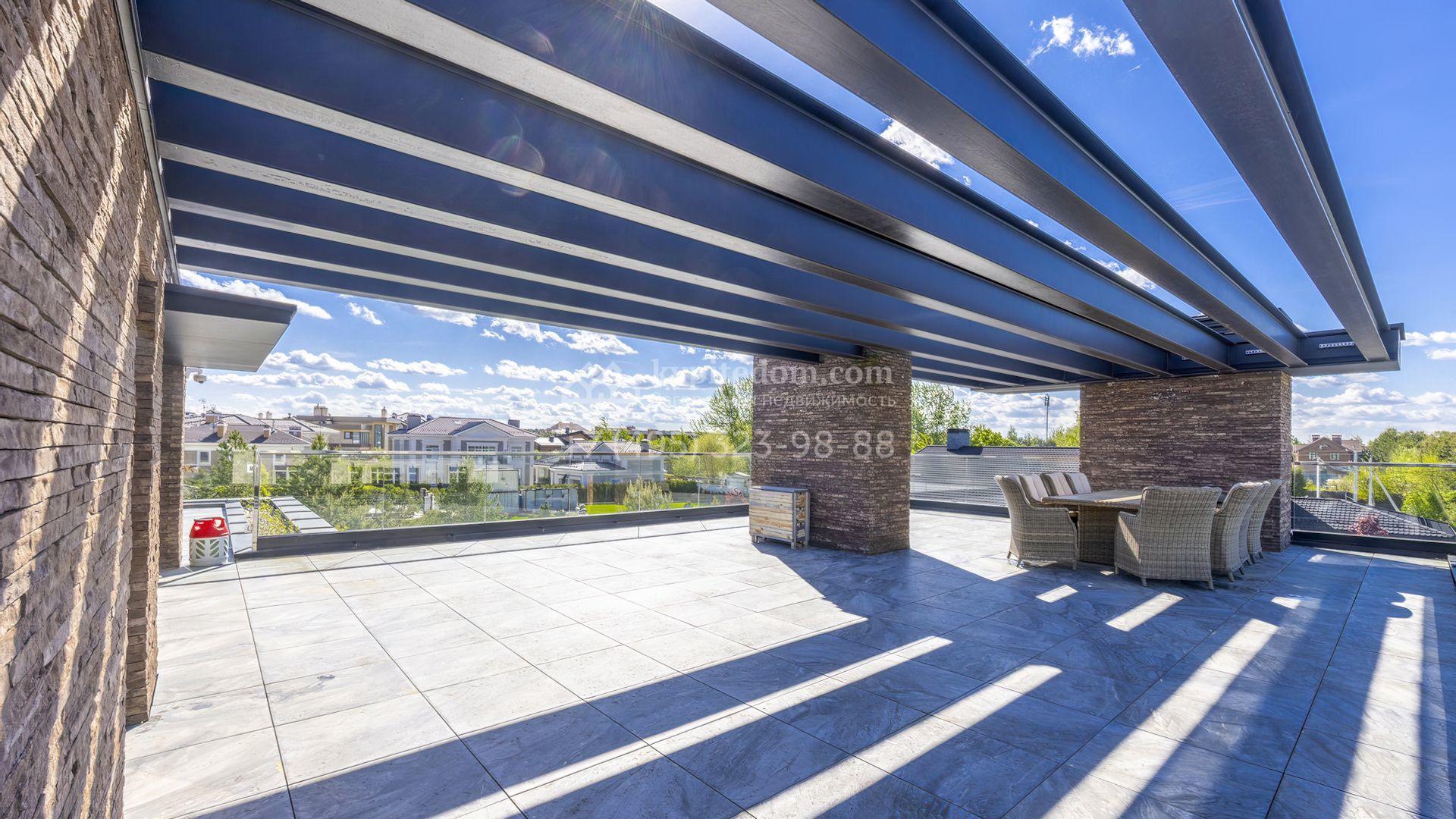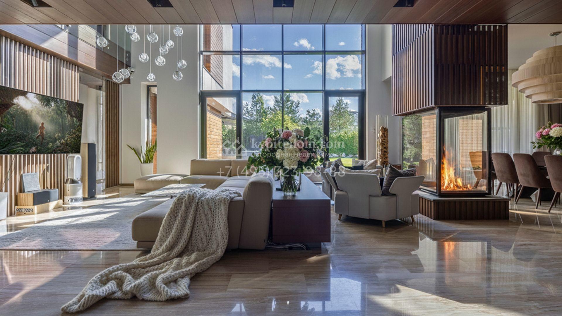Функциональная планировка включает кухню-столовую, просторную гостиную с камином и вторым светом, кабинет, 5 спален, гардеробные, 4 балкона и эксплуатируемую кровлю с террасой и площадкой барбекю. На каждом уровне выделены удобные логистические зоны, продуманные до мелочей. Террасы и балконы в сумме составляют около 97 м², что позволяет органично объединить интерьер с окружающим пейзажем.