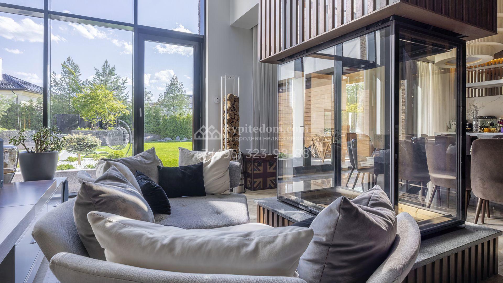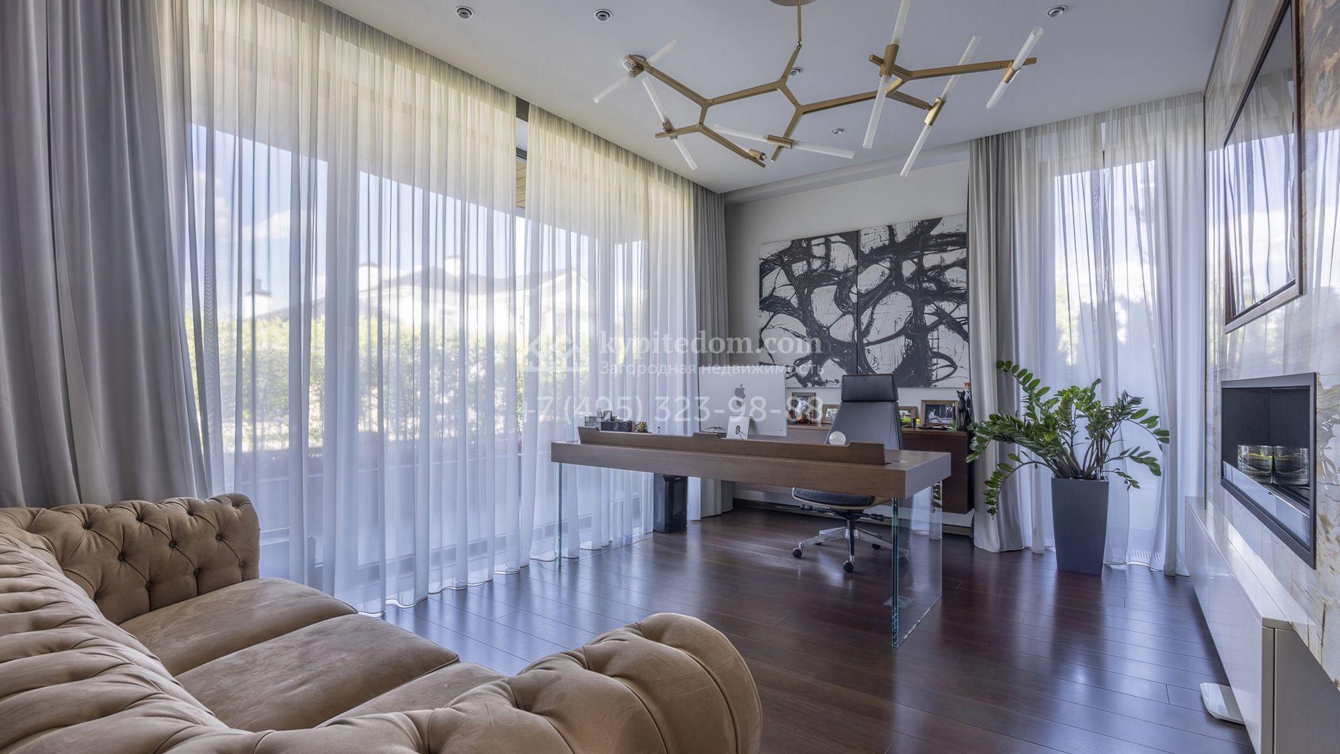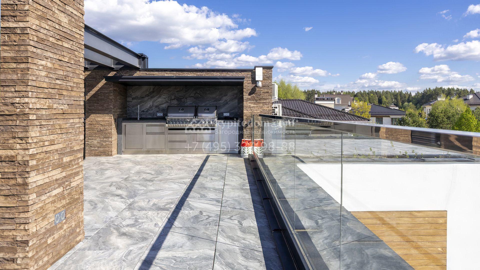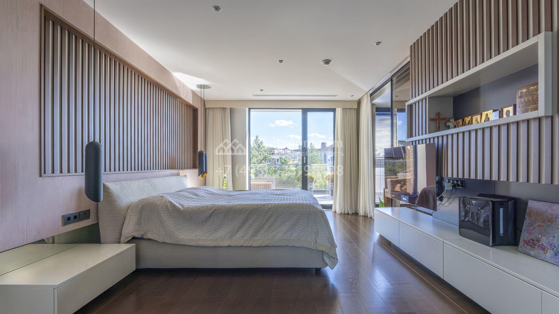 Функциональная планировка включает кухню-столовую, просторную гостиную с камином и вторым светом, кабинет, 5 спален, гардеробные, 4 балкона и эксплуатируемую кровлю с террасой и площадкой барбекю. На каждом уровне выделены удобные логистические зоны, продуманные до мелочей. Террасы и балконы в сумме составляют около 97 м², что позволяет органично объединить интерьер с окружающим пейзажем.